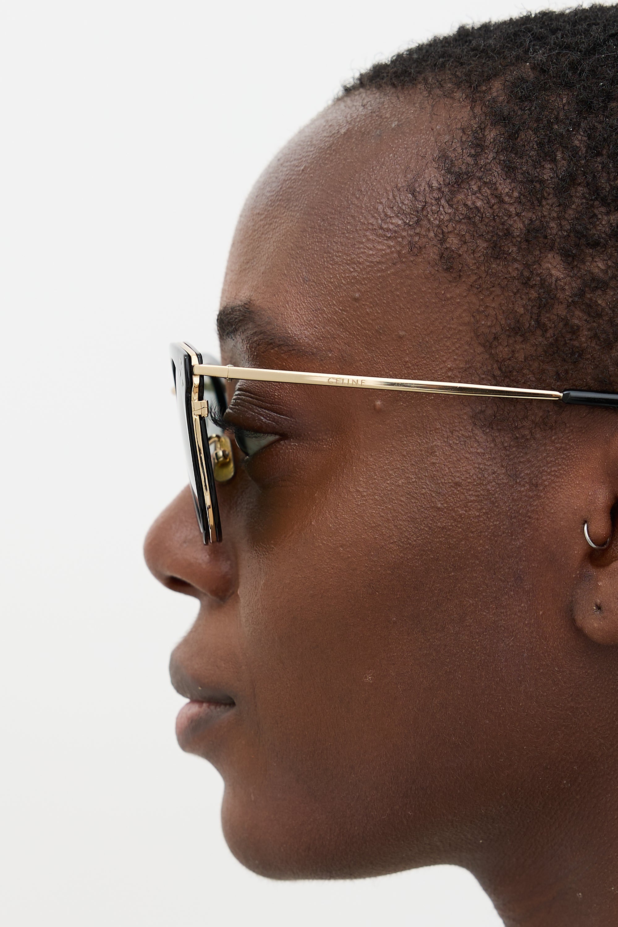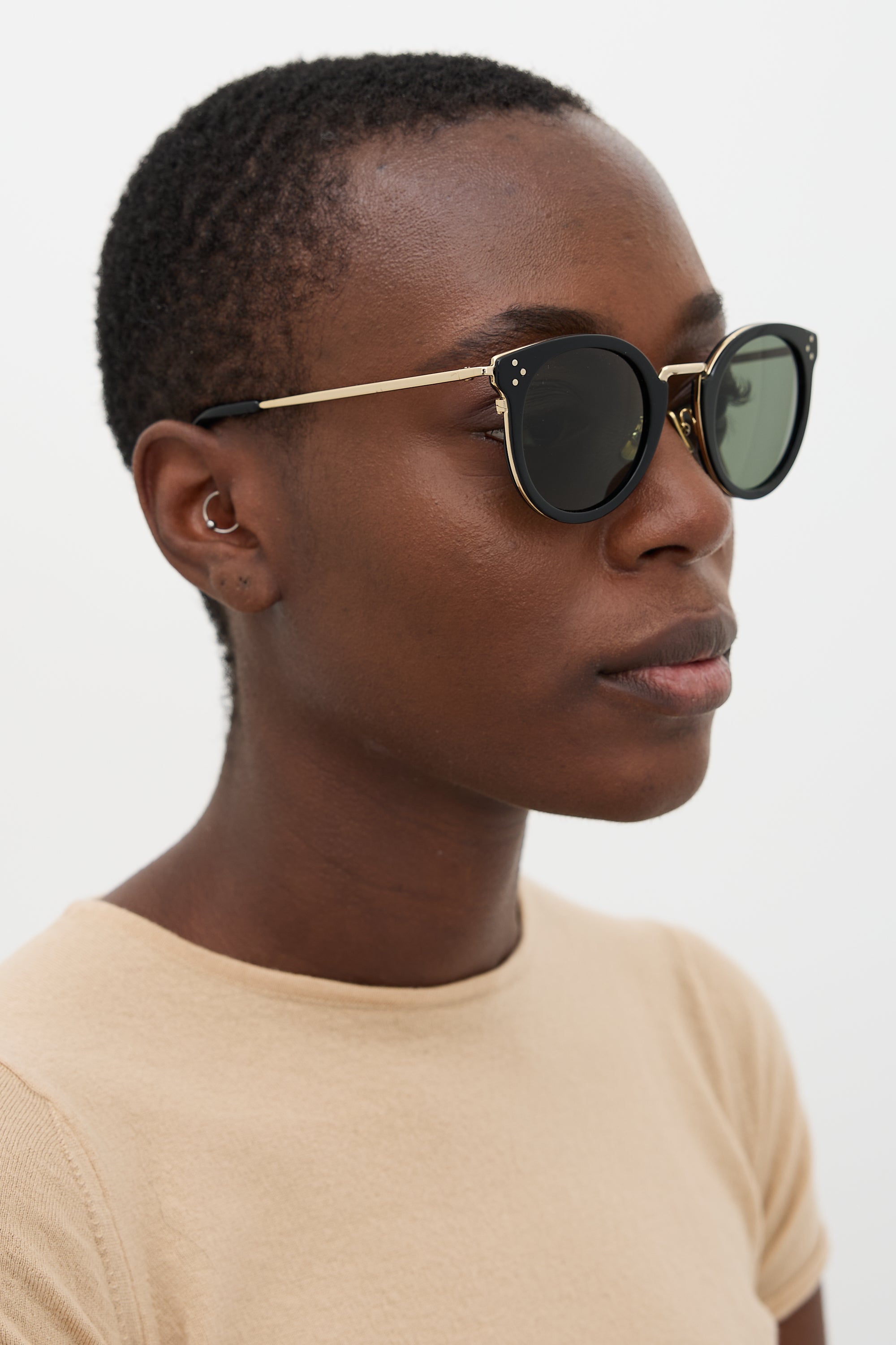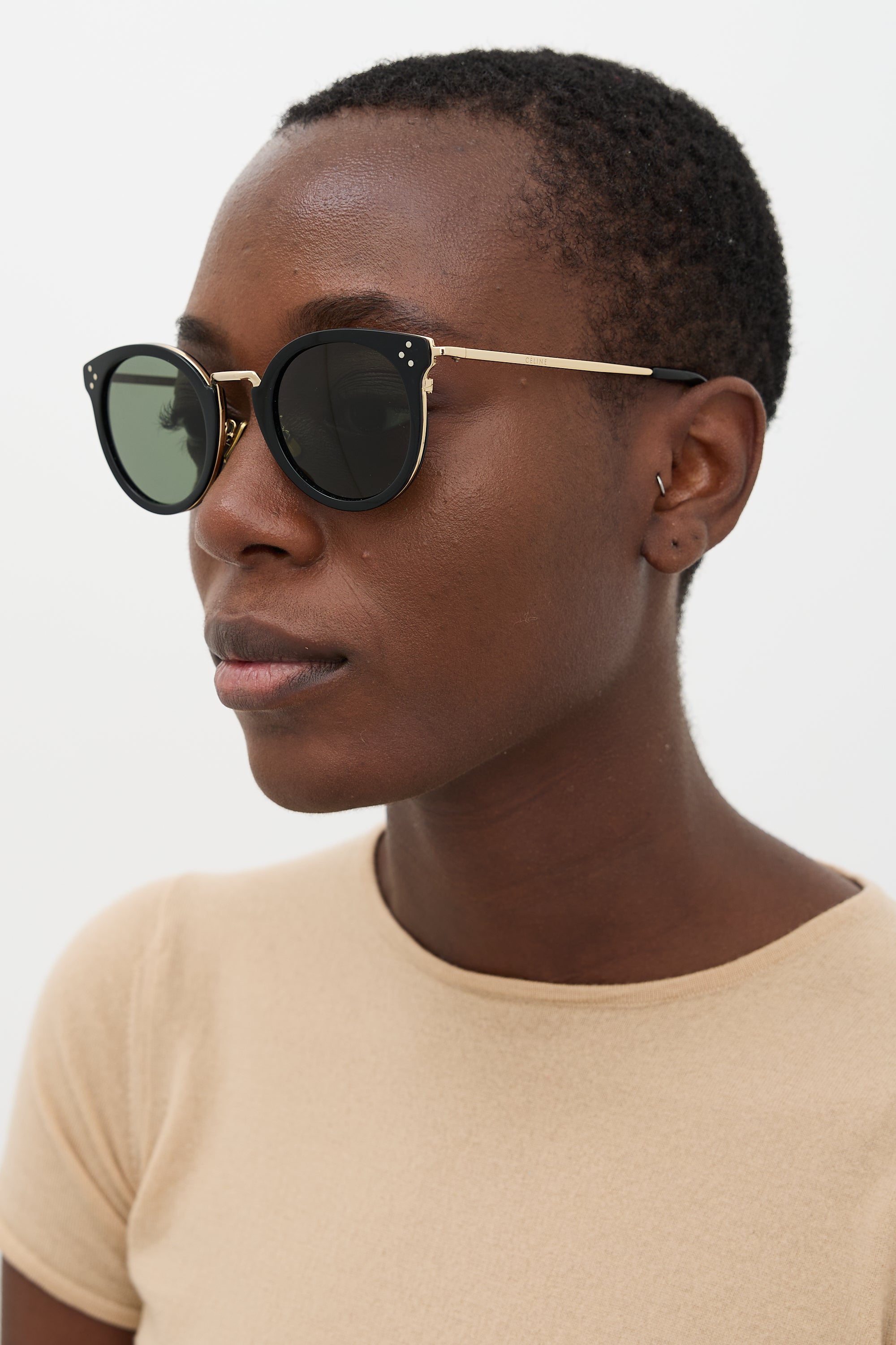 Pre-owned Celine CL4011 sunglasses featuring a round black frame with gold tone metal arms, black tinted lens, nose pads, signature gold tone three dots at temples, and logo engraving at arms.
