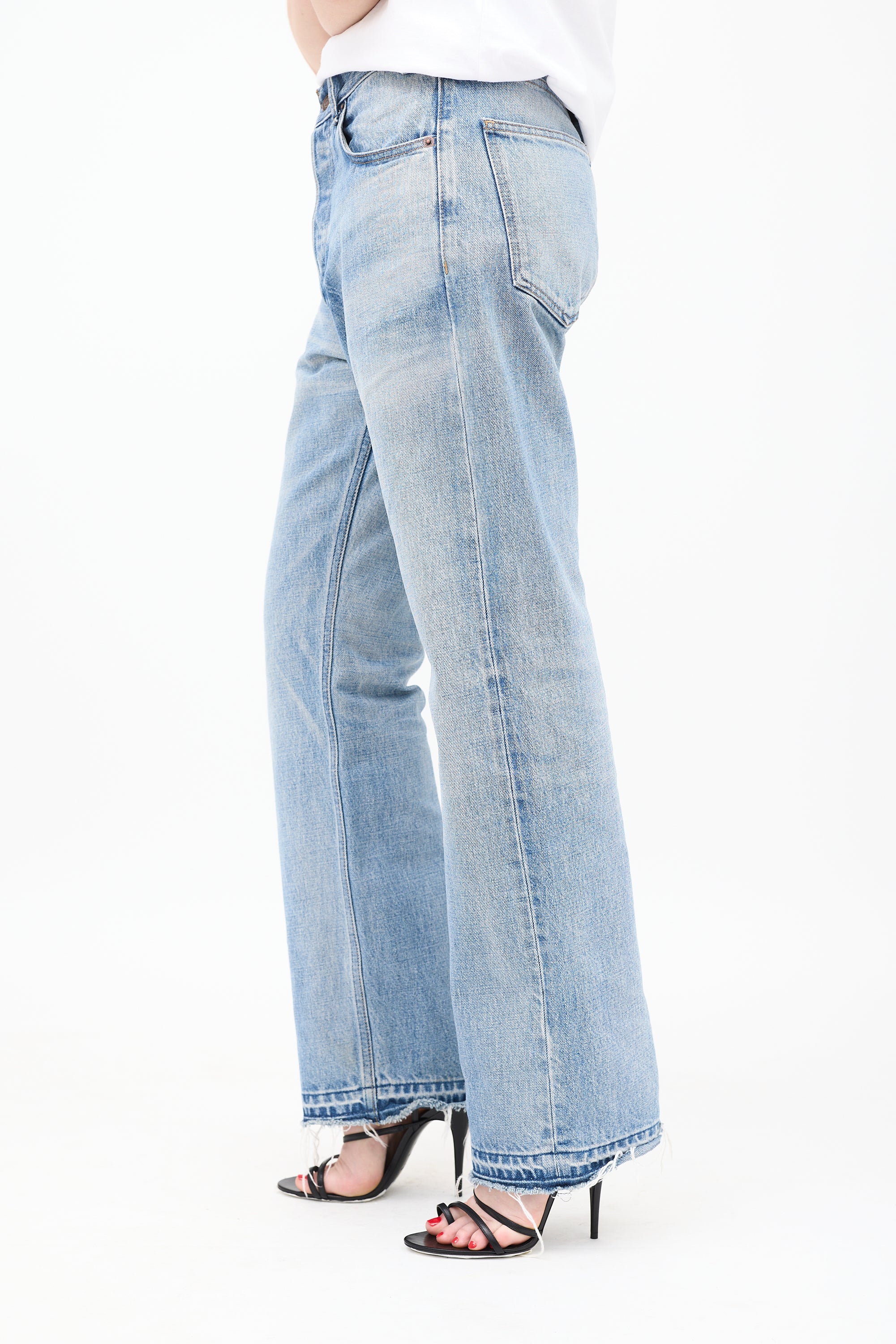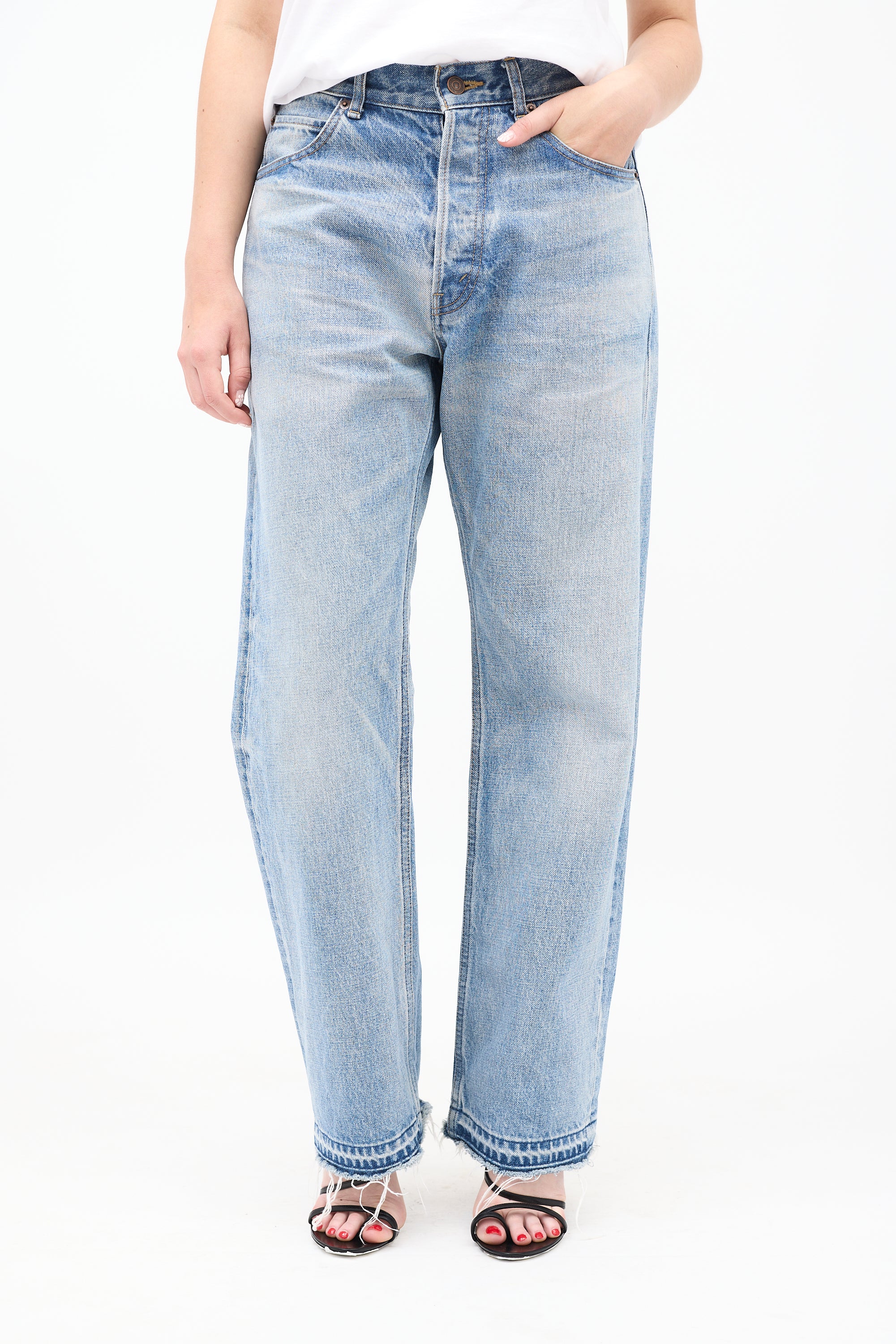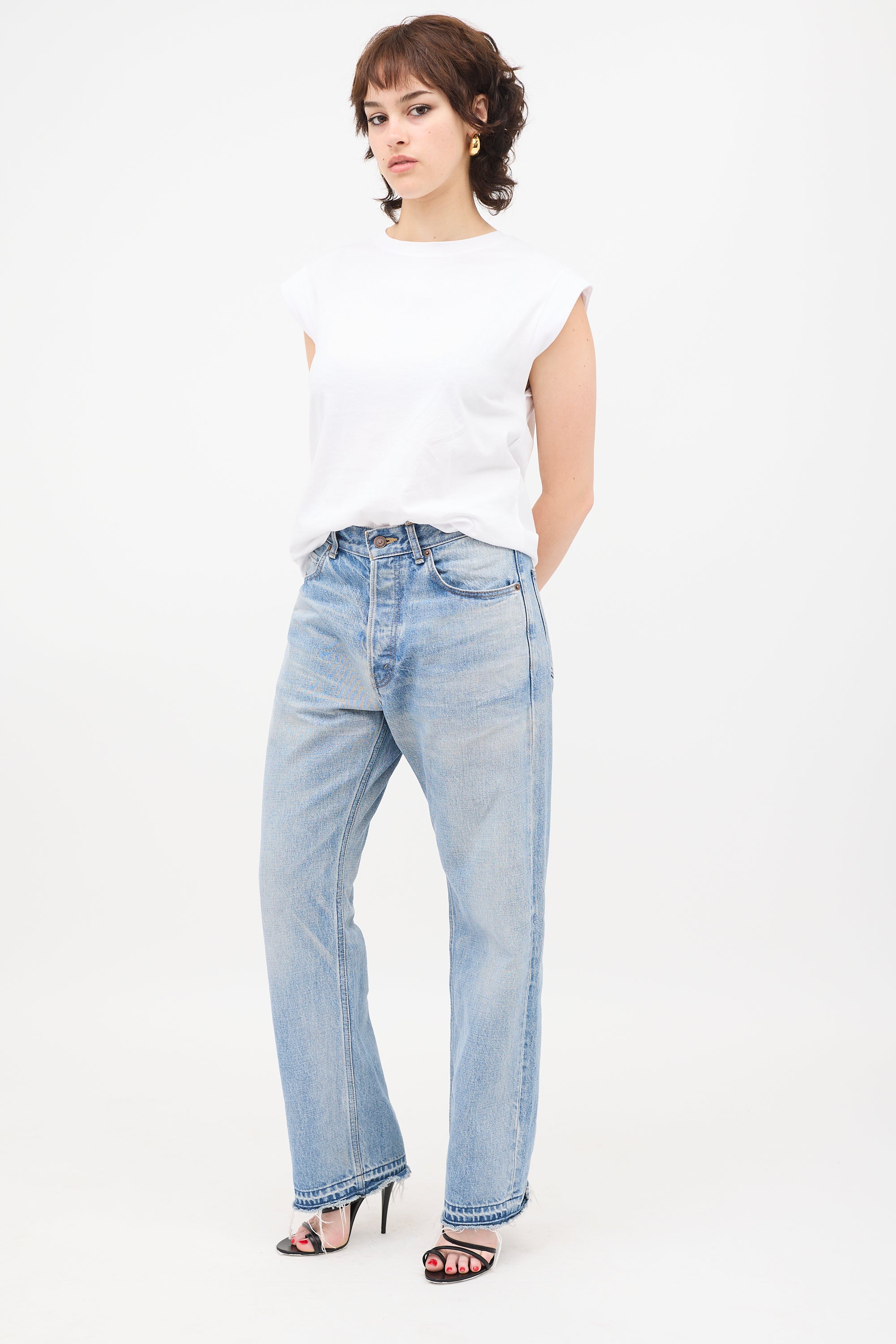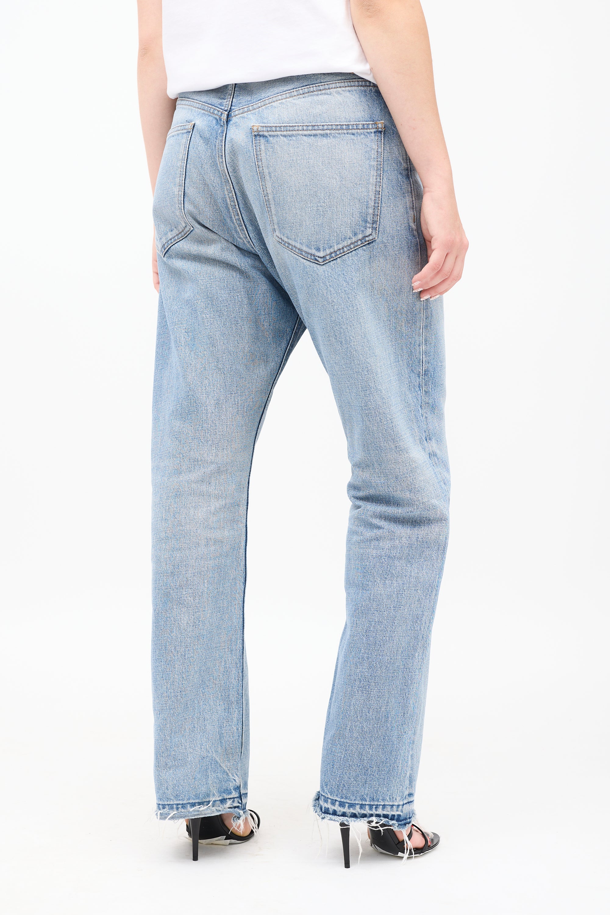 Pre-owned Celine light wash distressed jeans featuring mid rise, five pocket styling, zip fly, straight leg, and raw hems.