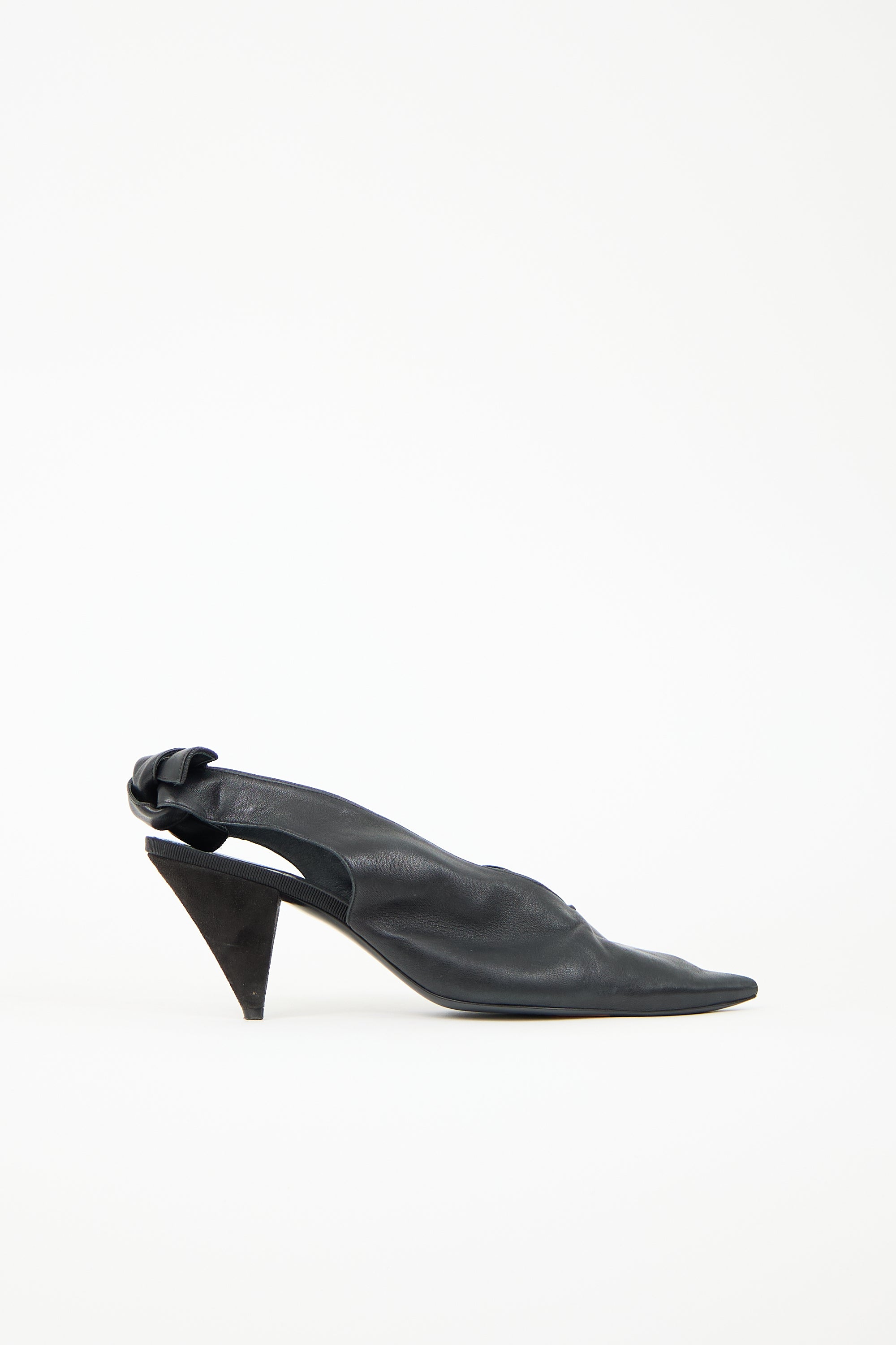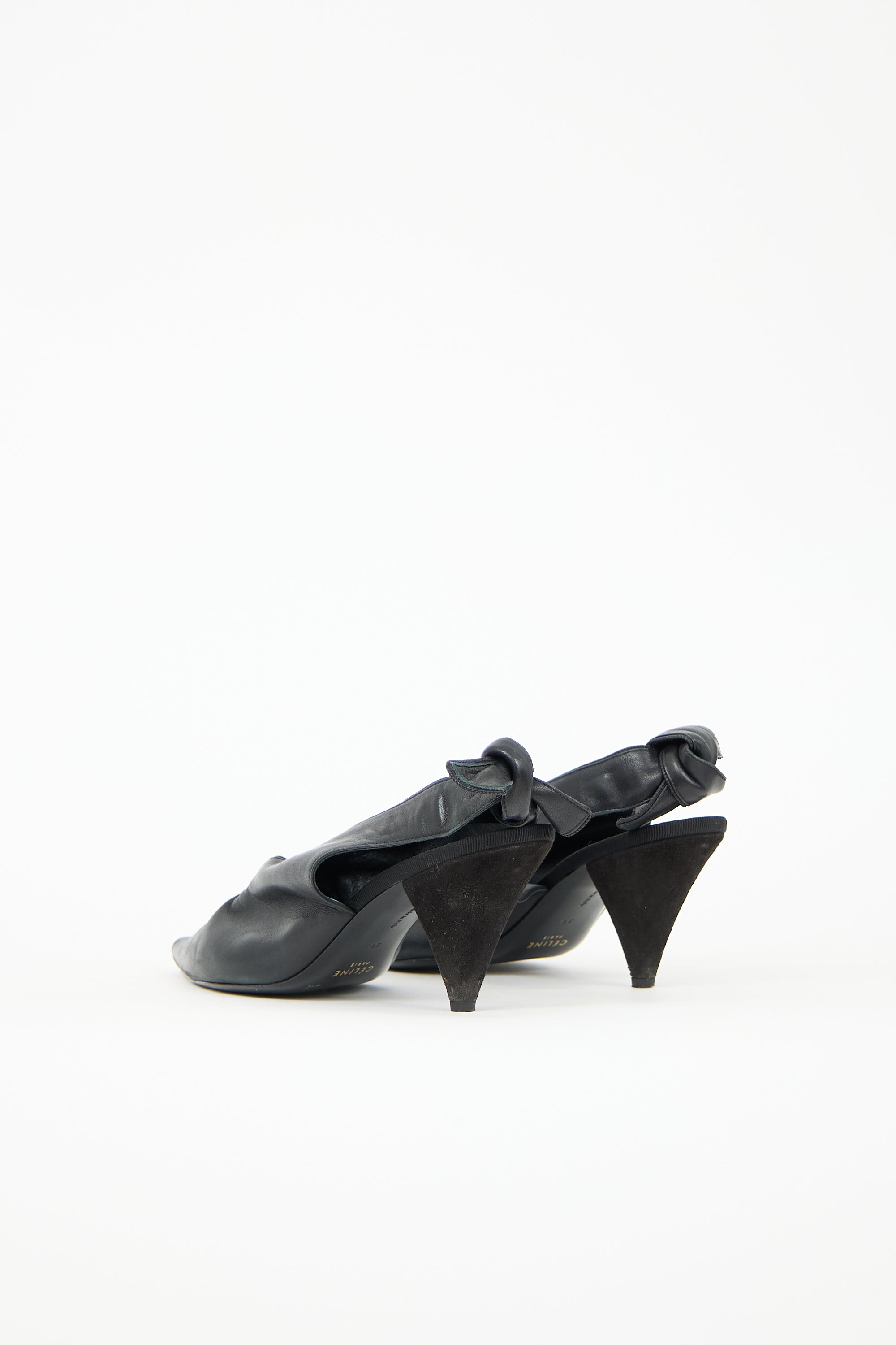 Pre-owned Celine black leather heels featuring pointed toe, V-cut collar, elasticized ankle strap with decorative knot, and suede covered cone heel.