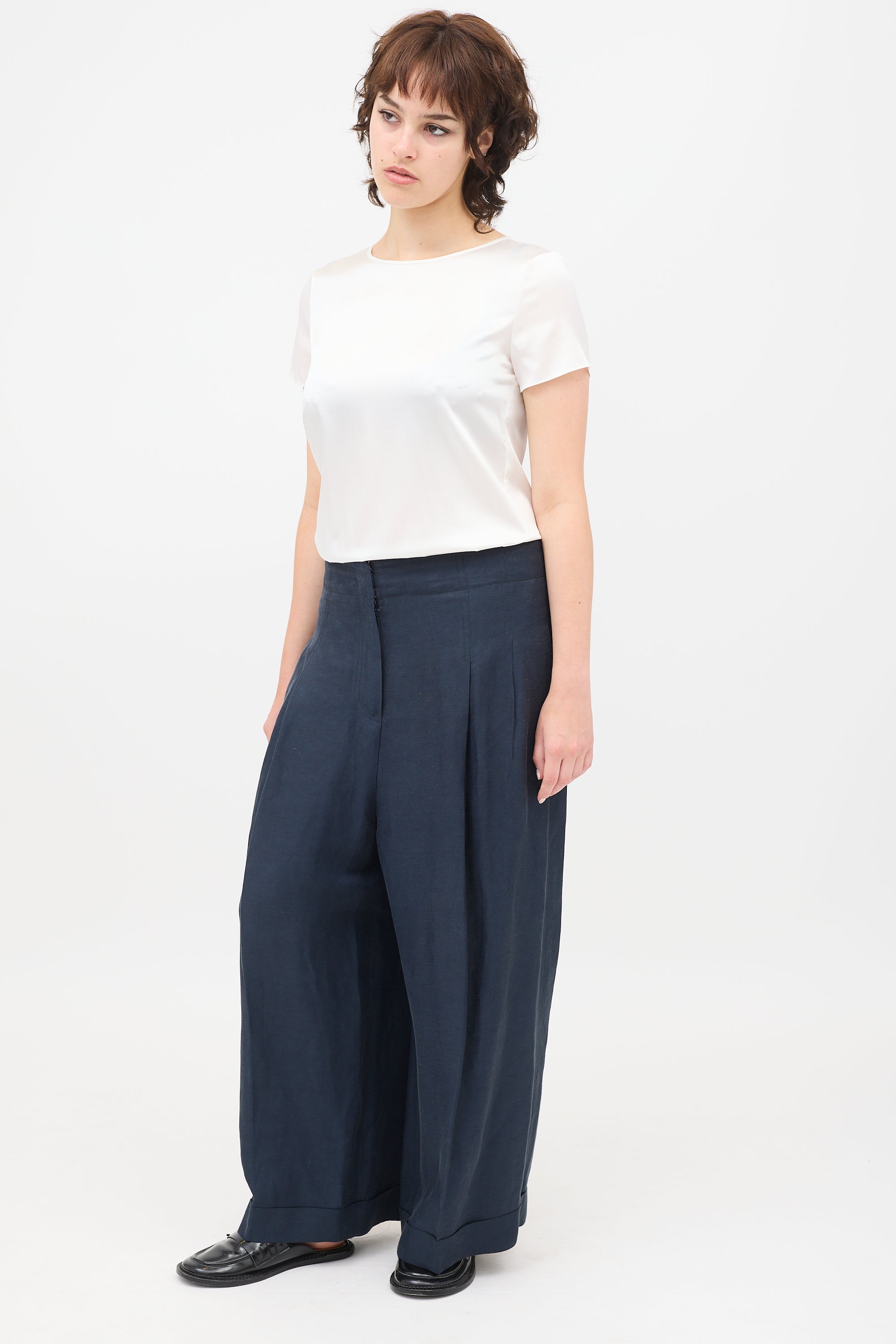 Pre-owned Celine navy trousers featuring high rise, three pocket styling, pleated front, and wide leg. Unlined. Clipped to fit model.