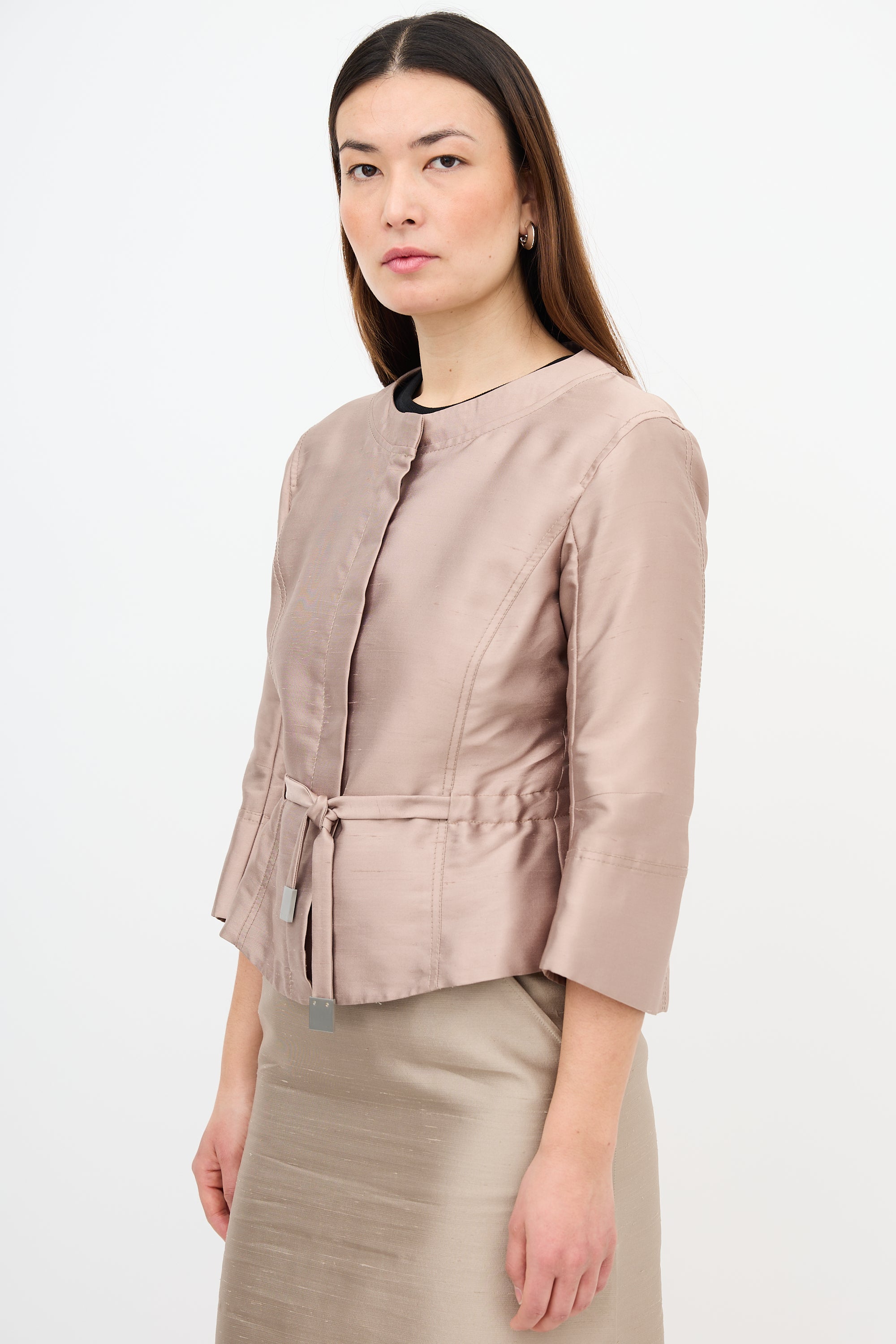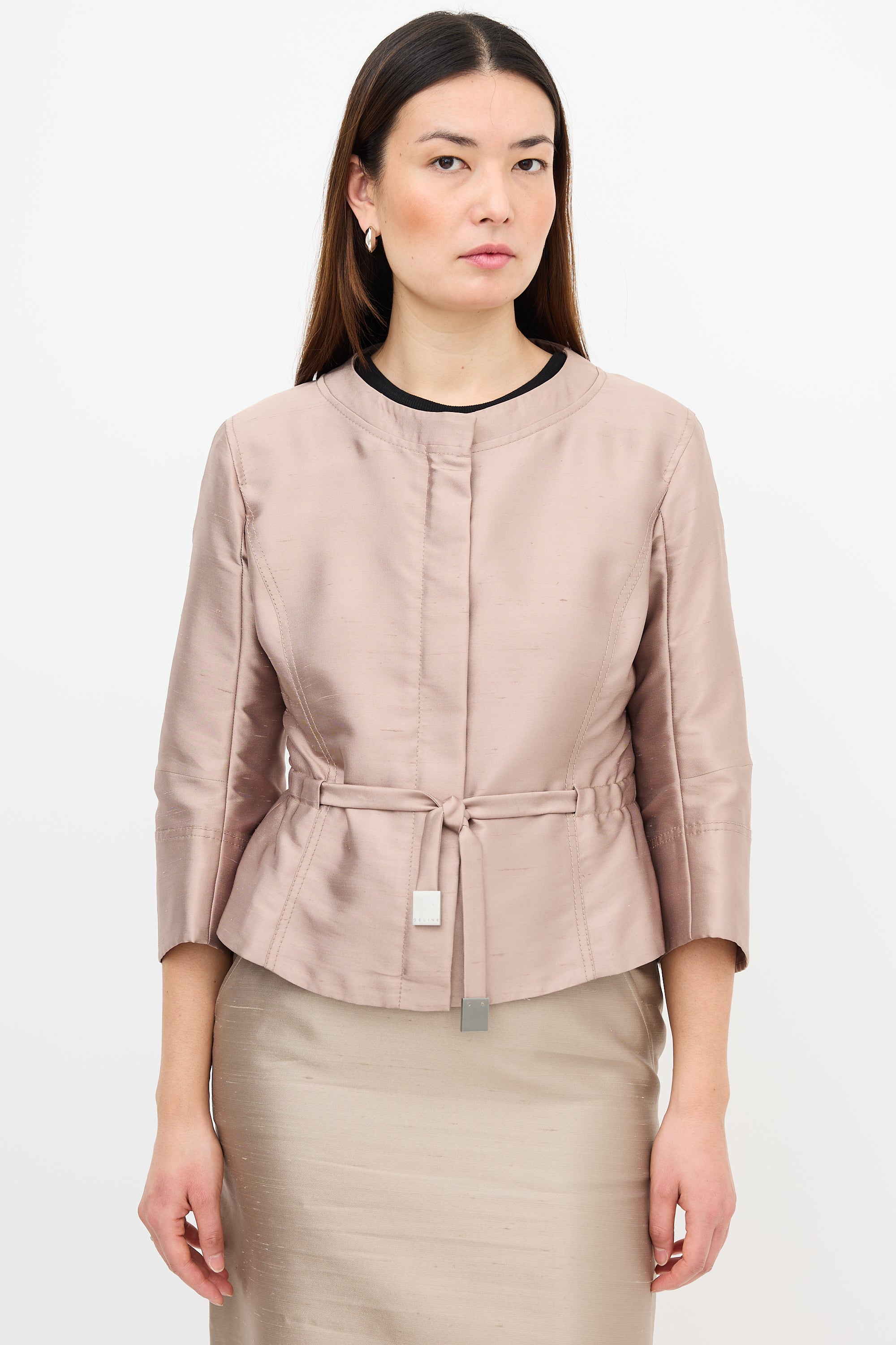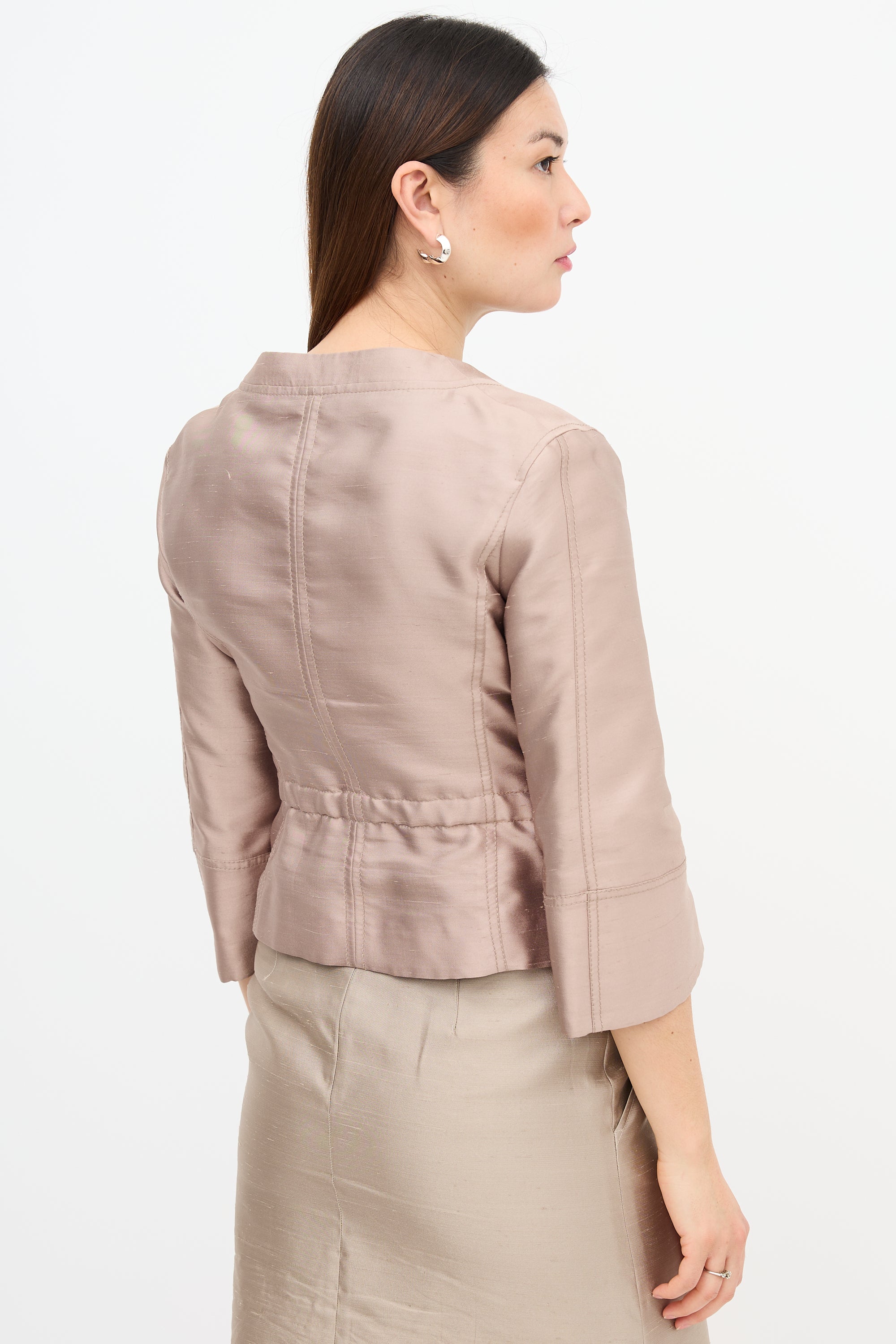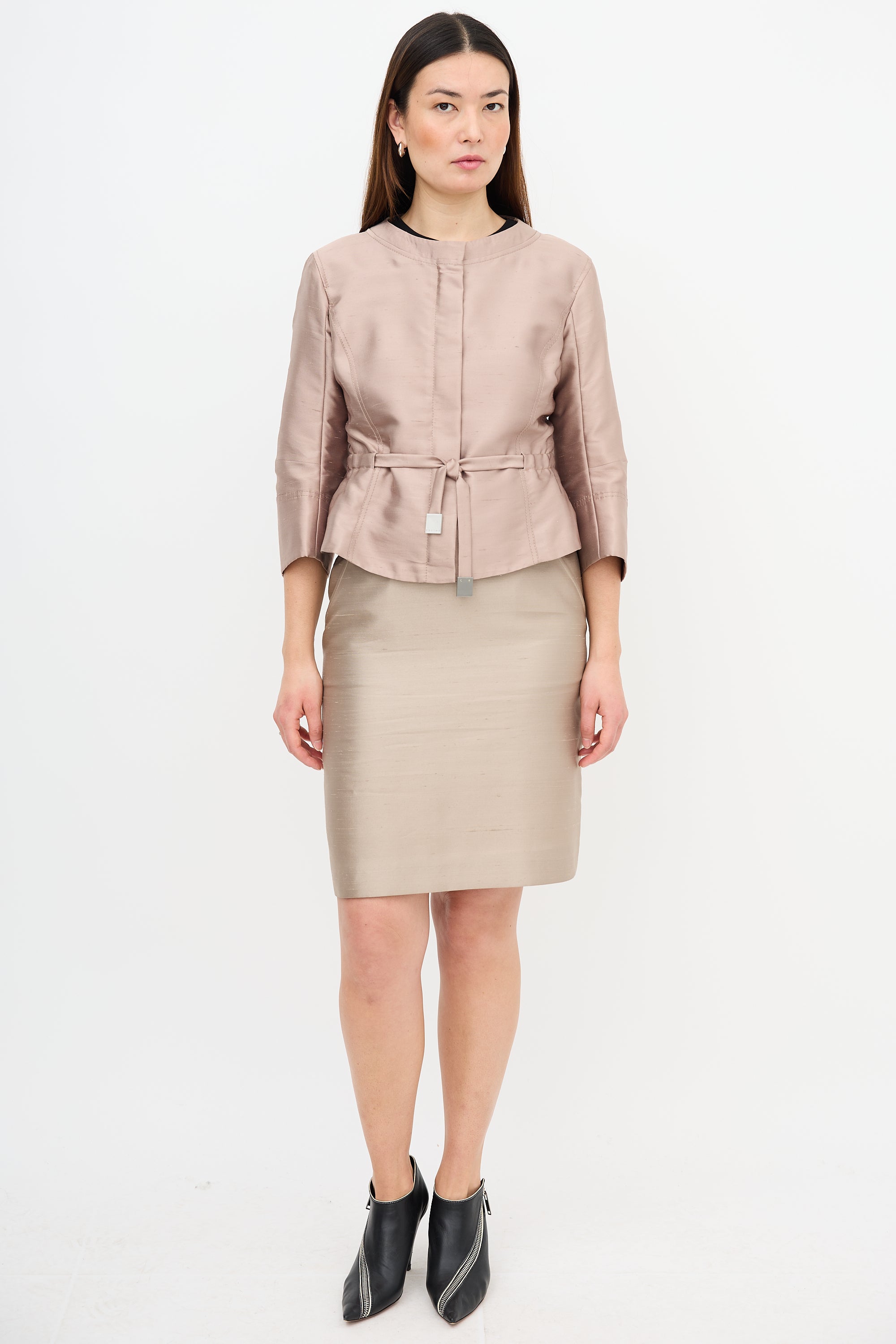 Pre-owned Celine brown silk jacket featuring a round neckline, silver tone hardware, zip up front with Triomphe logo charm, three quarter length sleeves, and a drawstring waist with logo hardware at ends. Matching skirt with back zip closure with hook fastening, two slash pockets at hip, and belted waist with silver tone square logo buckle. Lined.