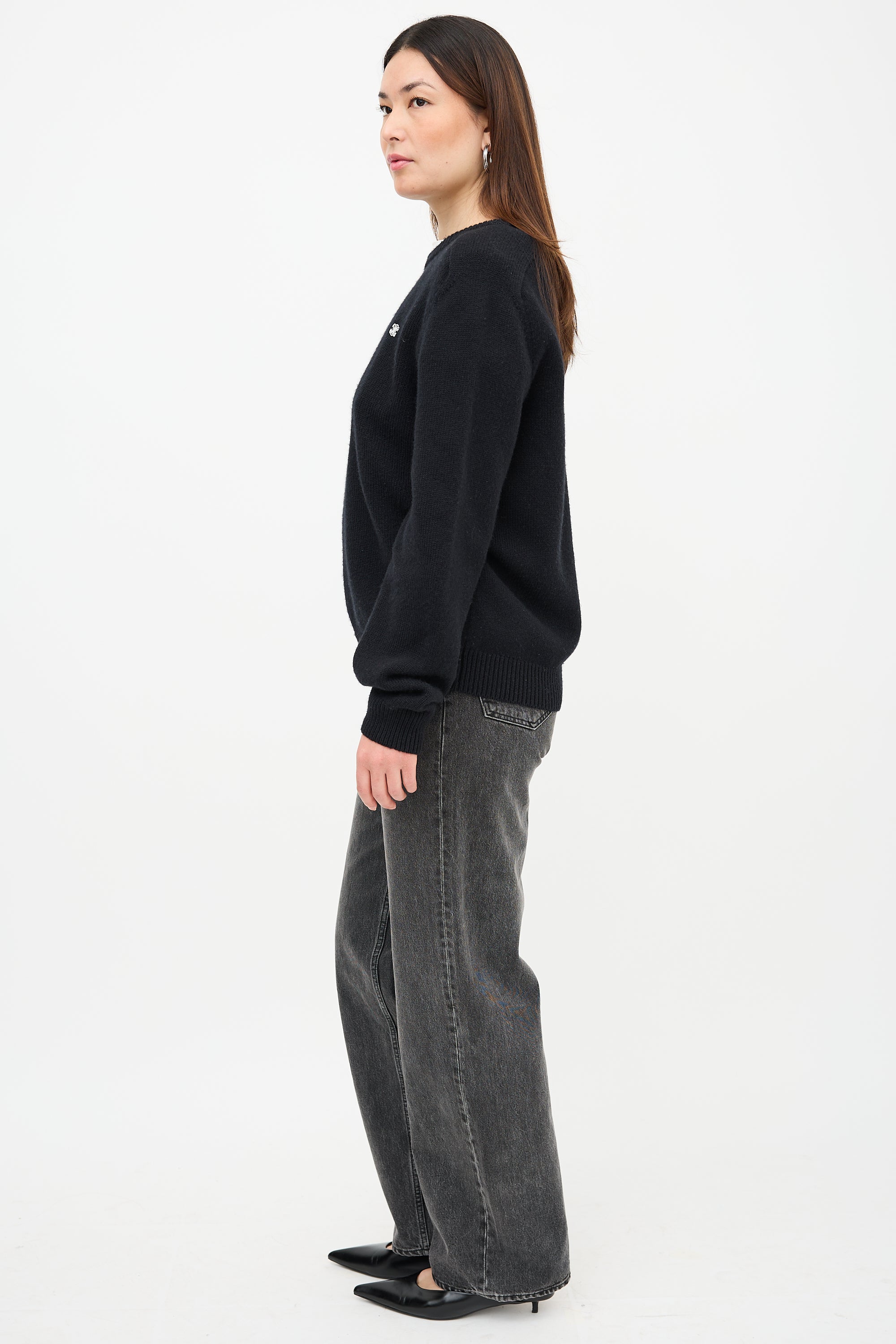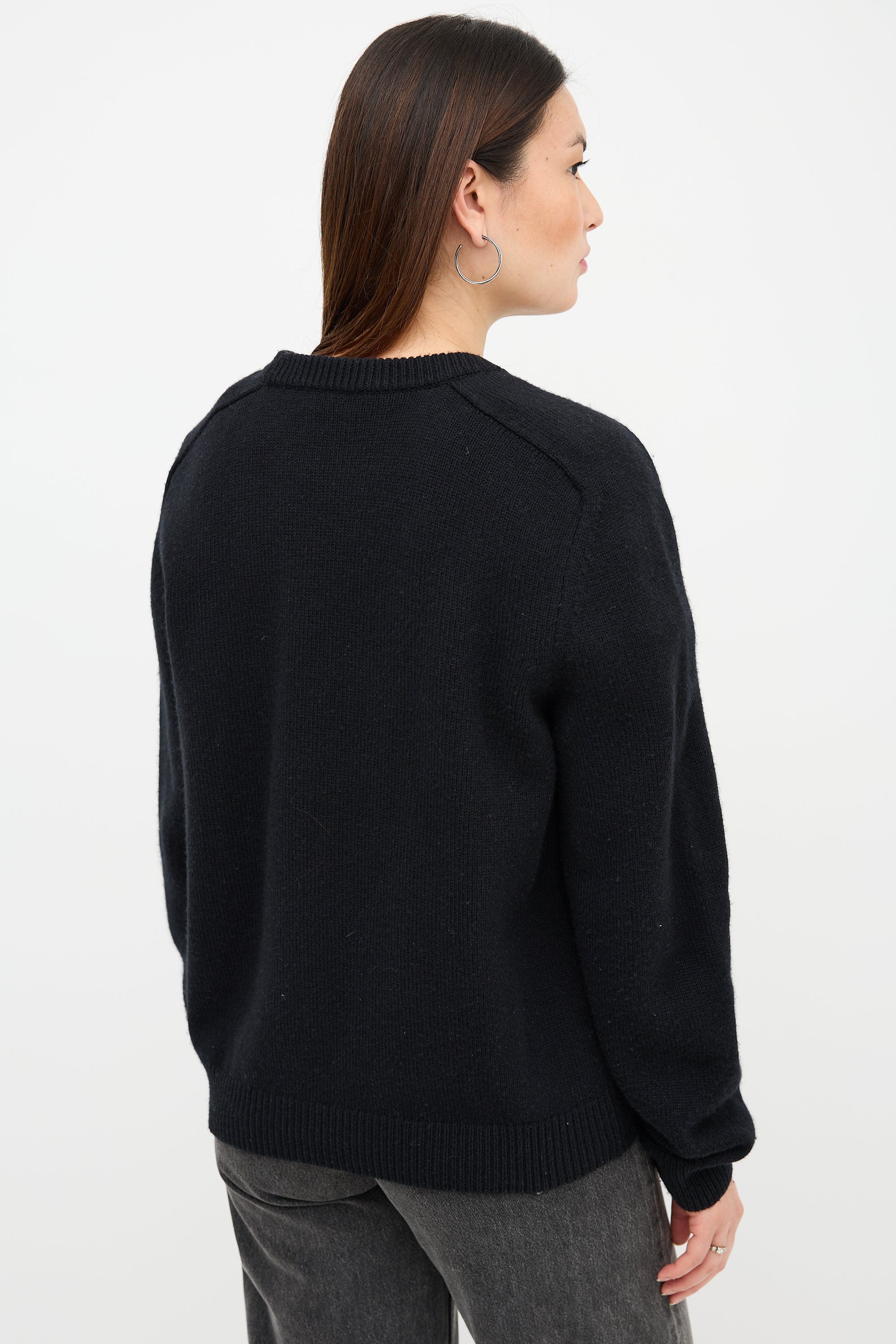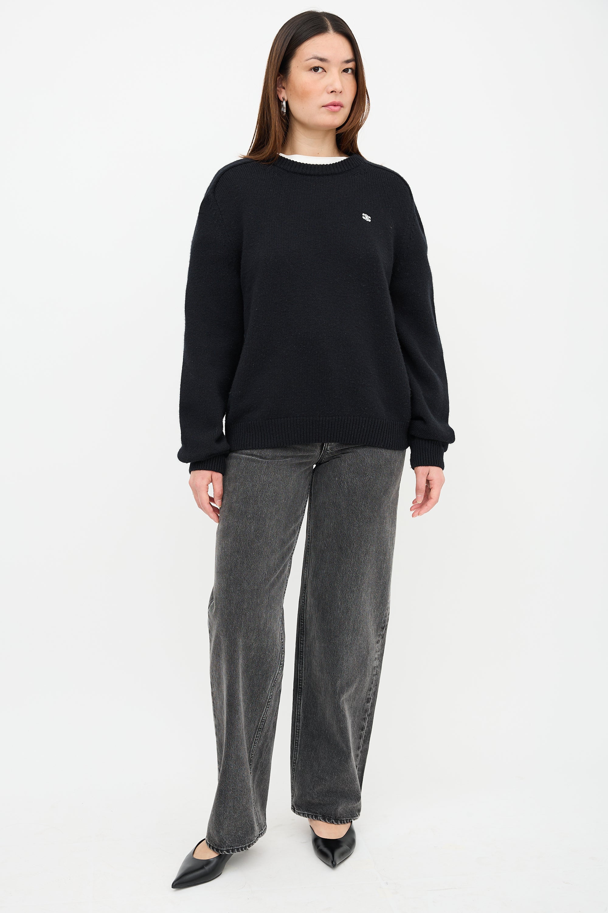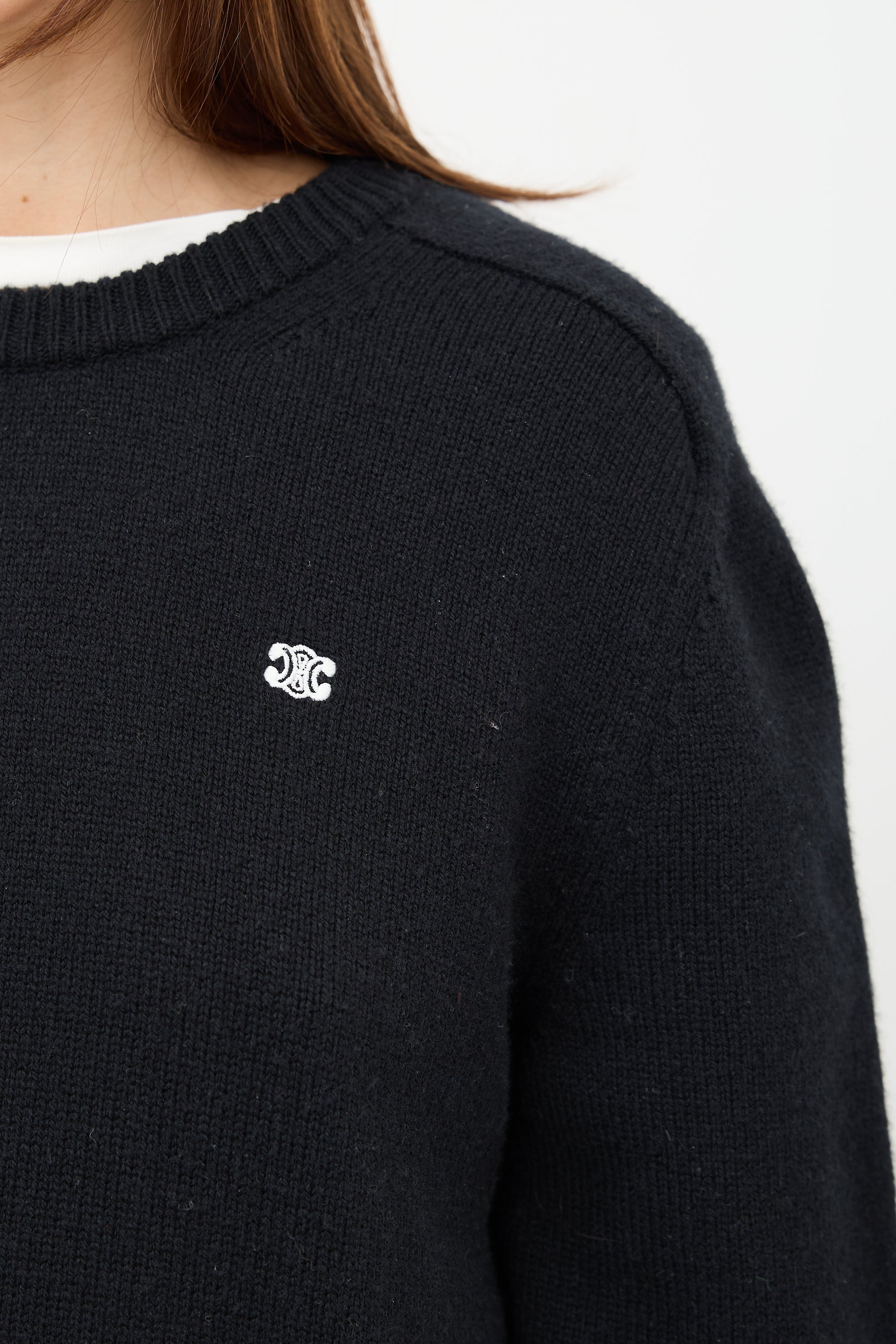 Pre-owned Celine black wool and cashmere blend sweater featuring crew neck, white embroidered Triomphe logo at left chest, and ribbed collar, hem, and cuffs.