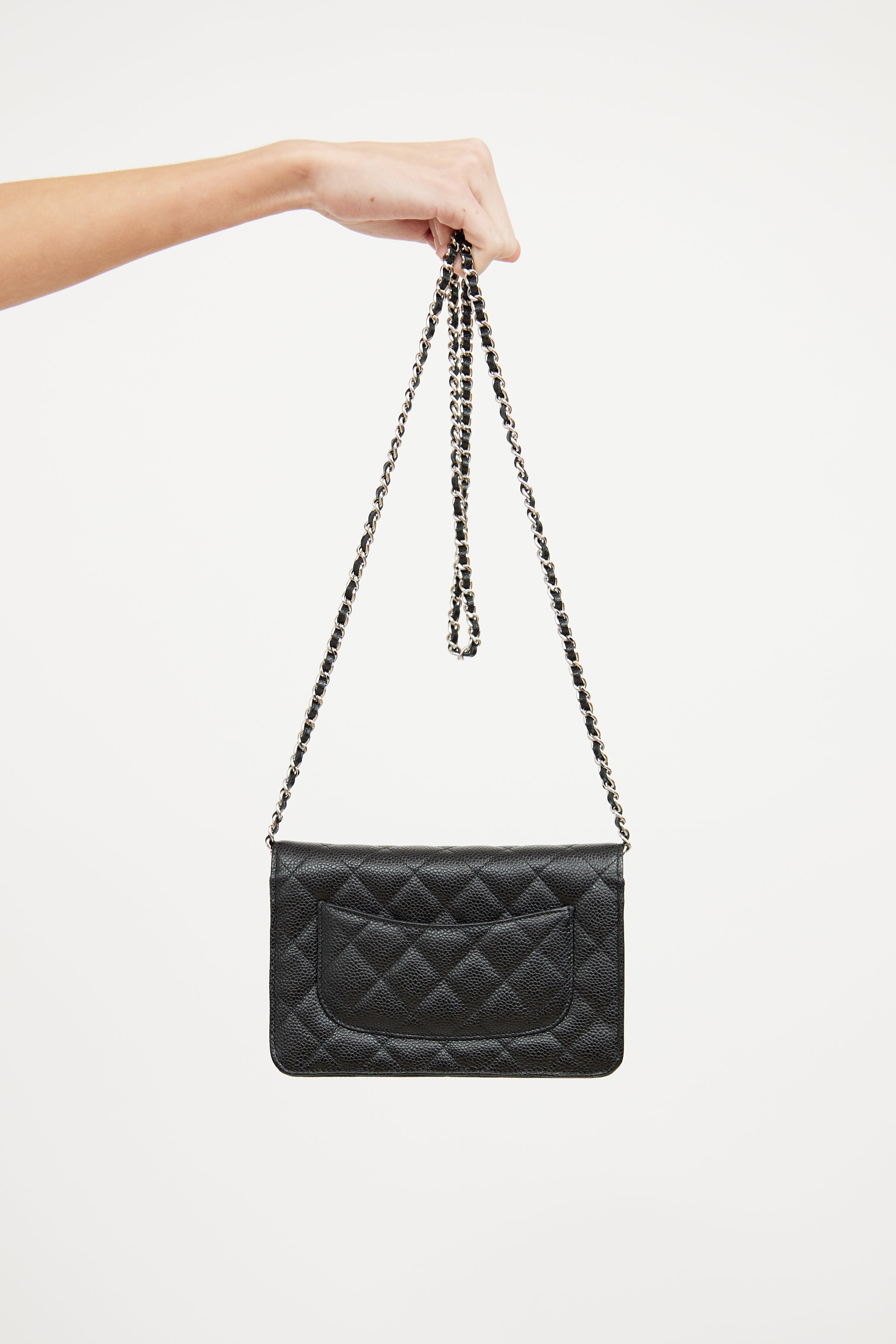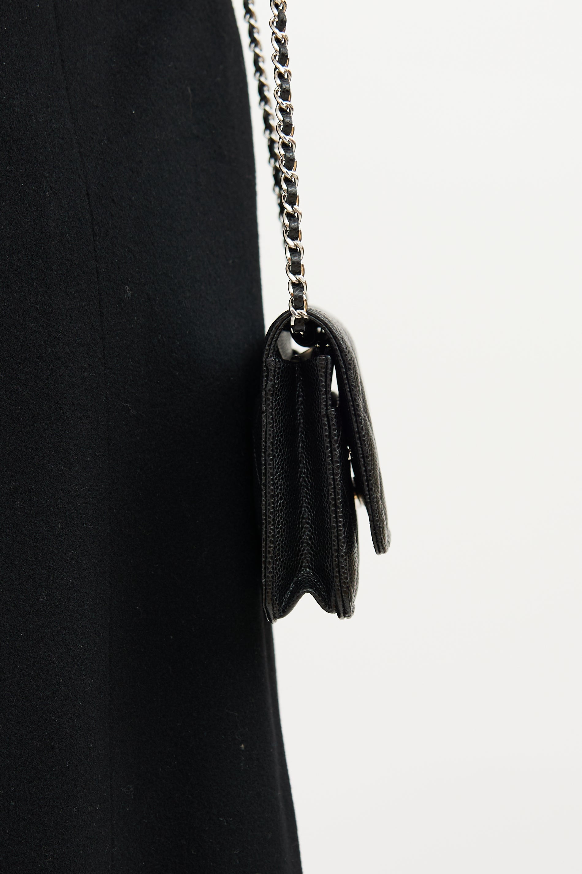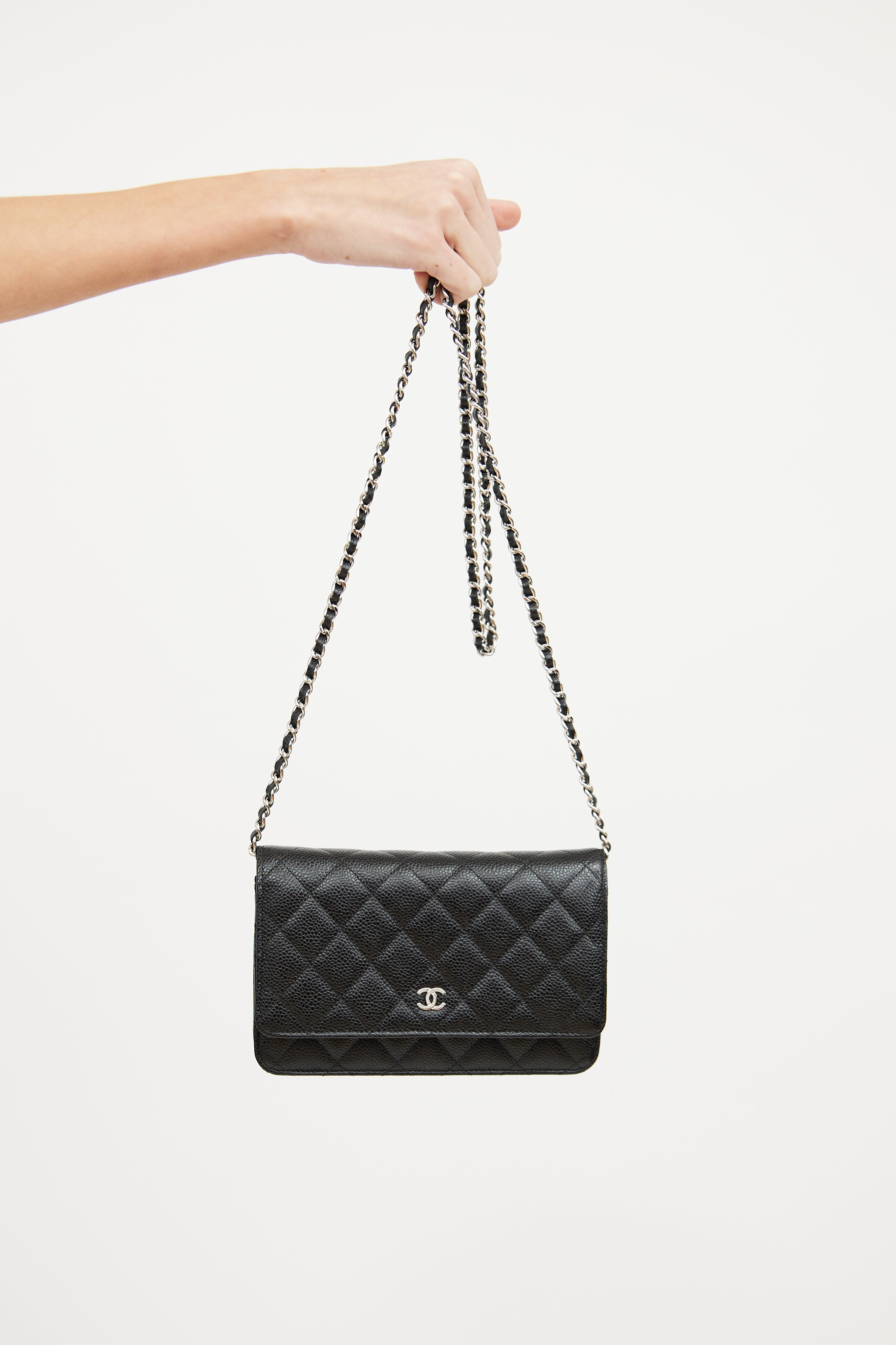 Pre-owned Chanel 2019 black wallet on chain bag featuring quilted grain leather, braided leather and chain strap, silver tone CC logo at front, magnetic closure, slip pocket at back, zip pocket under top flap, interior zip and slip pockets, and six card slots.