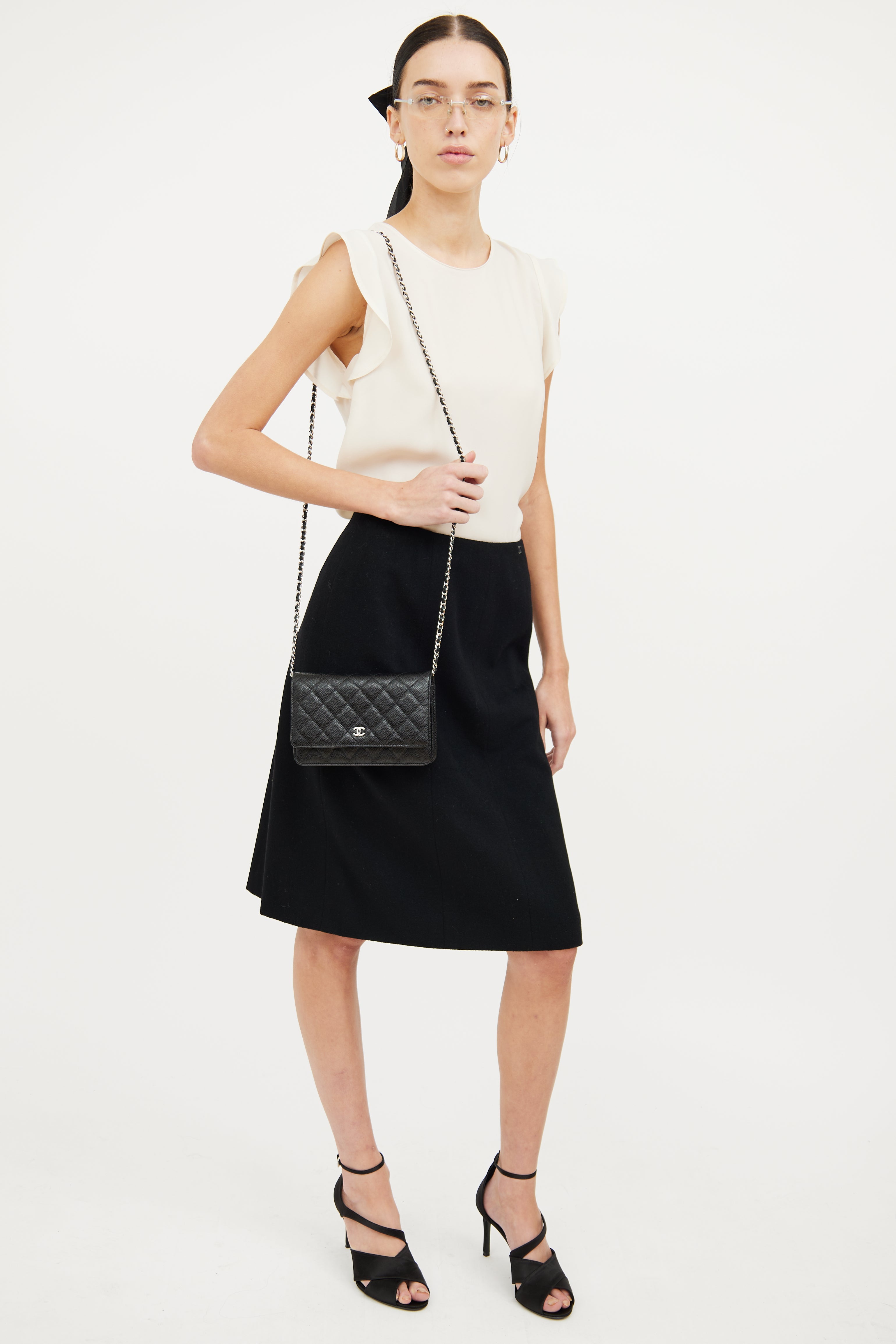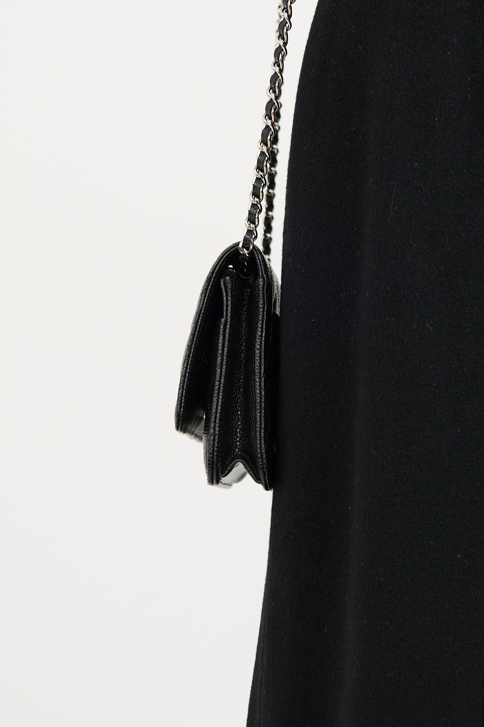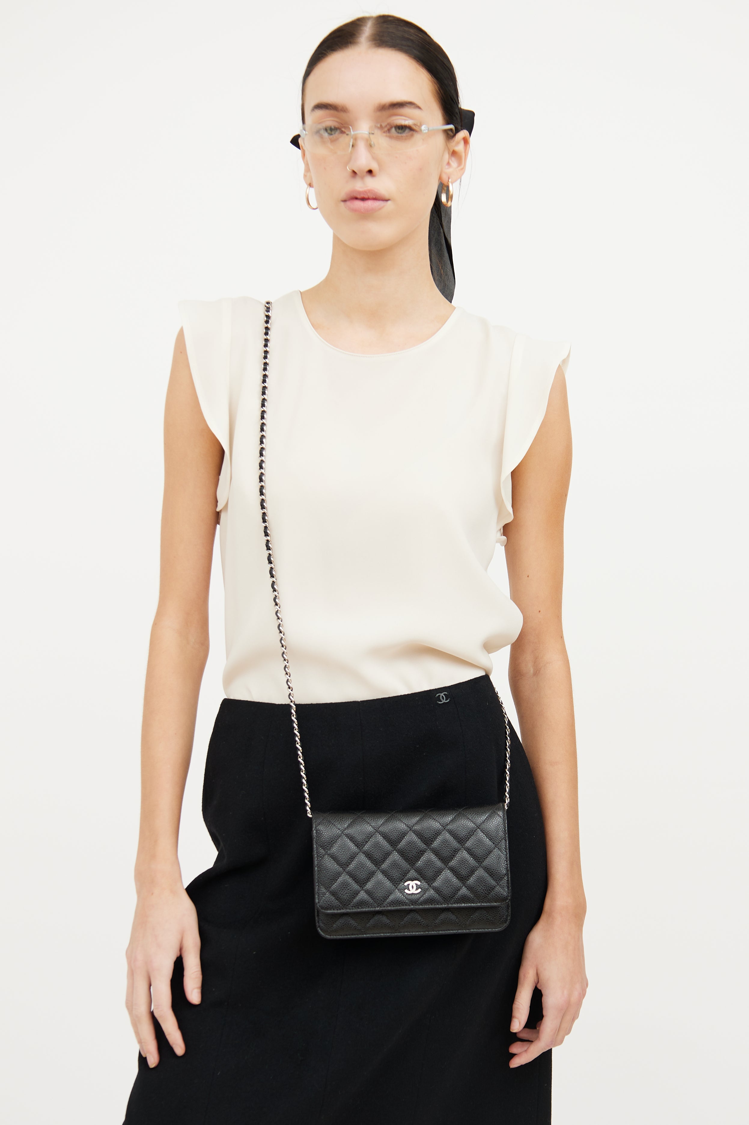 Pre-owned Chanel 2019 black wallet on chain bag featuring quilted grain leather, braided leather and chain strap, silver tone CC logo at front, magnetic closure, slip pocket at back, zip pocket under top flap, interior zip and slip pockets, and six card slots.