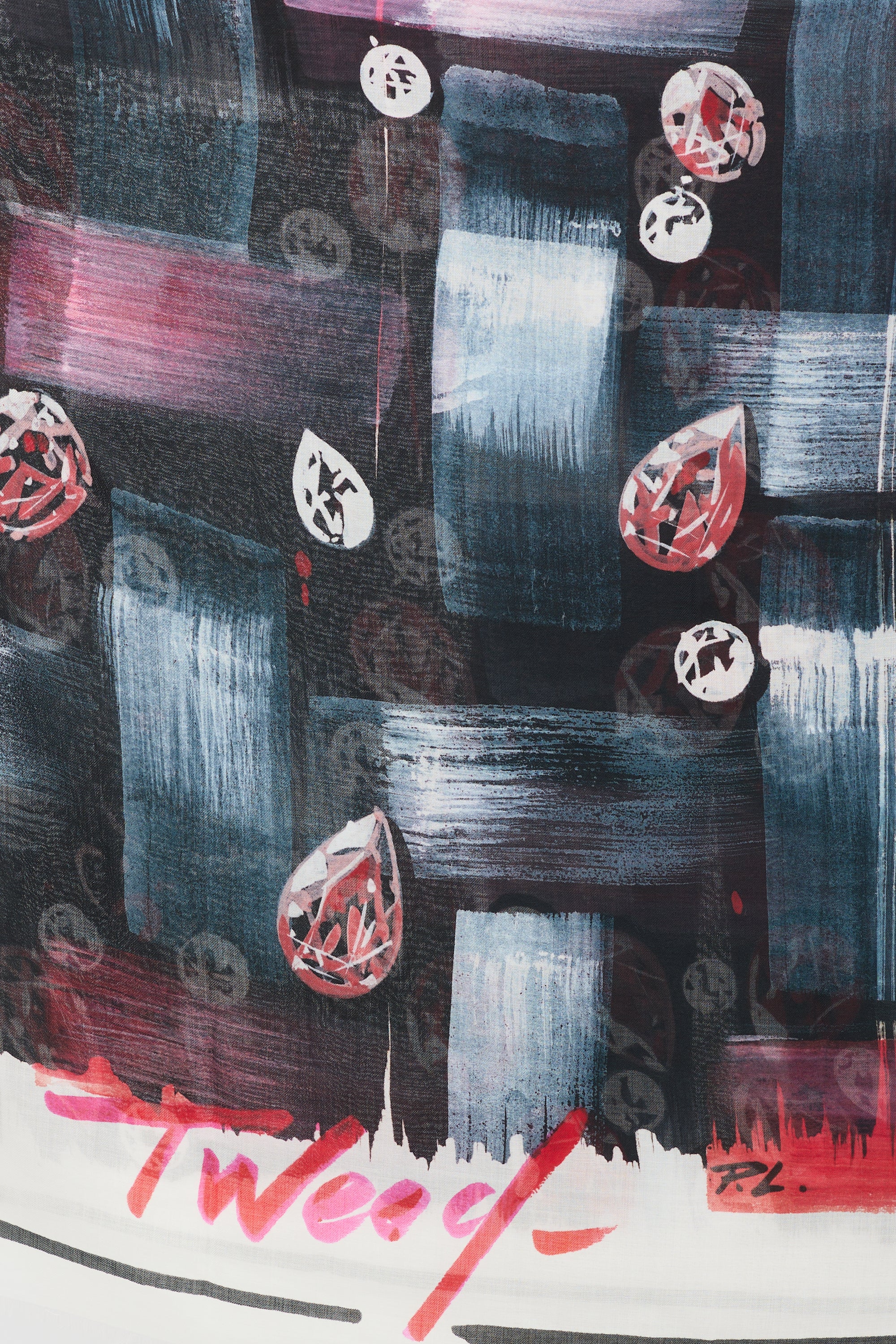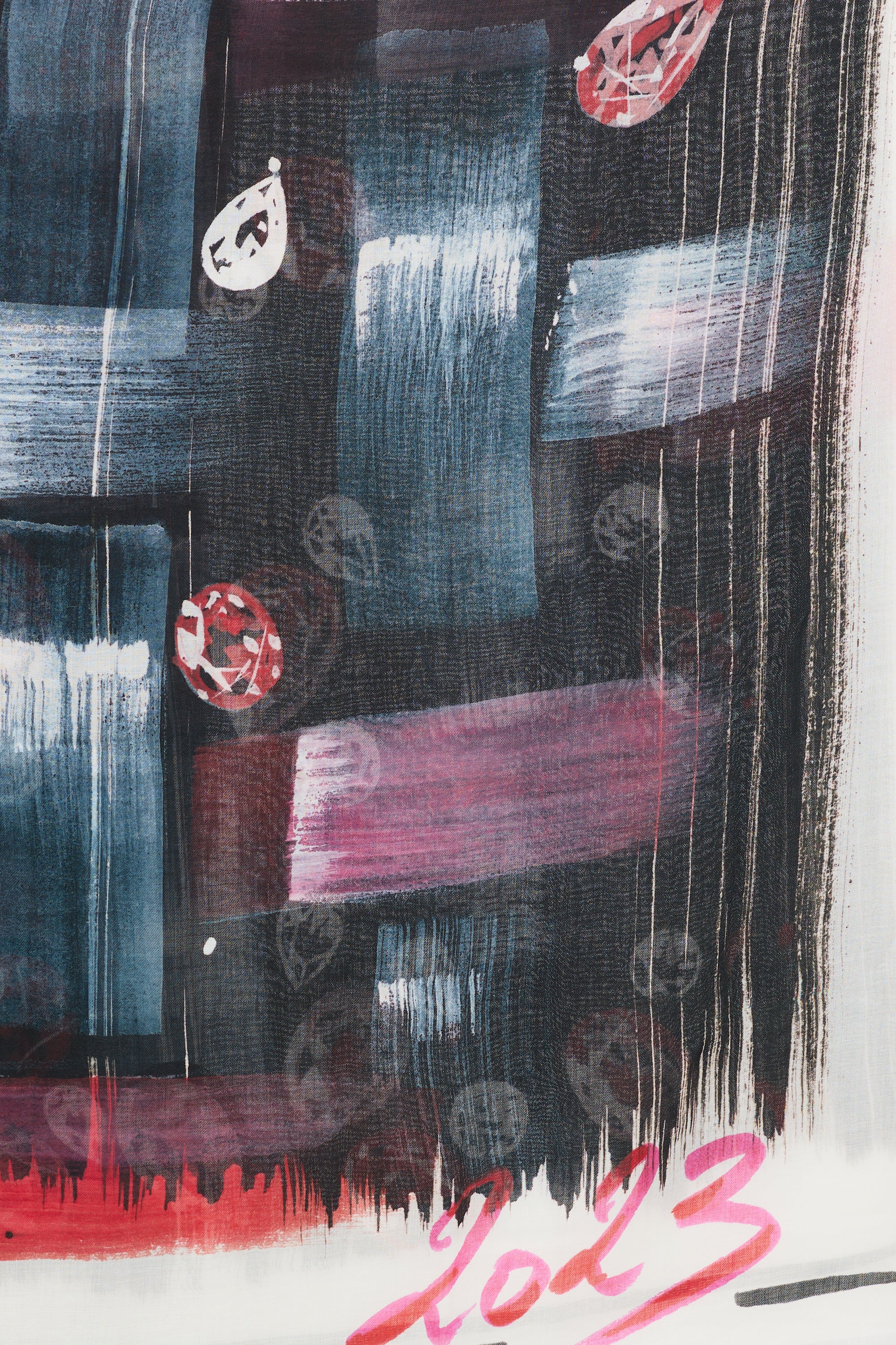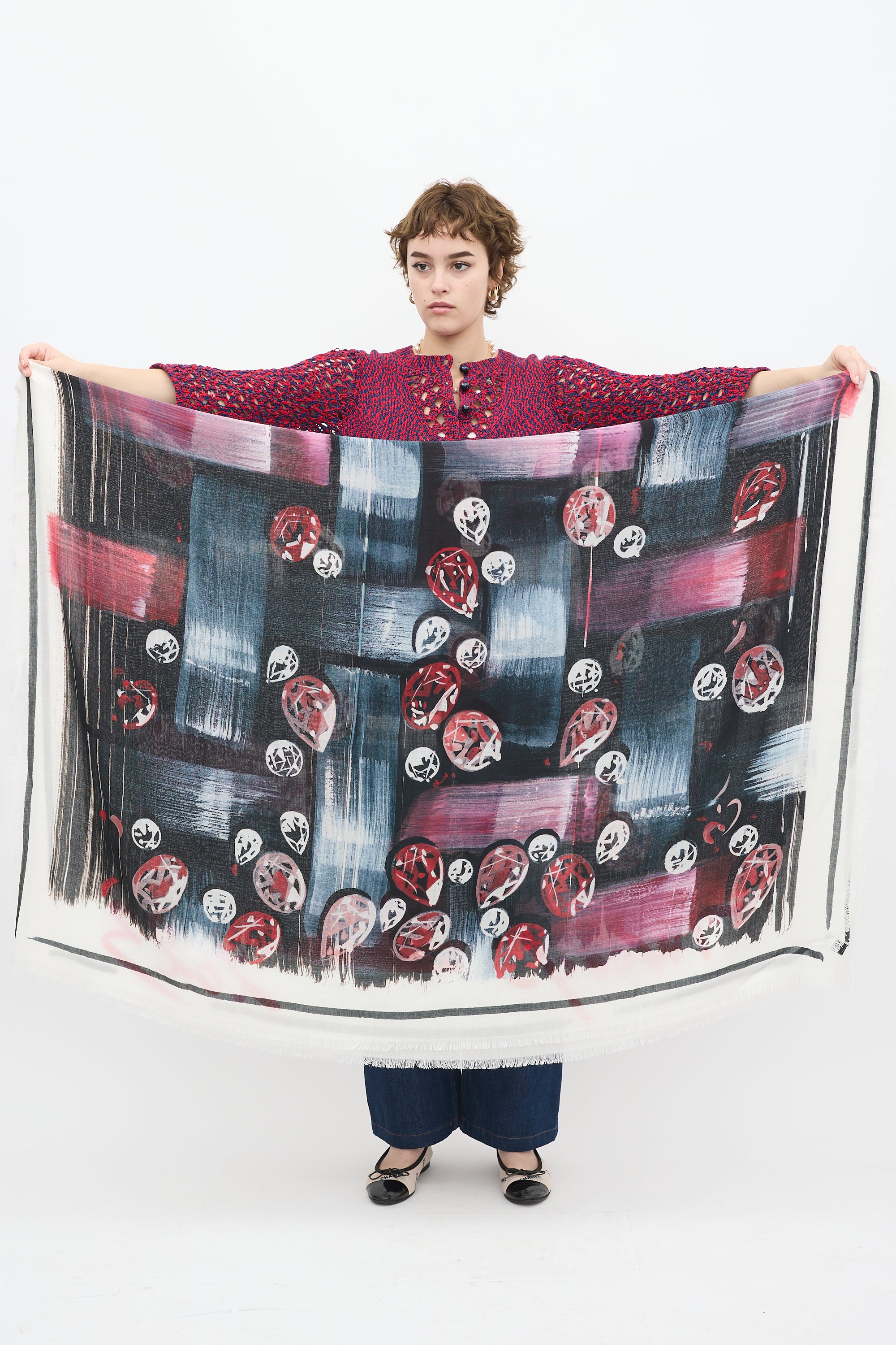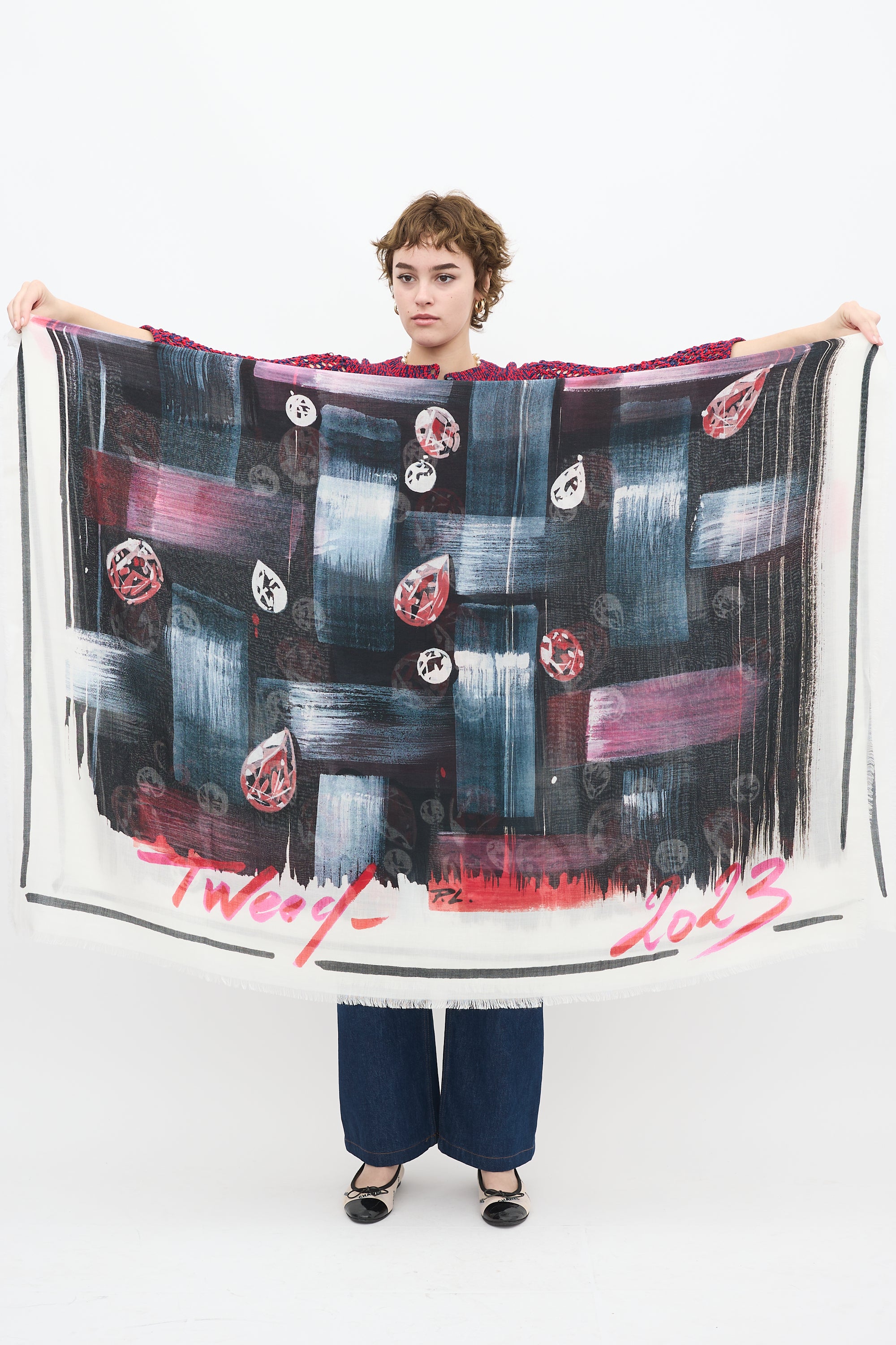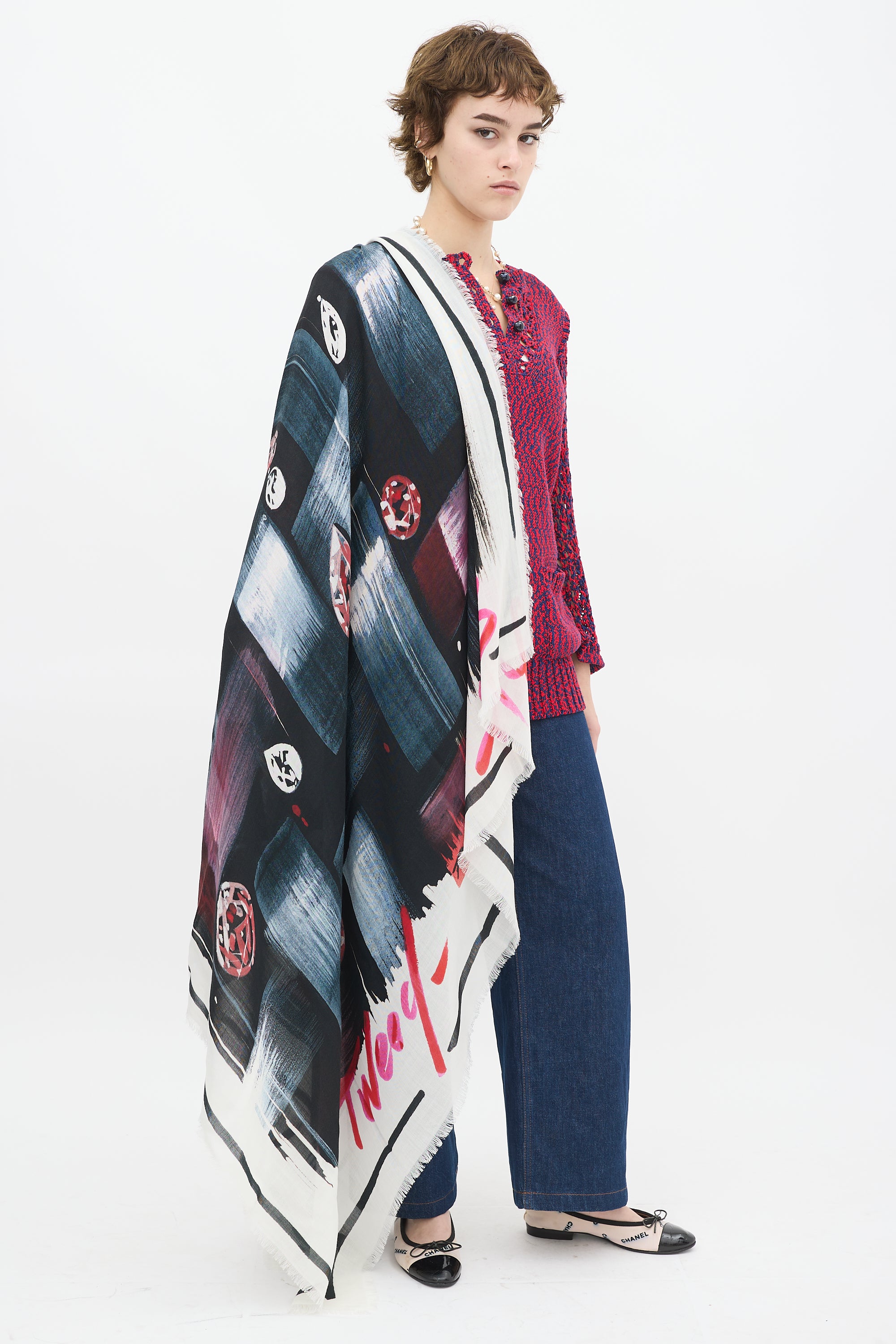 Pre-owned Chanel 2023 black and multicolour cashmere scarf featuring Tweed print, painted gem motif, and fringe trim along edges. Comes with original box.