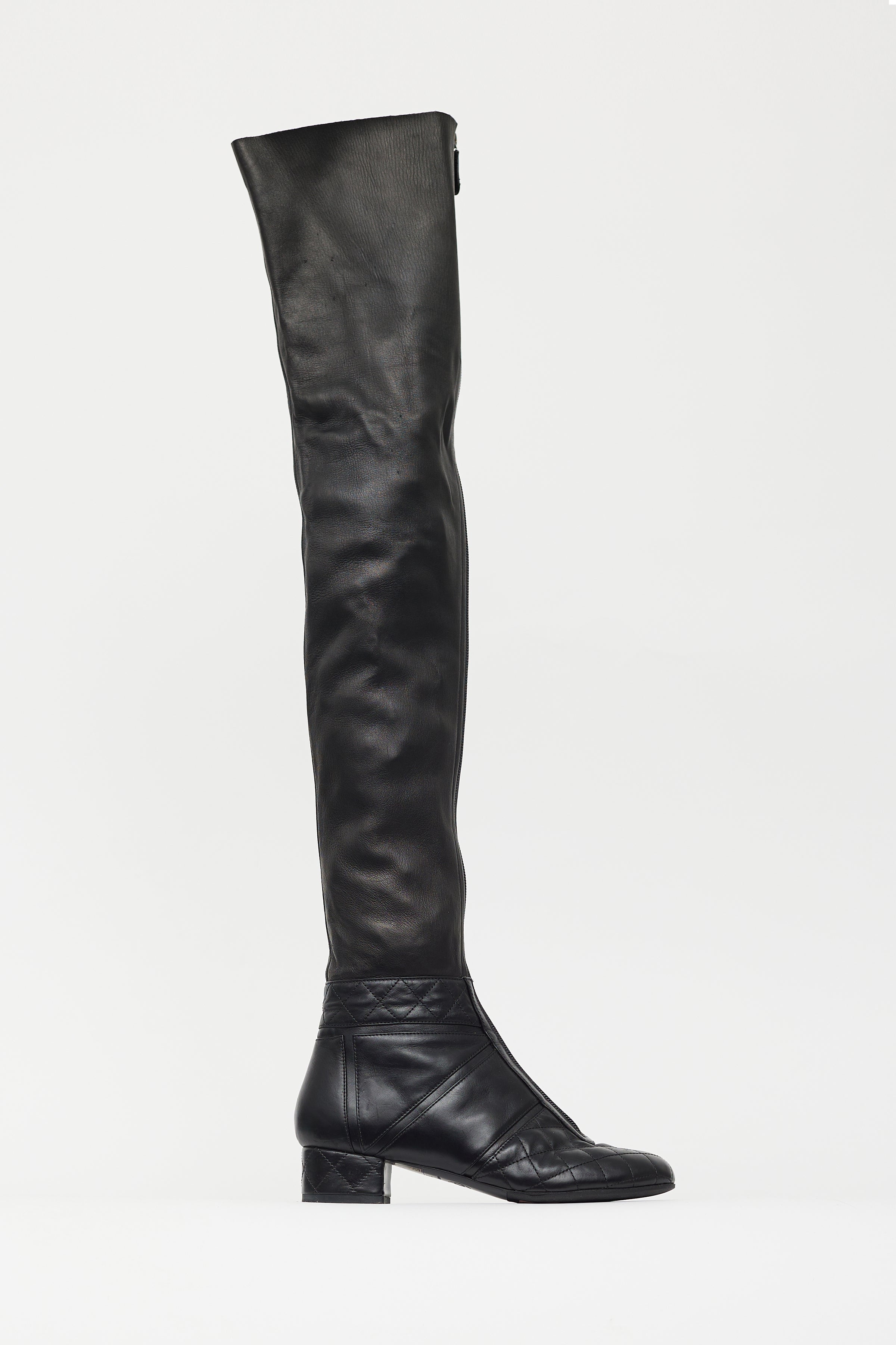Pre-owned Chanel black leather knee high boots featuring round toe, full front zip closure, mixed quilted leather, covered block heel, and leather insoles.