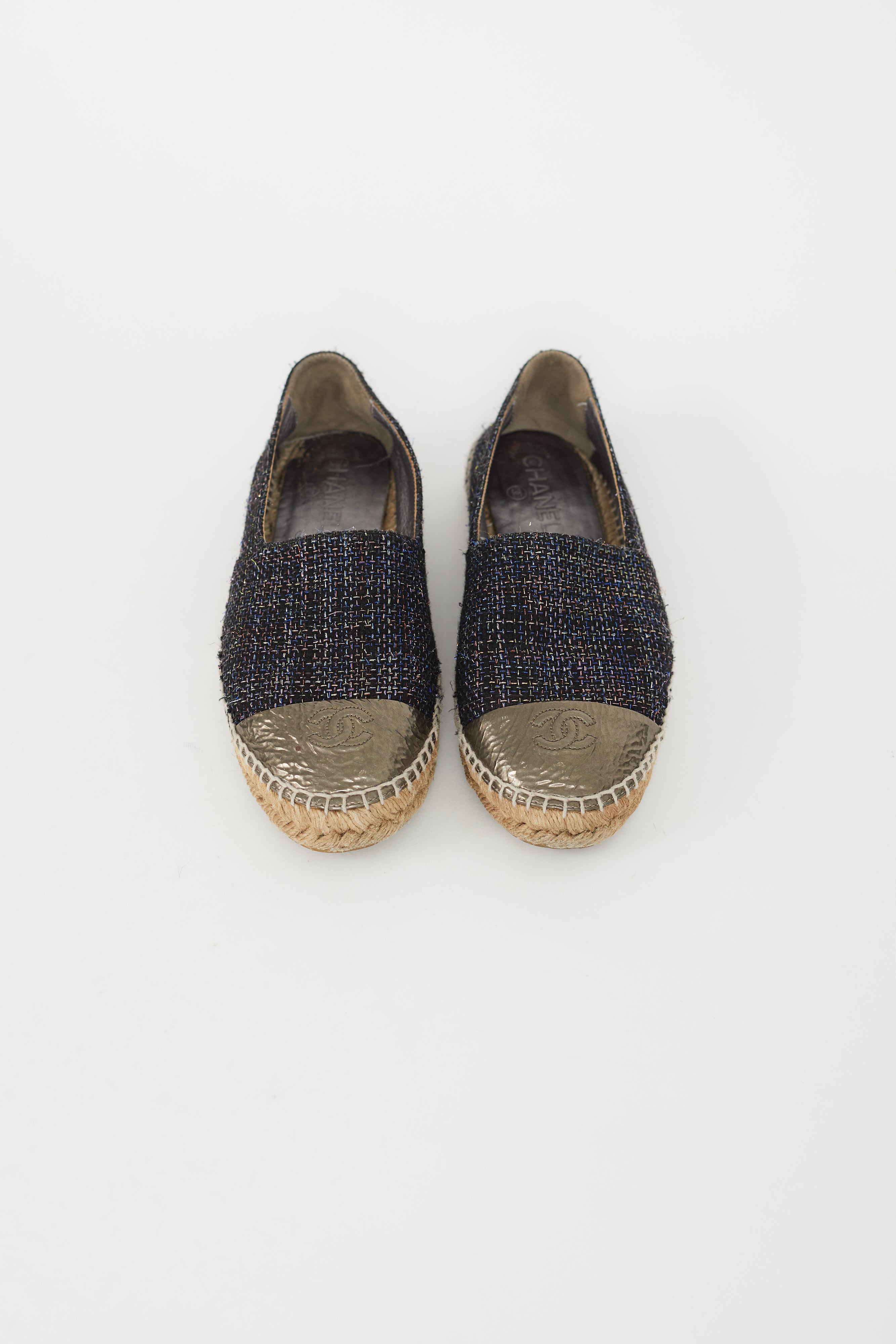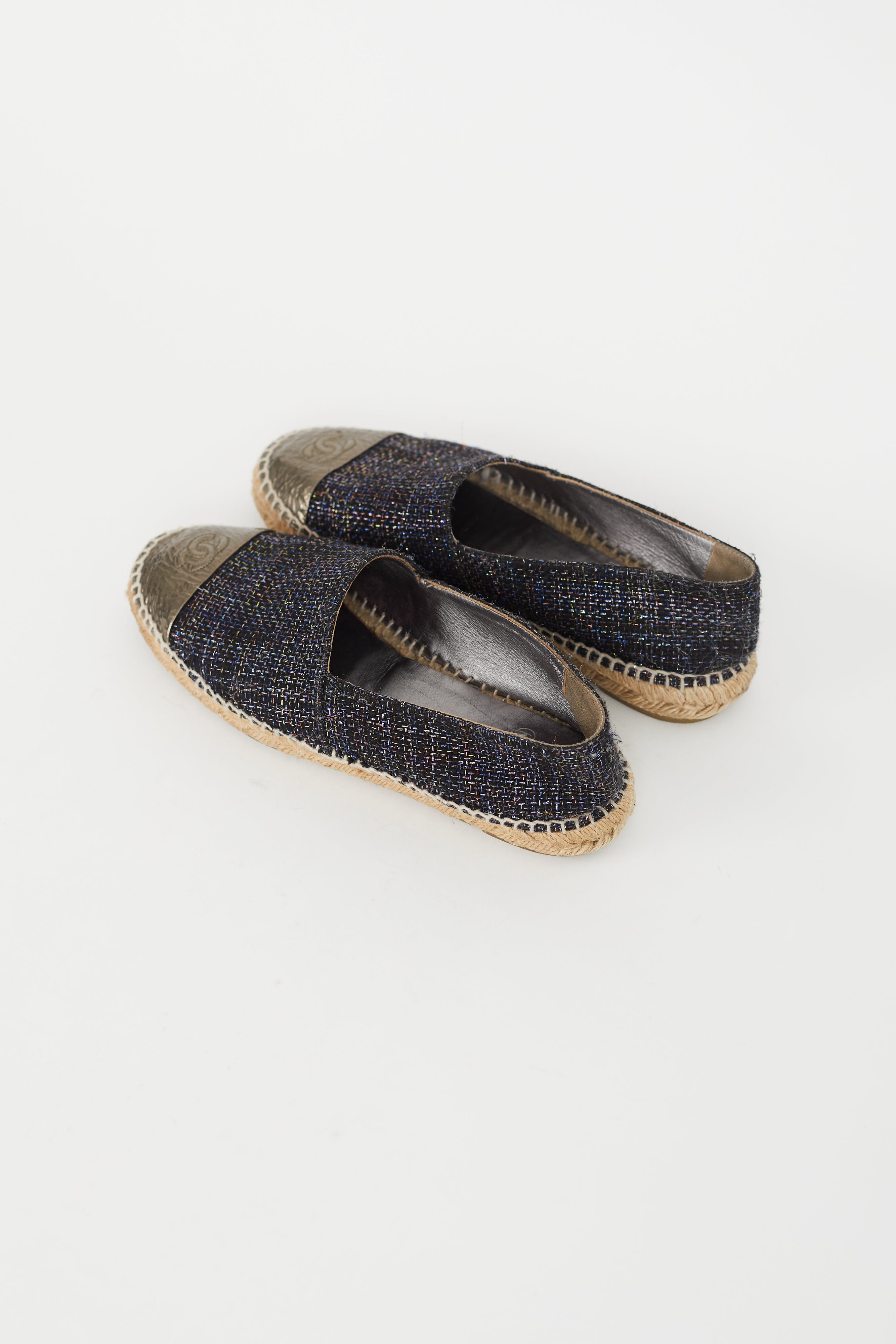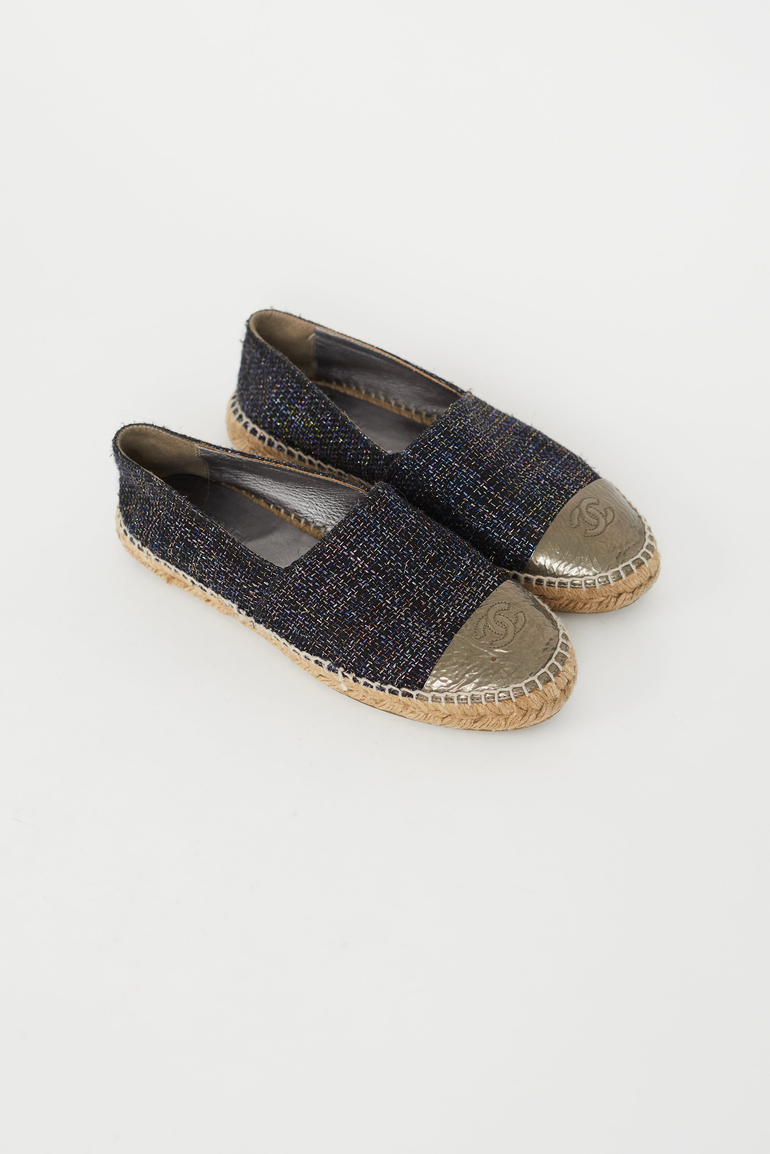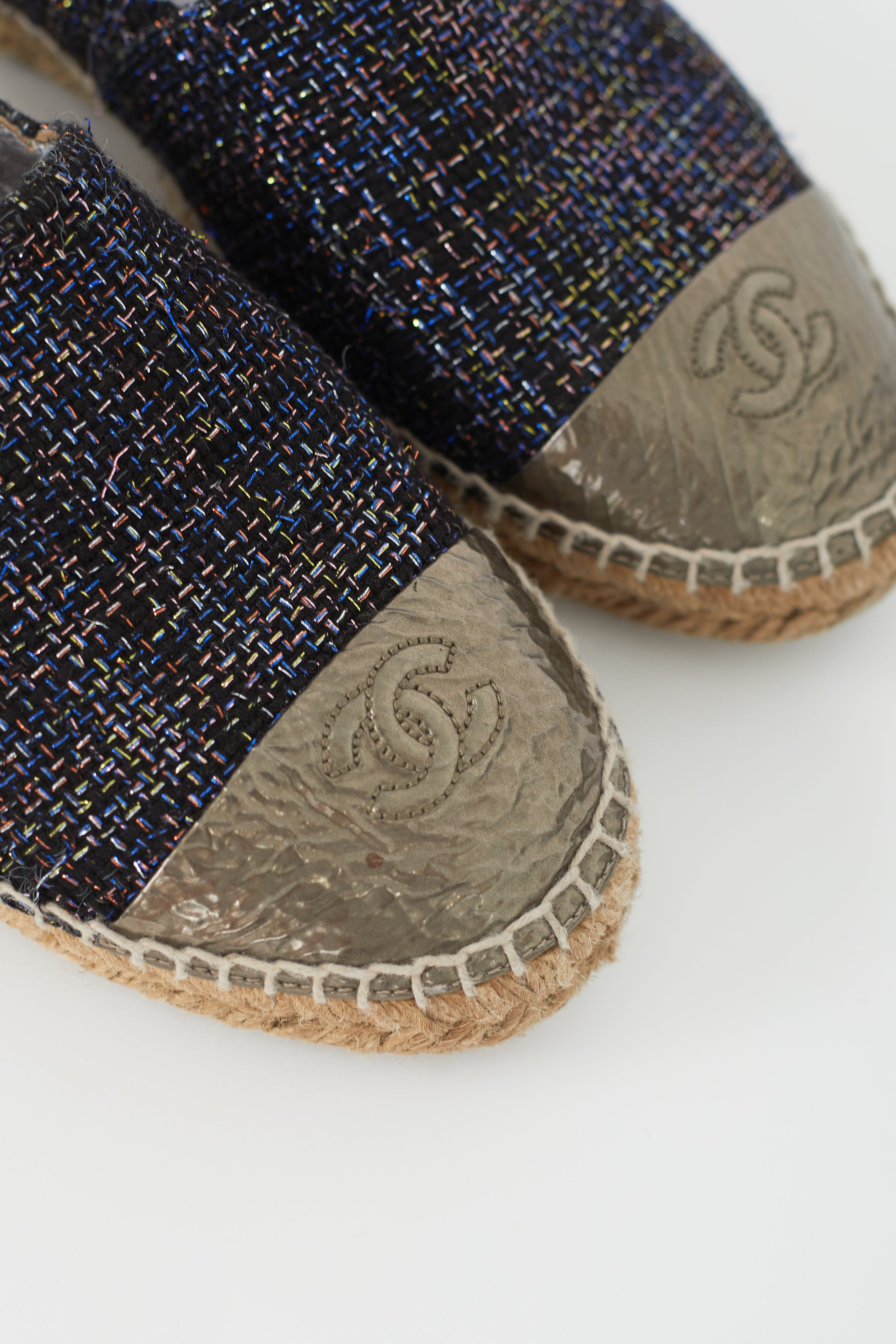 Pre-owned Chanel blue and multicolour tweed espadrille flat featuring a rounded toe, shiny grey toe cap with tonal embroidered CC logo, navy blue upper with multicolour metallic threads throughout, espadrille midsole, rubber outsole, silver leather insole and a slip on entry.
