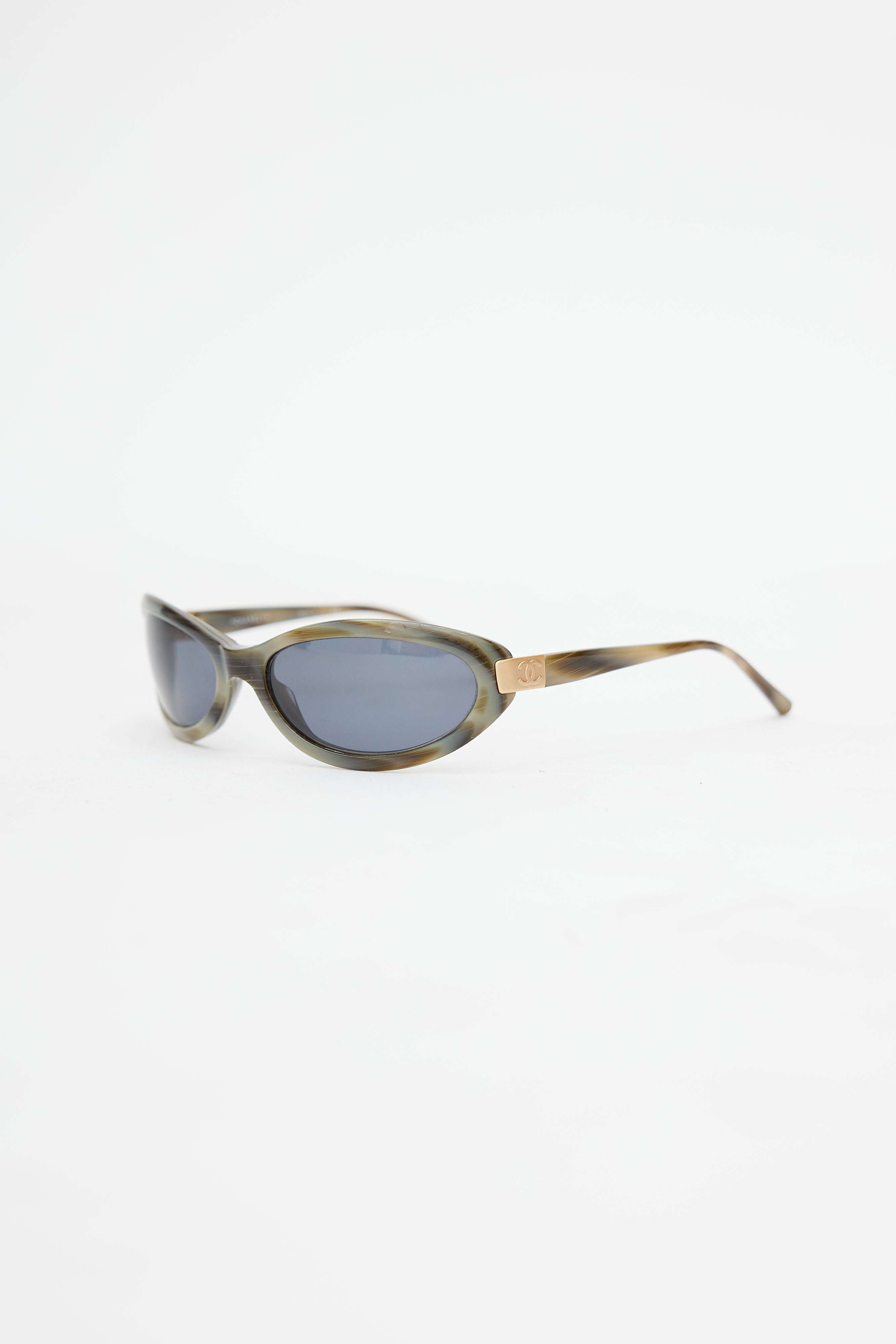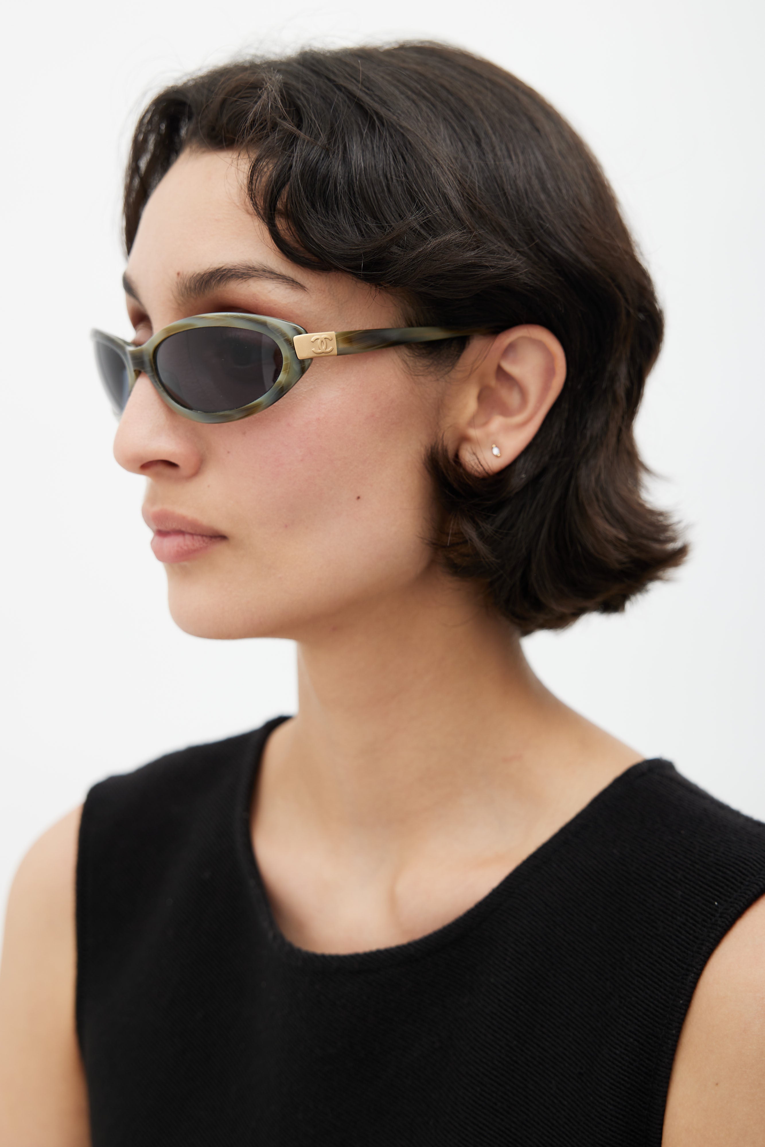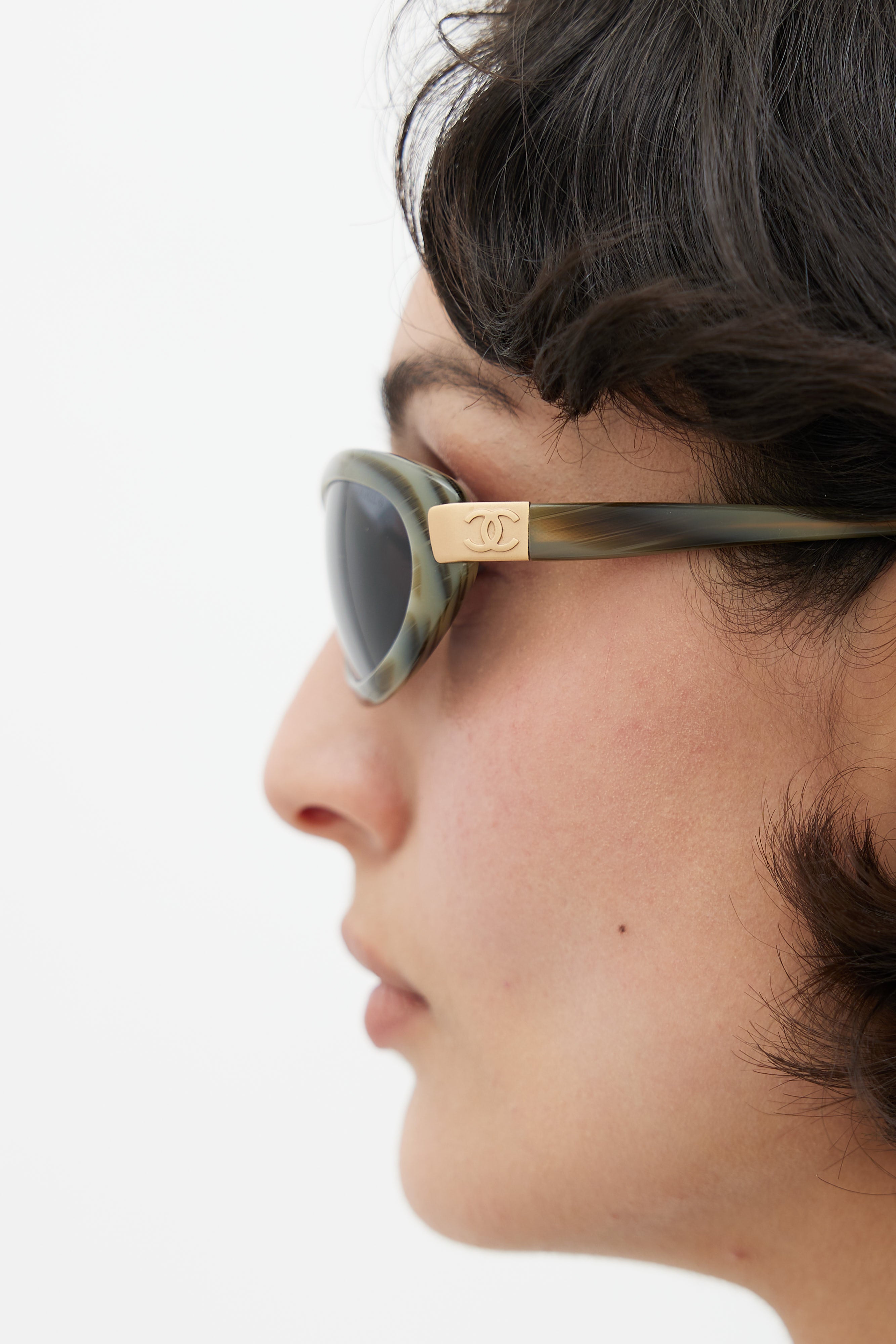 Pre-owned Chanel 5027 green oval sunglasses featuring gradient frame, black oval lens, nose saddle bridge, and gold tone CC logo at temple and tip.