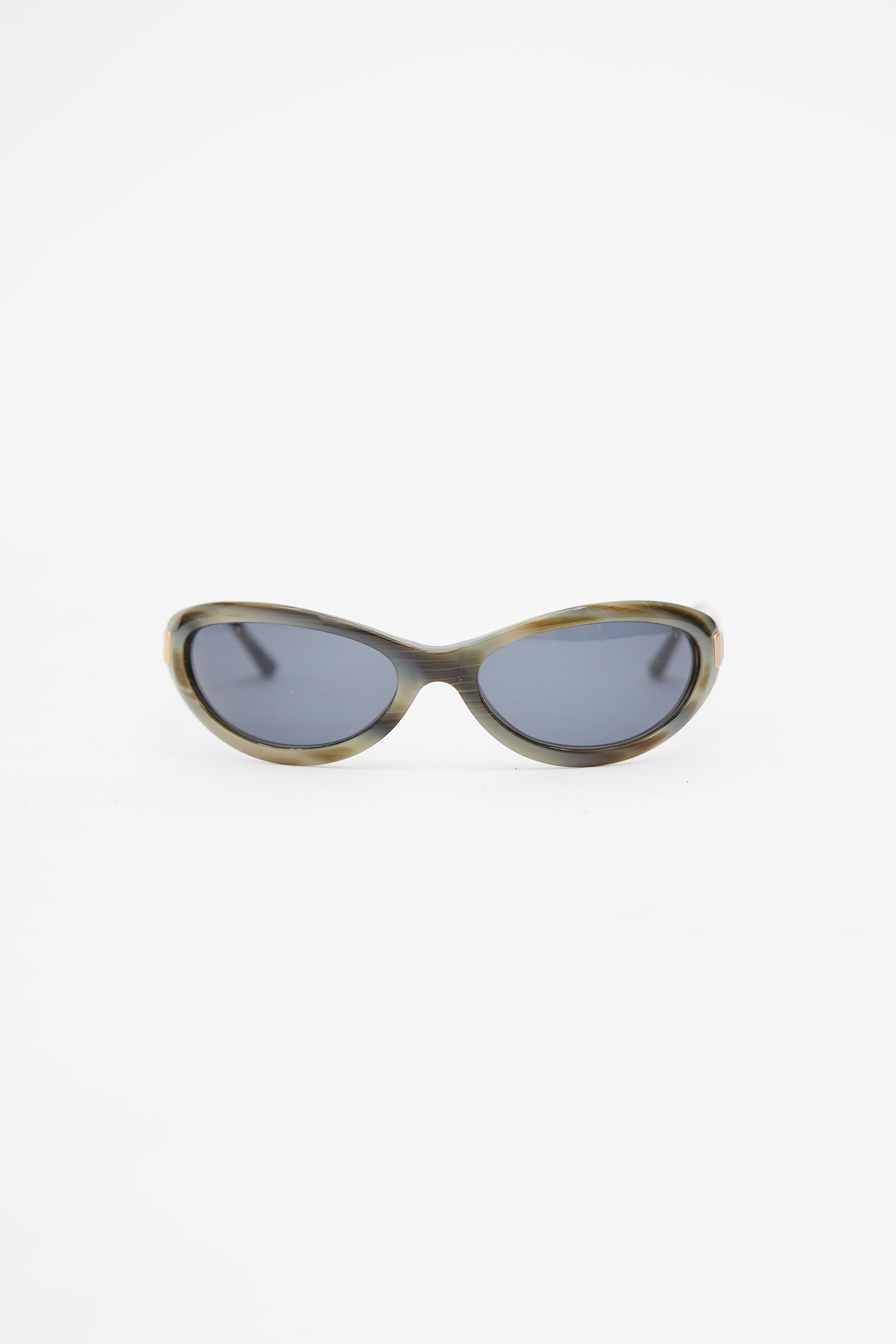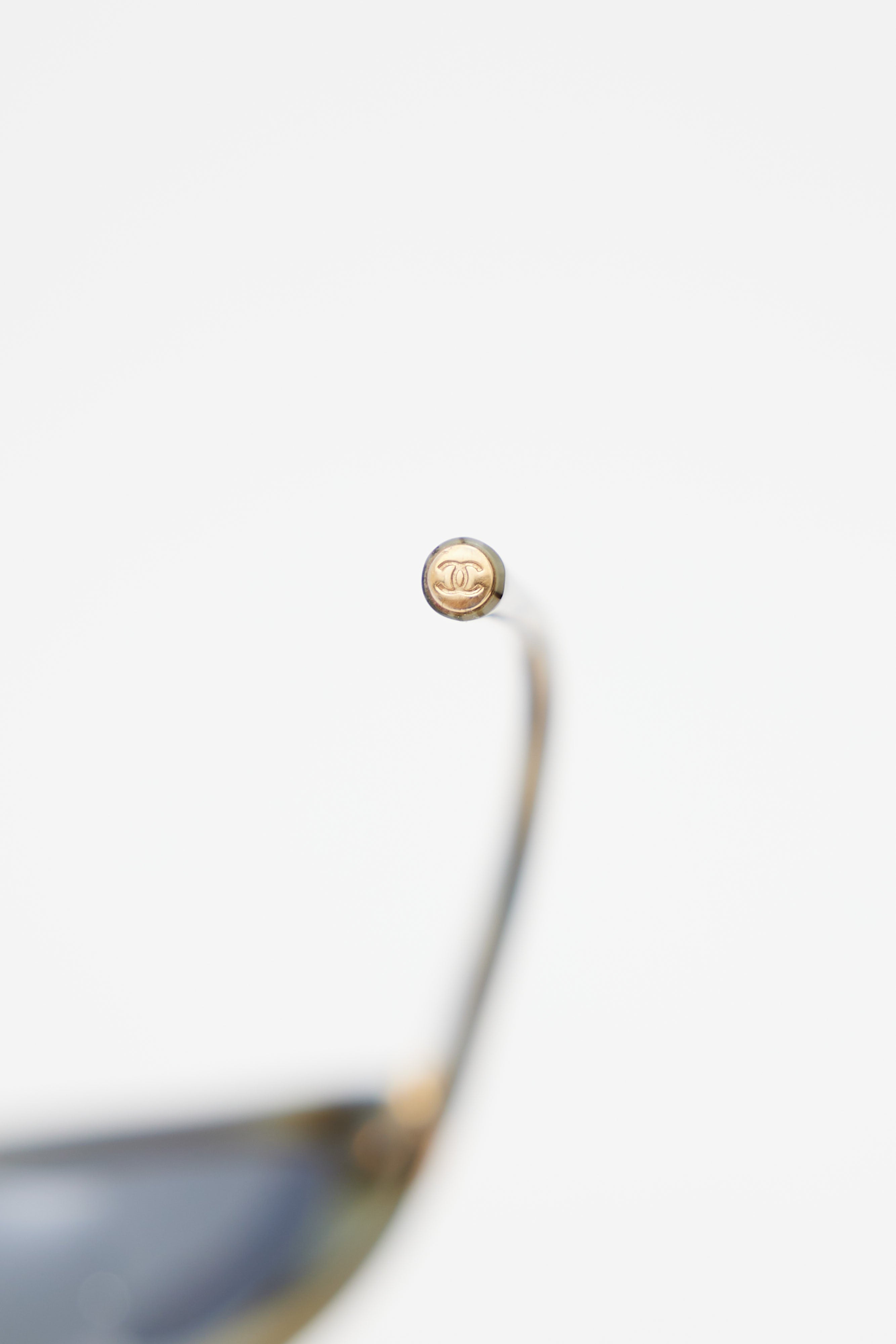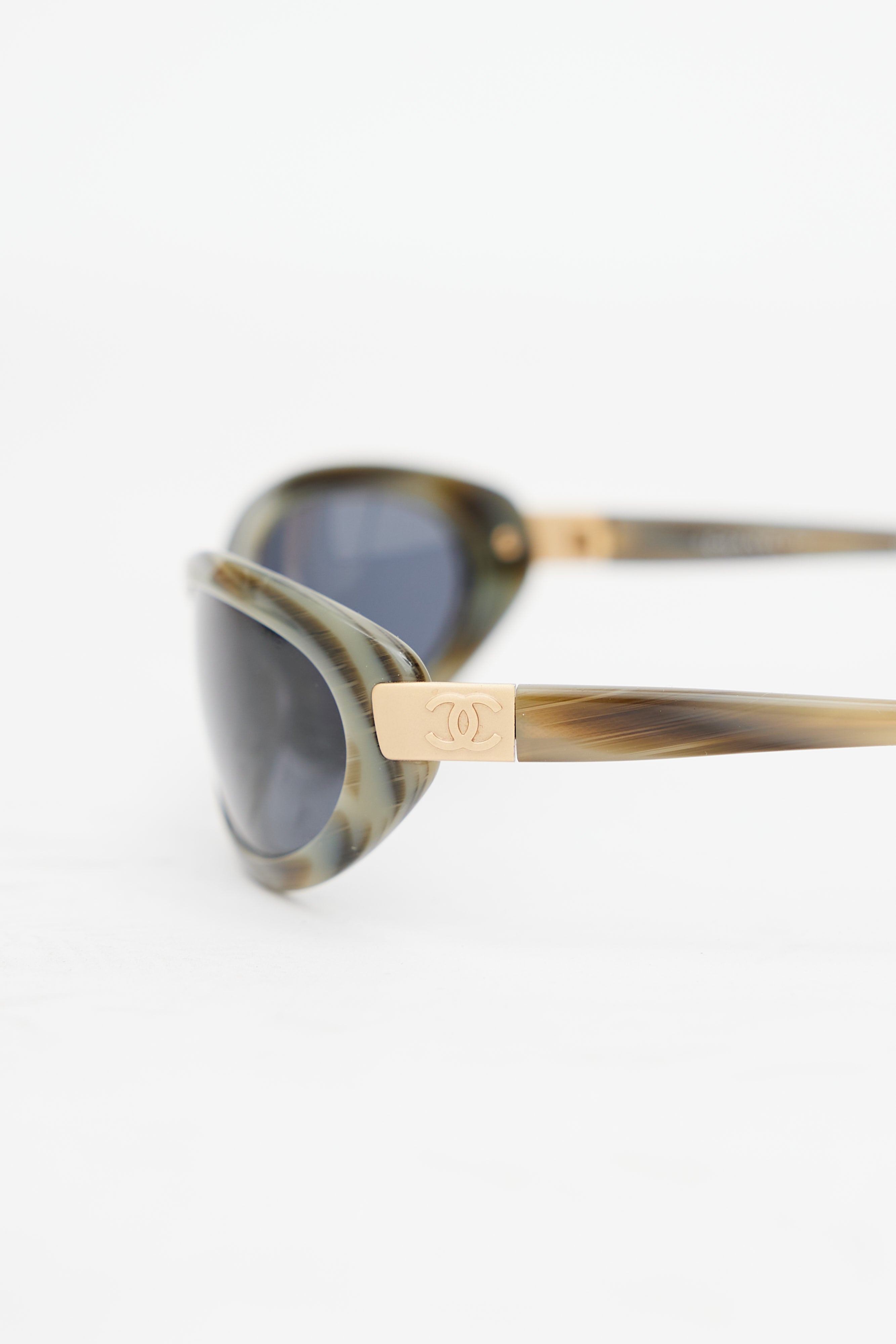 Pre-owned Chanel 5027 green oval sunglasses featuring gradient frame, black oval lens, nose saddle bridge, and gold tone CC logo at temple and tip.