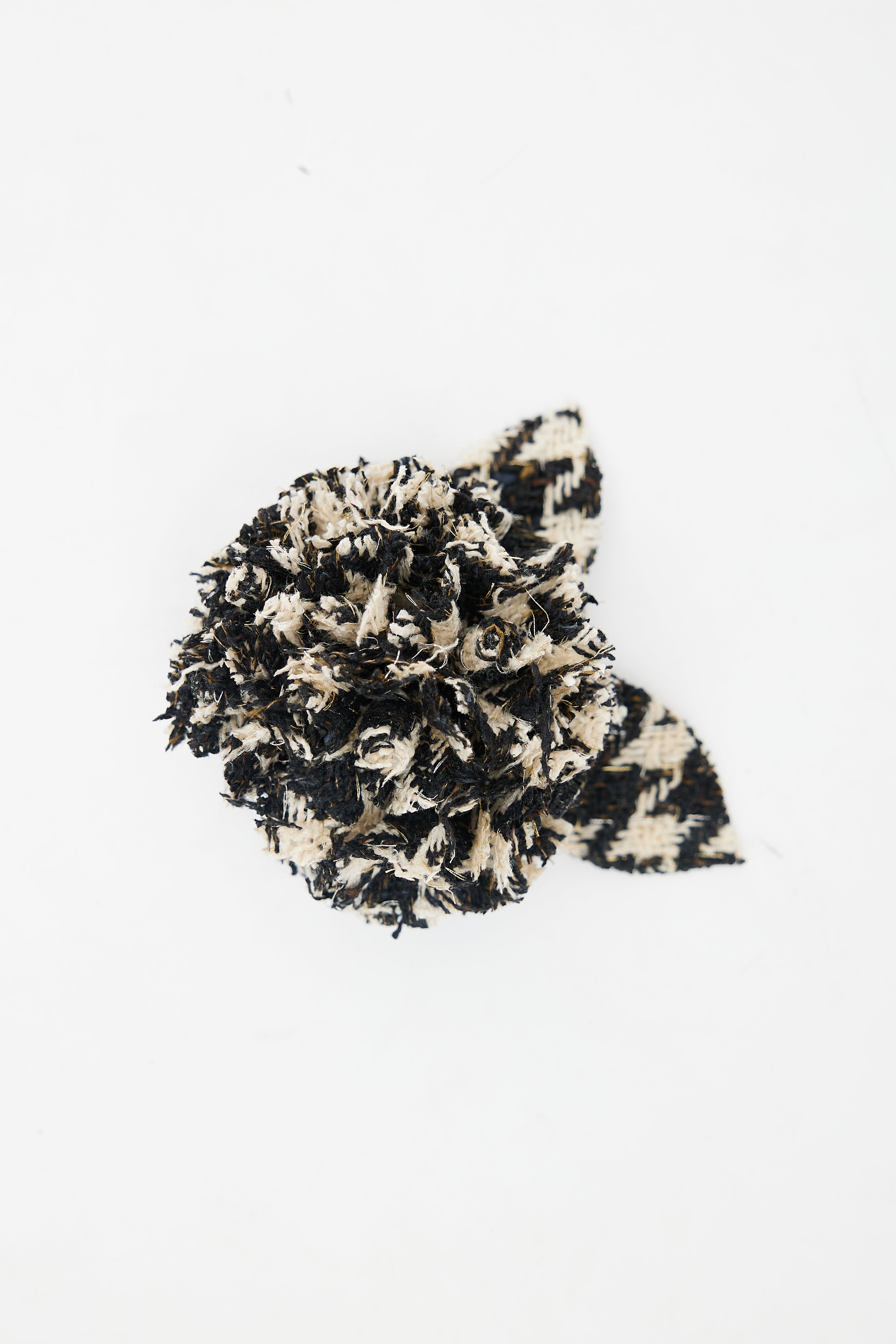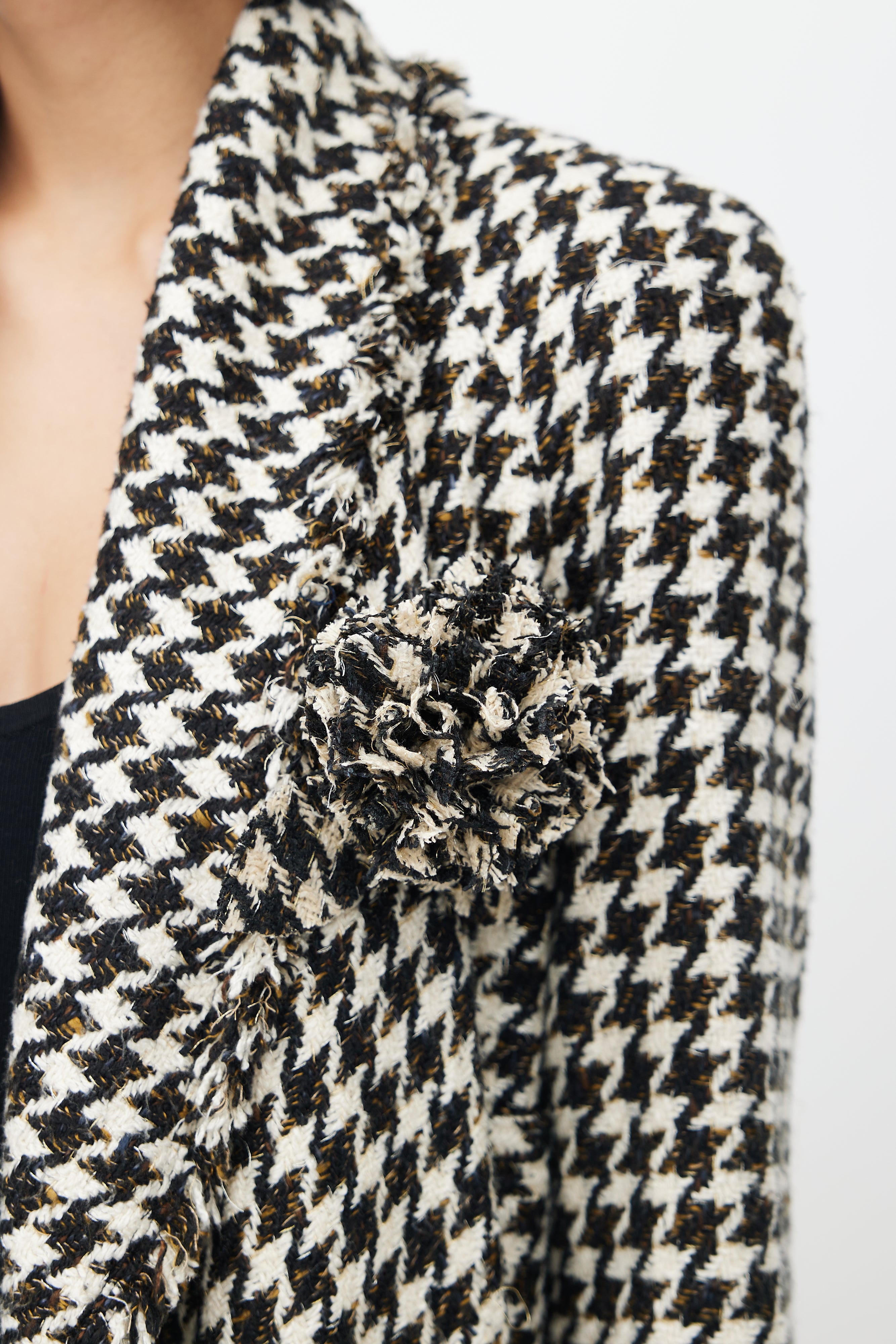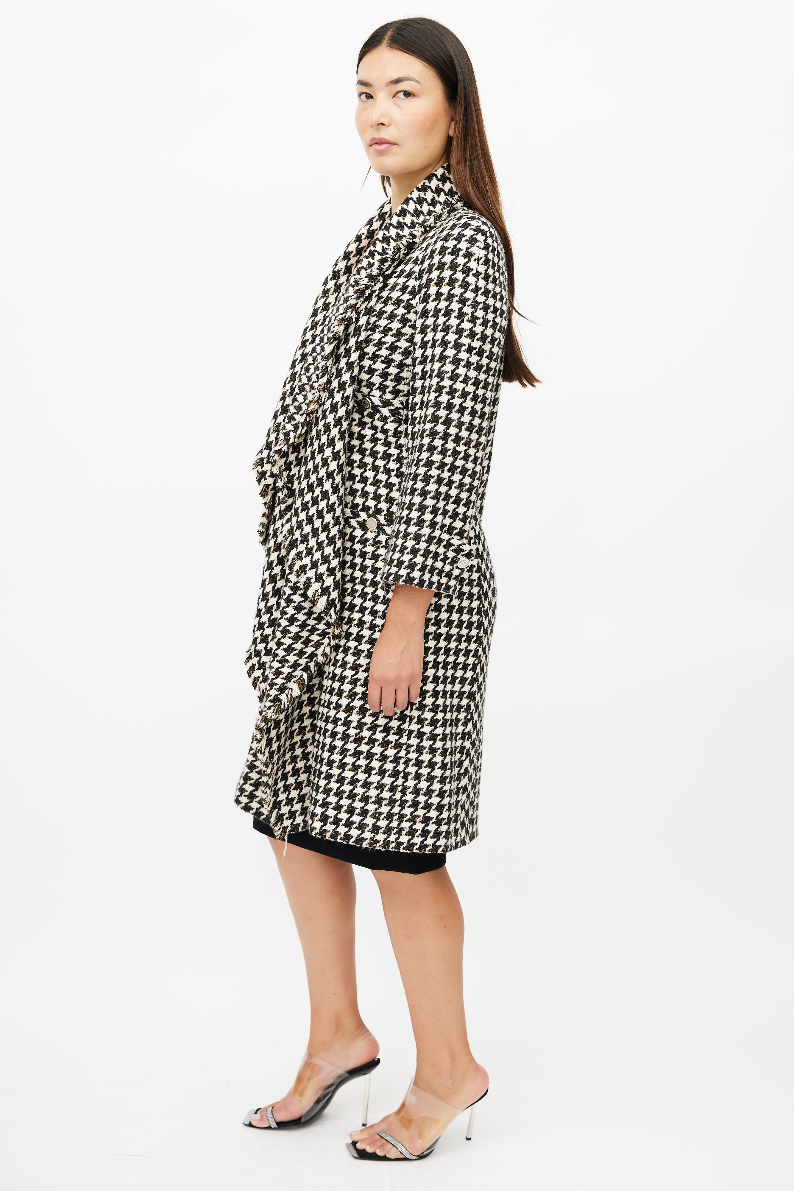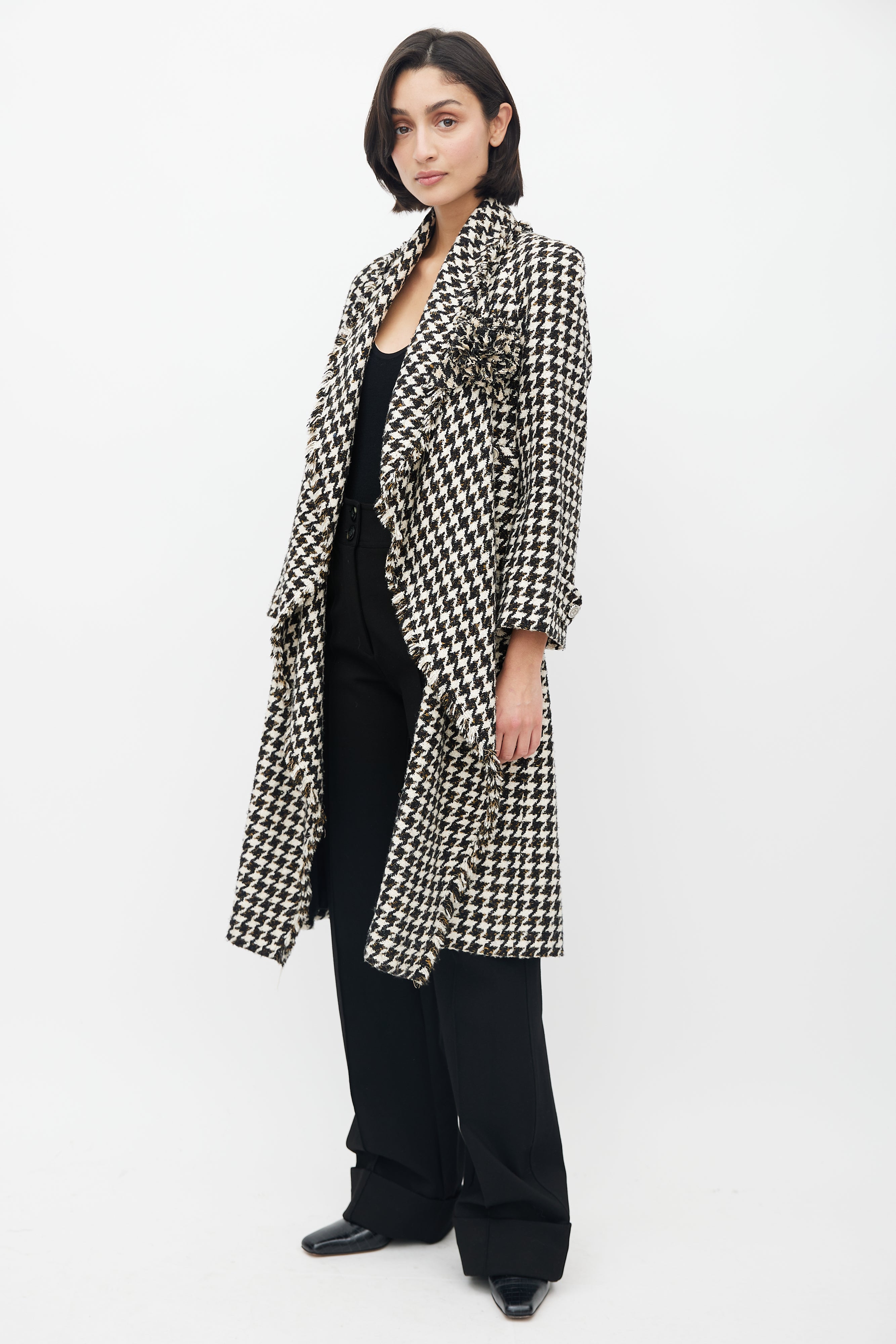 Pre-owned Spring 2006 Chanel black and white coat featuring houndstooth print throughout, open front with tie fastening, shawl lapel with raw hem, four buttoned pockets, buttoned cuffs, and silver tone medallion buttons. Includes detachable flower brooch in matching fabric.