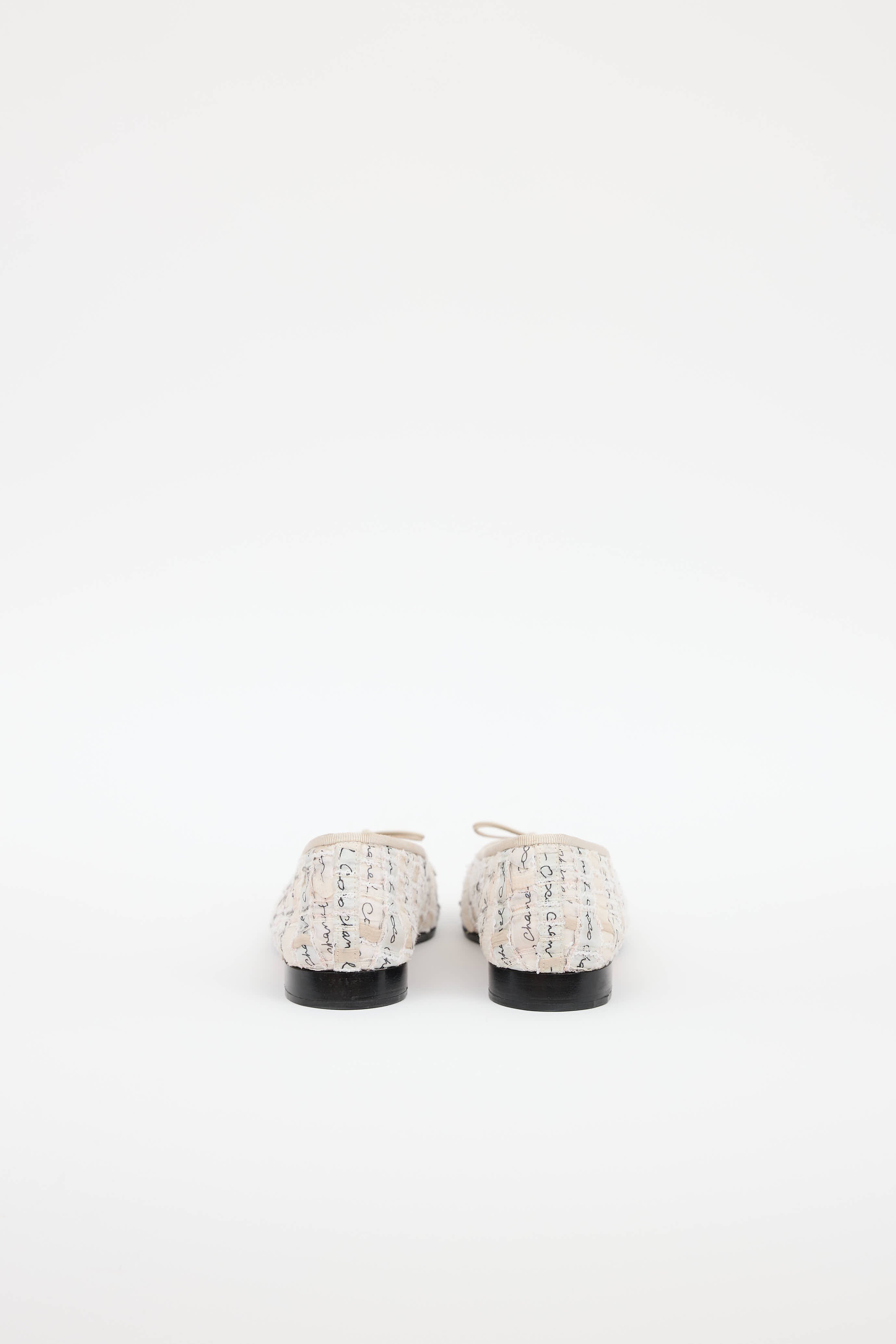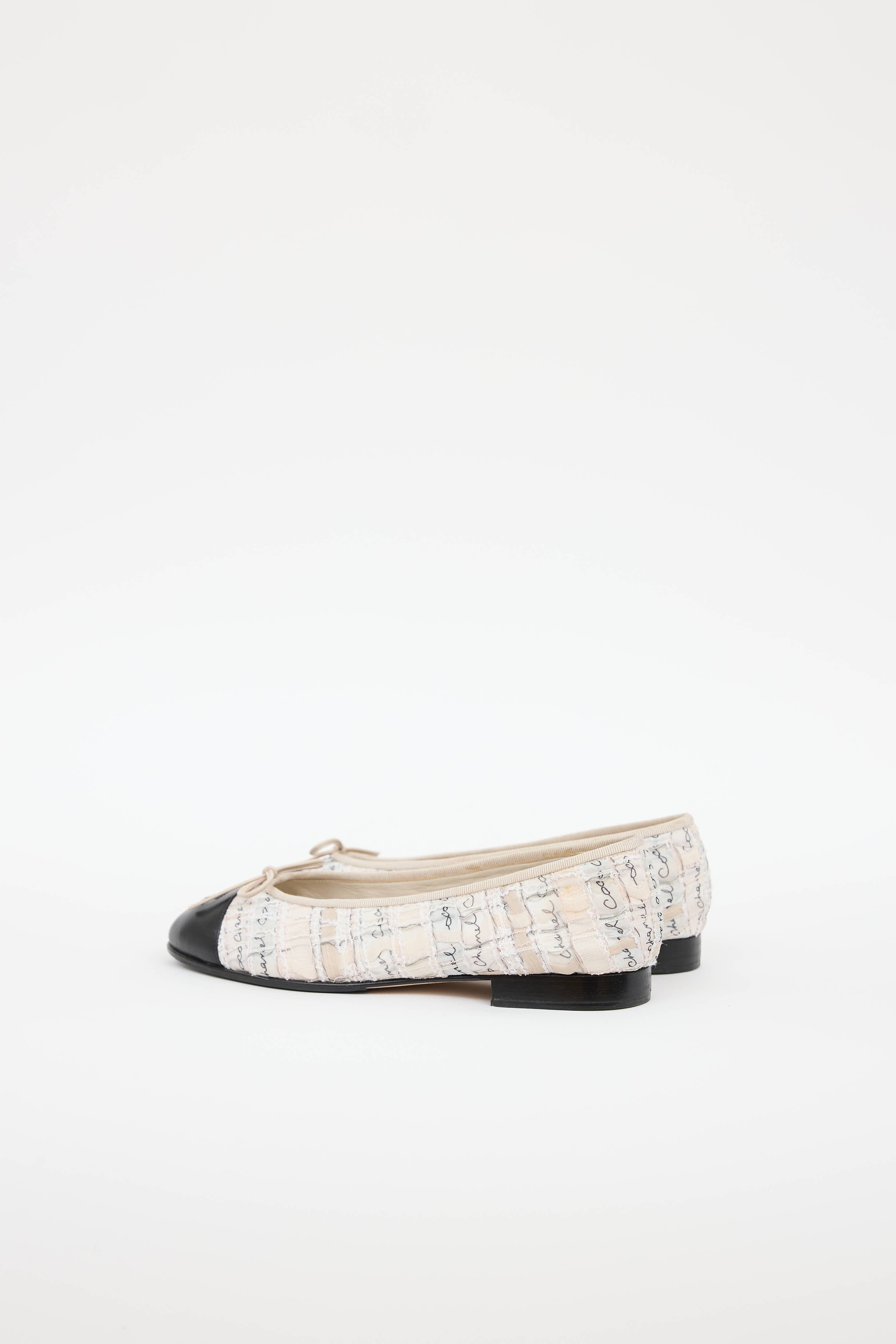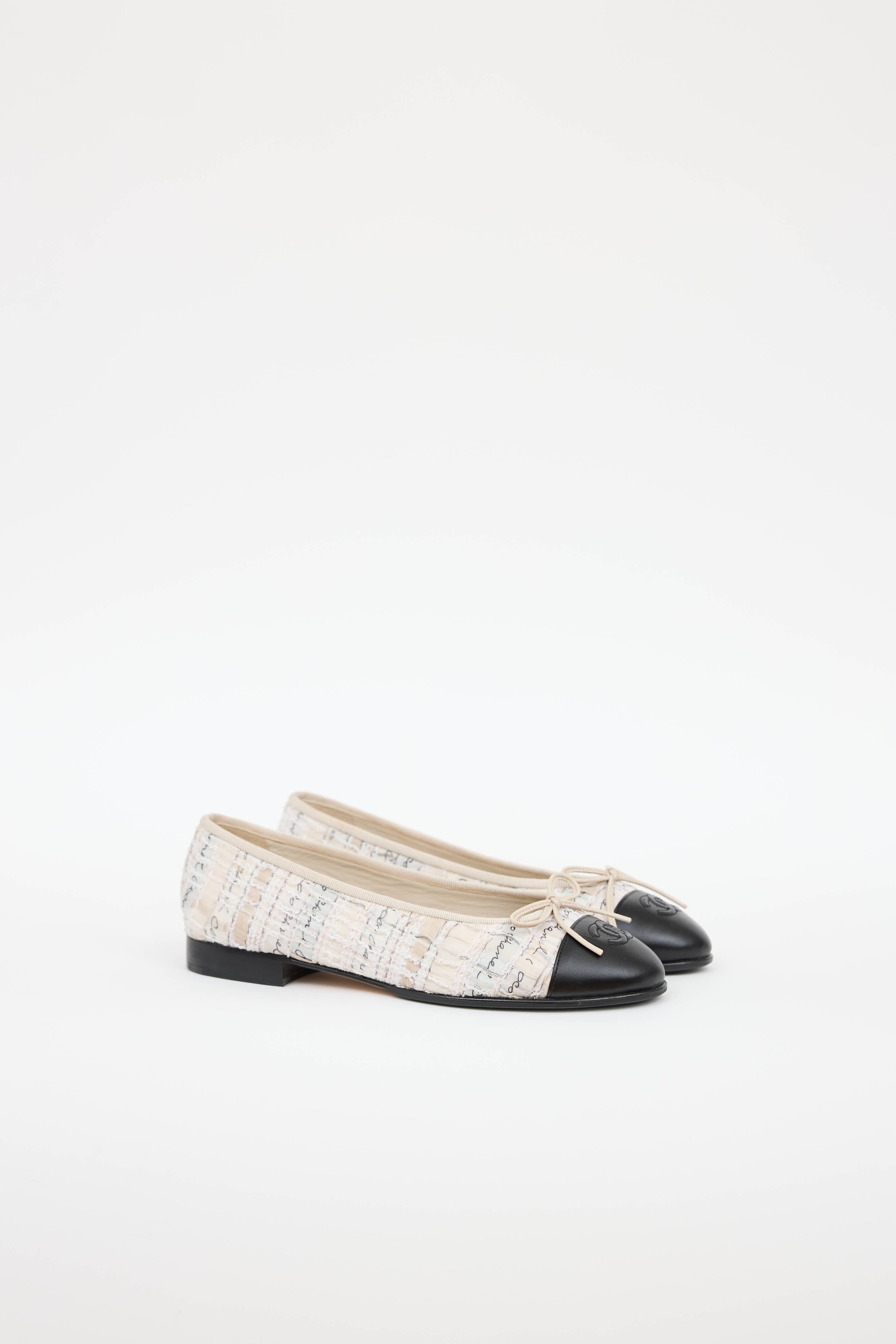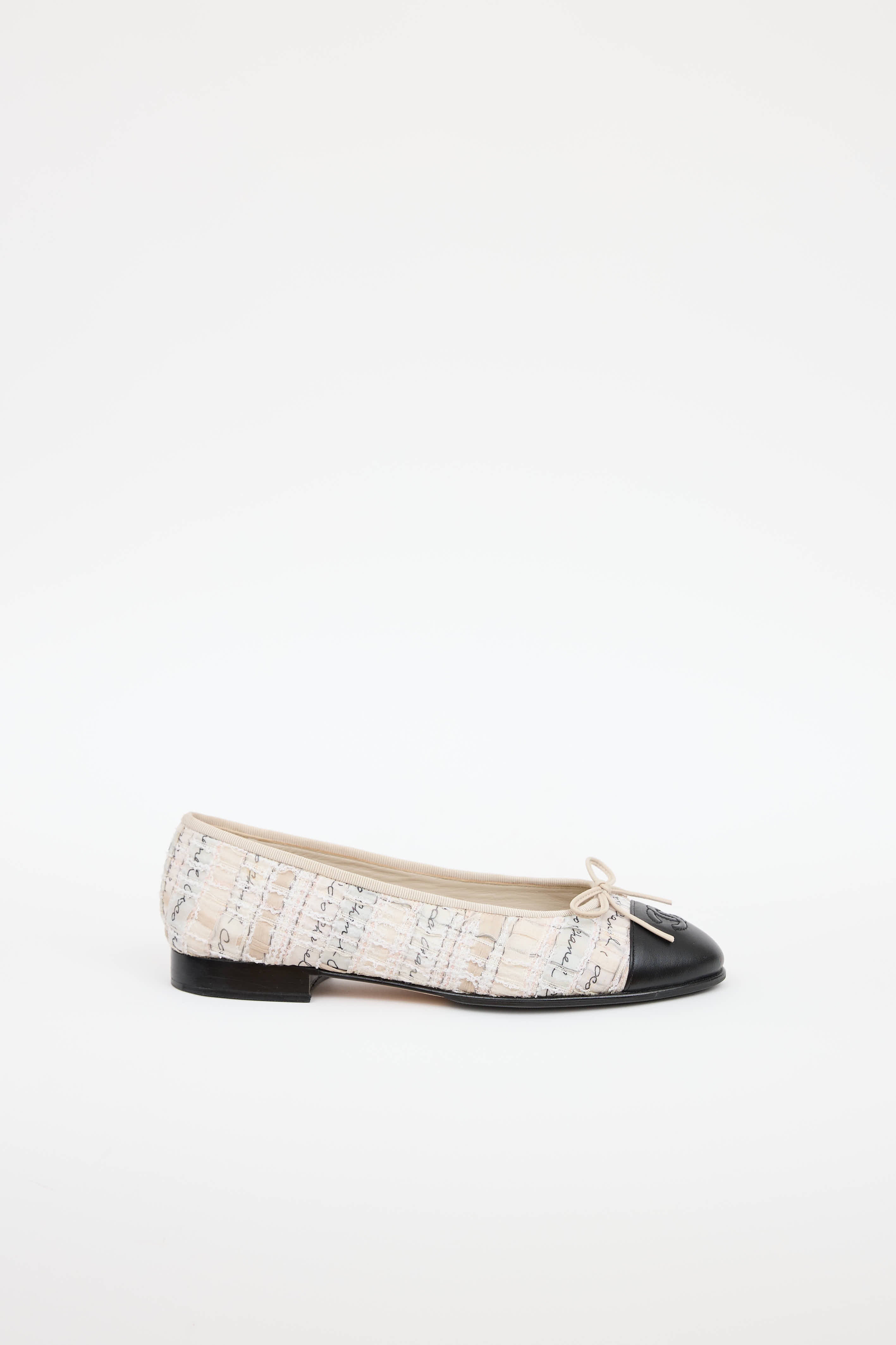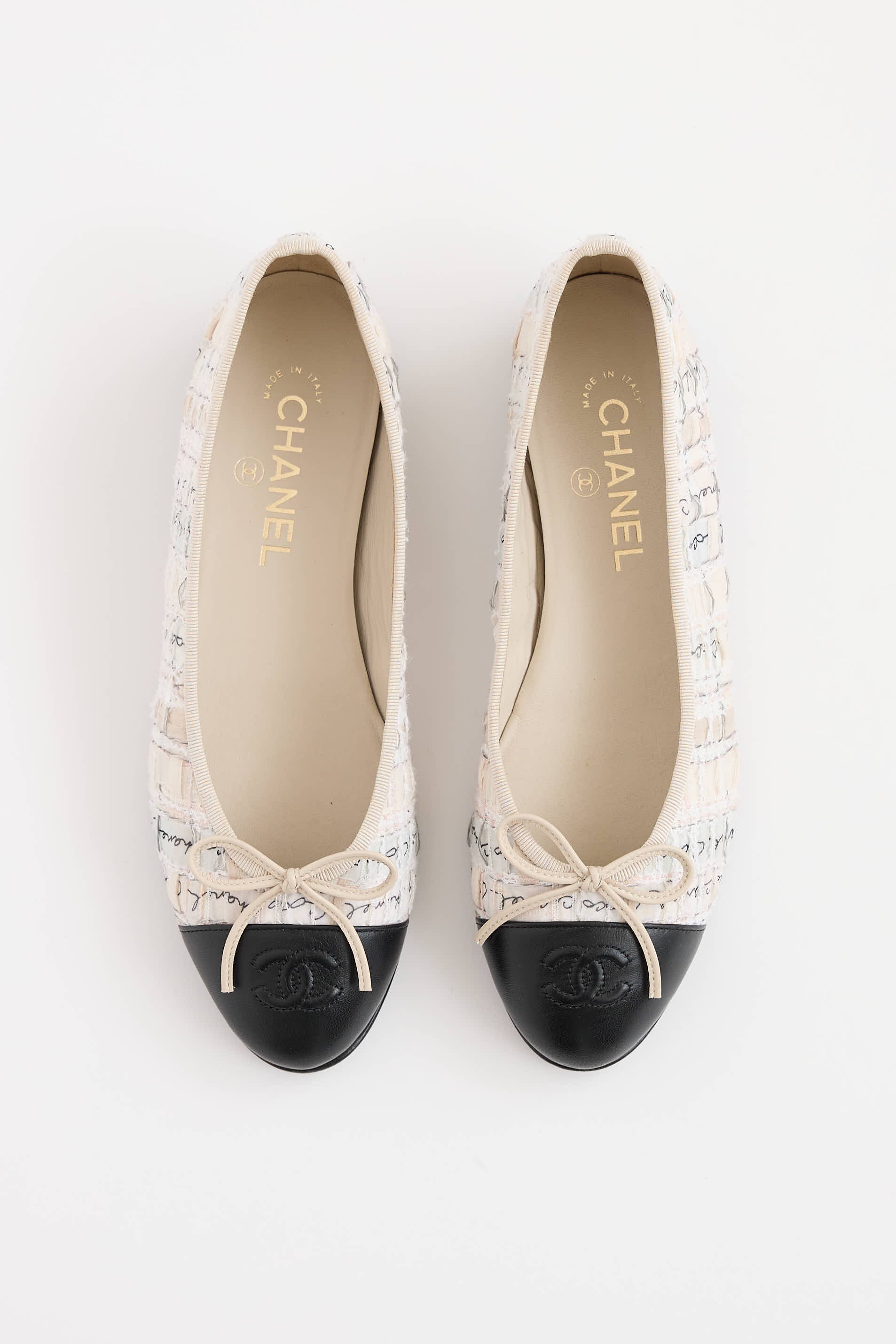 Pre-owned Chanel white and beige ballet flats featuring round toe, tweed upper, lettering print, black leather toe cap with embroidered CC interlocking logo. From the 2022 Collection by Virginie Viard.