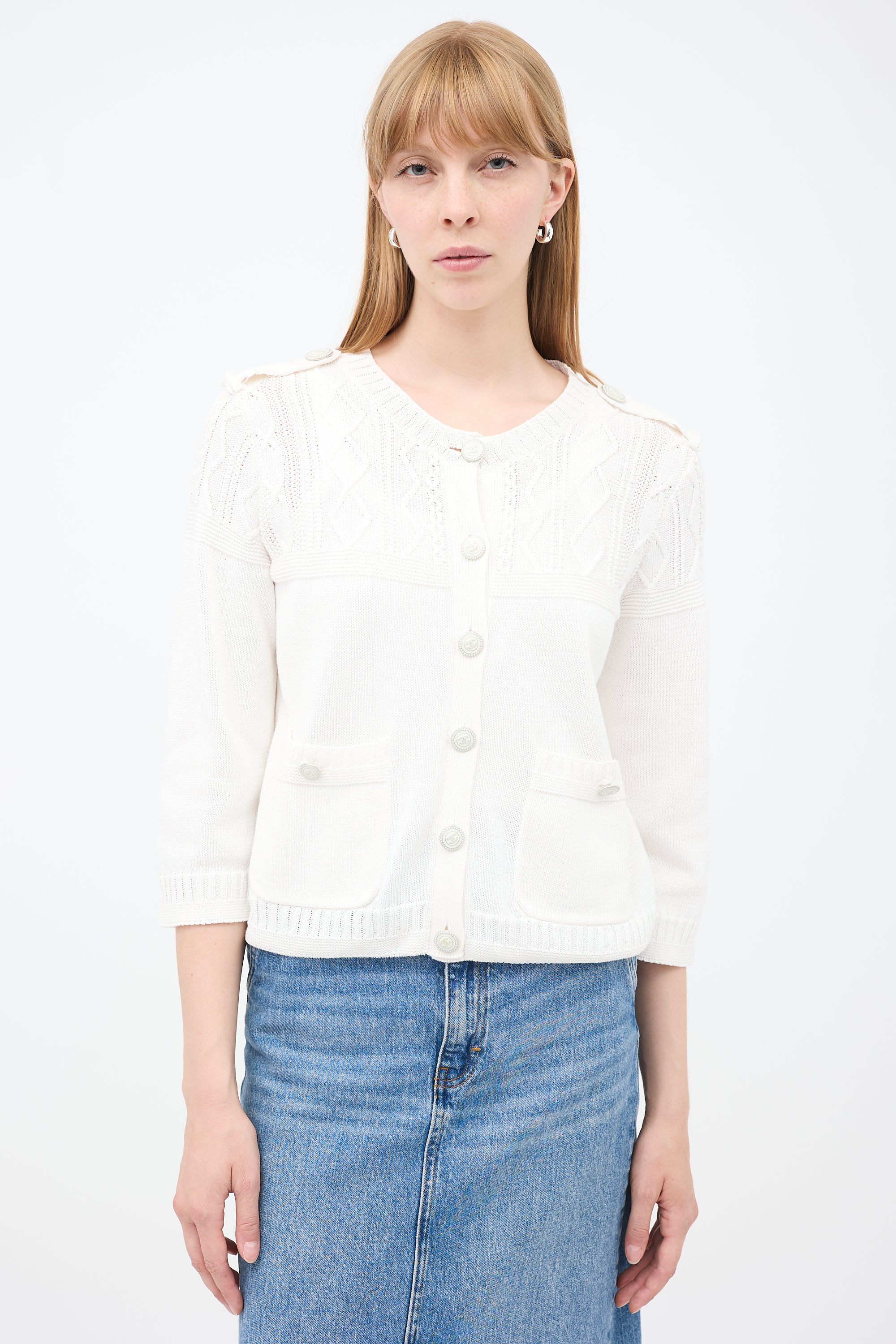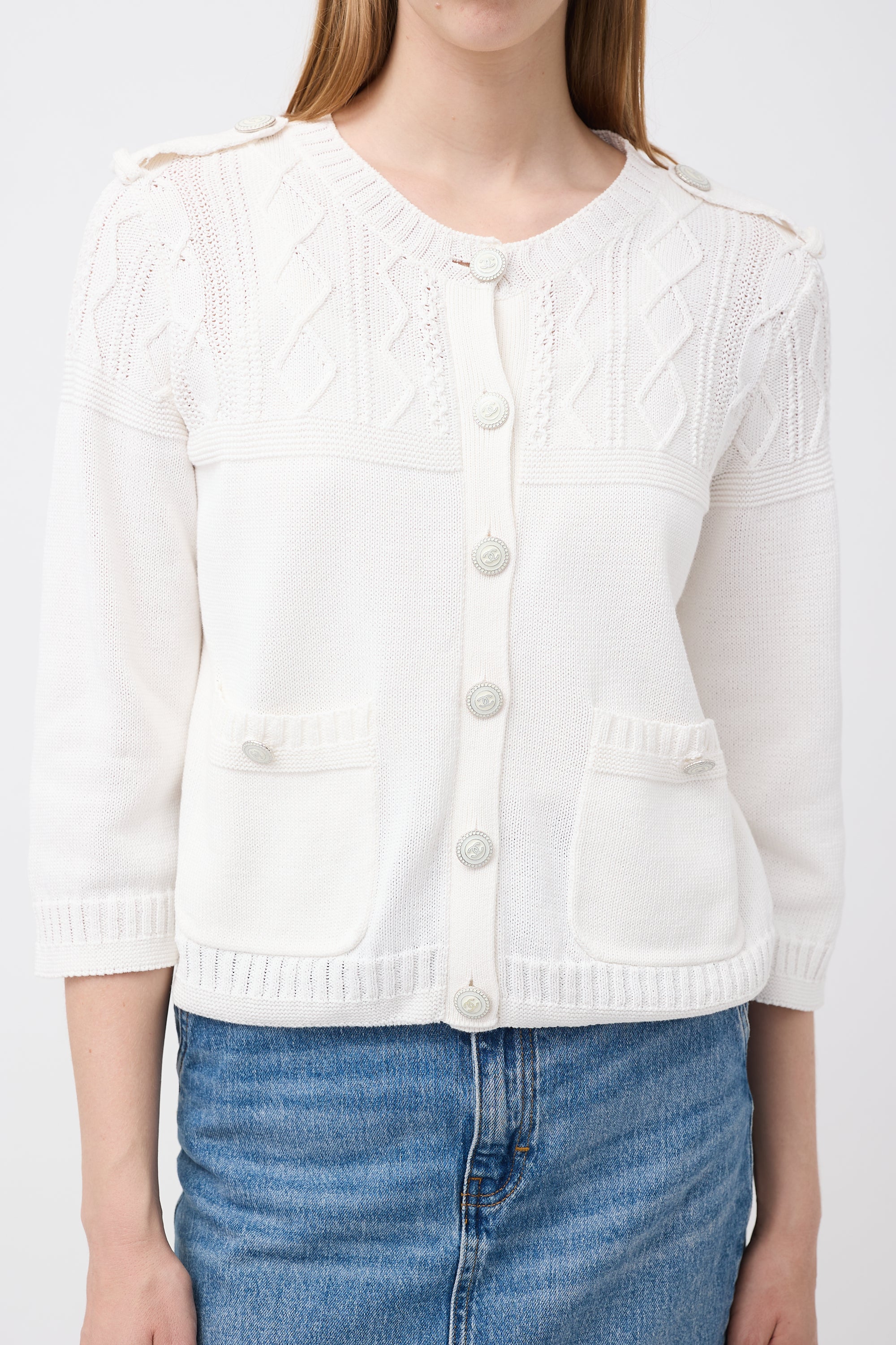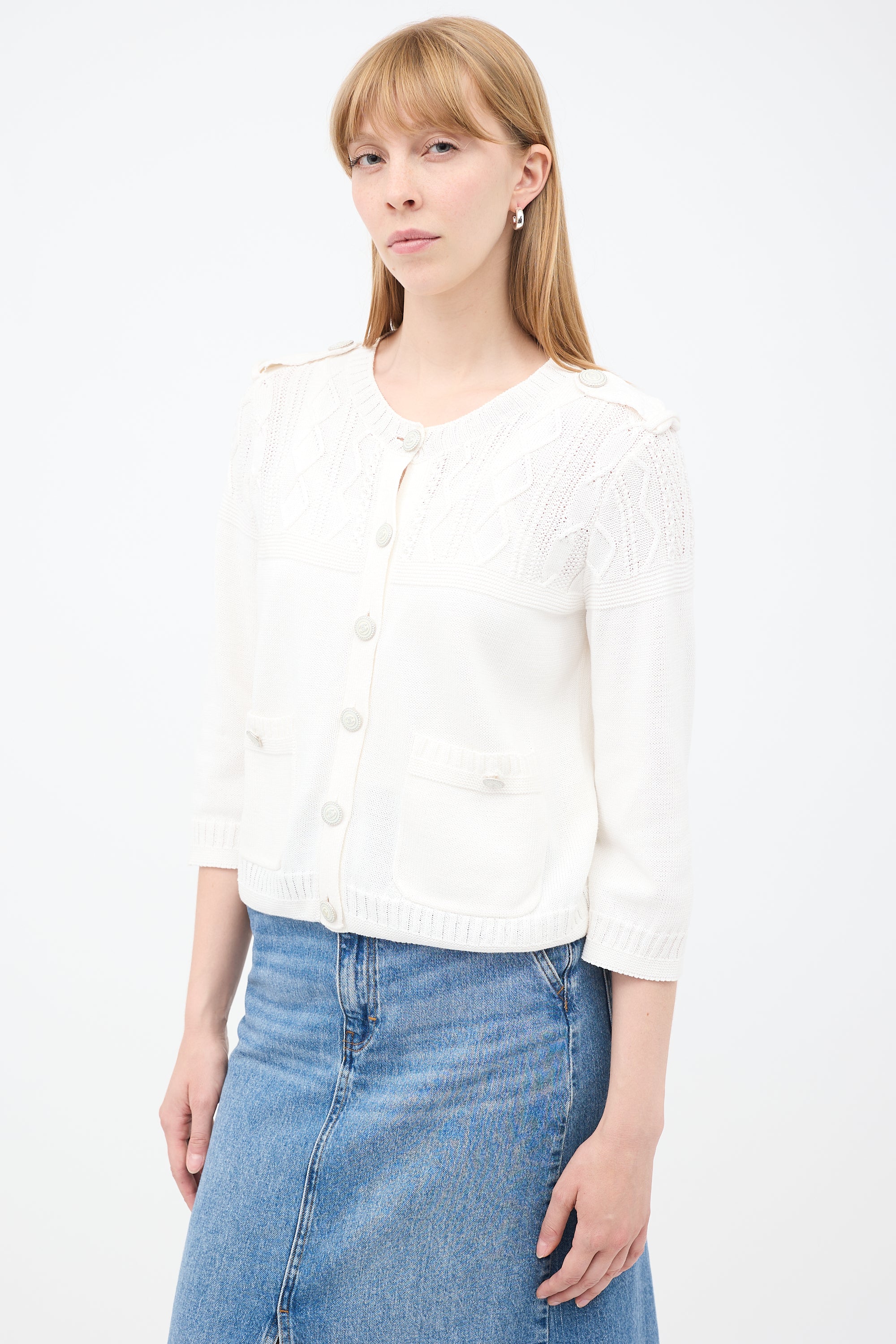 Pre-owned Chanel white cotton cardigan featuring a round neckline, chain and CC motif buttons, zigzag pattern knit top, two patch pockets at front hip, epaulettes at shoulders, three quarter length sleeves, and ribbing at neck, hem, and cuffs.