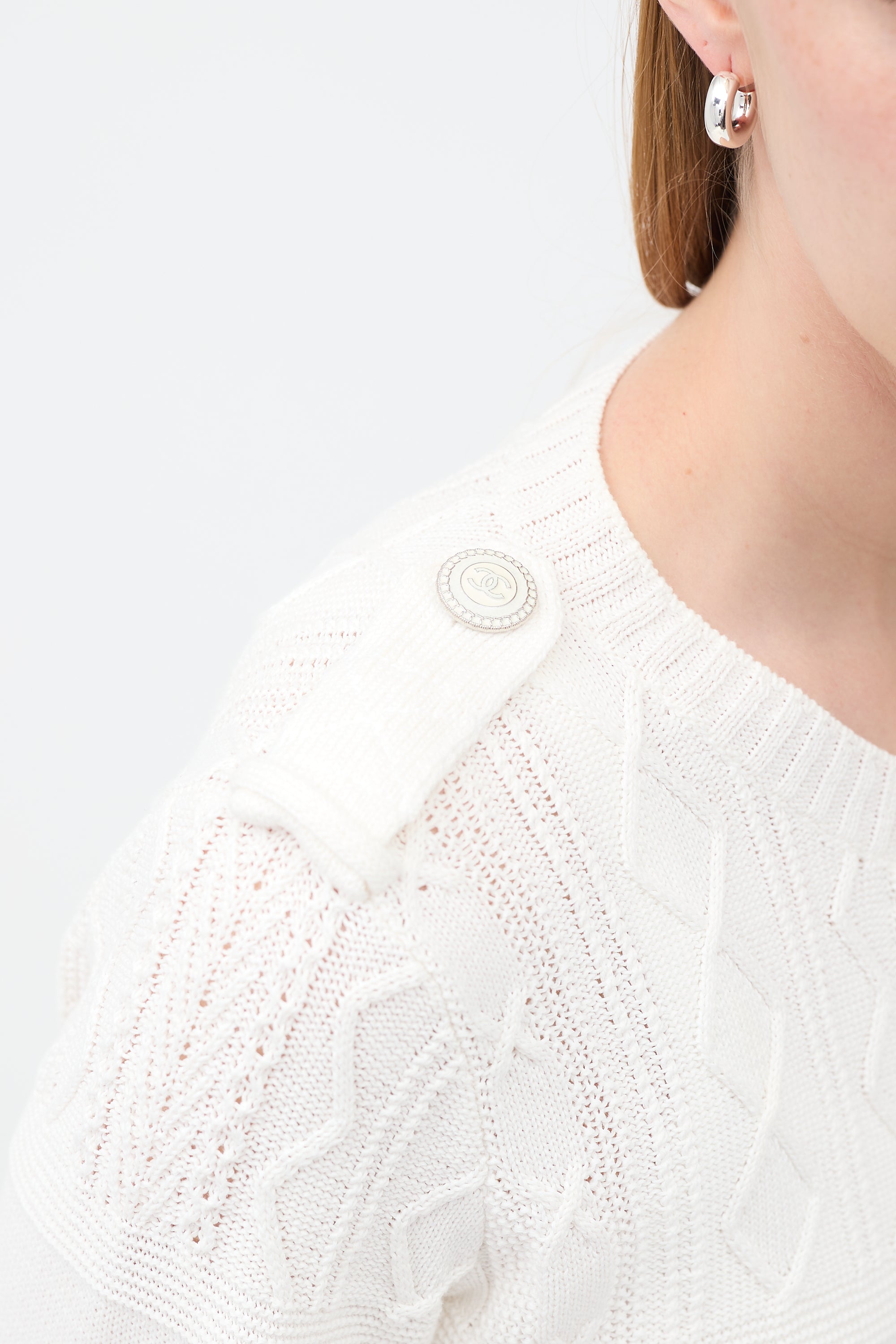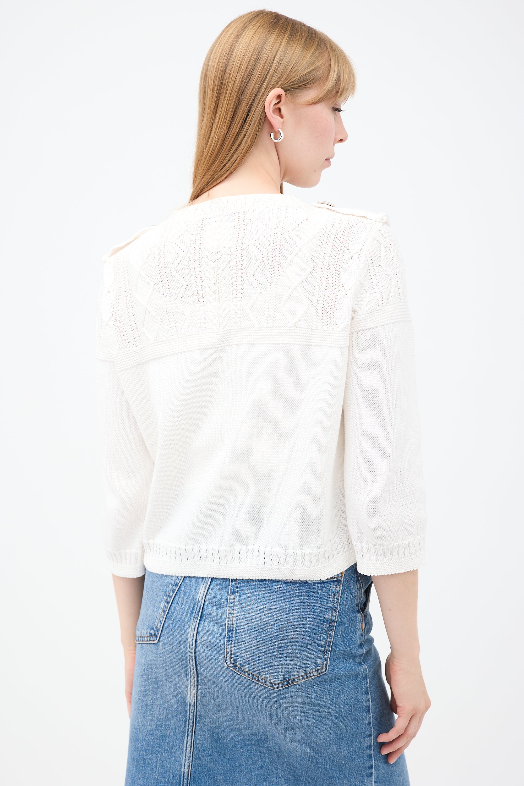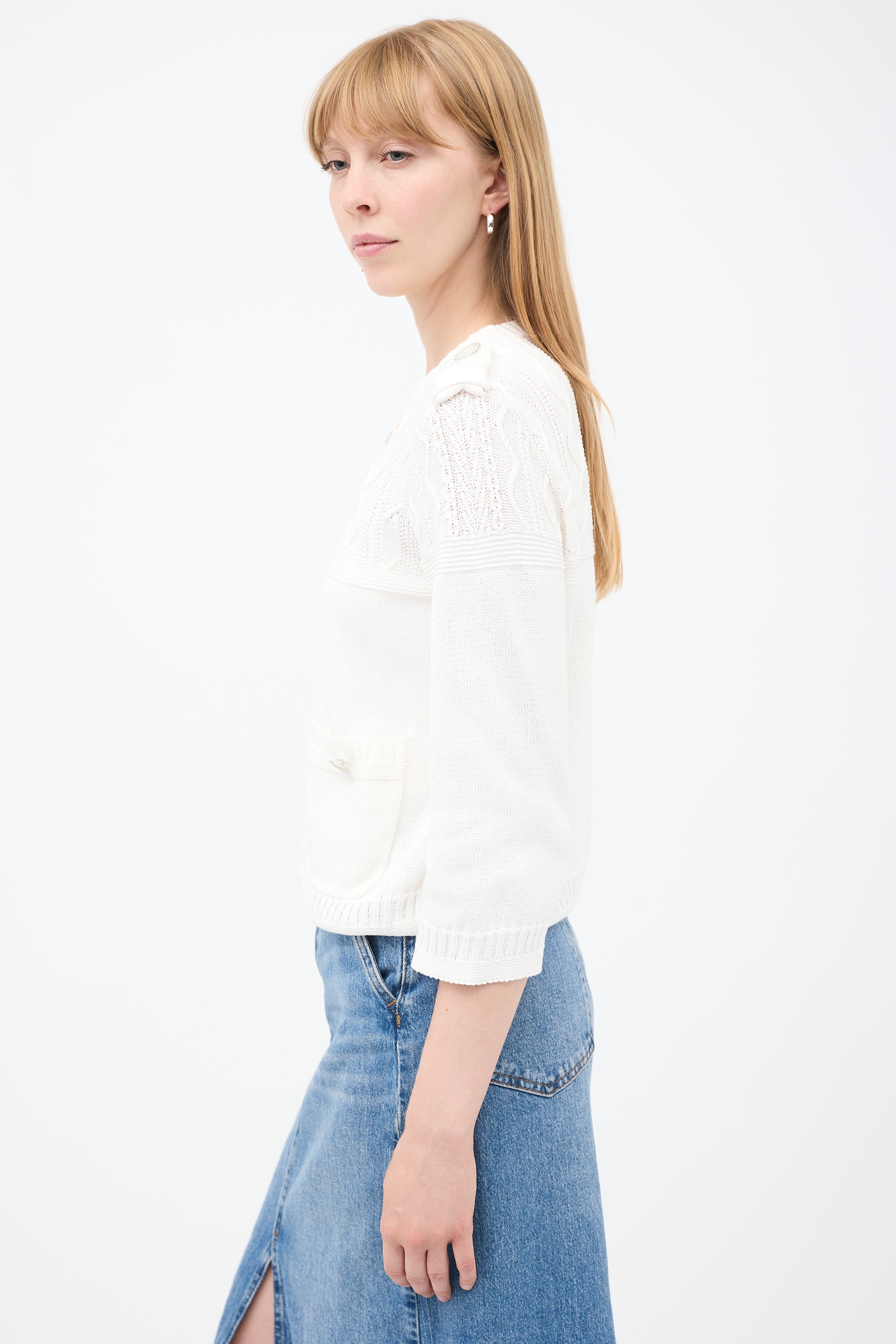 Pre-owned Chanel white cotton cardigan featuring a round neckline, chain and CC motif buttons, zigzag pattern knit top, two patch pockets at front hip, epaulettes at shoulders, three quarter length sleeves, and ribbing at neck, hem, and cuffs.