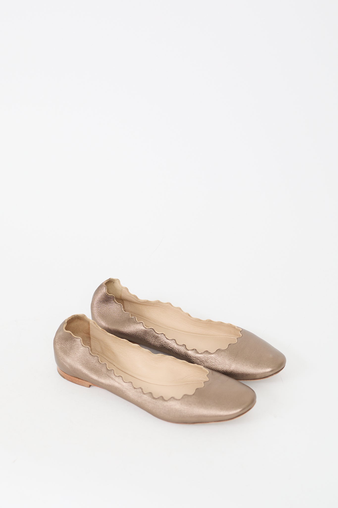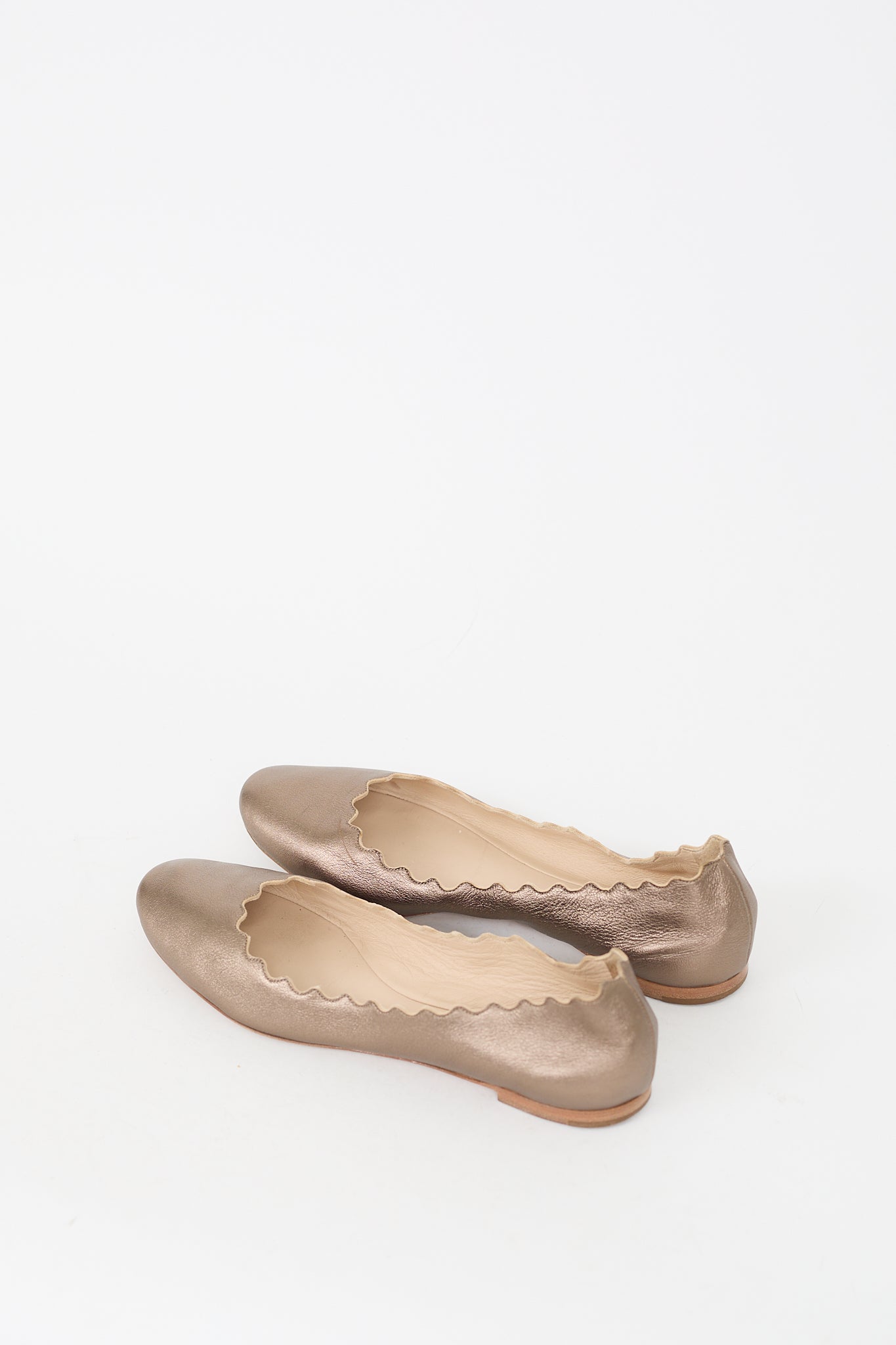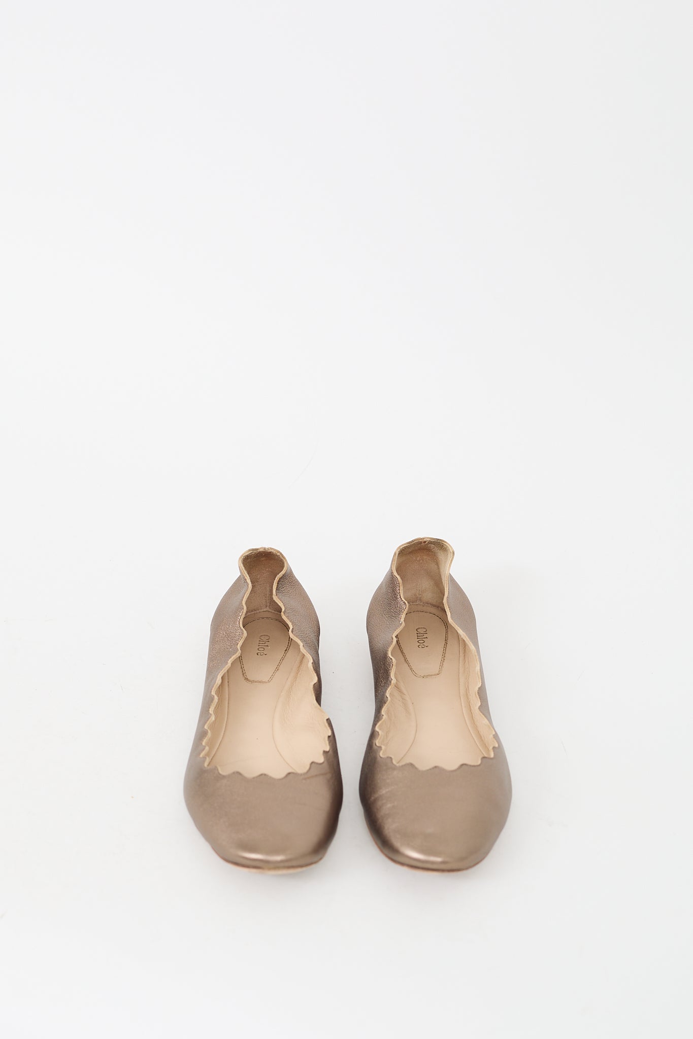 Pre-owned Chloé gold leather flats featuring a rounded toe, stacked heel, and scalloped collar. Comes with original dust bag.