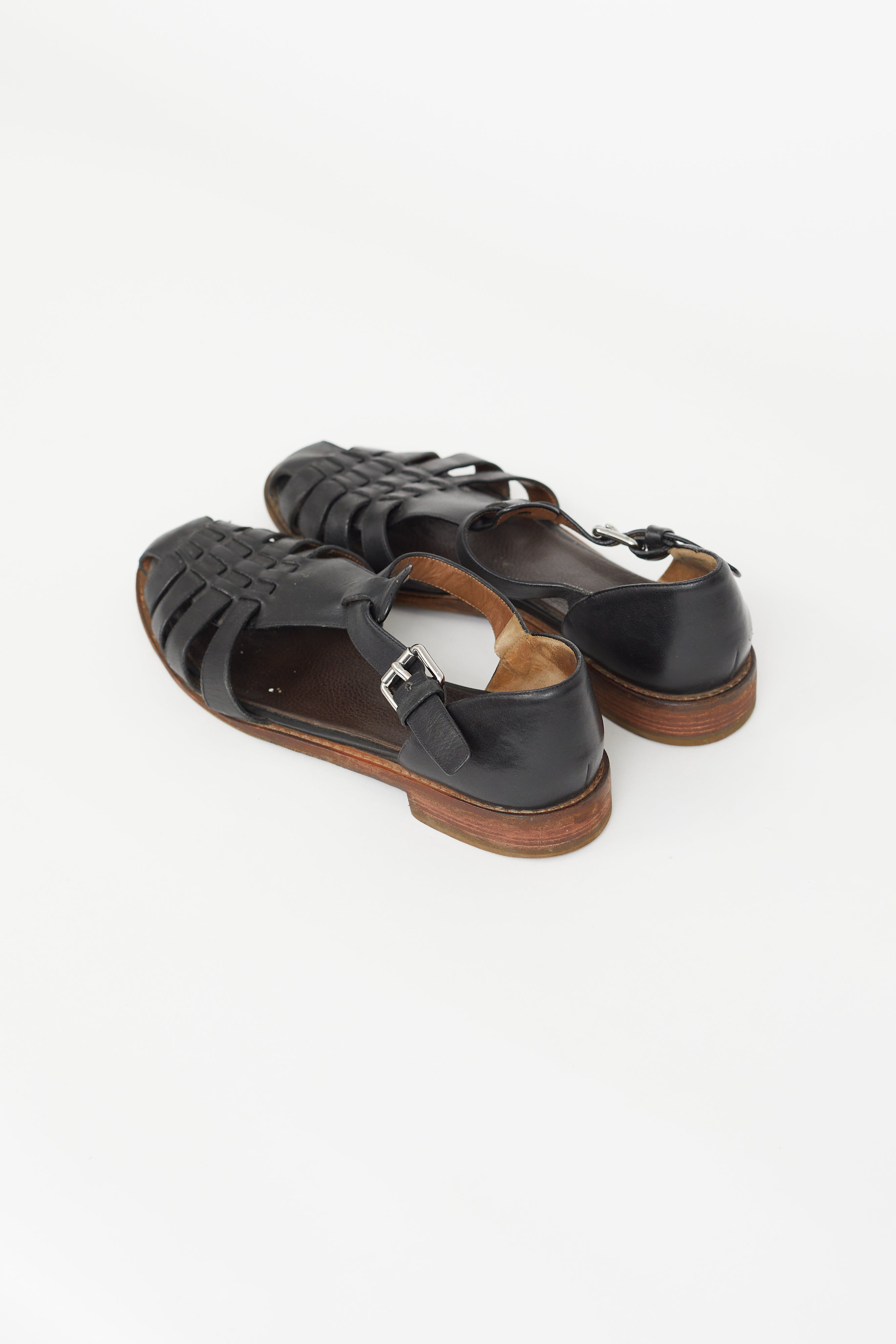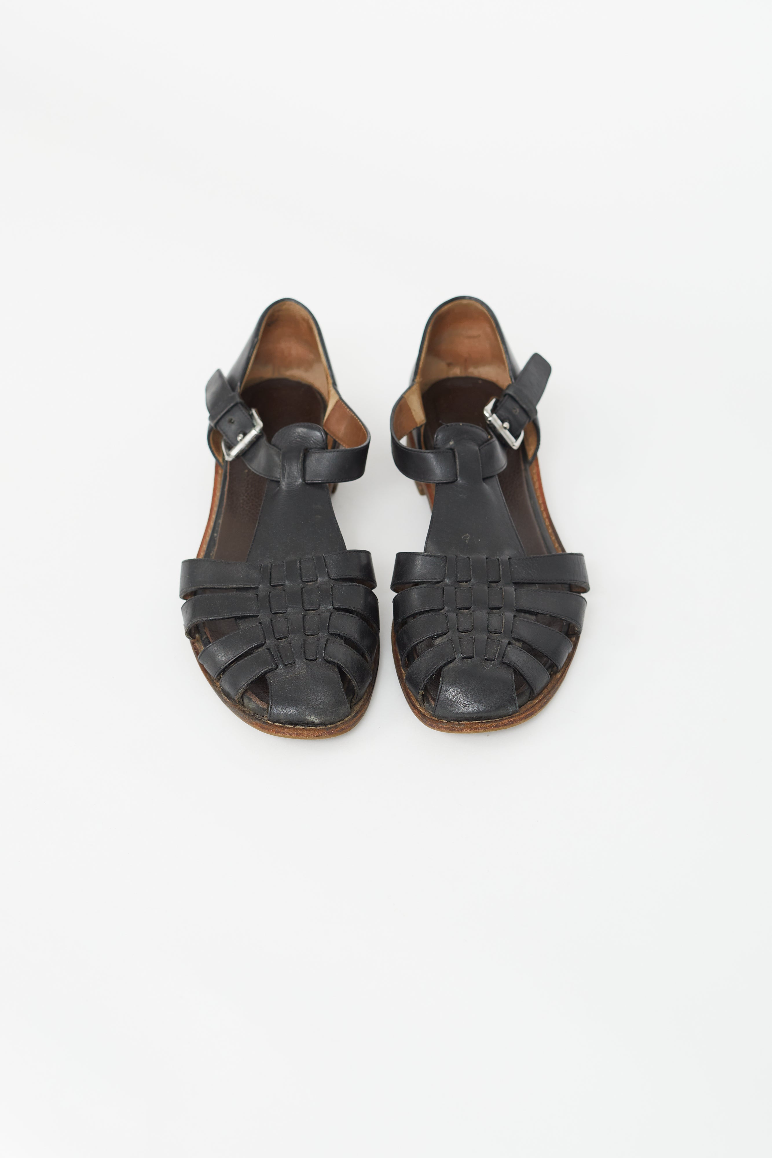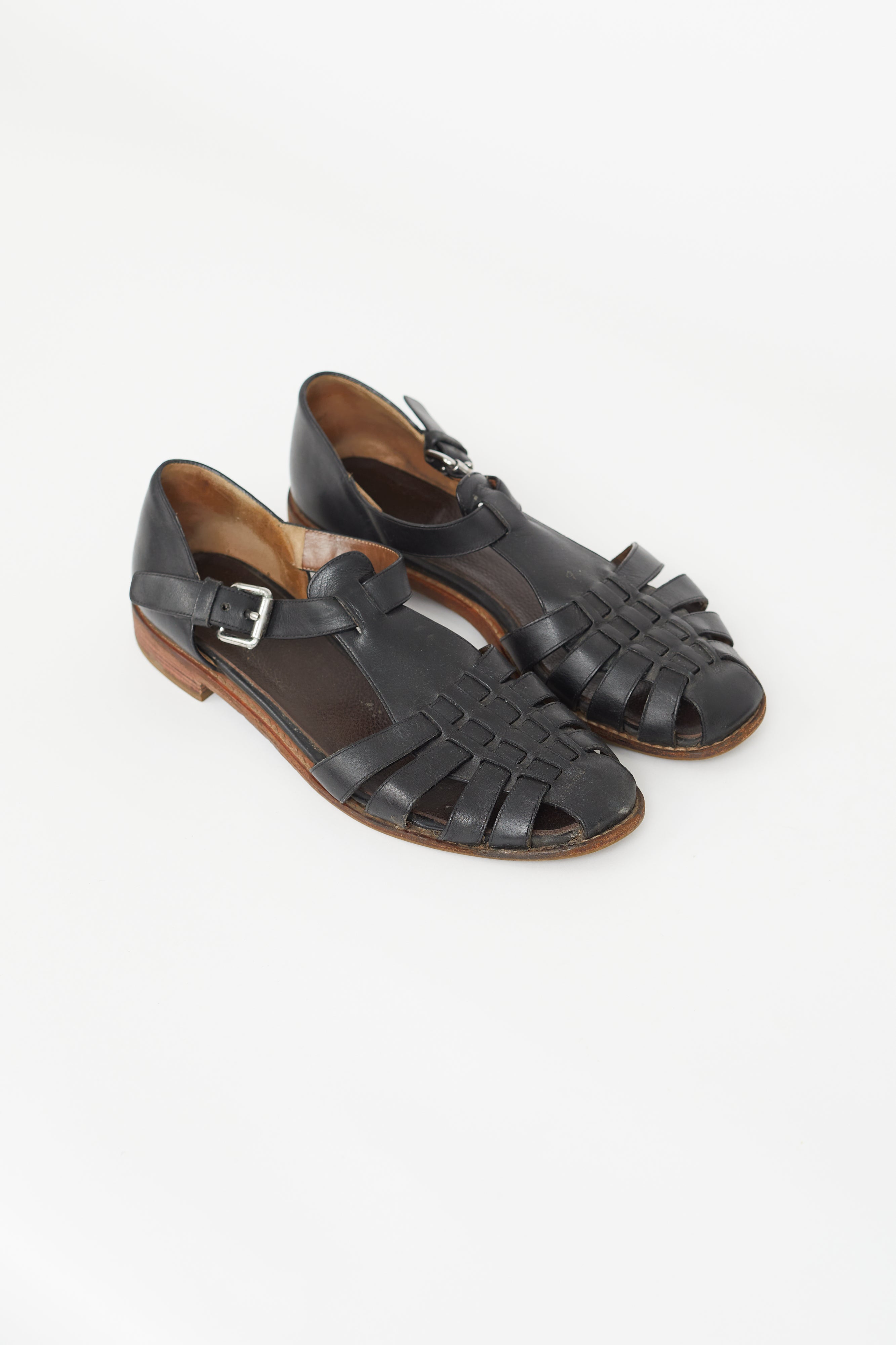 Pre-owned Church's black Kelsey leather sandals featuring a round toe, woven upper, stacked heel, and adjustable strap at heel.
