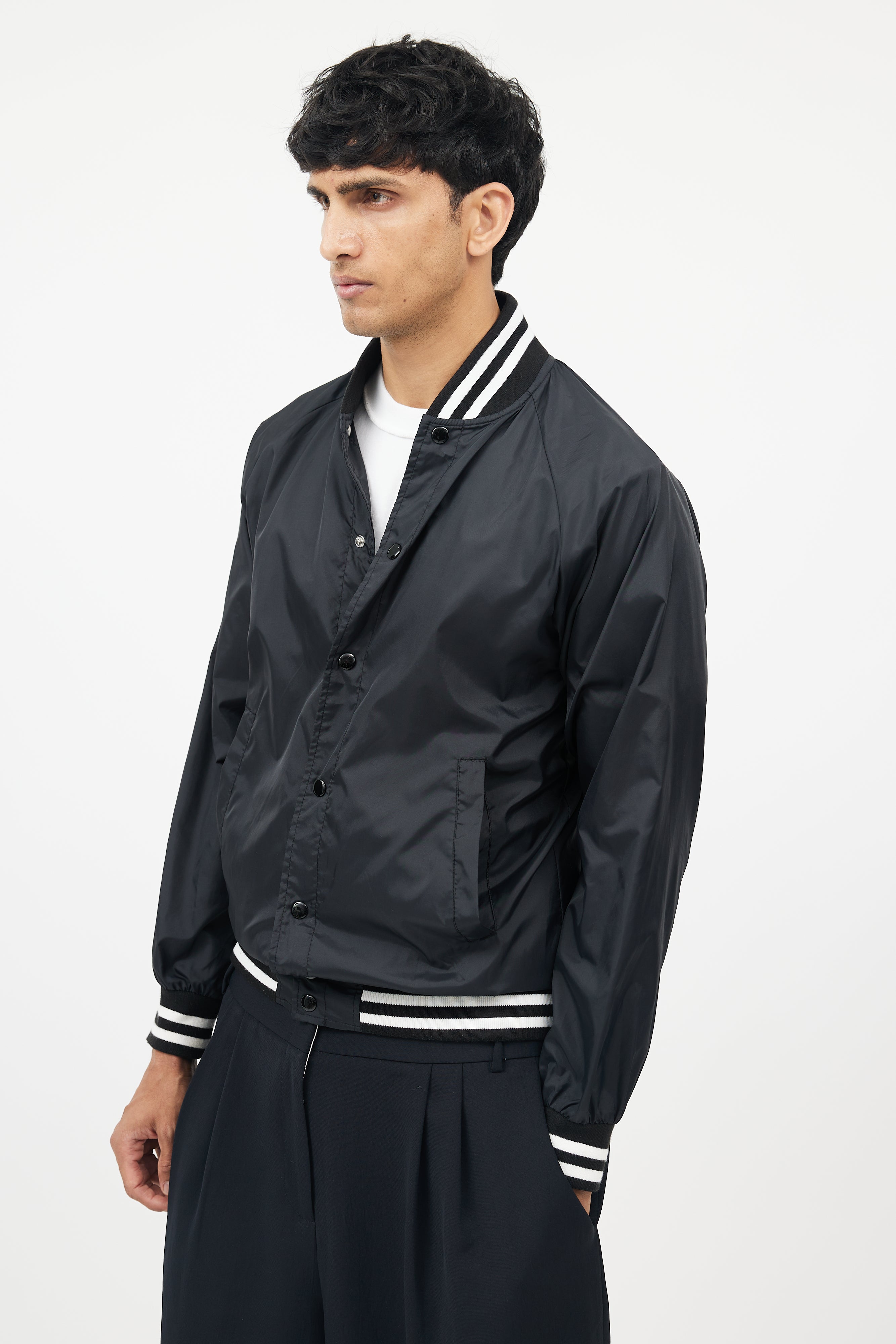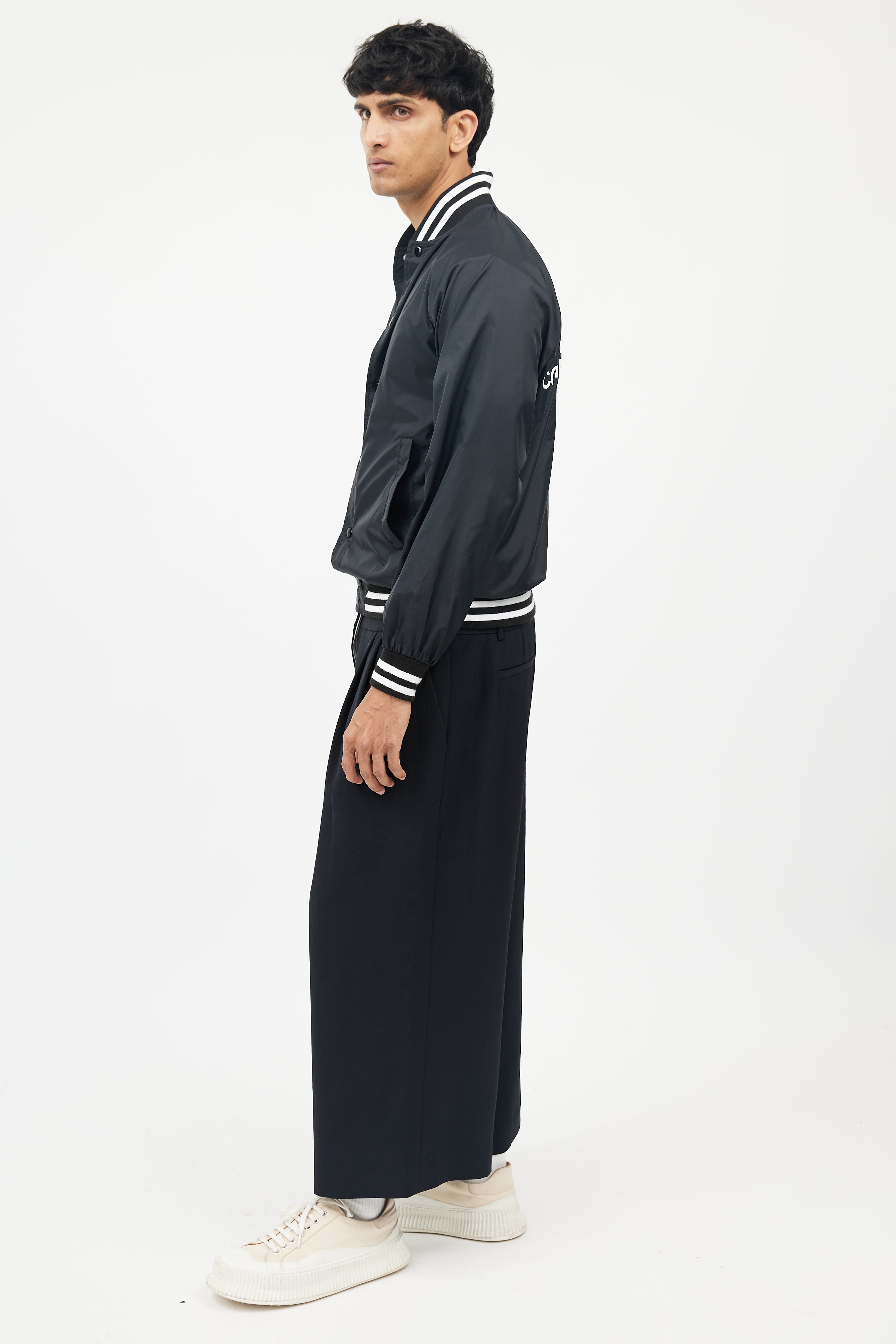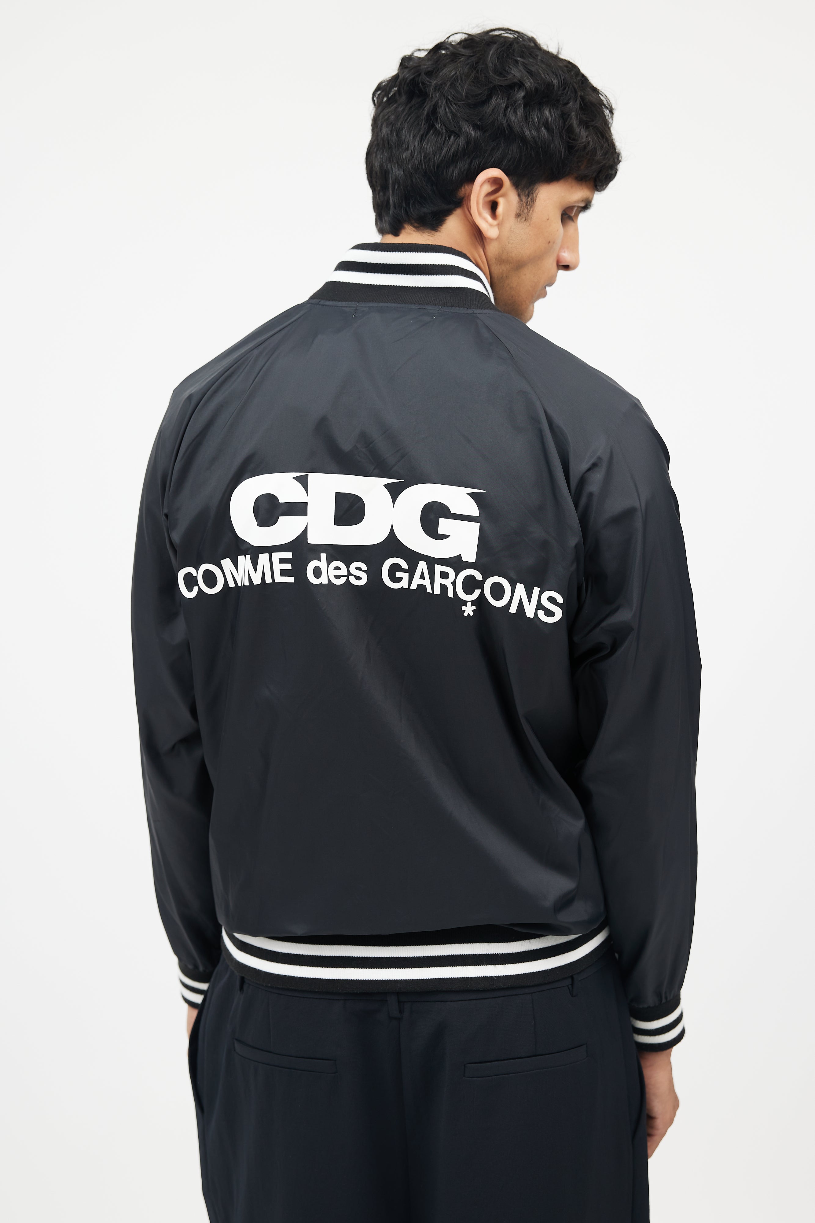 Pre-owned Comme des Garçons black and white jacket featuring snap buttons at front, CDG logo at upper back, slip pockets at side front and striped ribbed bottom band, wrist cuffs and collar. Unlined.