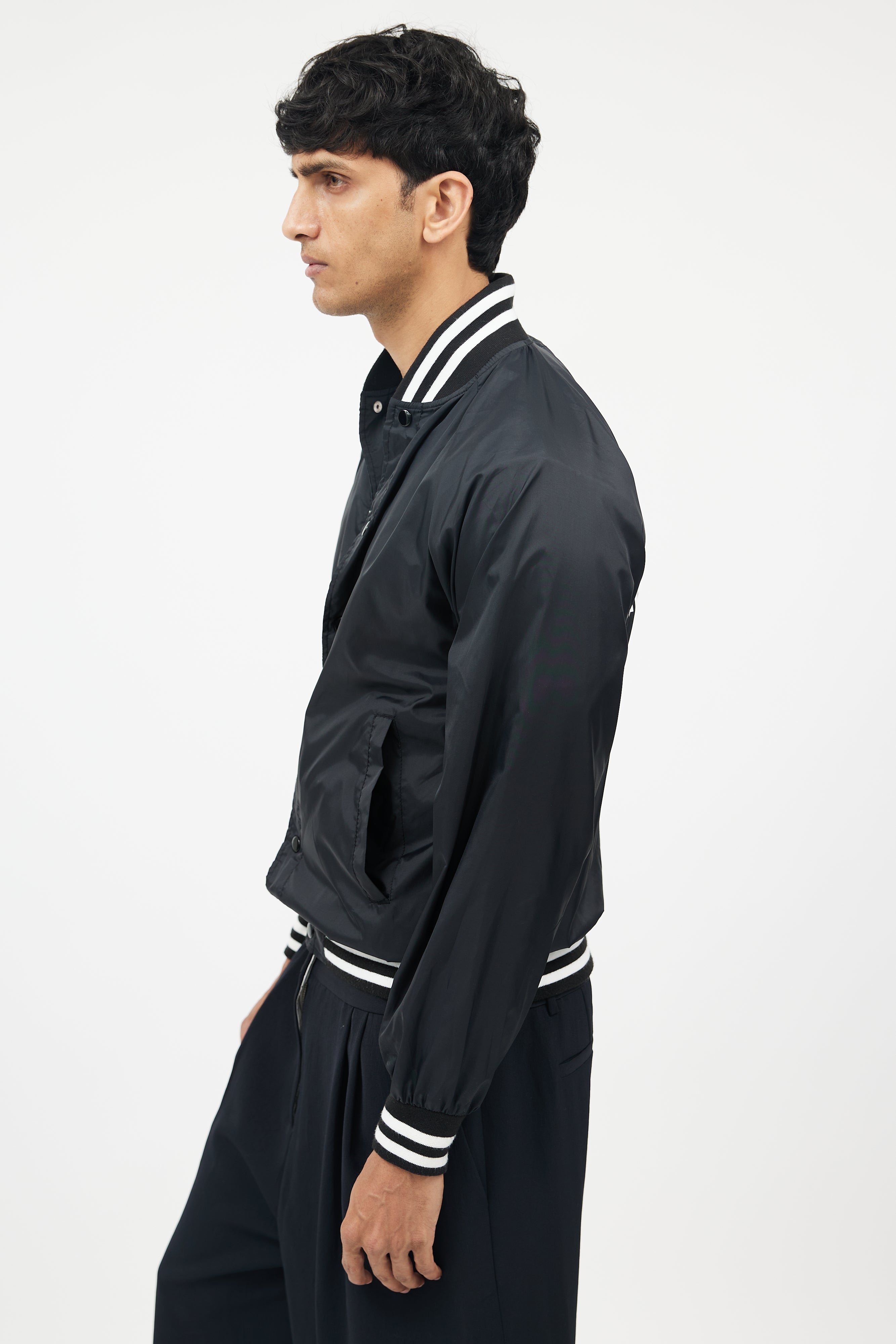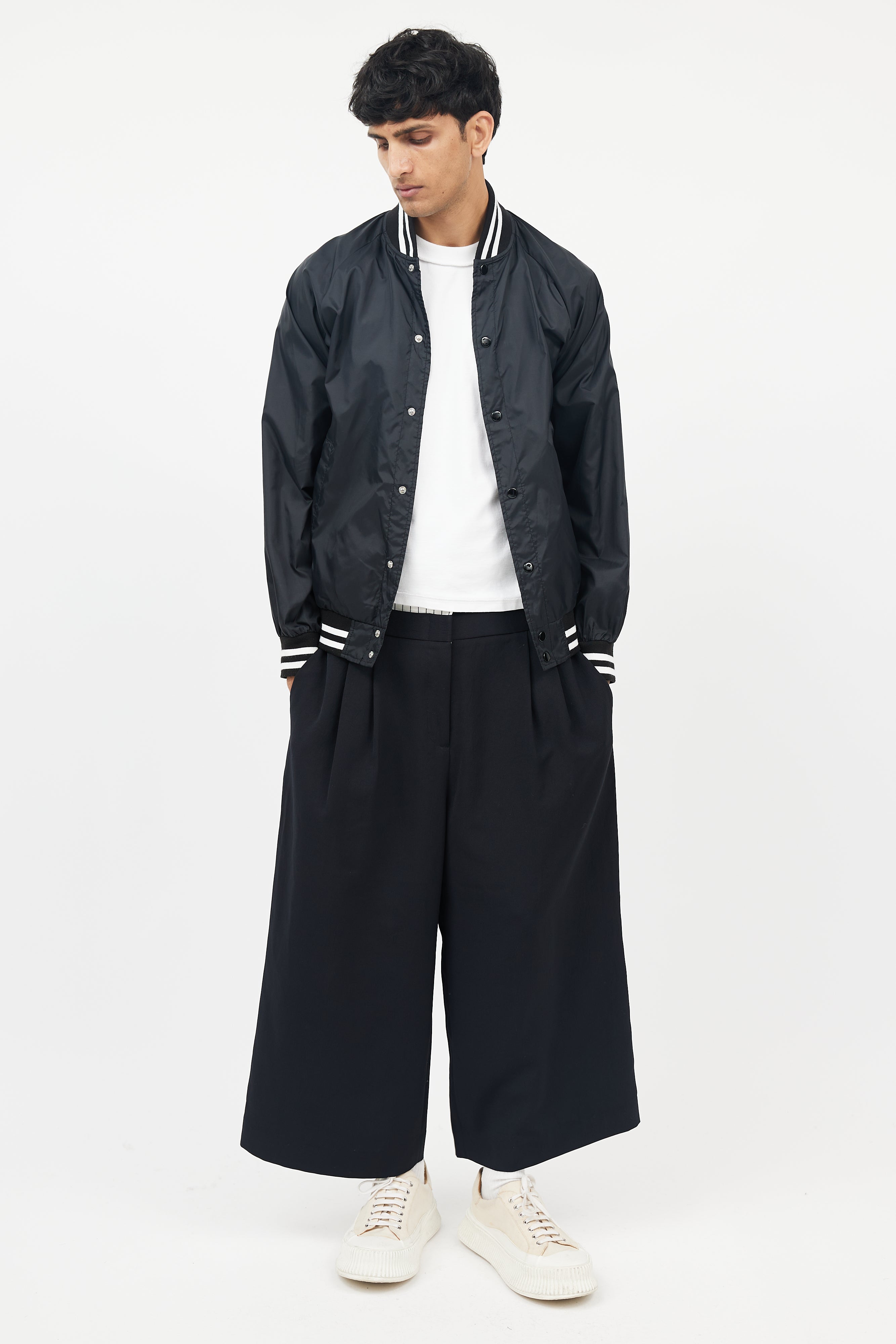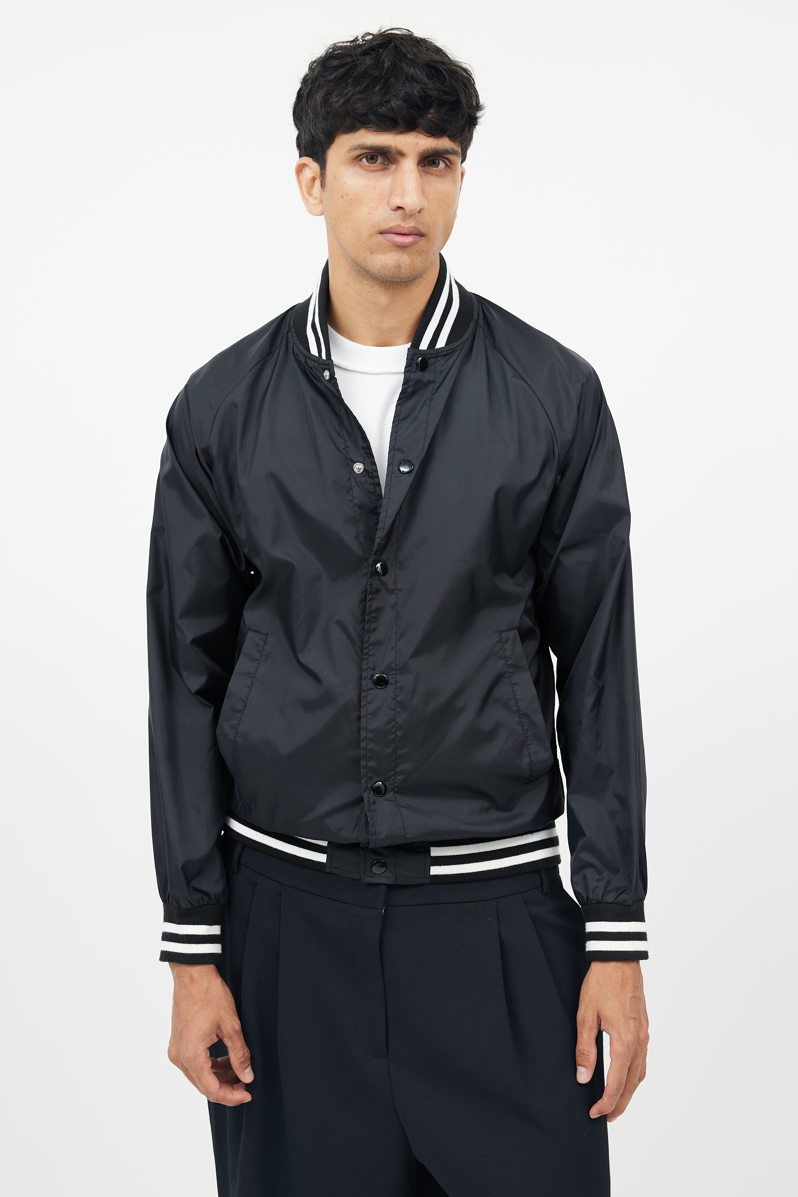 Pre-owned Comme des Garçons black and white jacket featuring snap buttons at front, CDG logo at upper back, slip pockets at side front and striped ribbed bottom band, wrist cuffs and collar. Unlined.