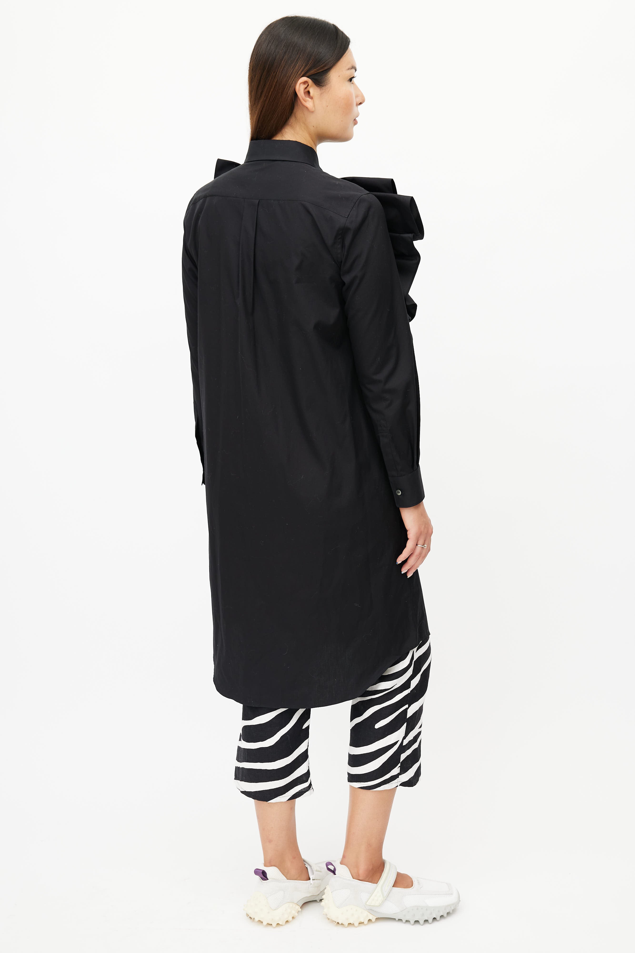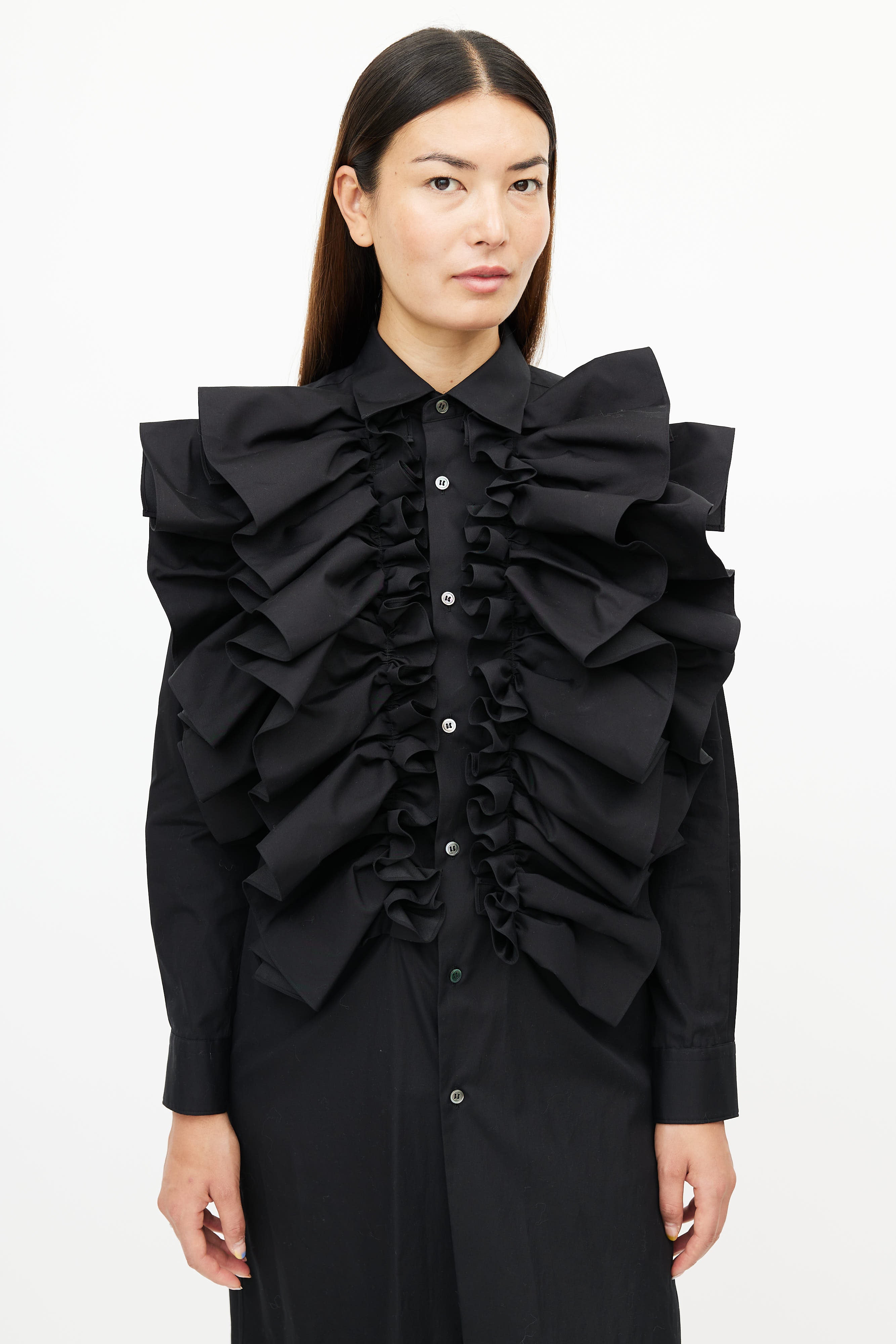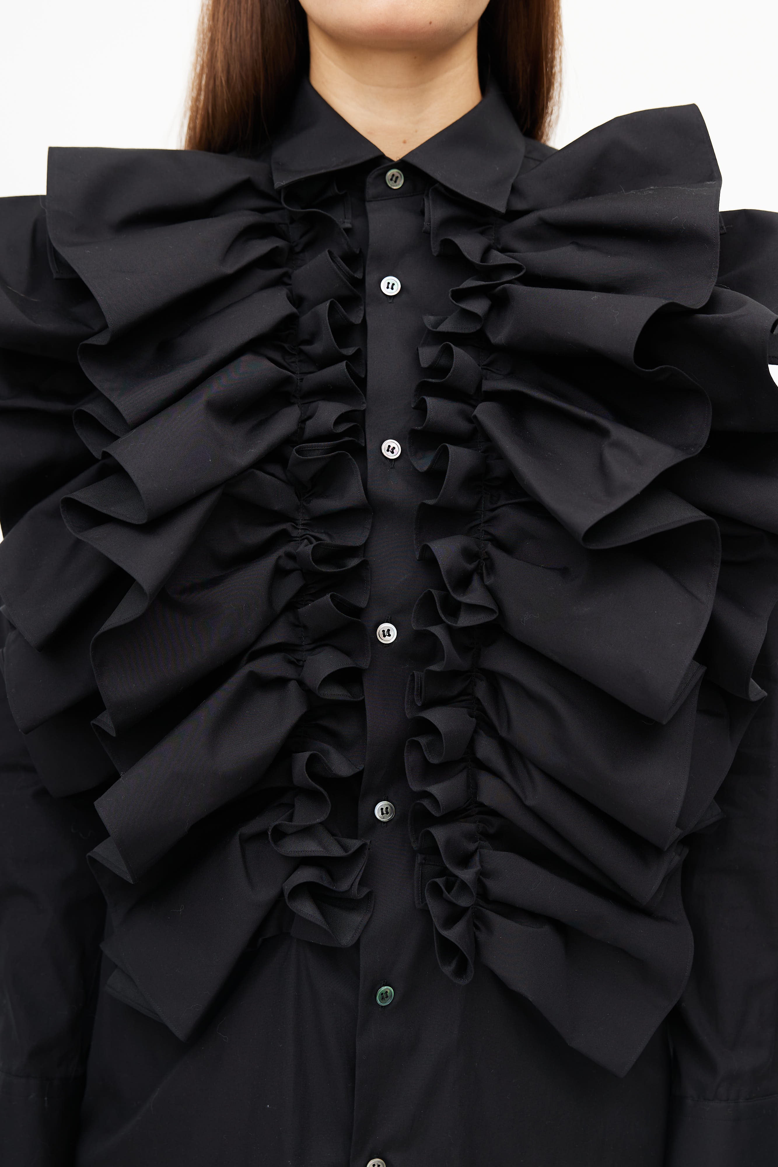 Pre-owned Spring/ Summer 2020 Comme des Garçons black dress featuring button up front, classic collar, buttoned cuffs, and exaggerated ruffle at front.