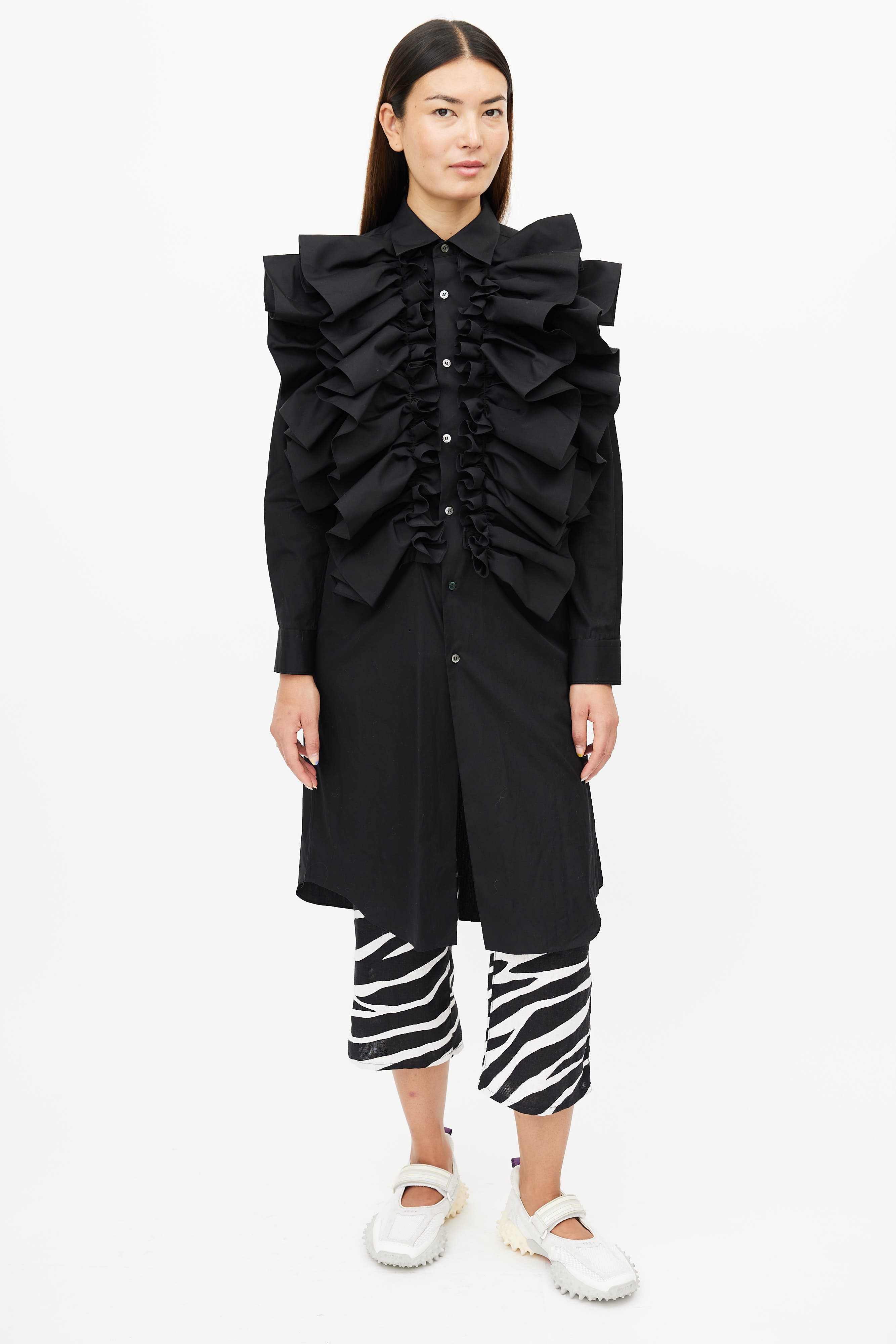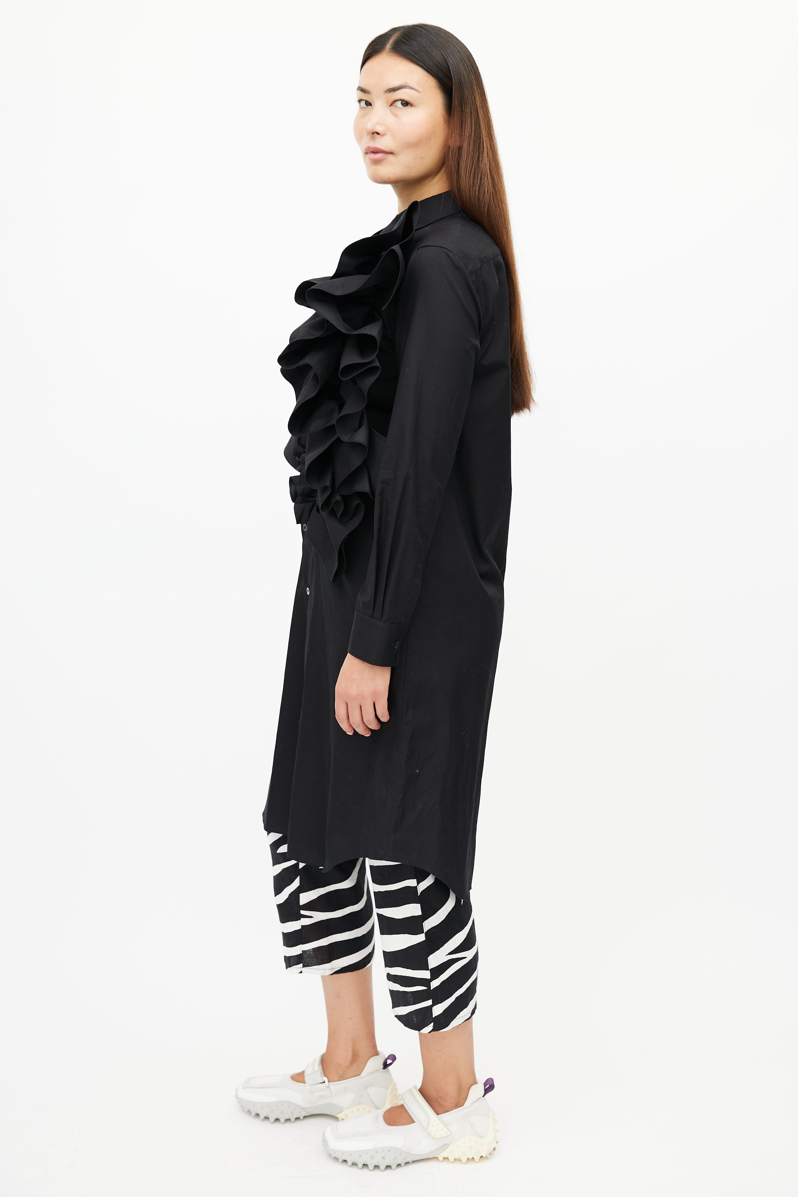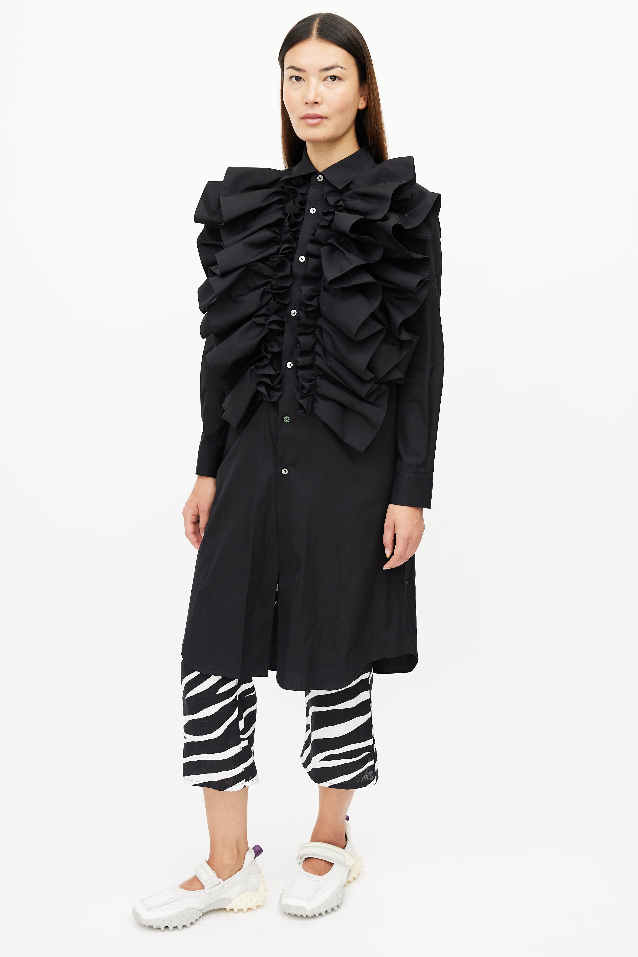 Pre-owned Spring/ Summer 2020 Comme des Garçons black dress featuring button up front, classic collar, buttoned cuffs, and exaggerated ruffle at front.