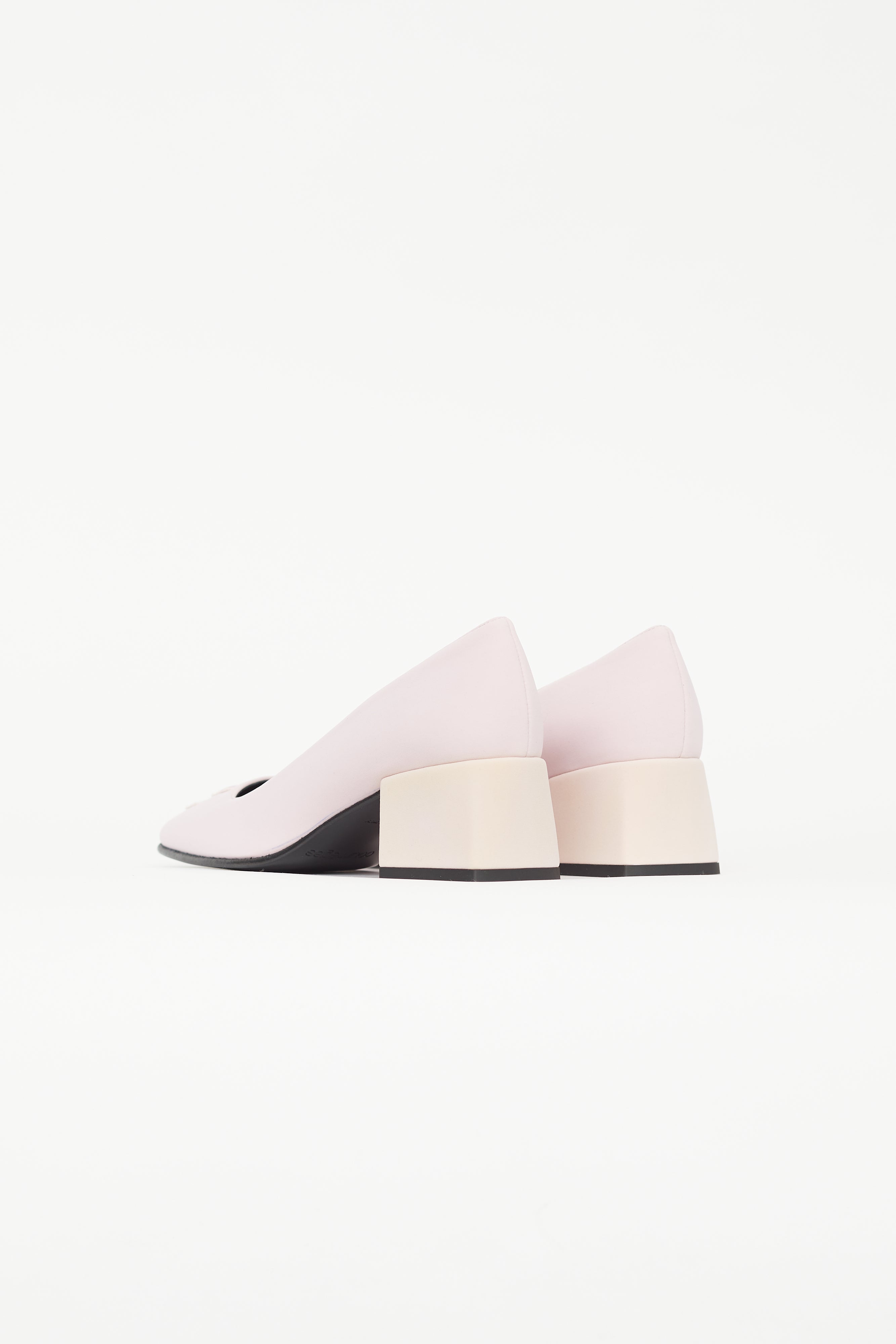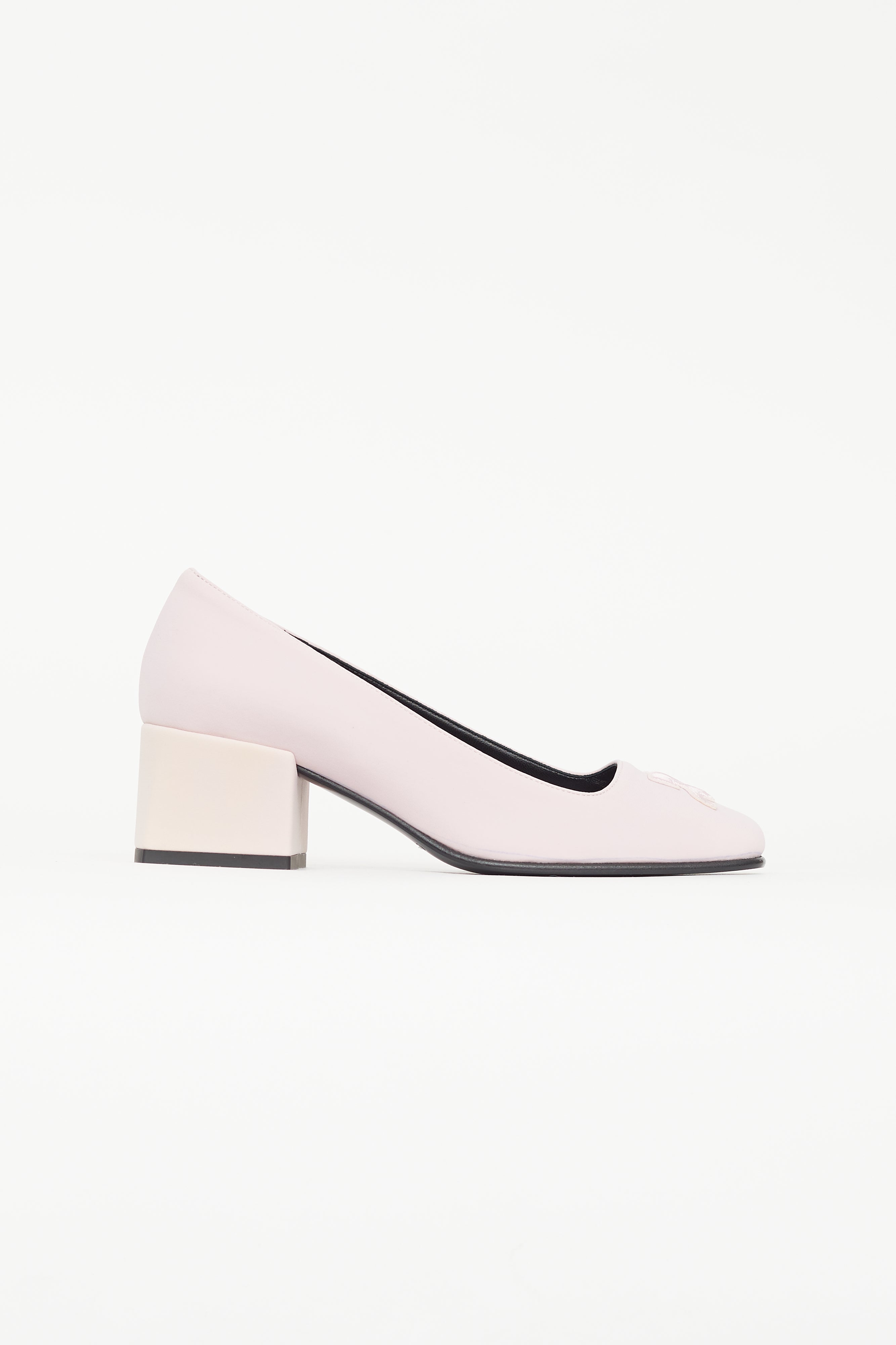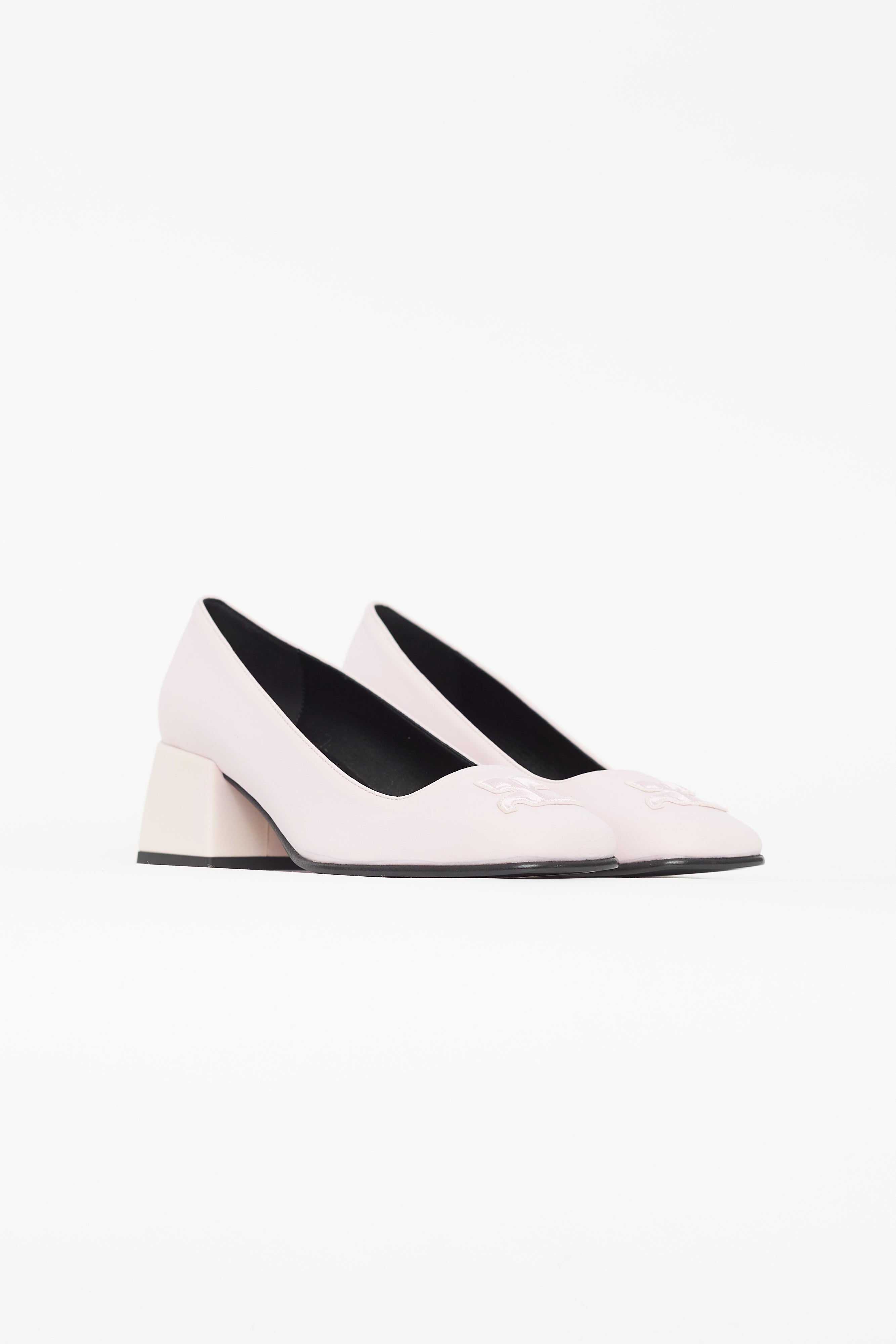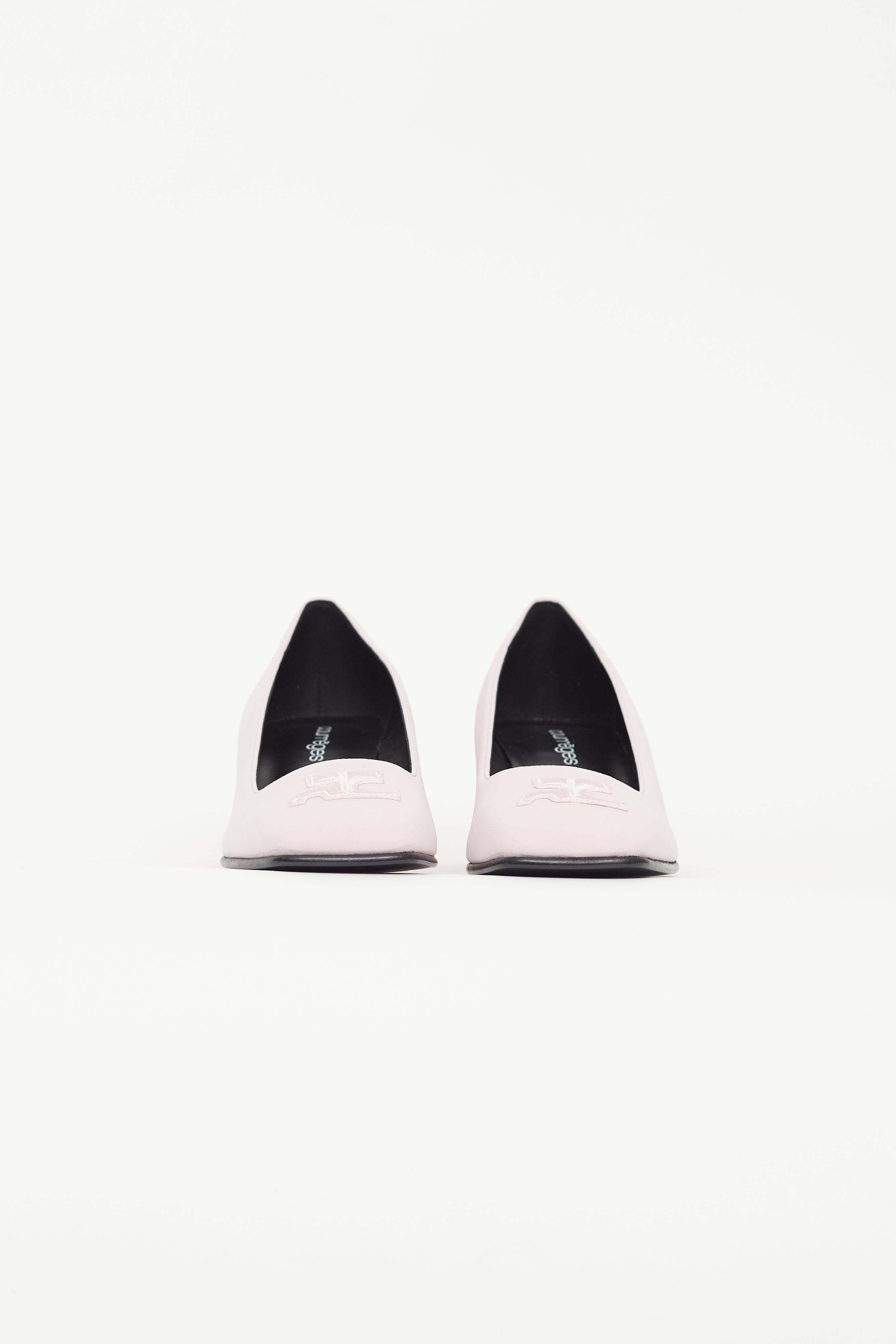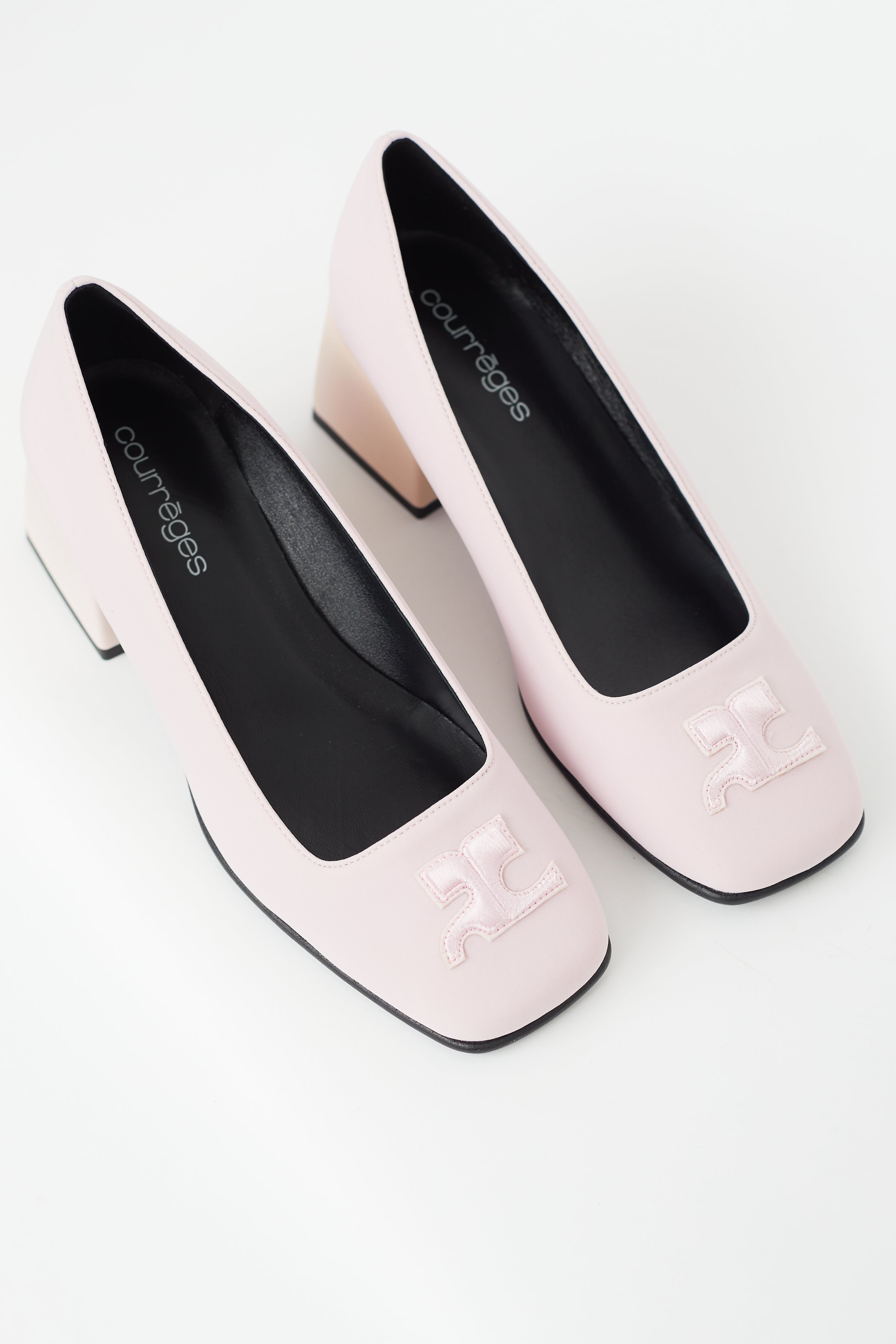 Pre-owned Courrèges pink heels featuring square toe with embroidered logo, light pink block heel, and black leather insole. Comes with original dust bag and box.