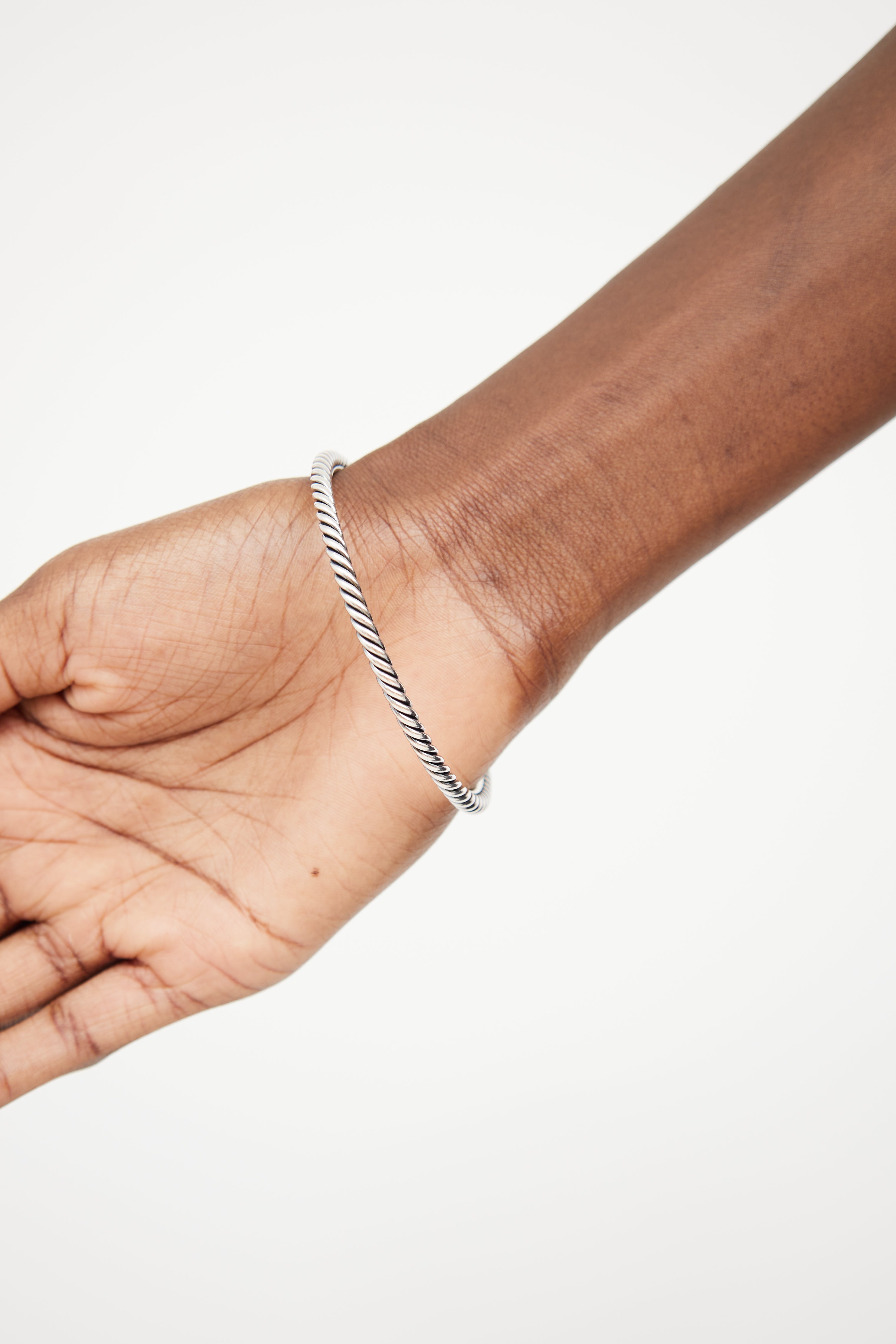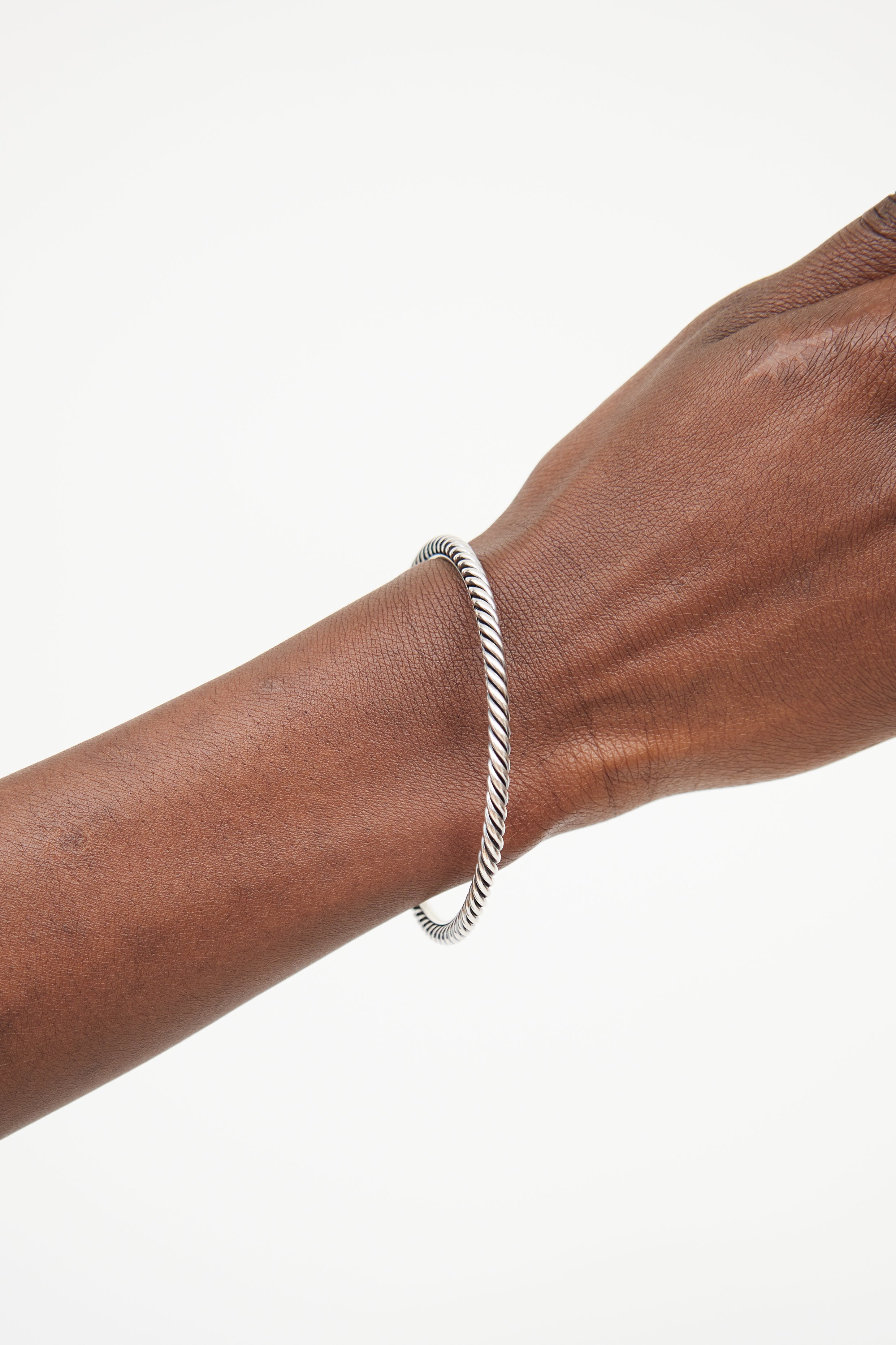 Pre-owned David Yurman sterling silver sculpted cable bangle featuring a cable style band with additional sterling silver under lining. Stamped with "D.Y." and "925".
