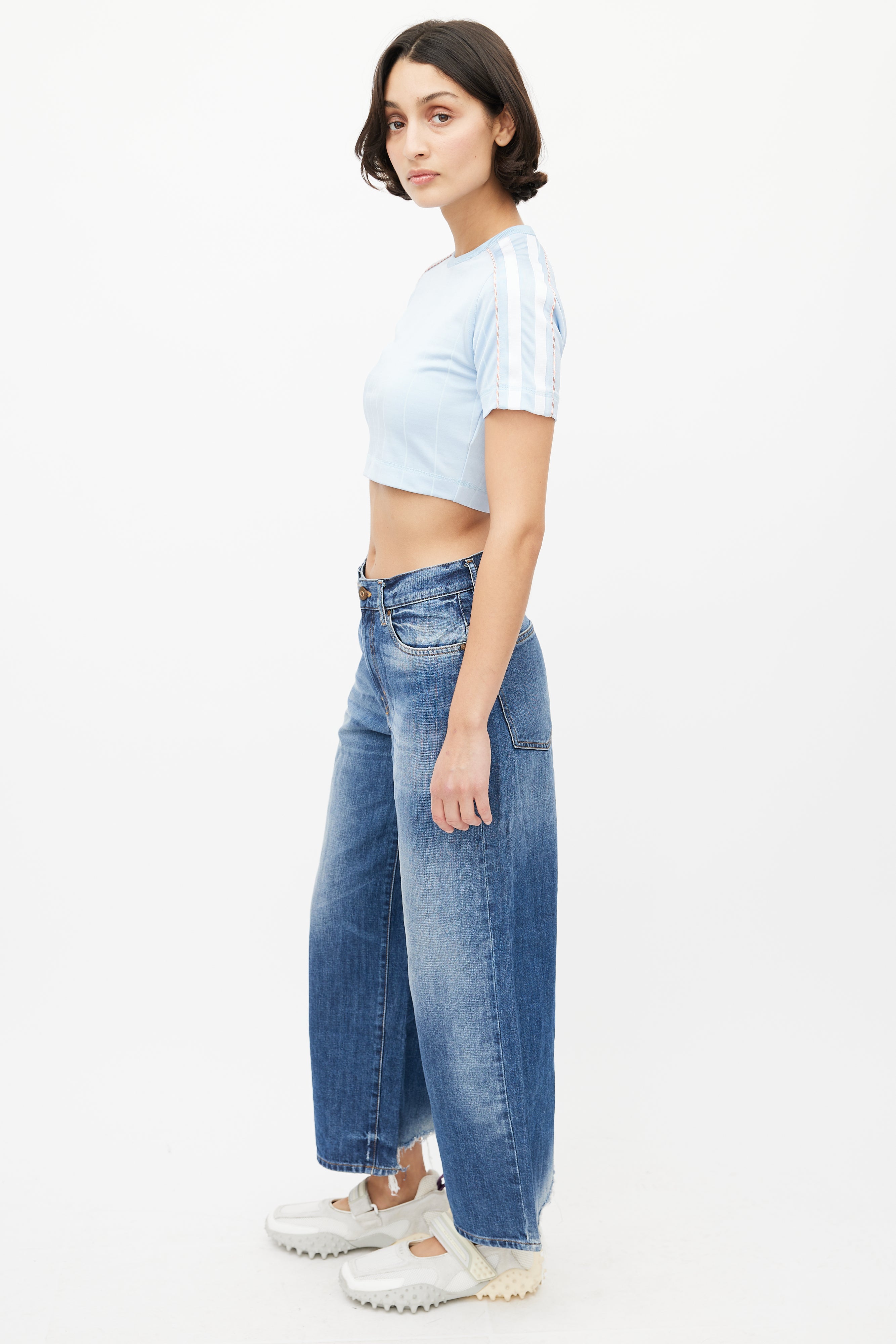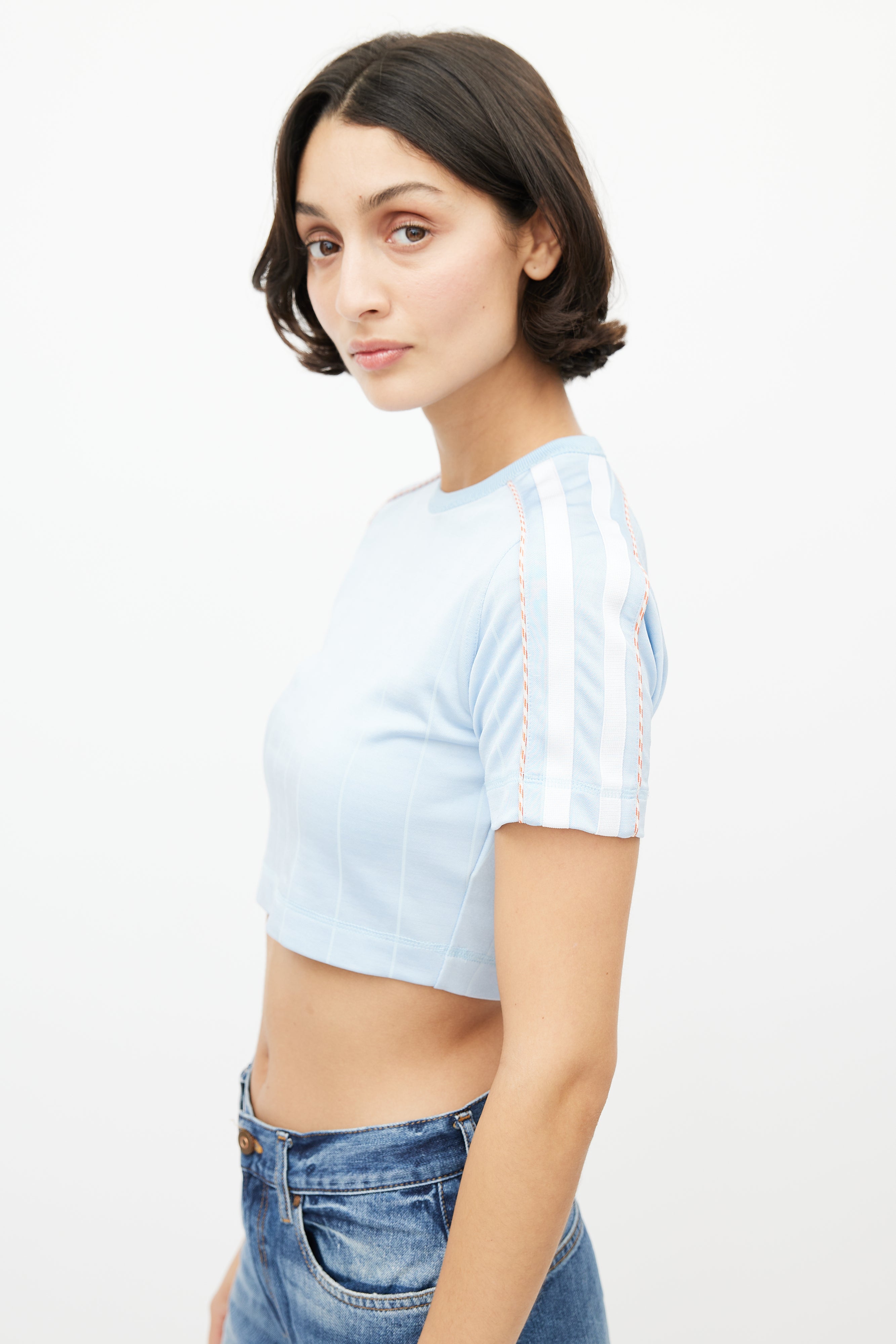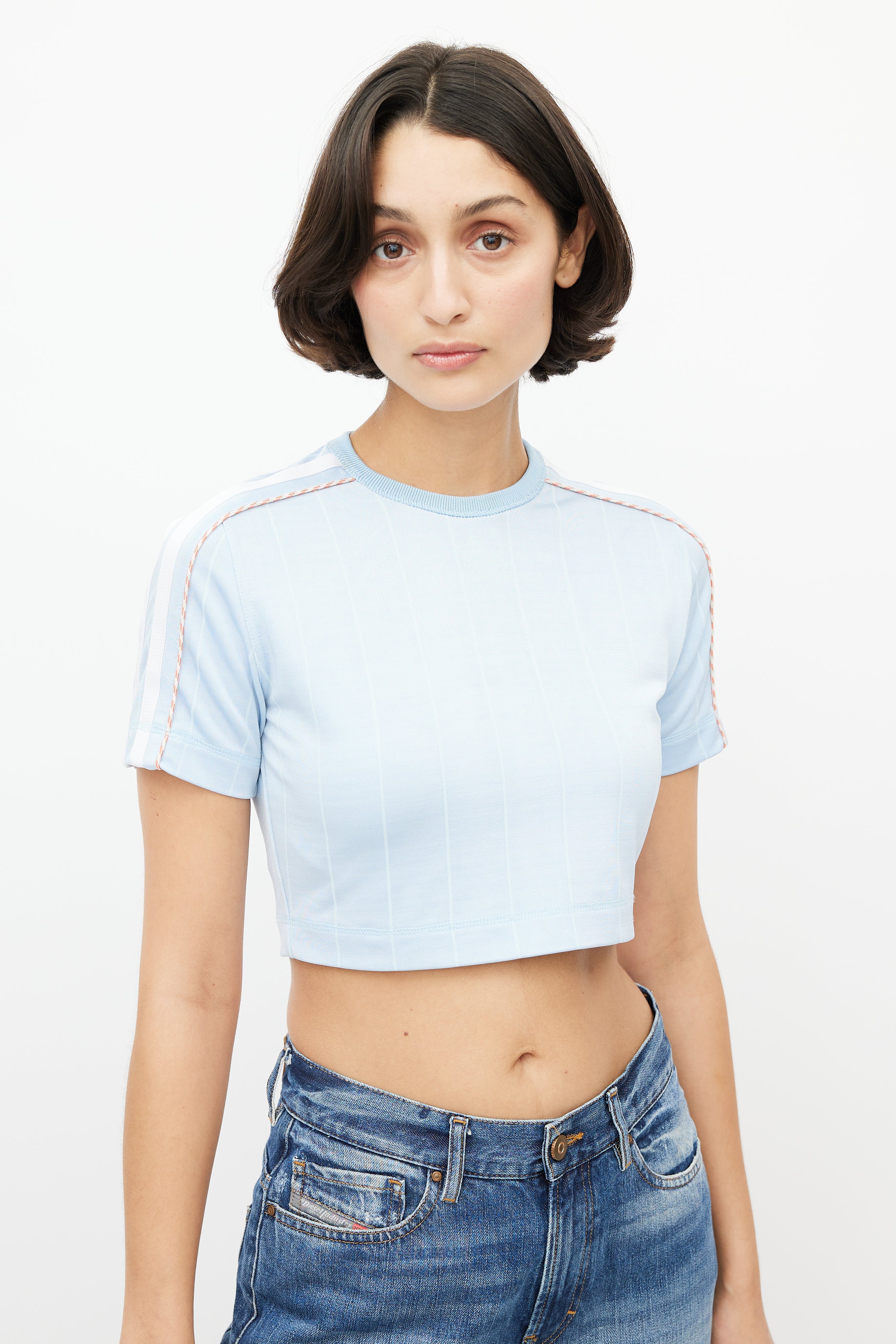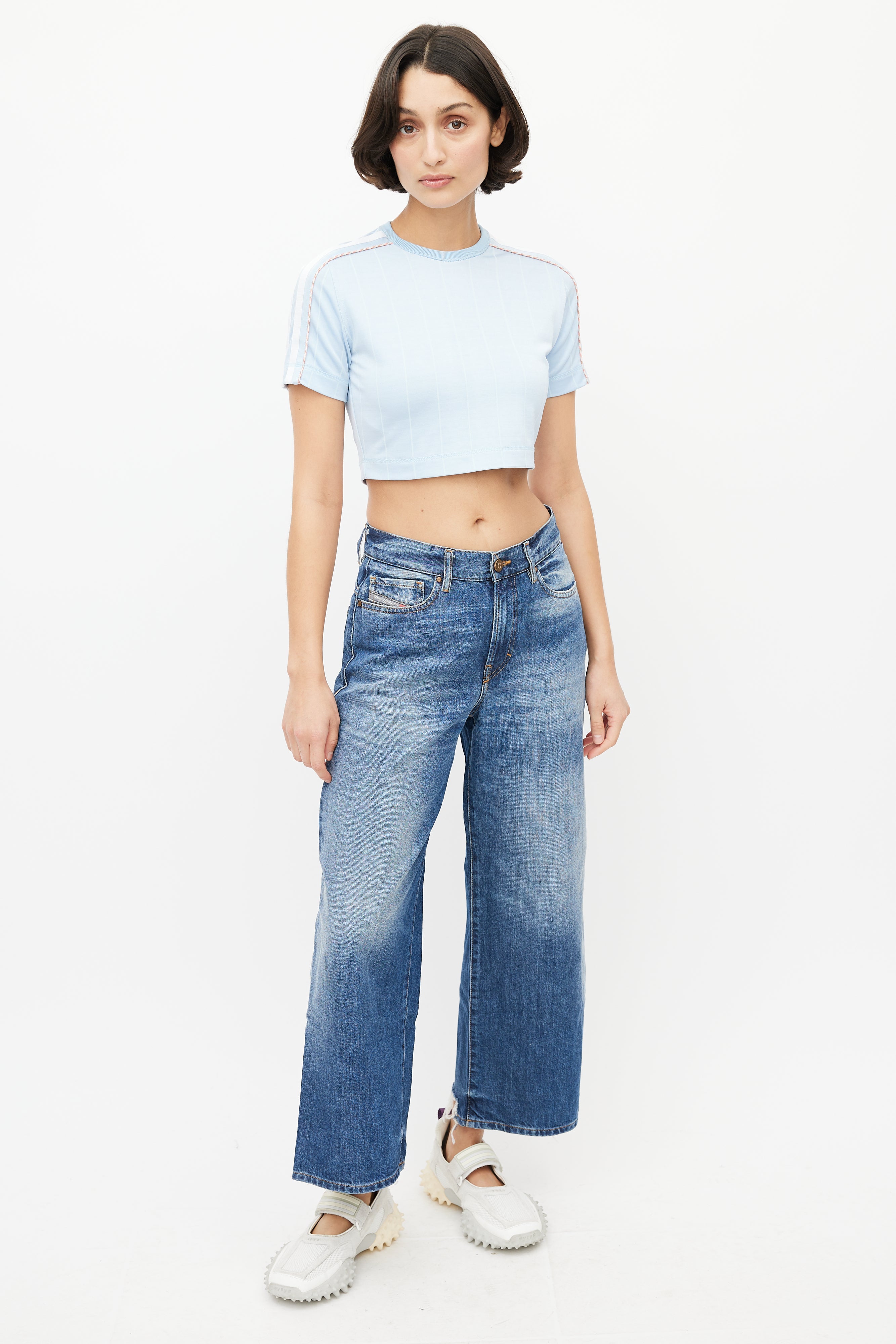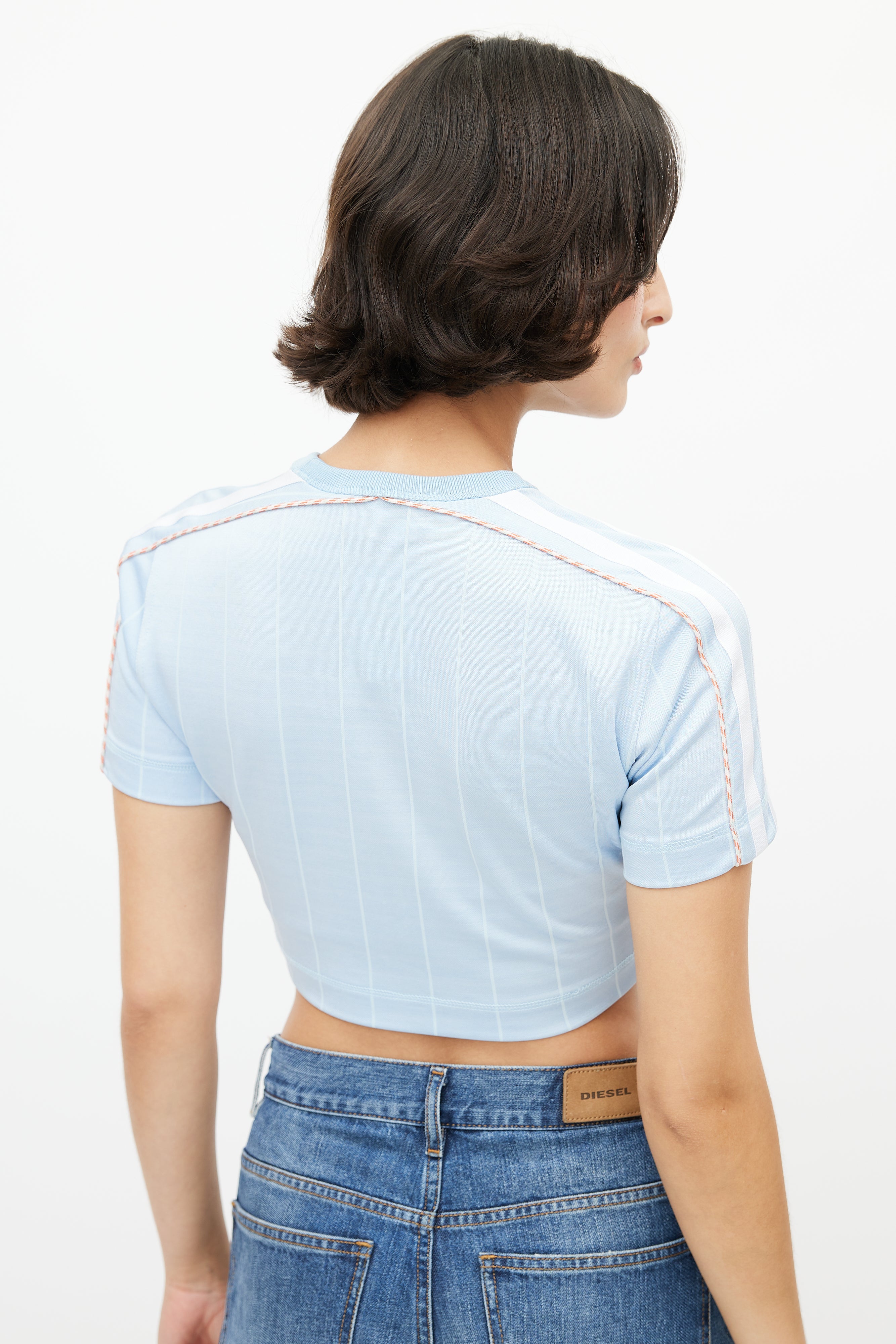 Pre-owned Diesel Black Gold blue top featuring a white striped pattern at sides, crew neckline, and cropped fit.