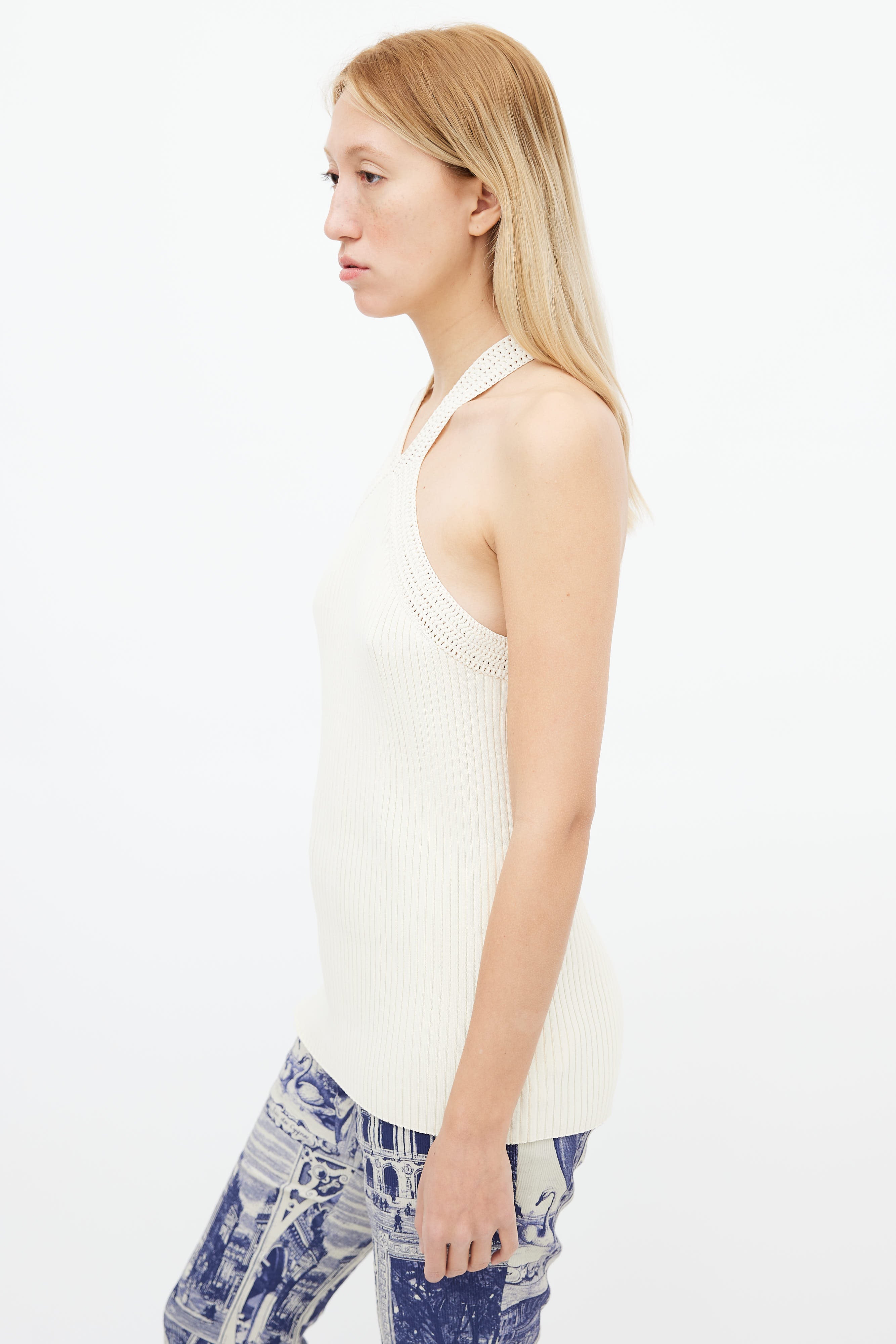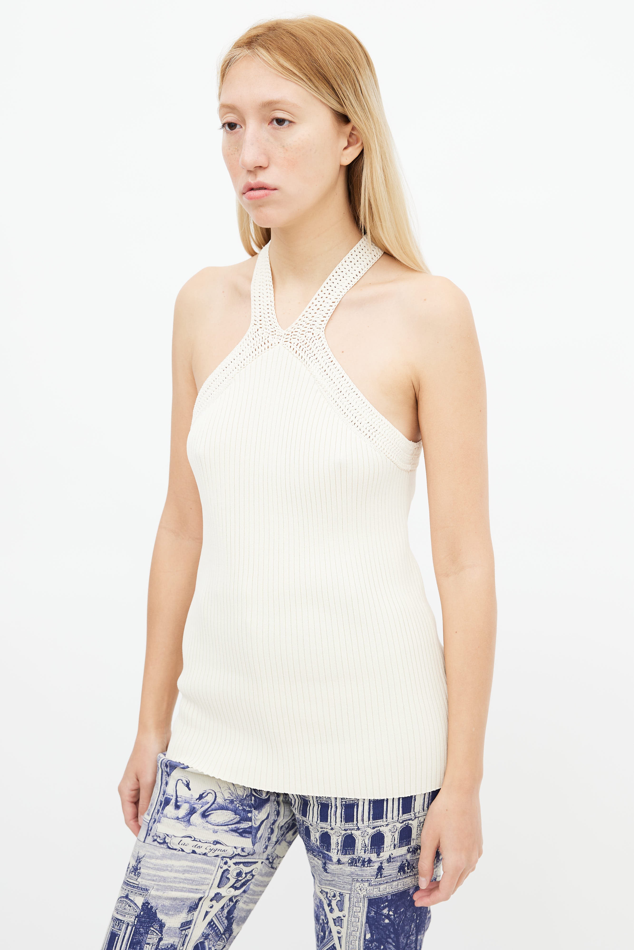 Dion Lee Stirrup Crochet tank top in cream featuring crochet halter neck, ribbed knit, and rolled hem.