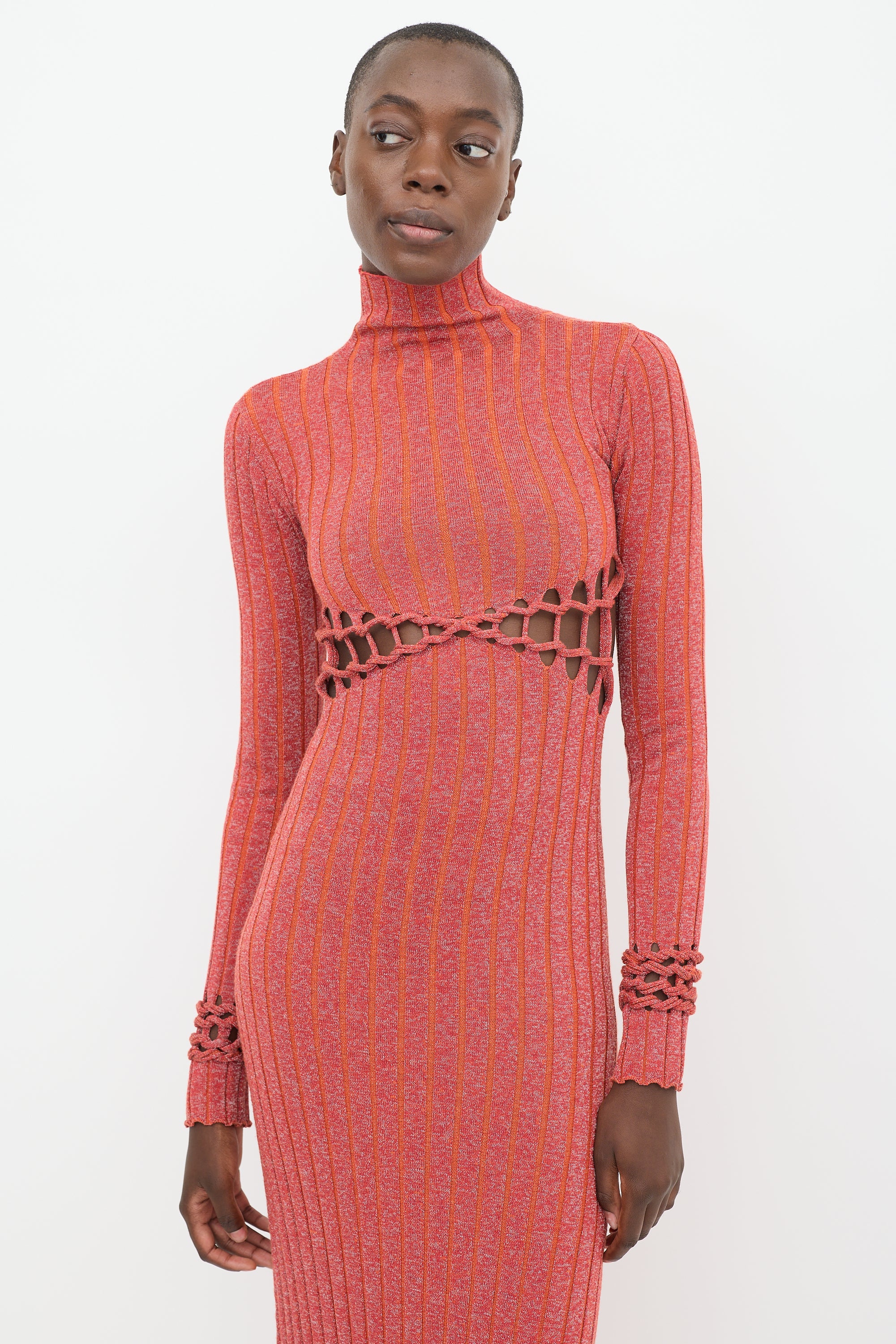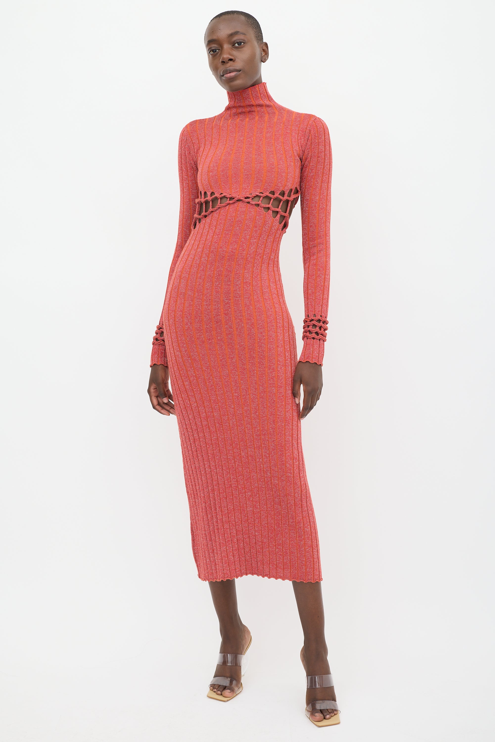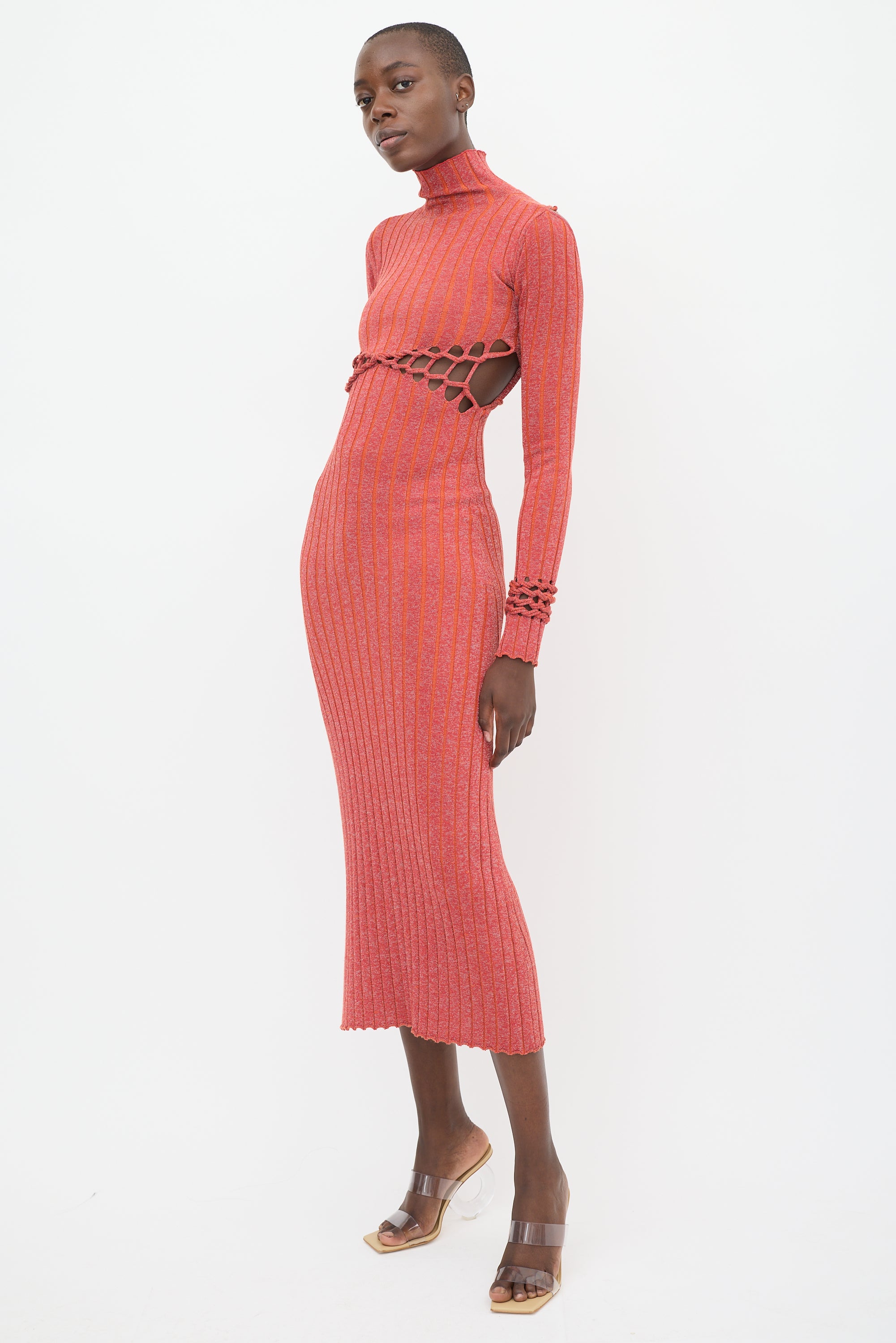 Pre-owned Dion Lee red reflective dress featuring a mock neck collar, long sleeves with knotted trim, cut out detailing at waist and bust, and ribbed knit.