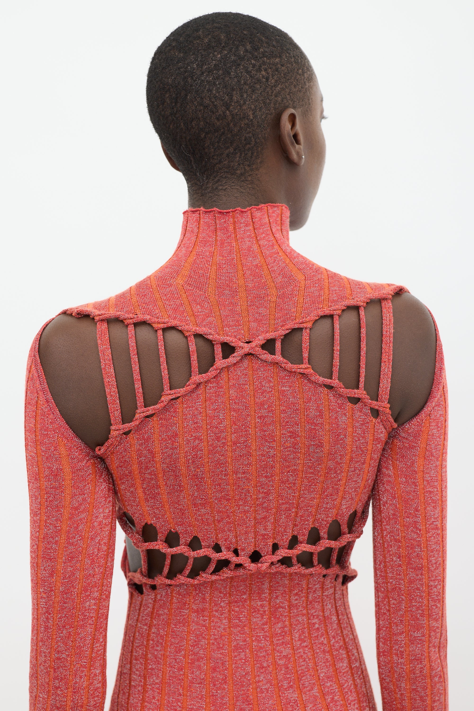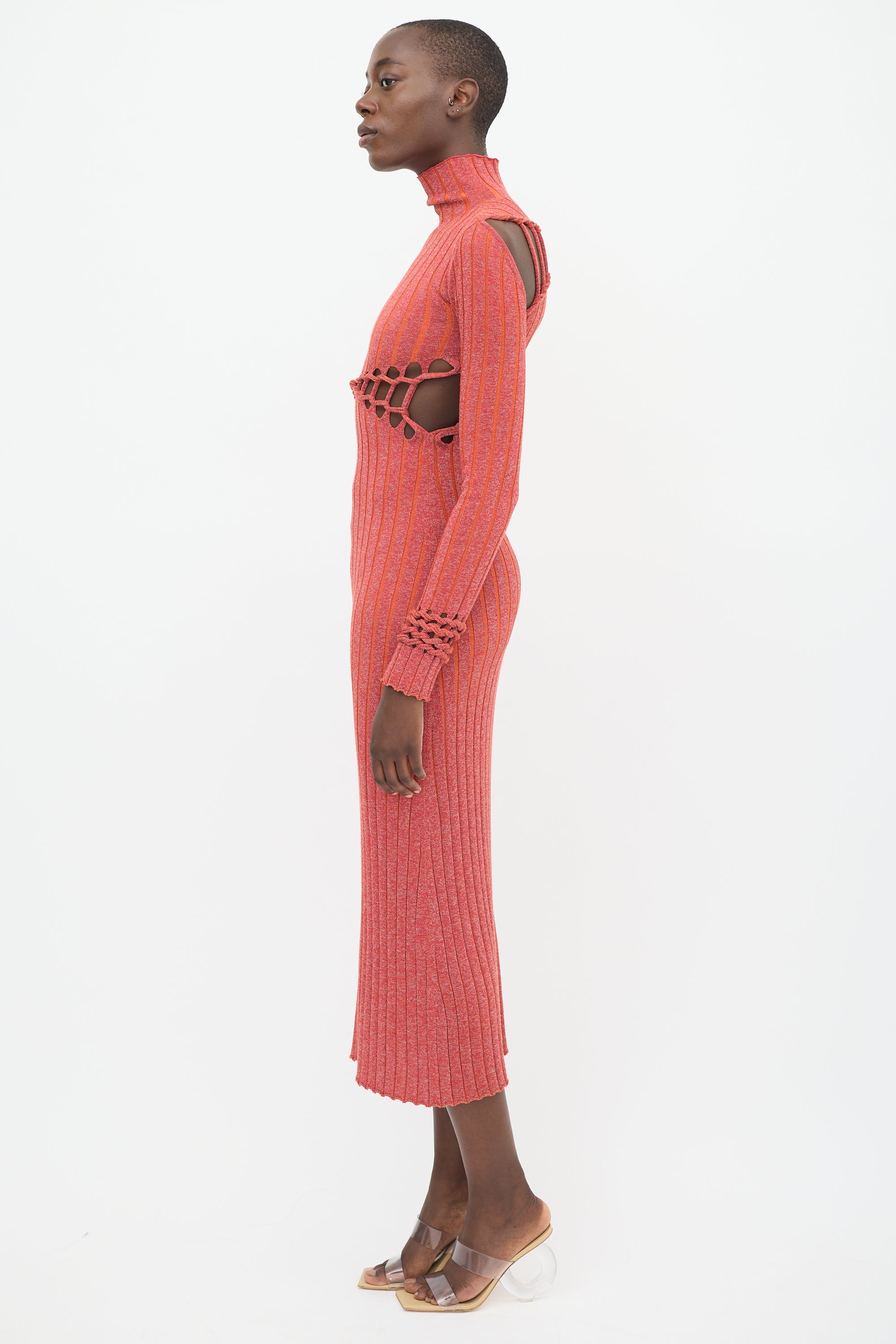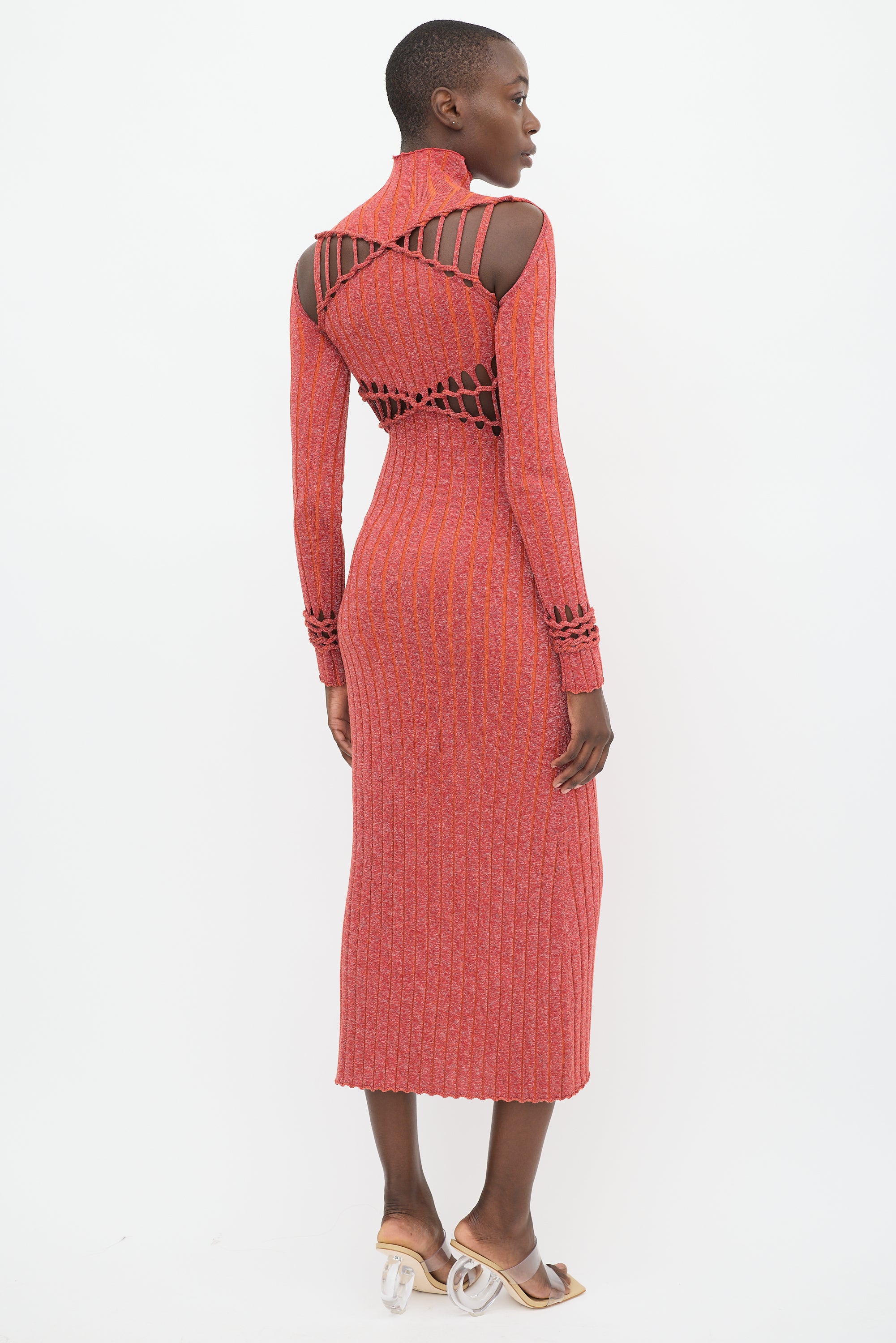 Pre-owned Dion Lee red reflective dress featuring a mock neck collar, long sleeves with knotted trim, cut out detailing at waist and bust, and ribbed knit.