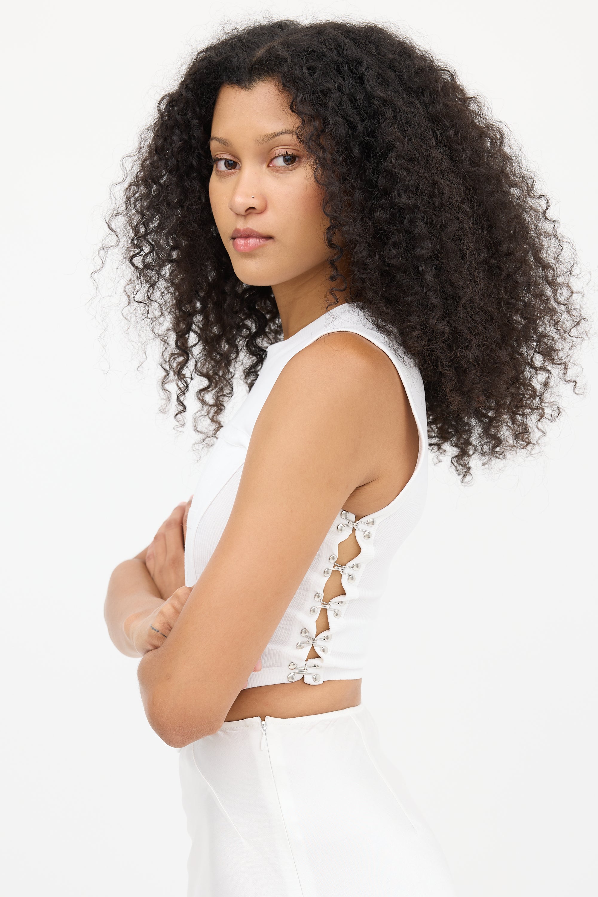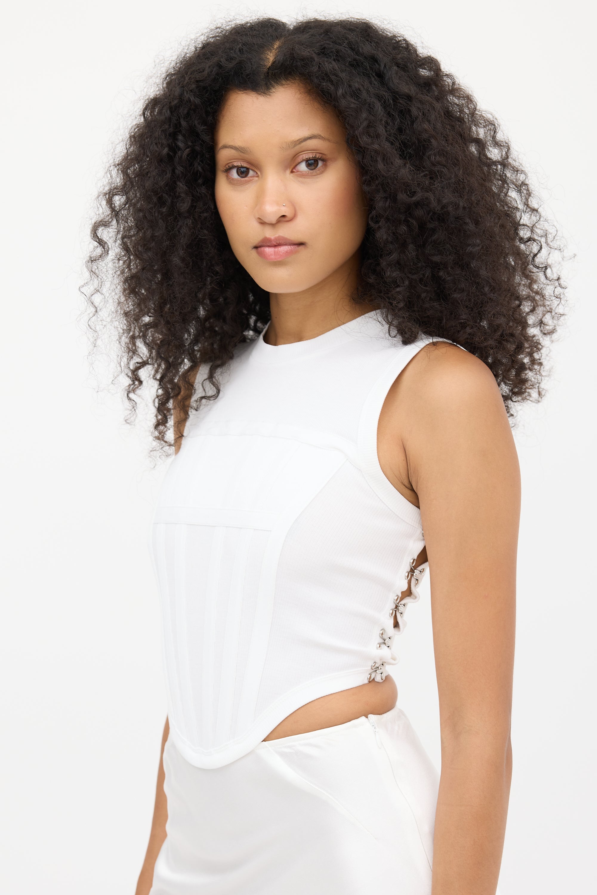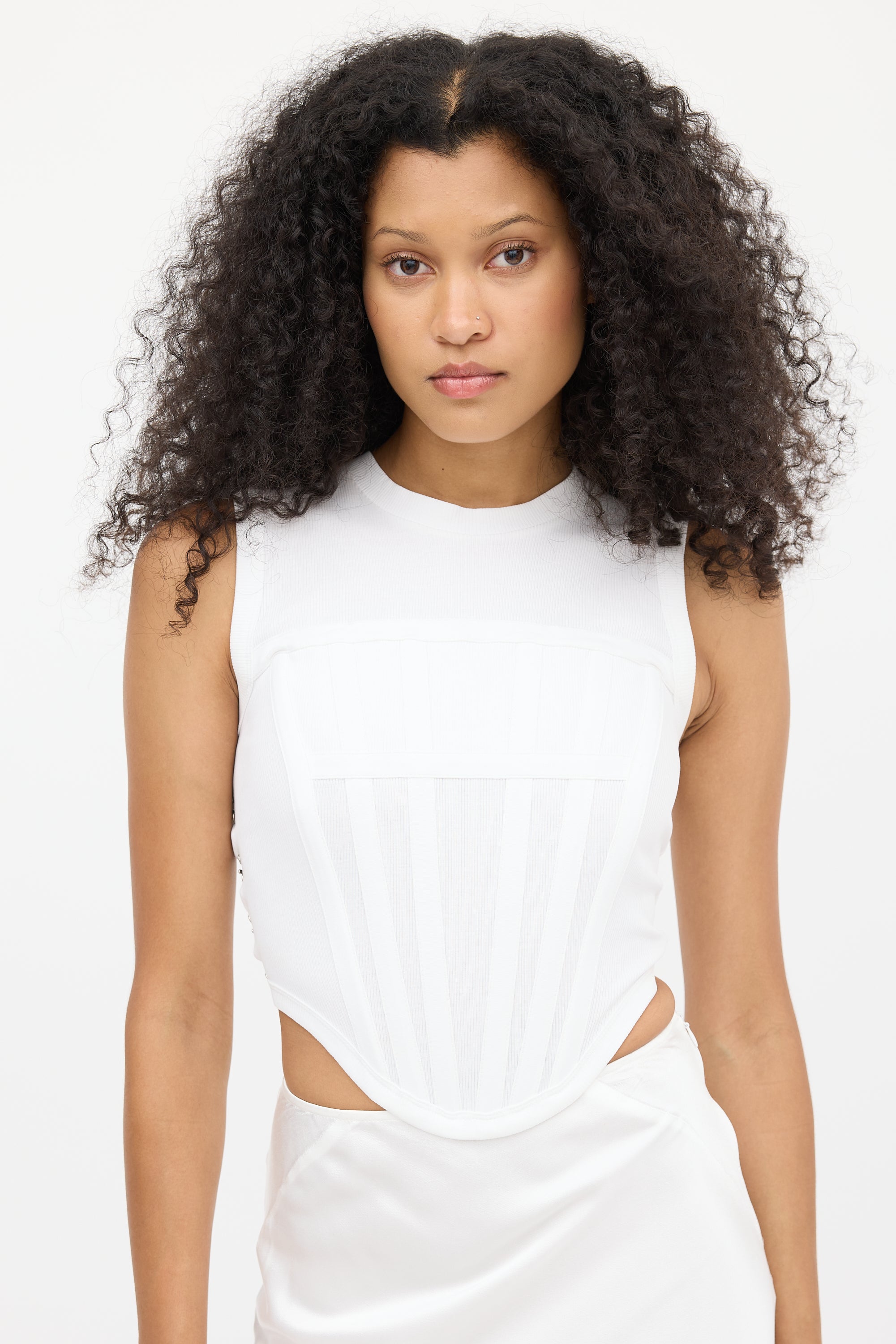 Pre-owned Dion Lee white corset top featuring a round neckline, sleeveless styling, ribbed detailing, structured bust, and hook and eye closure at sides.