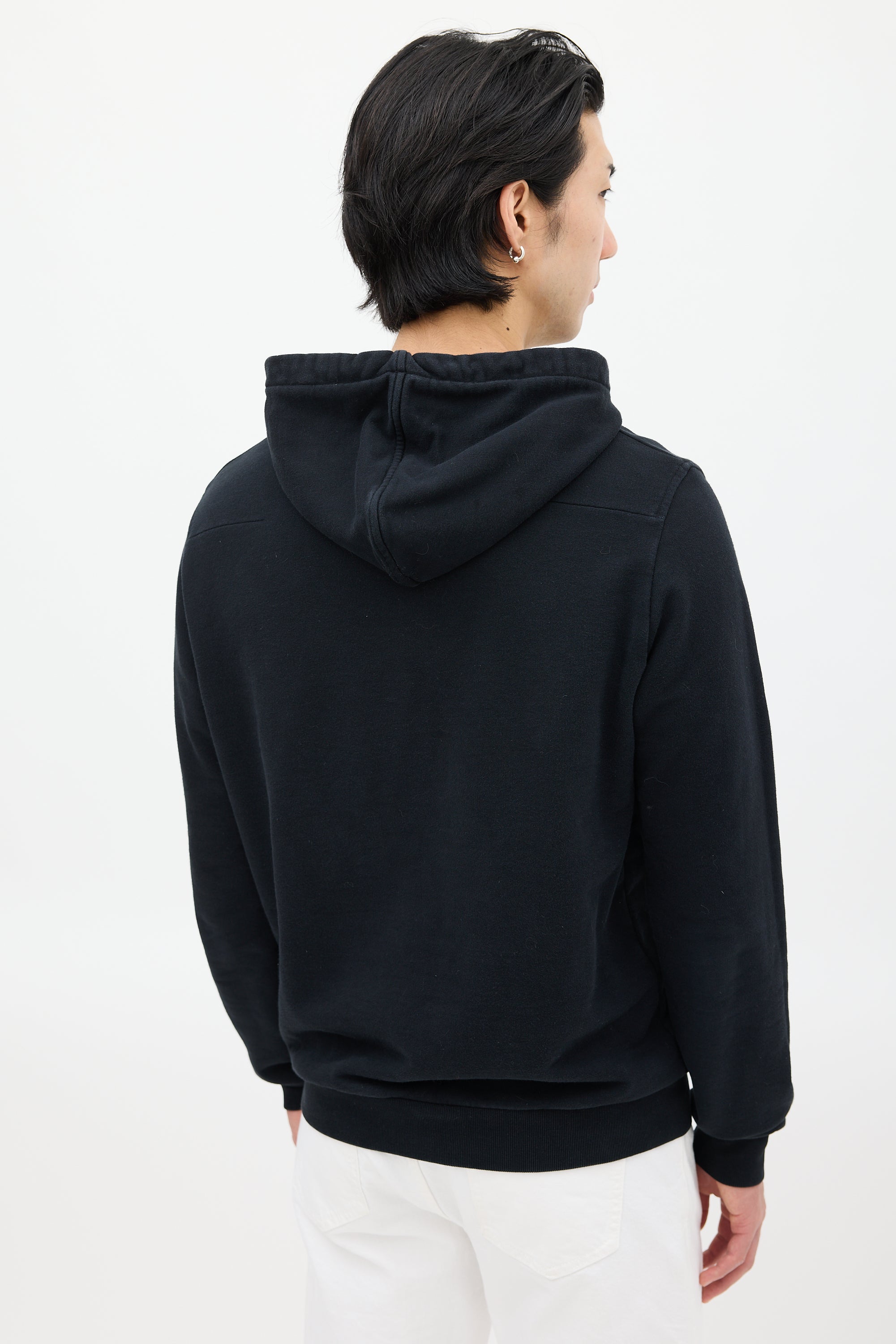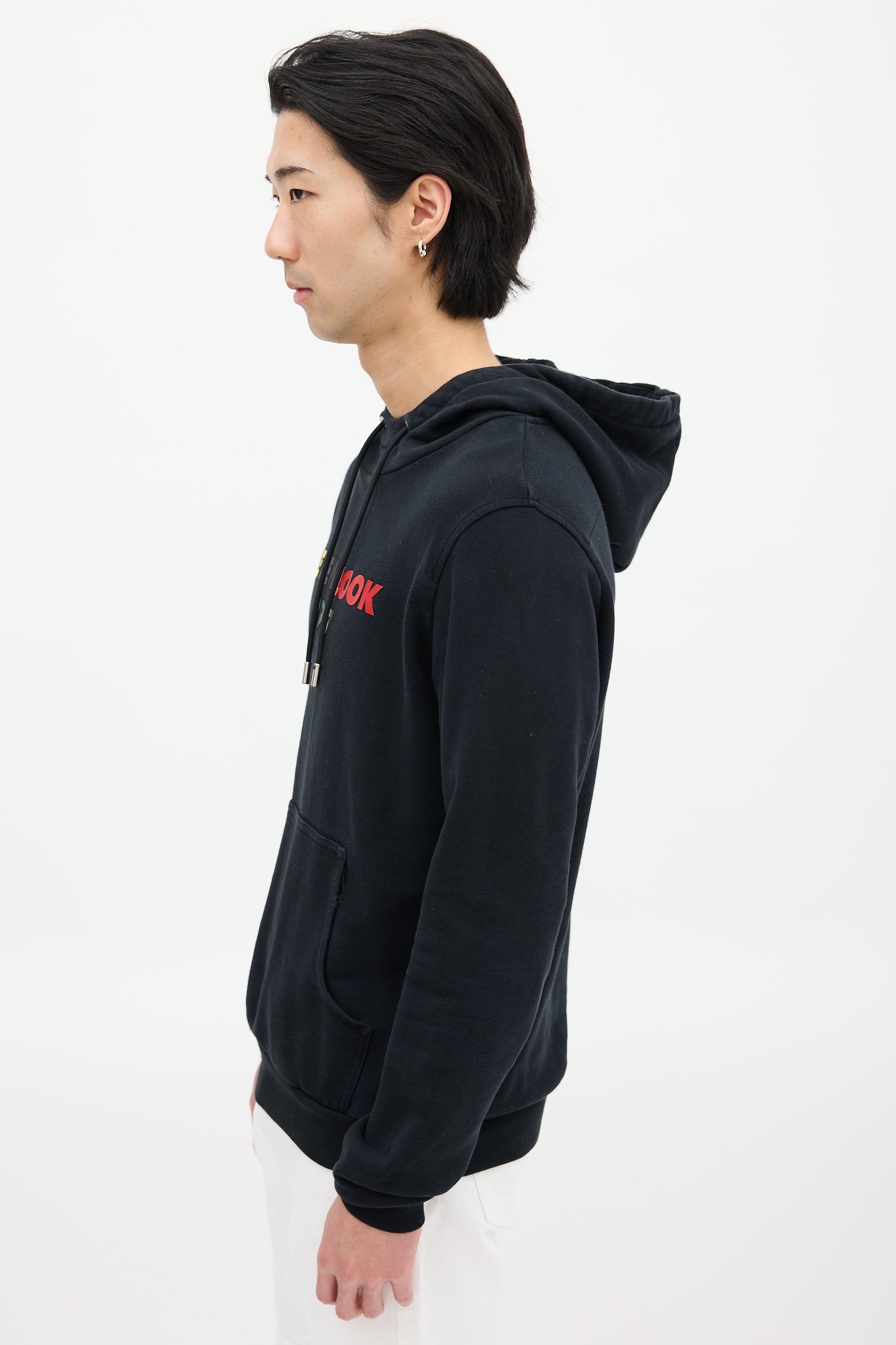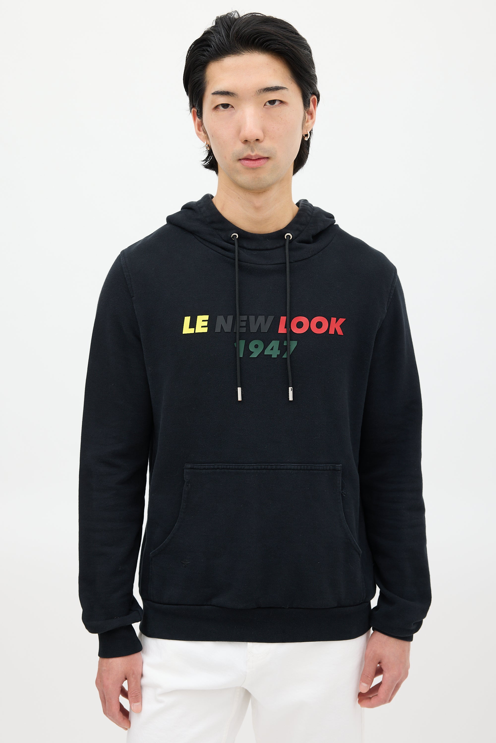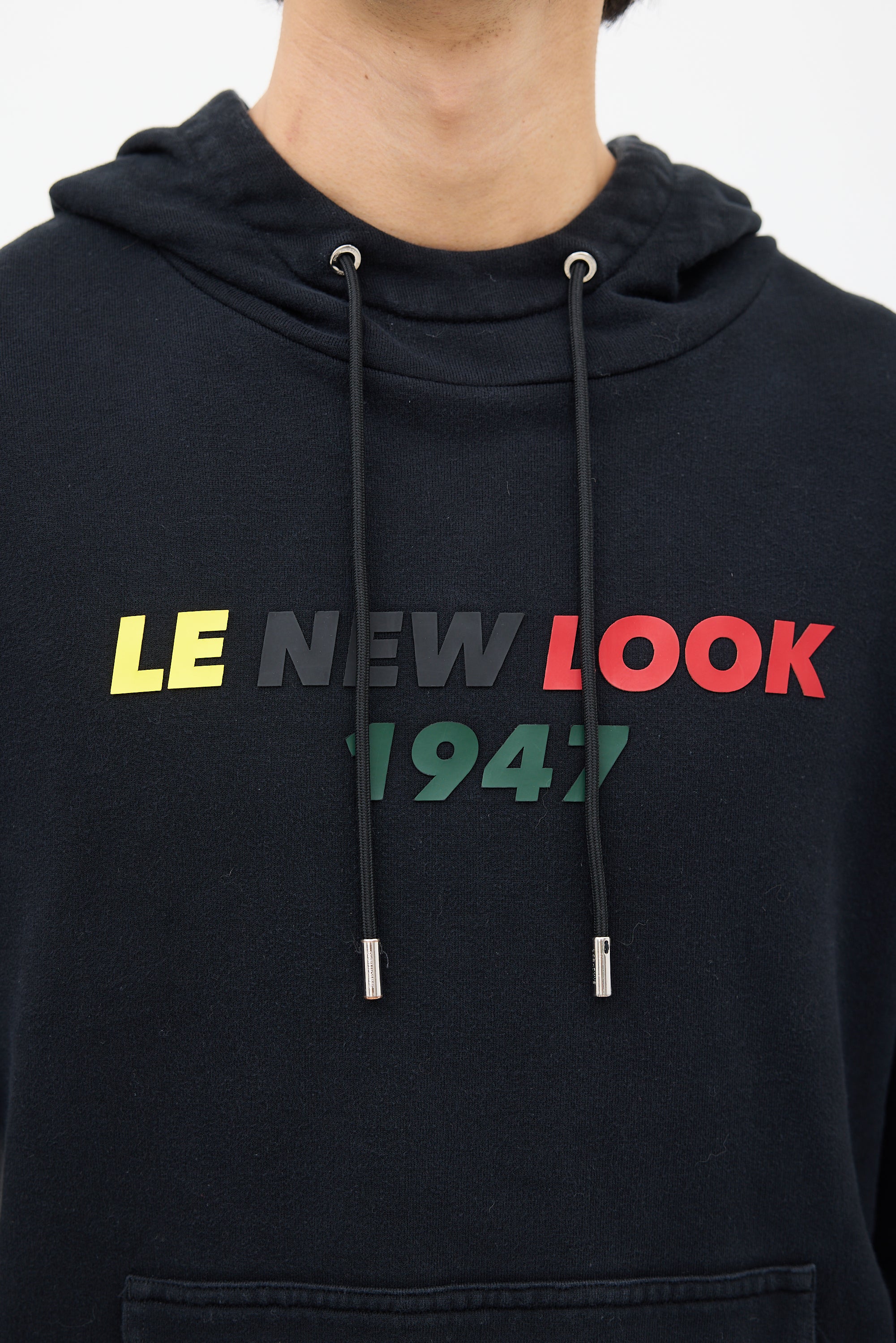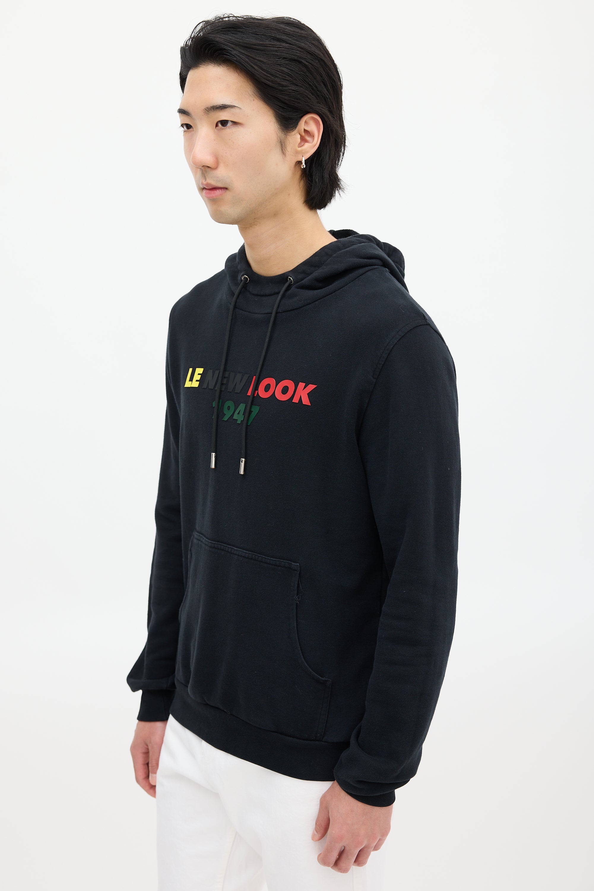 Pre-owned Dior black hoodie featuring a multicolour Le New Look graphic print at chest, drawstring hood, long sleeves, kangaroo pocket with tonal bee logo embroidery, and ribbed hem.