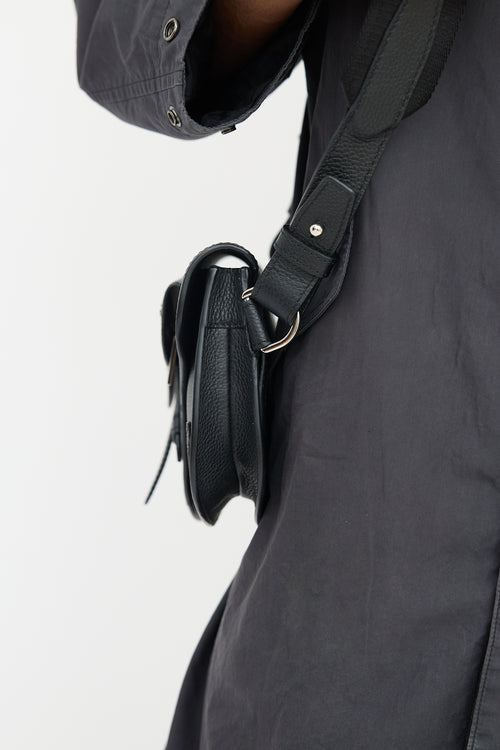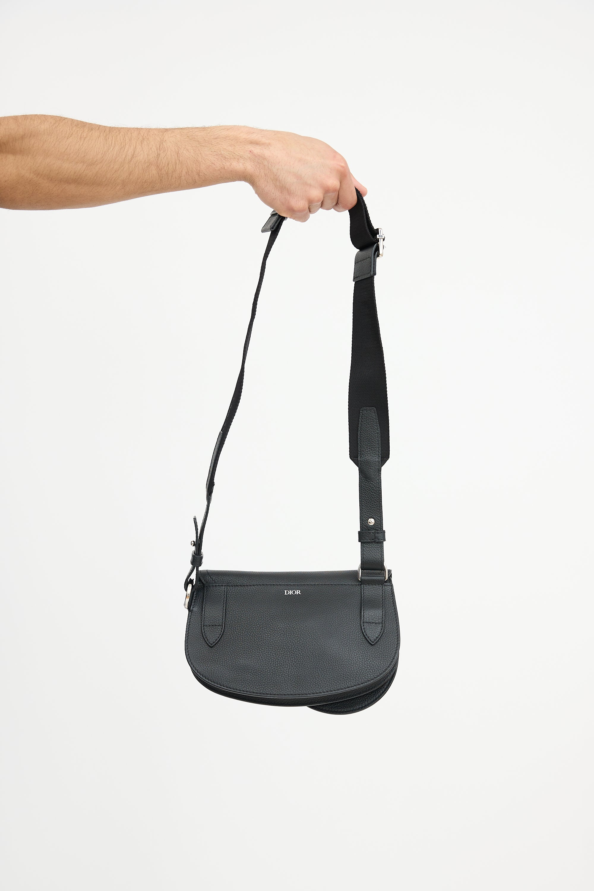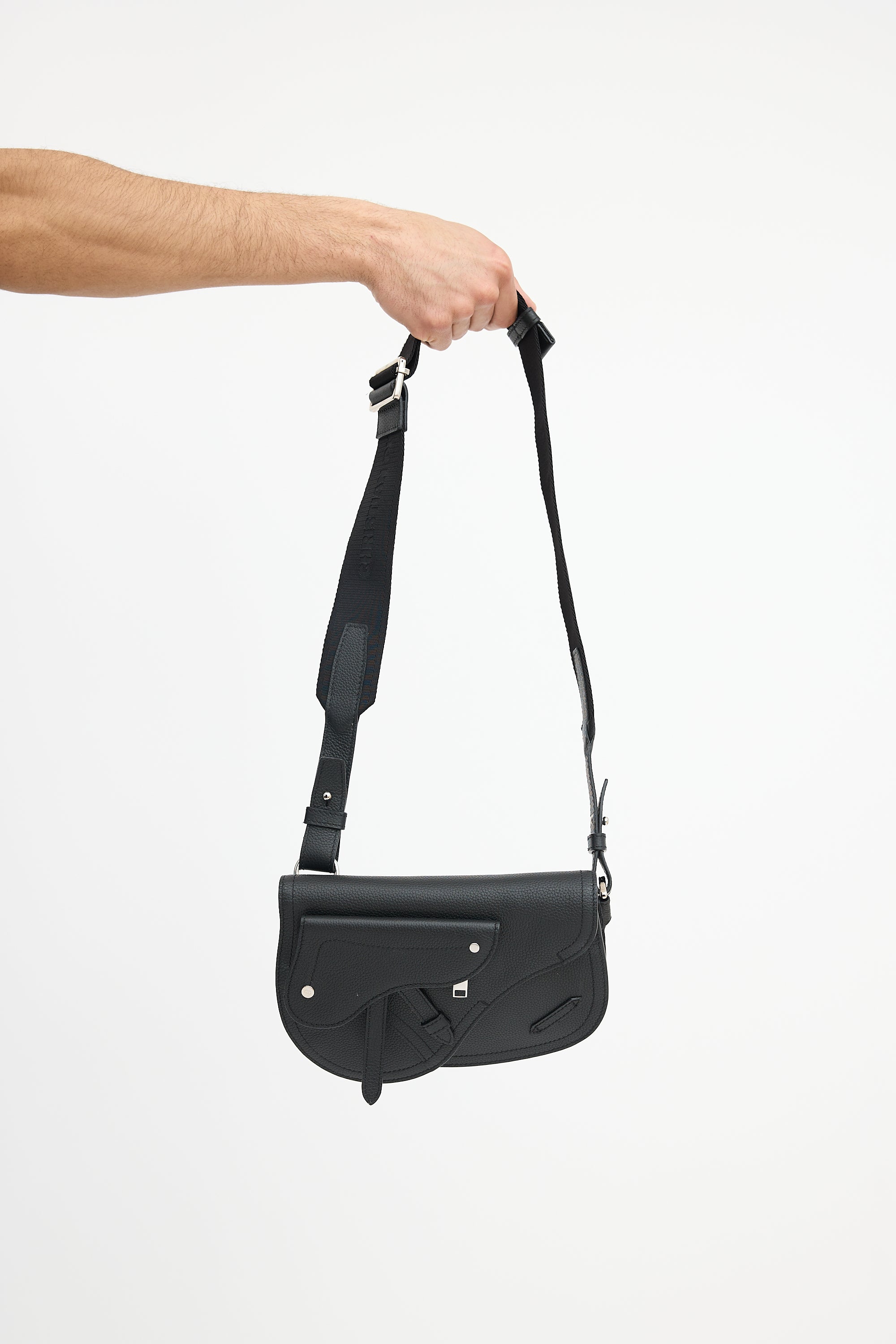 Pre-owned Christian Dior black grained leather Saddle Pouch bag featuring adjustable black logo webbing shoulder strap, silver tone hardware, flap pocket at face with zip closure, flap with snap closure, and black canvas lined main compartment.