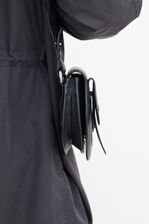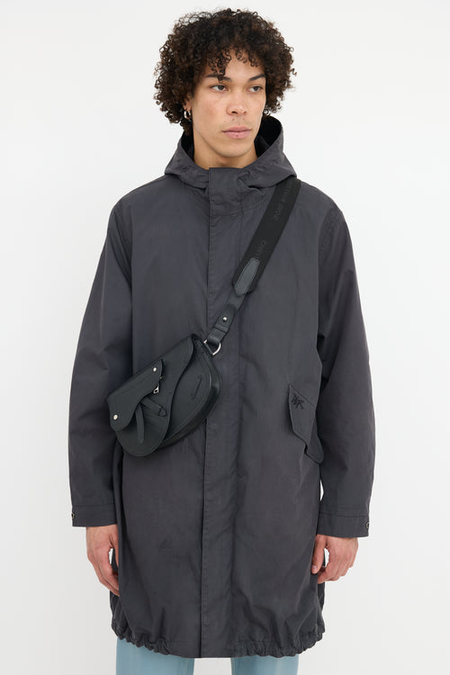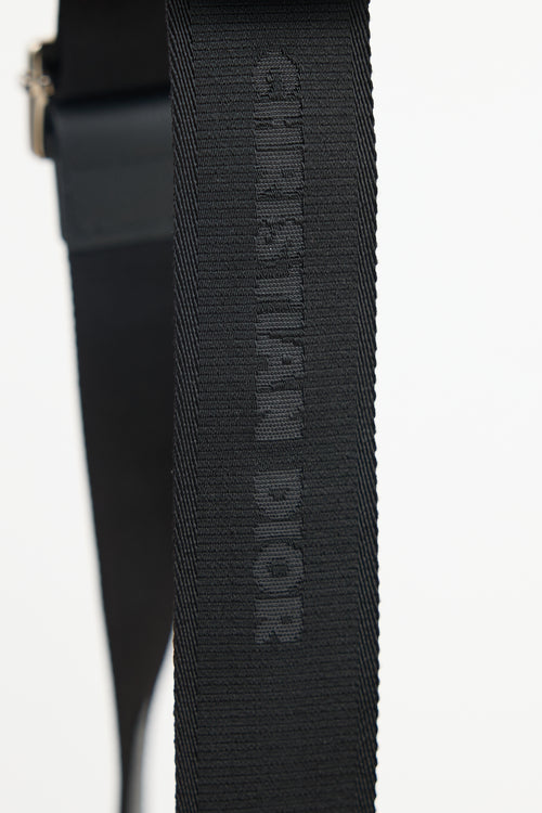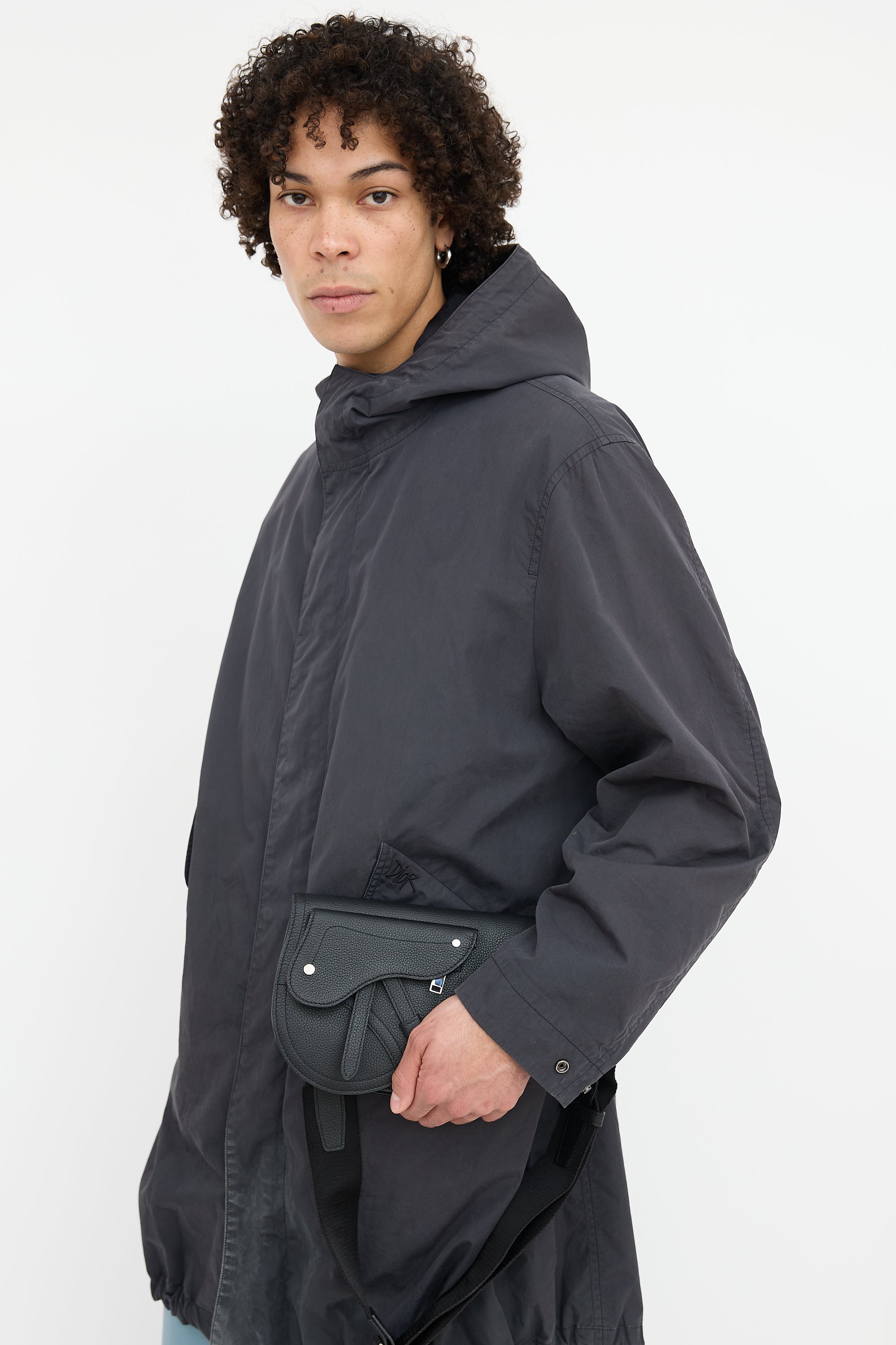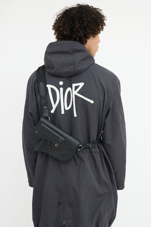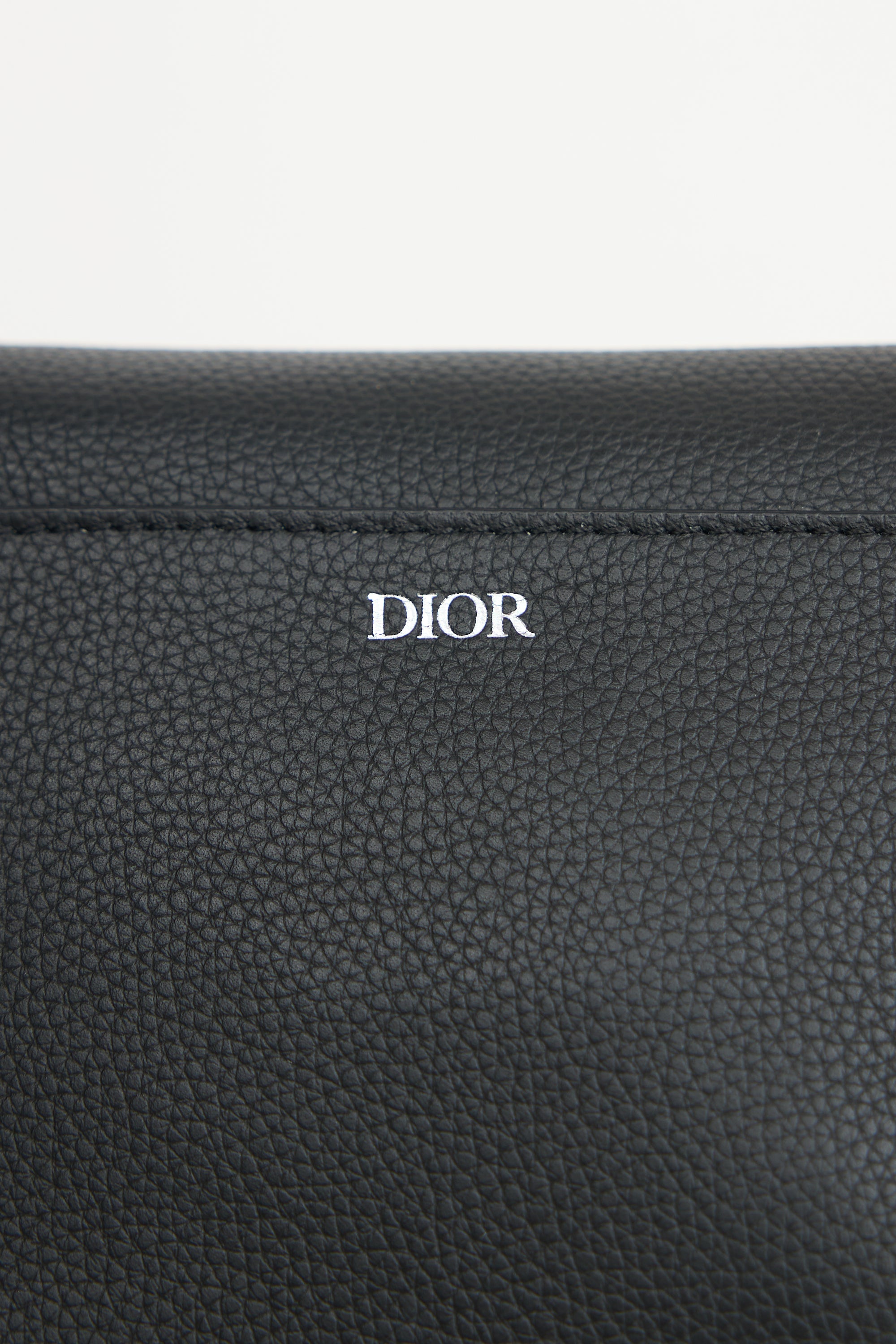Pre-owned Christian Dior black grained leather Saddle Pouch bag featuring adjustable black logo webbing shoulder strap, silver tone hardware, flap pocket at face with zip closure, flap with snap closure, and black canvas lined main compartment.
