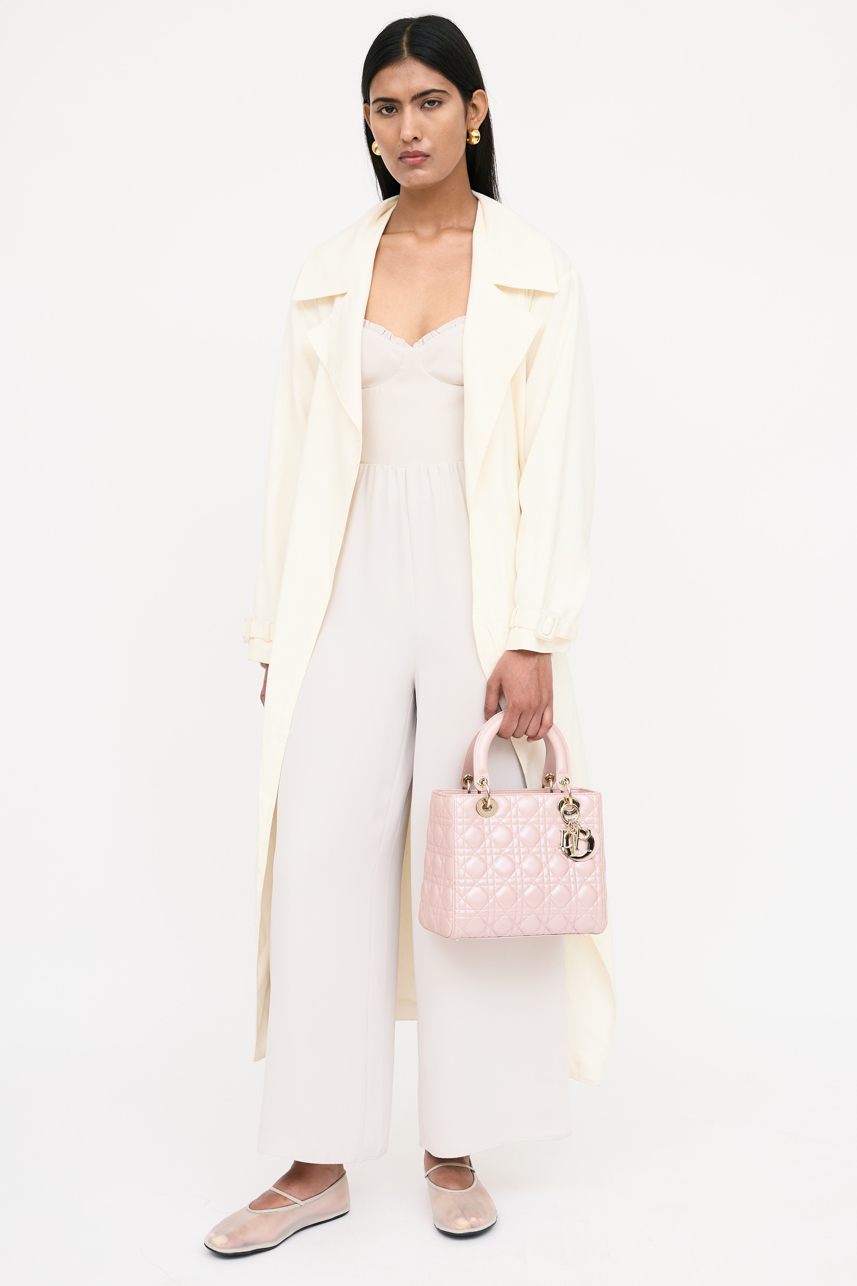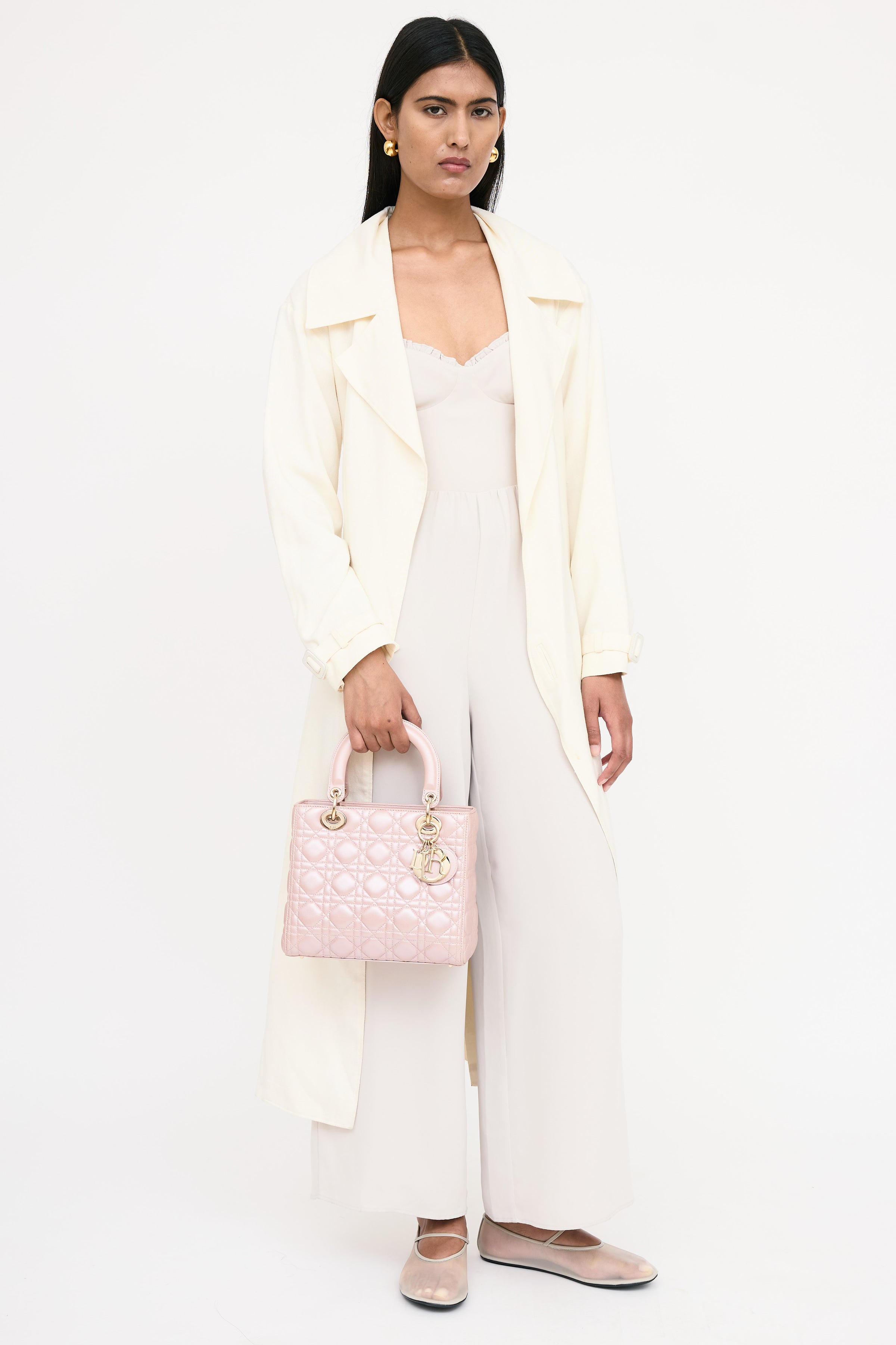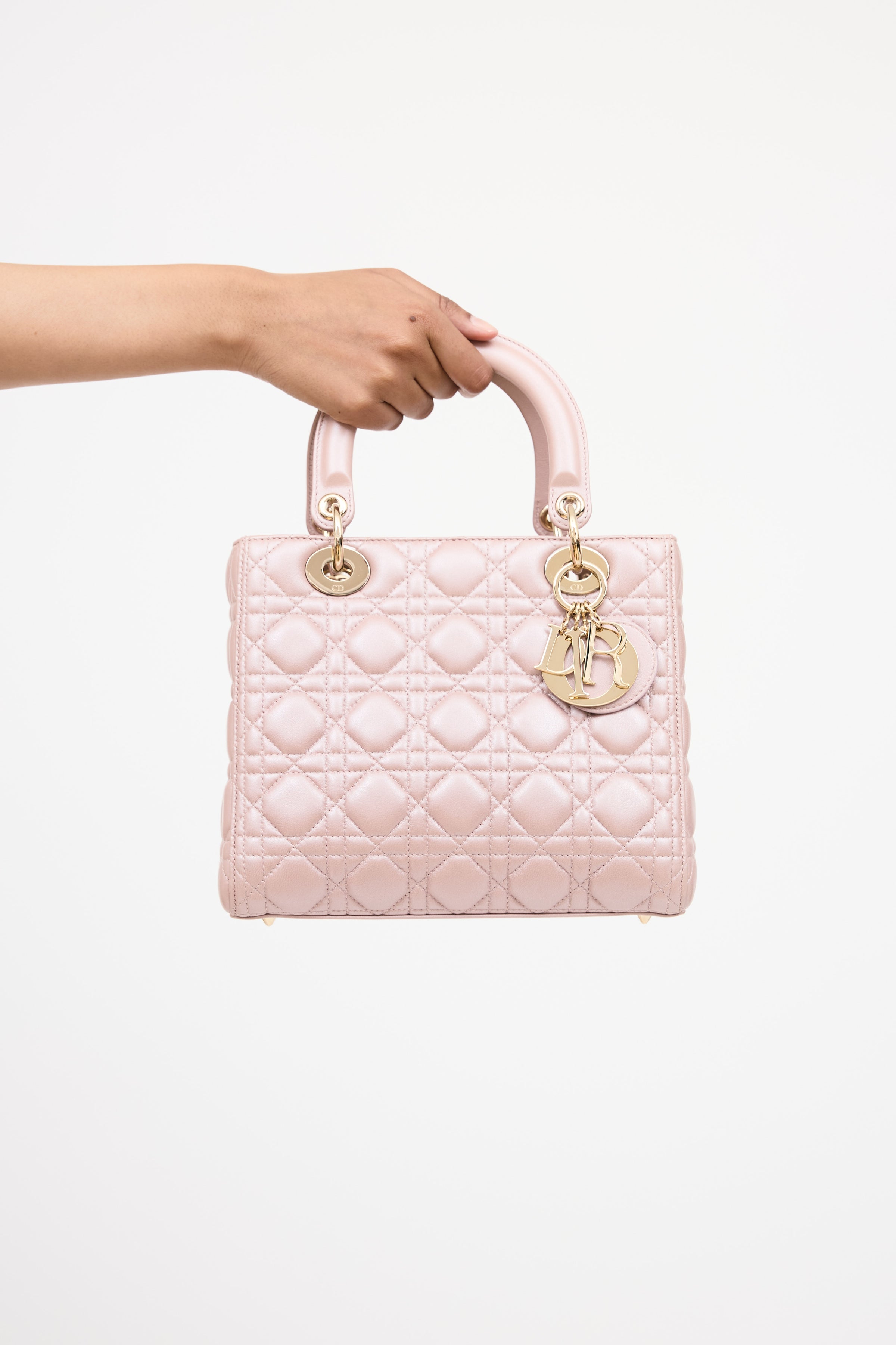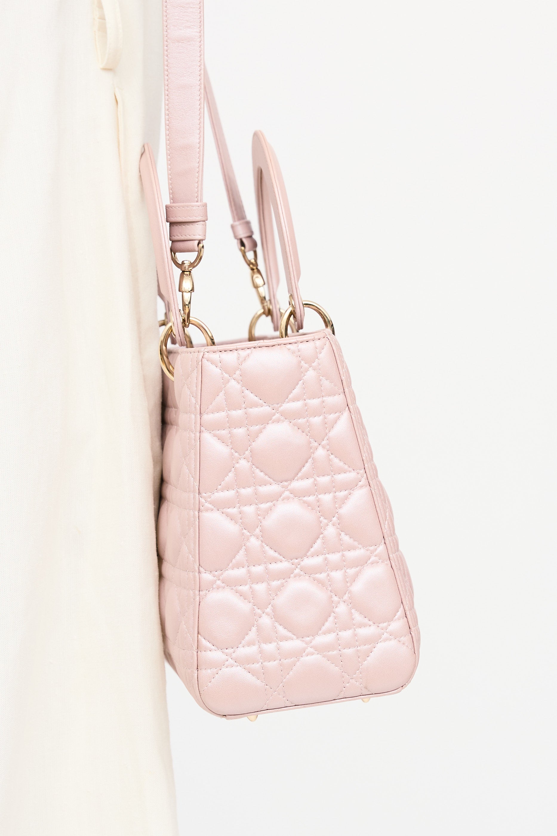 Pre-owned Dior pearlescent pink medium Lady Dior bag featuring signature Cannage quilted leather, gold tone hardware, top zip closure, dual flat top handles, logo charm at front, detachable adjustable shoulder strap, one main compartment with one zip pocket, and protective feet at base.