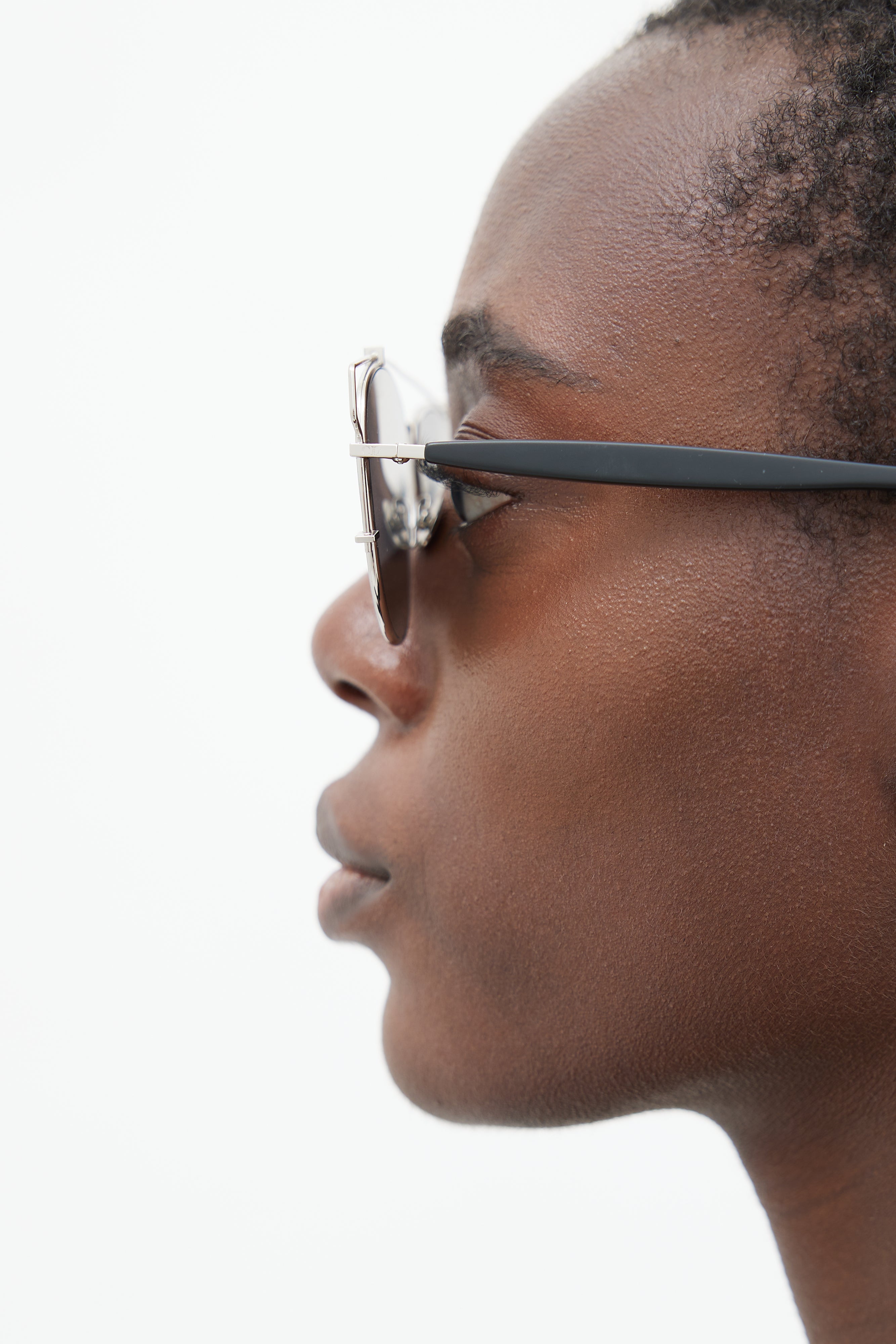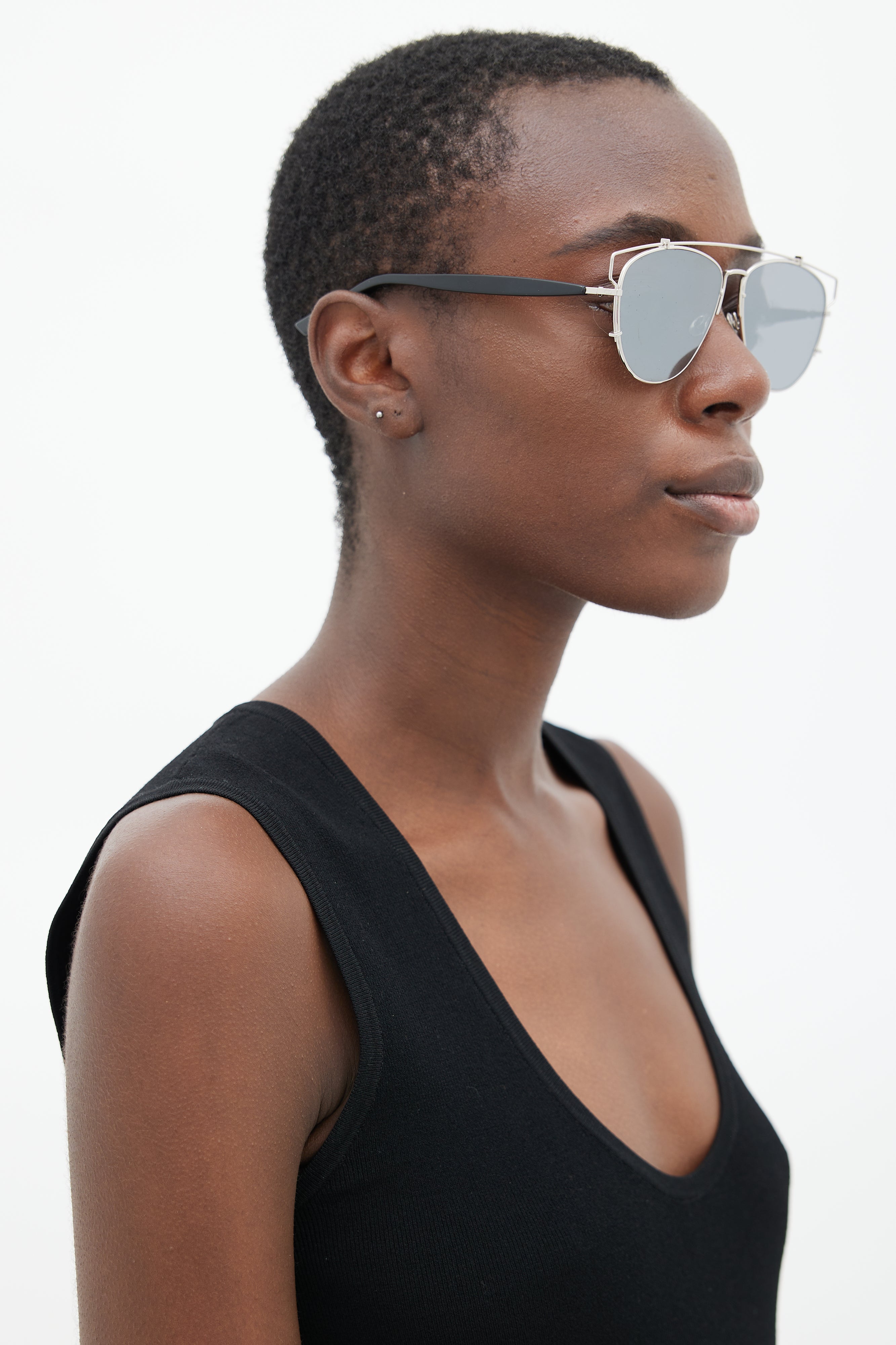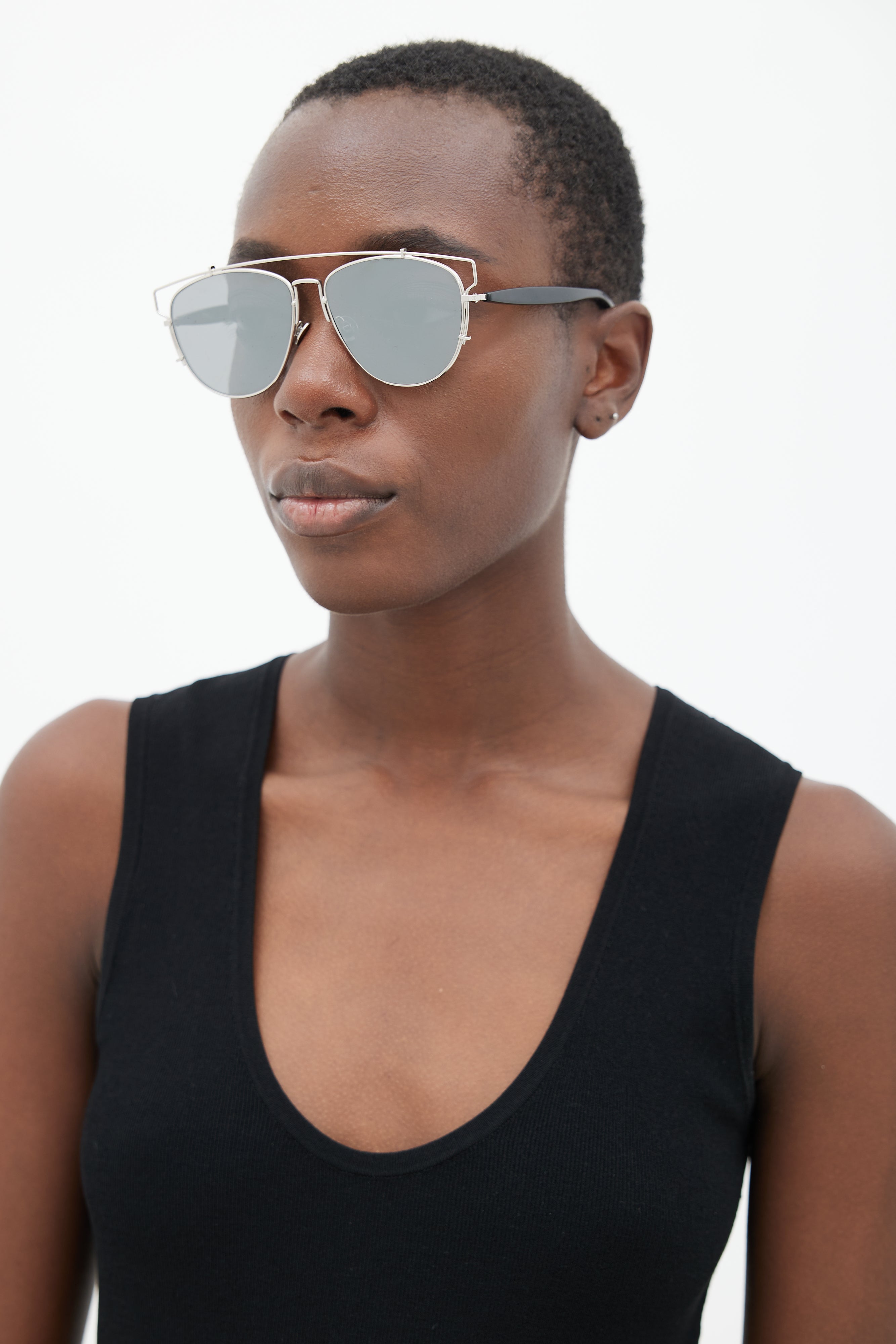Pre-owned Dior black and silver DiorTechnologic 84J0T sunglasses featuring aviator frame, silver tone hardware, brow bar, nose pads, and silver lens. Comes with original box and case.