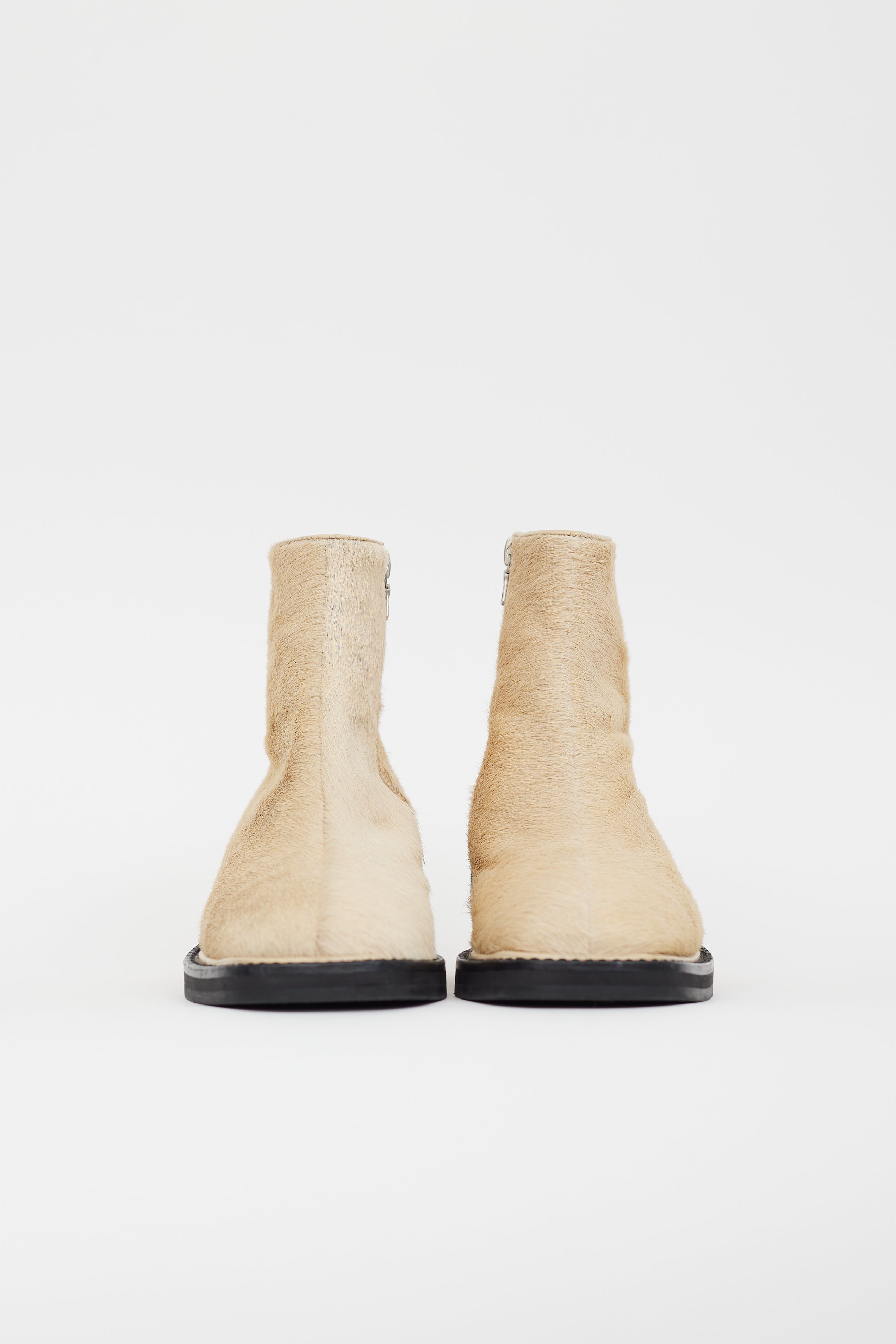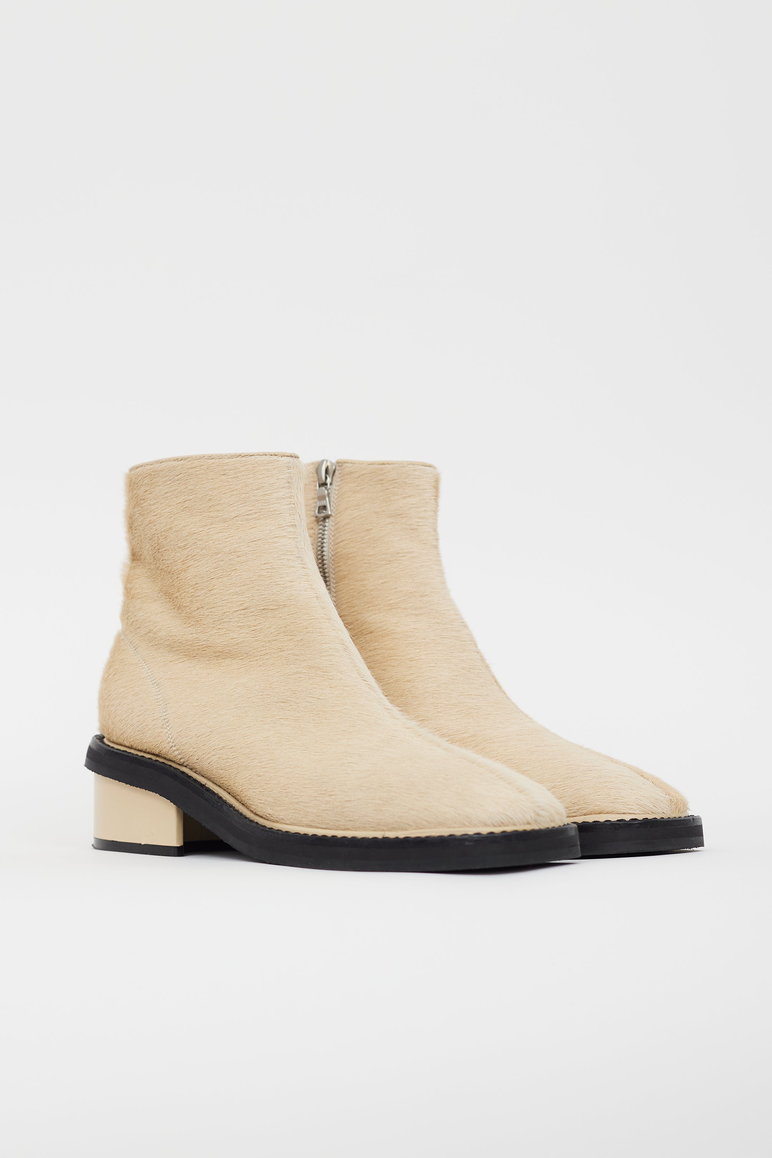 Pre-owned Dries Van Noten beige ponyhair ankle boots featuring square toe, black midsole, silver tone zip closure at side, abstract shaped block heel, and leather insoles.