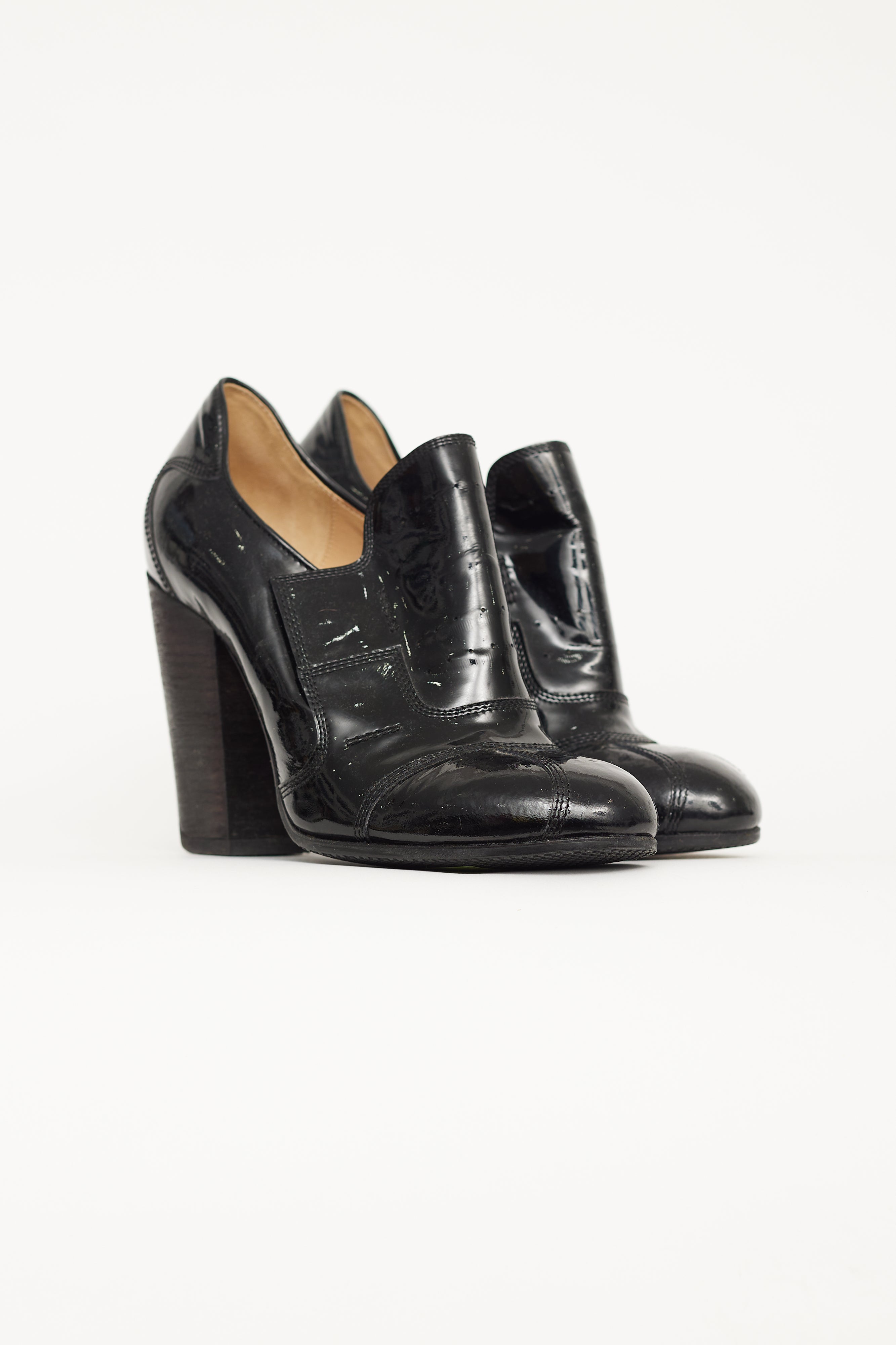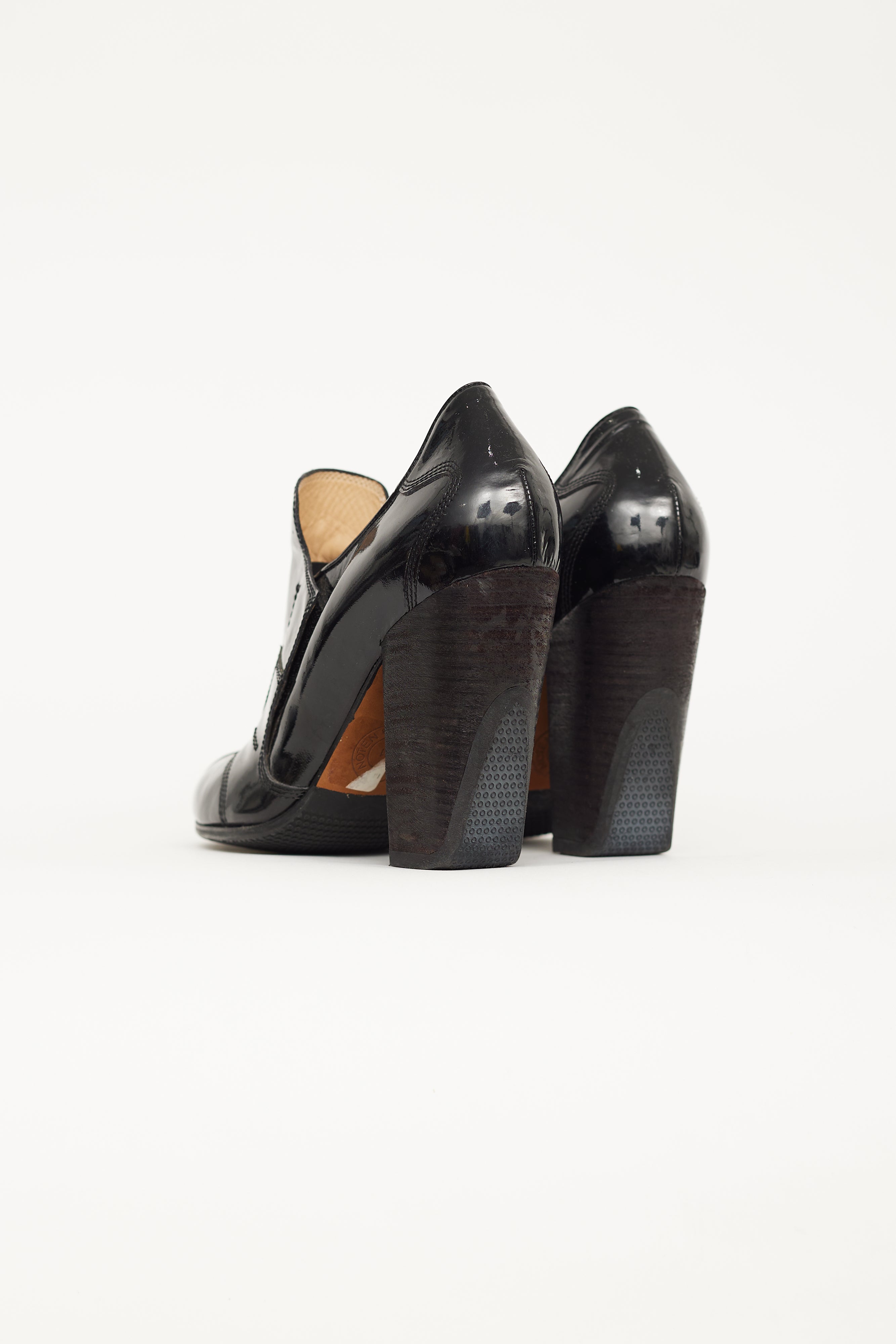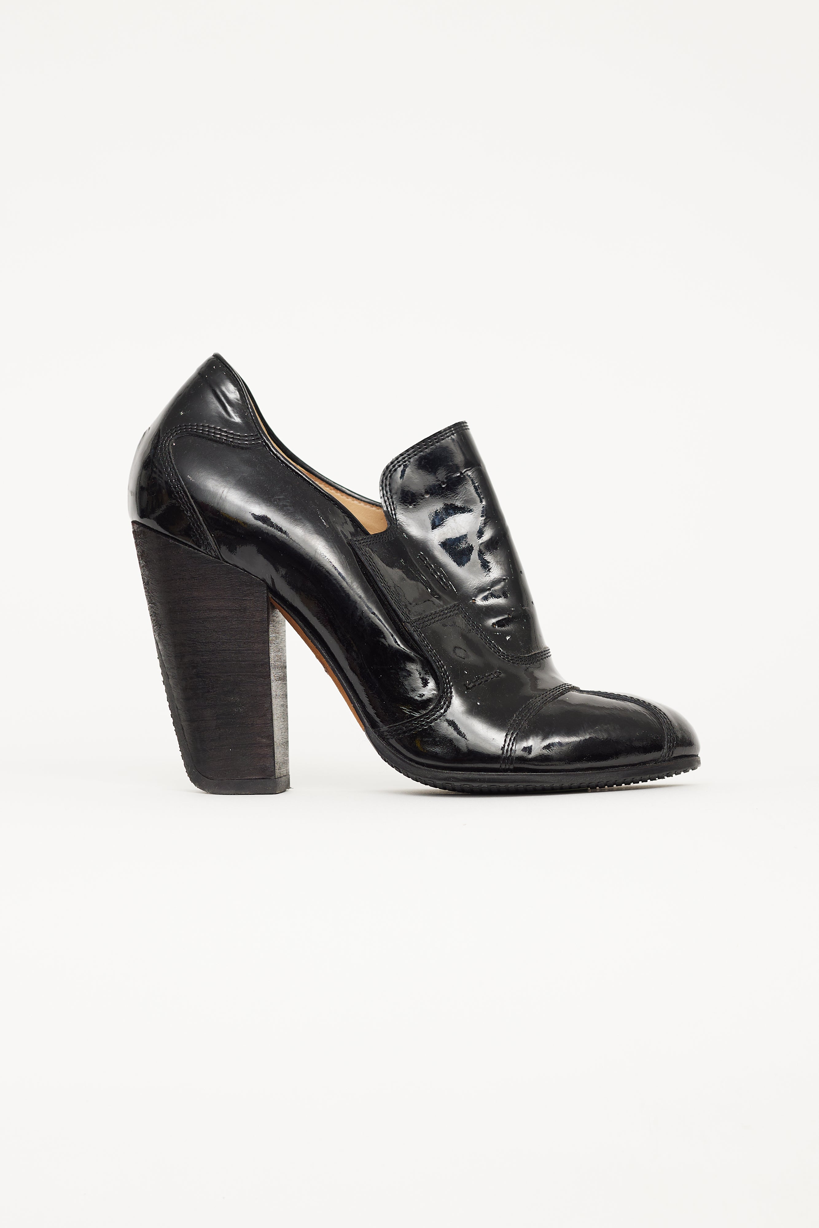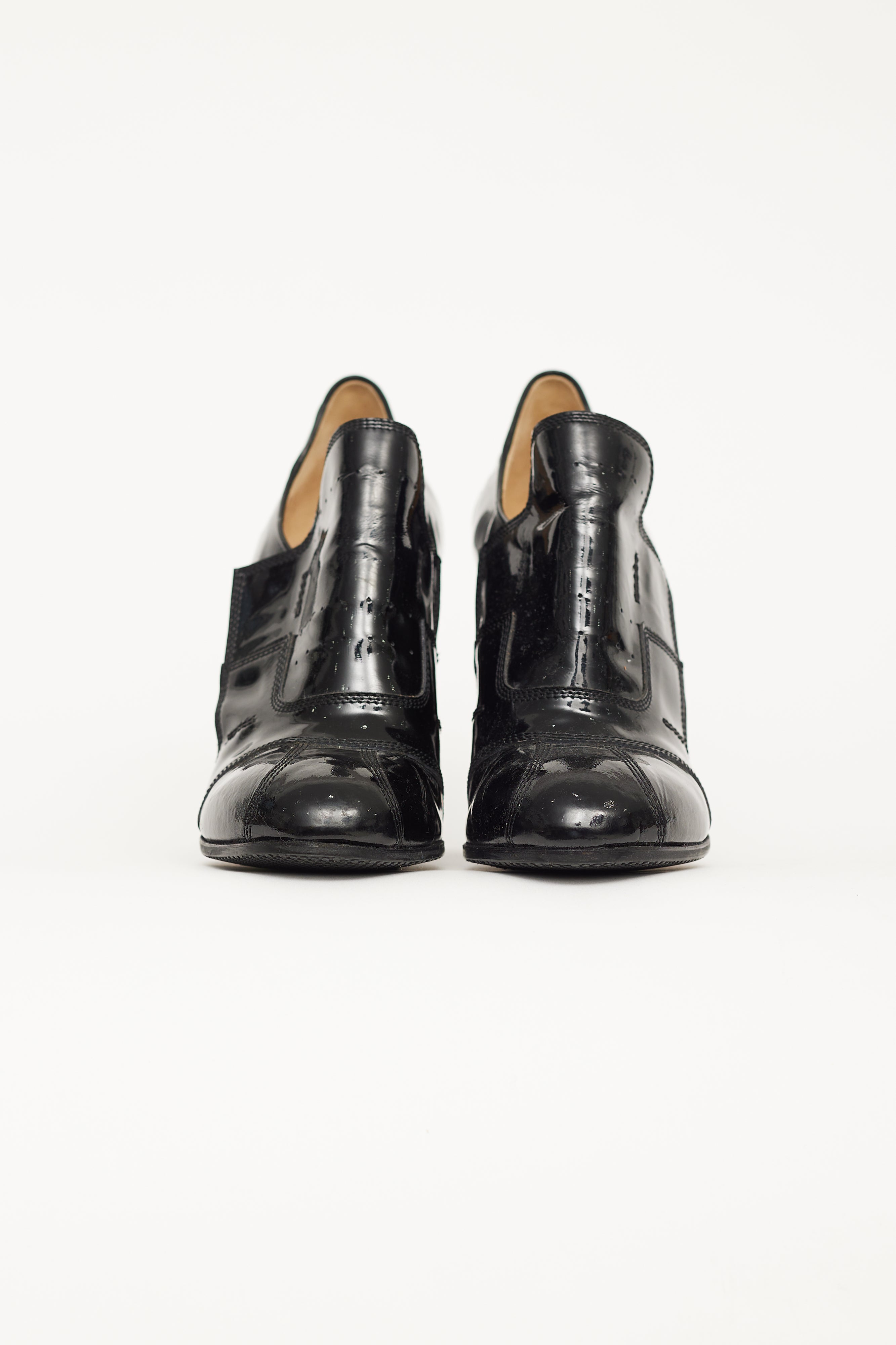 Pre-owned Dries Van Noten black patent pump boots featuring high block heel, velcro strap, contrast stitching throughout, round toe, and leather insoles.
