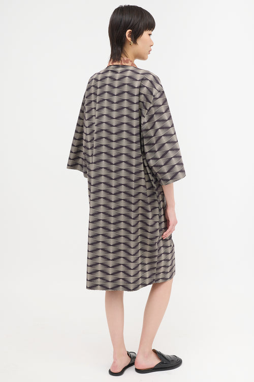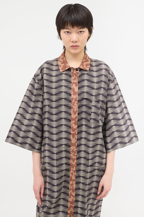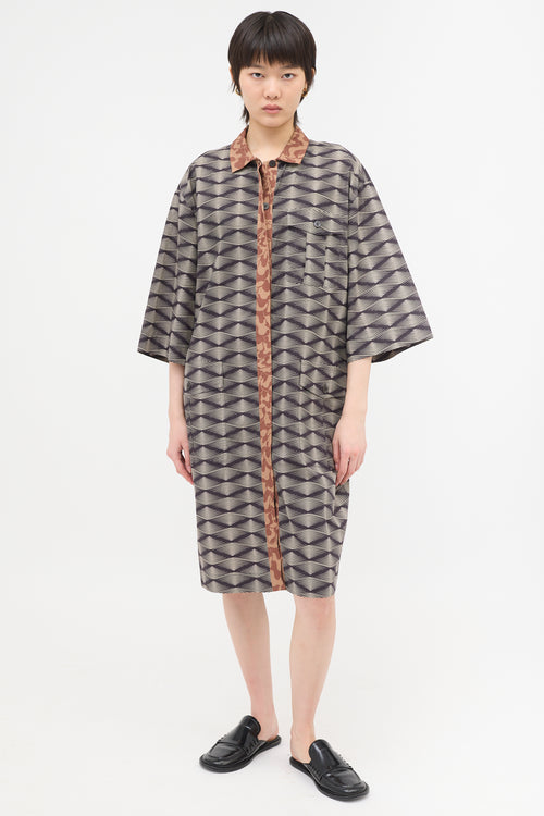 Pre-owned Dries Van Noten brown shirt dress featuring an abstract print throughout, point collar, concealed button up front, three buttoned flap pockets, and wide half sleeves.