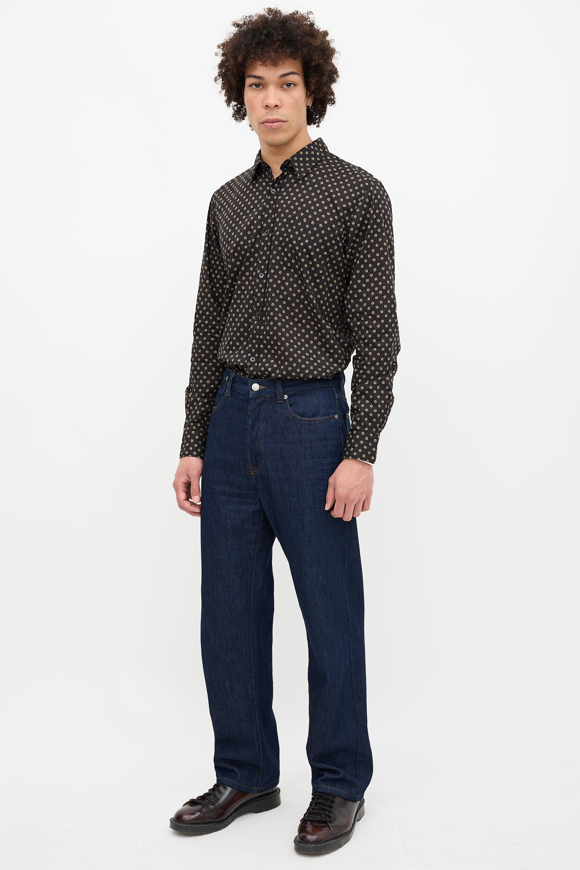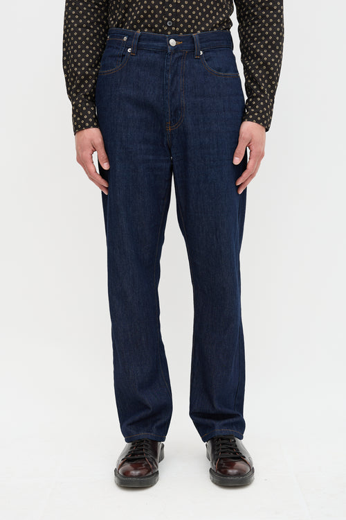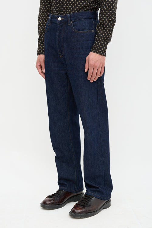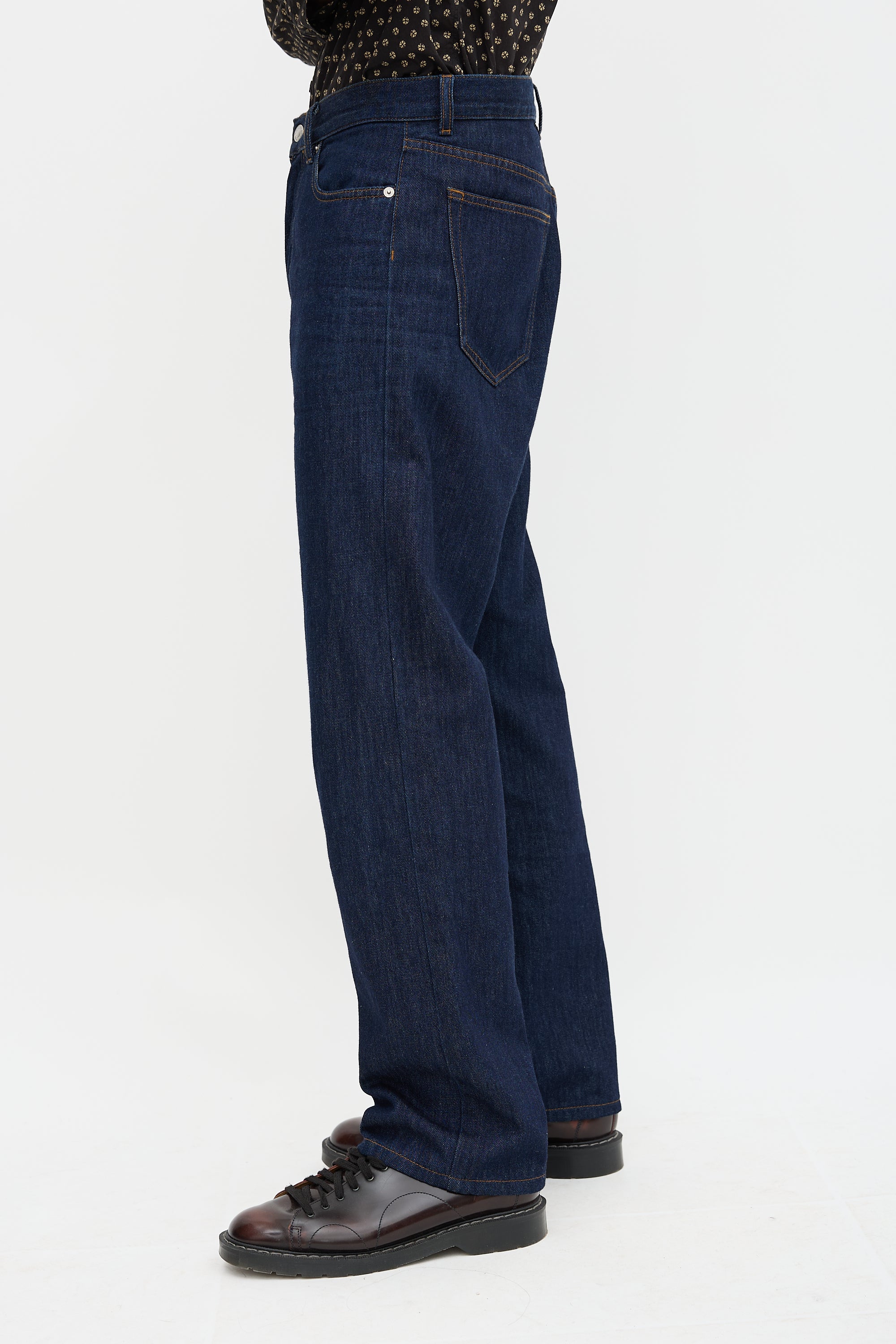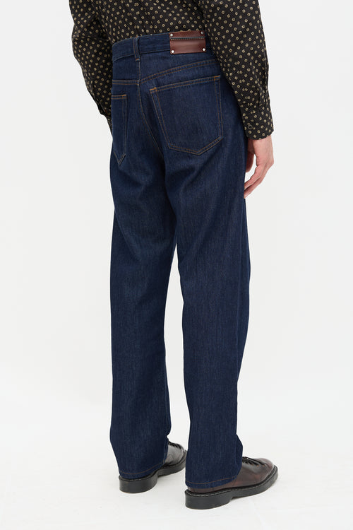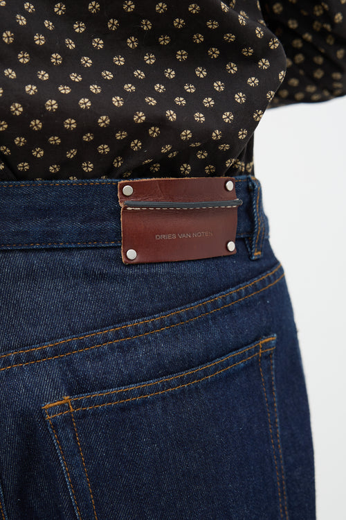 Pre-owned Dries Van Noten dark wash jeans featuring mid rise, belt loops, button fly, five pocket styling, and a straight leg. Clipped to fit model.