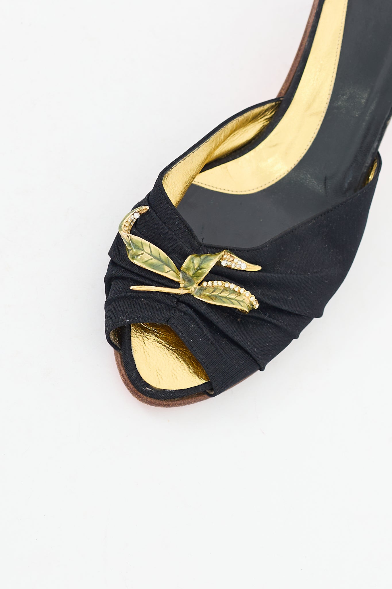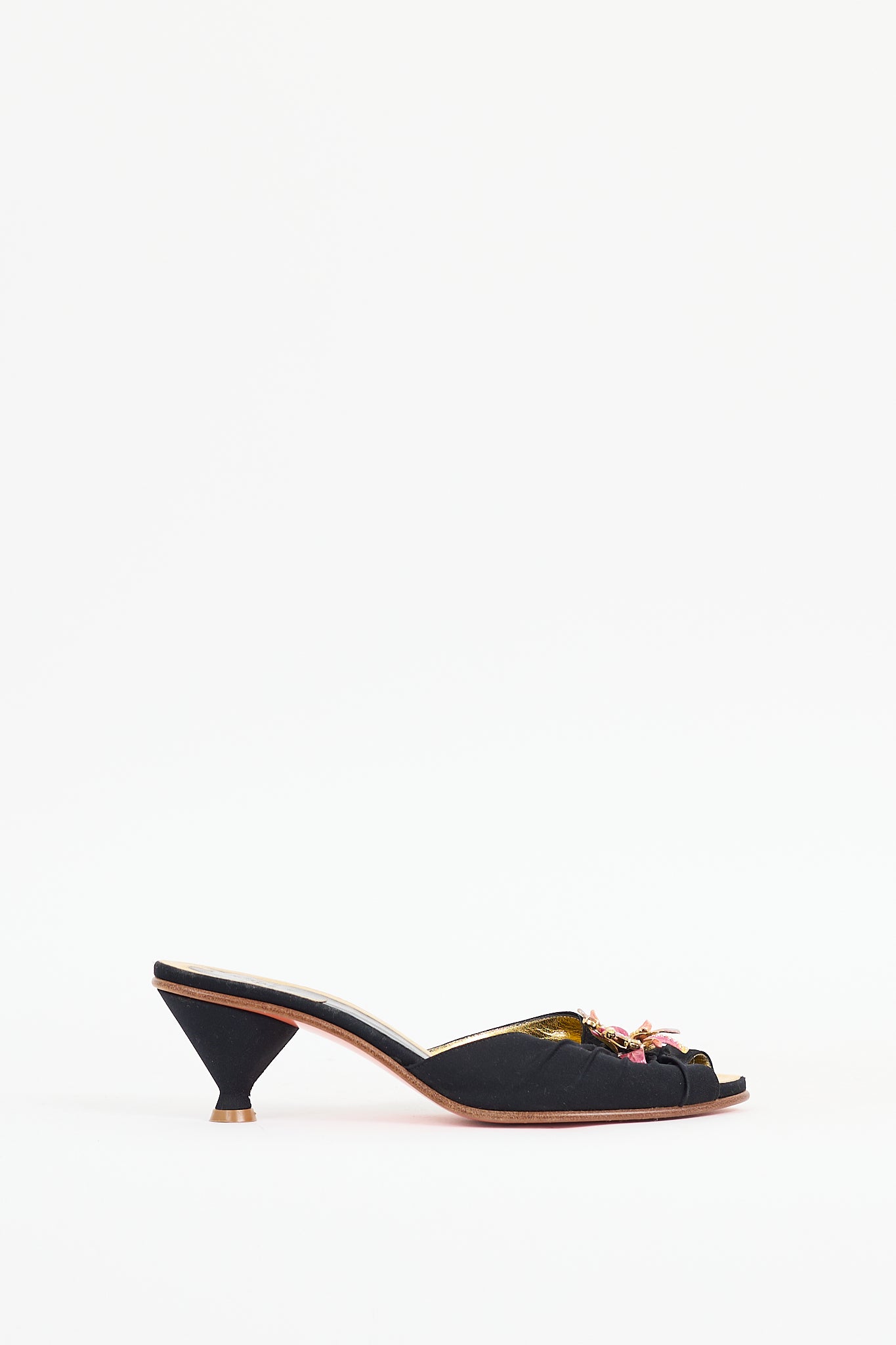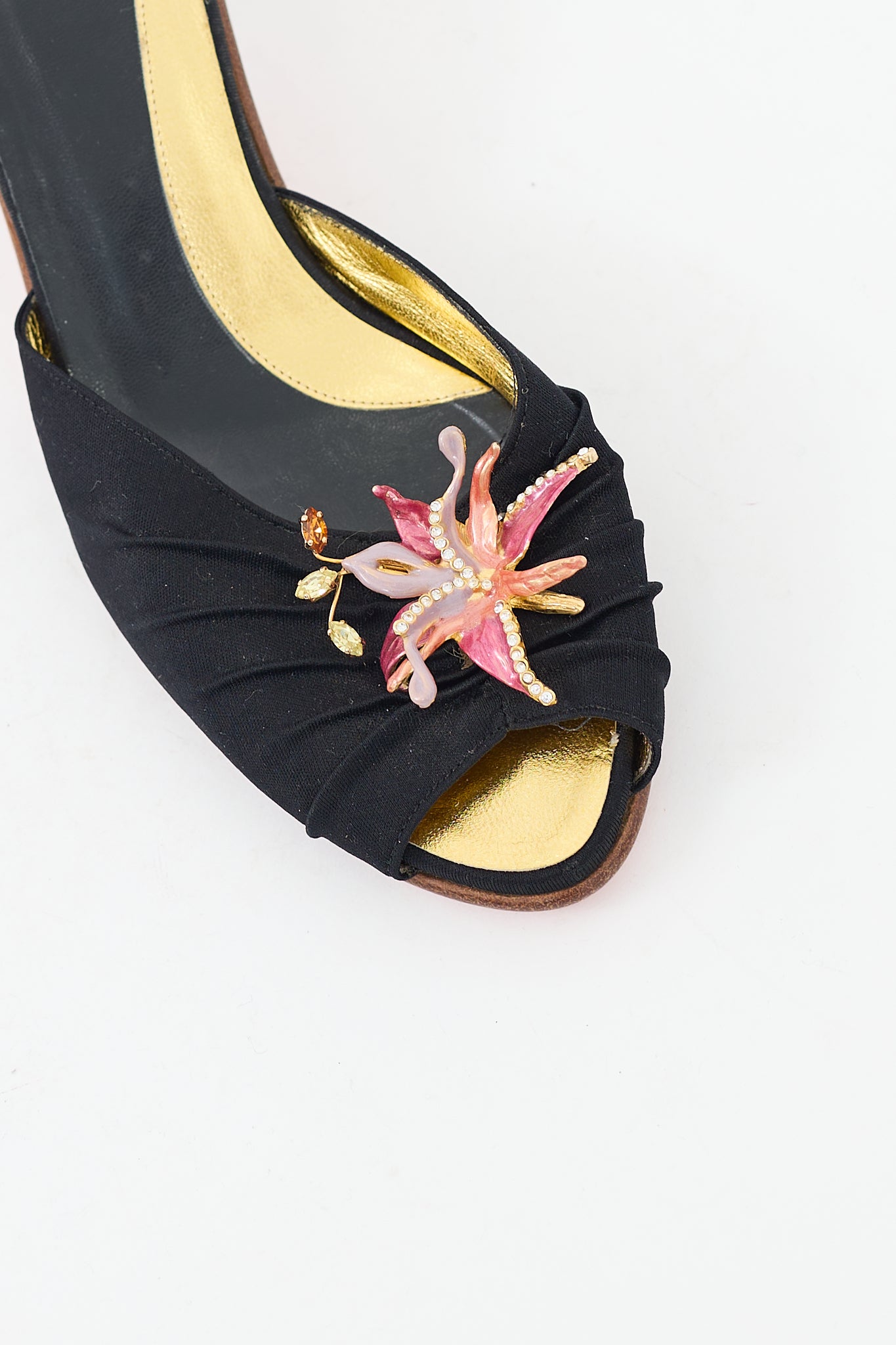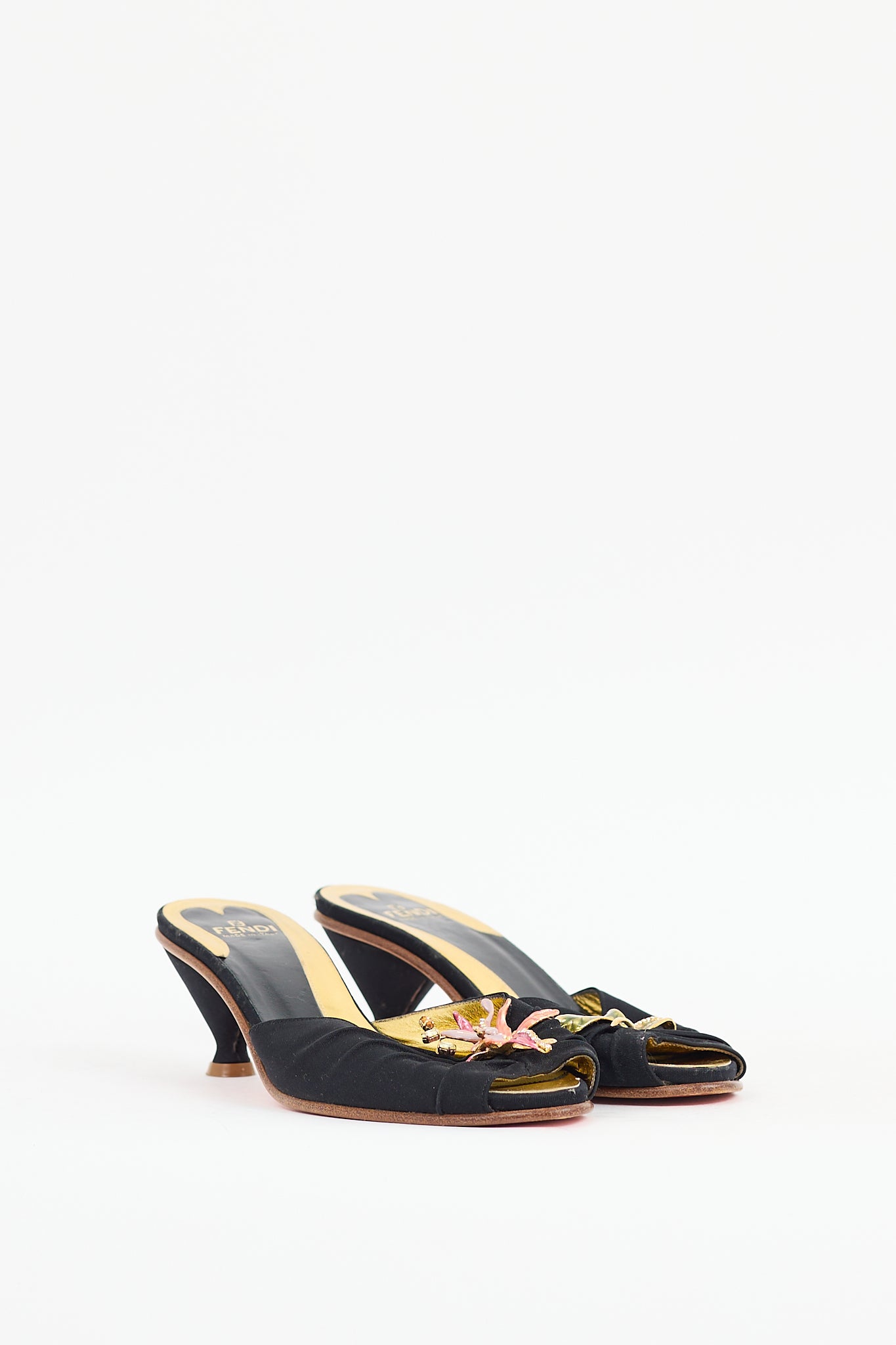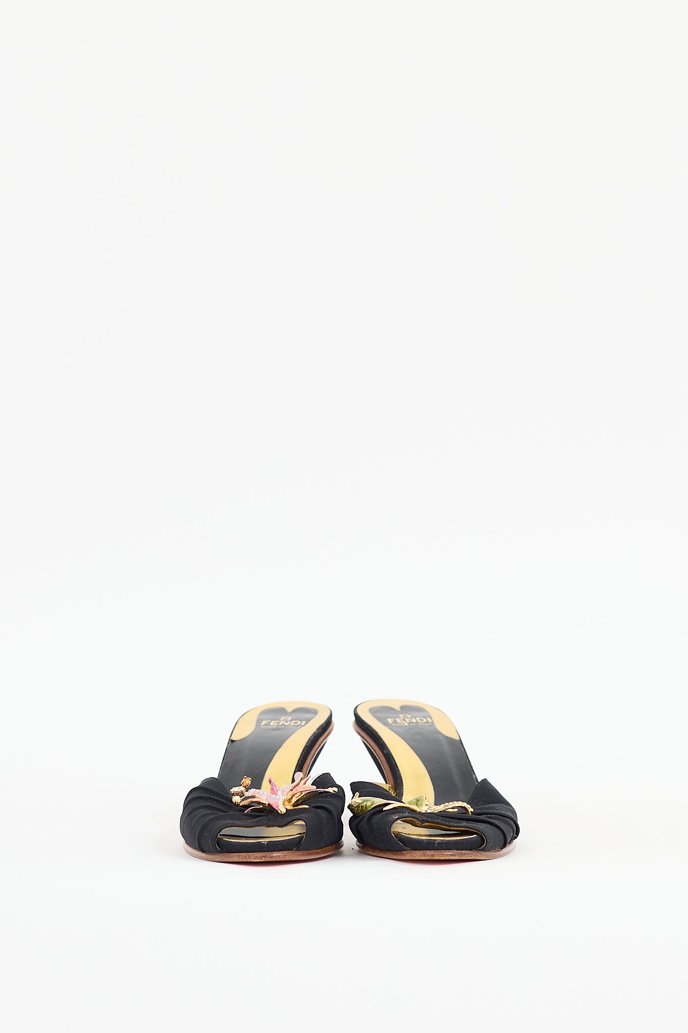 Pre-owned Fendi black satin mules featuring a peep toe, gathered strap at vamp with multicolour jewel floral hardware, wrapped spool heel, and slip on entry.