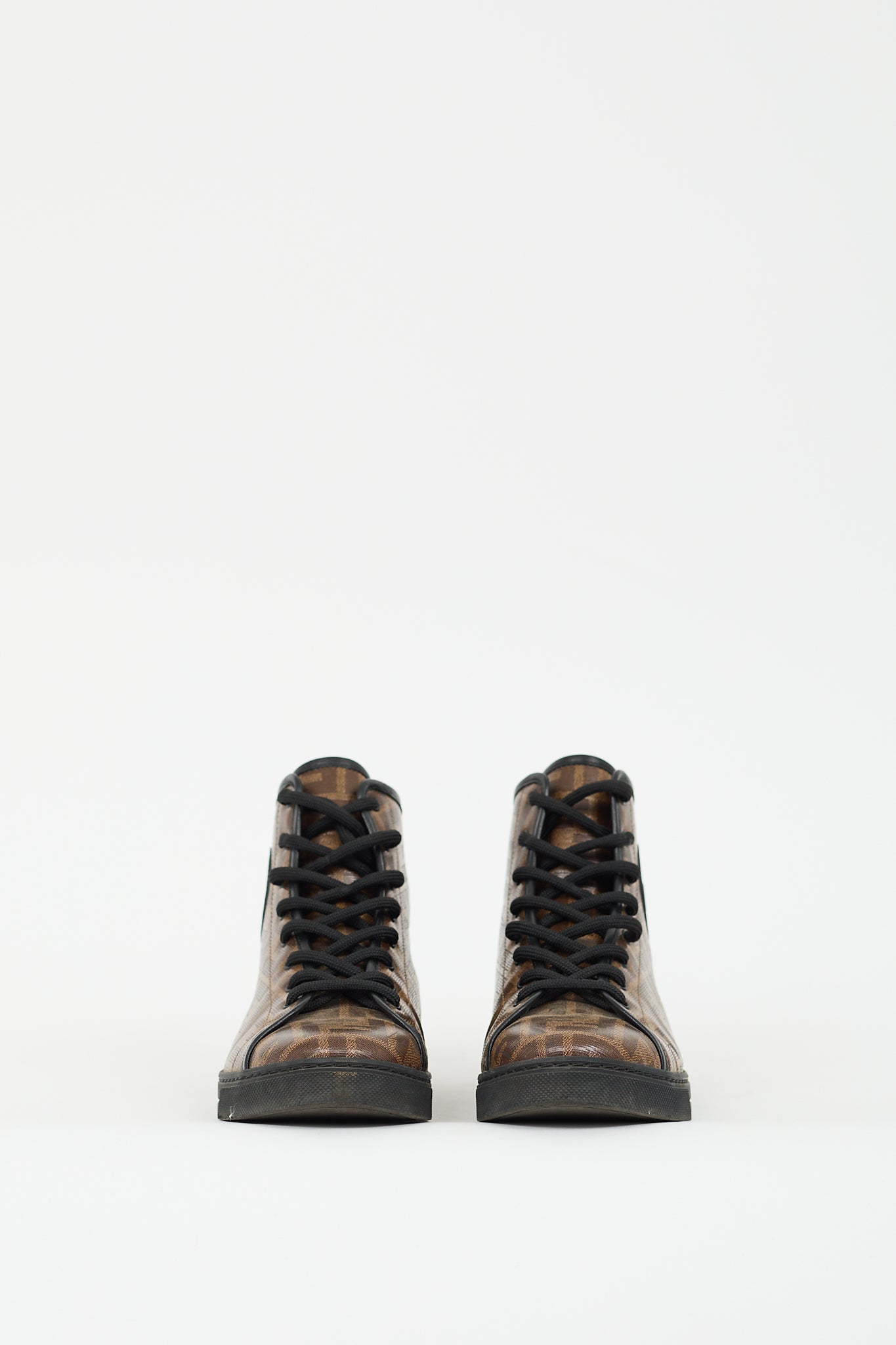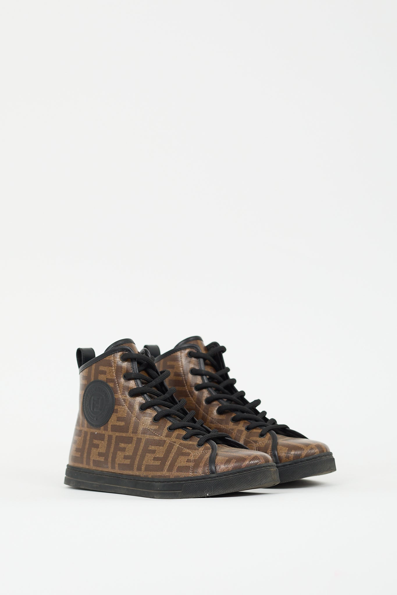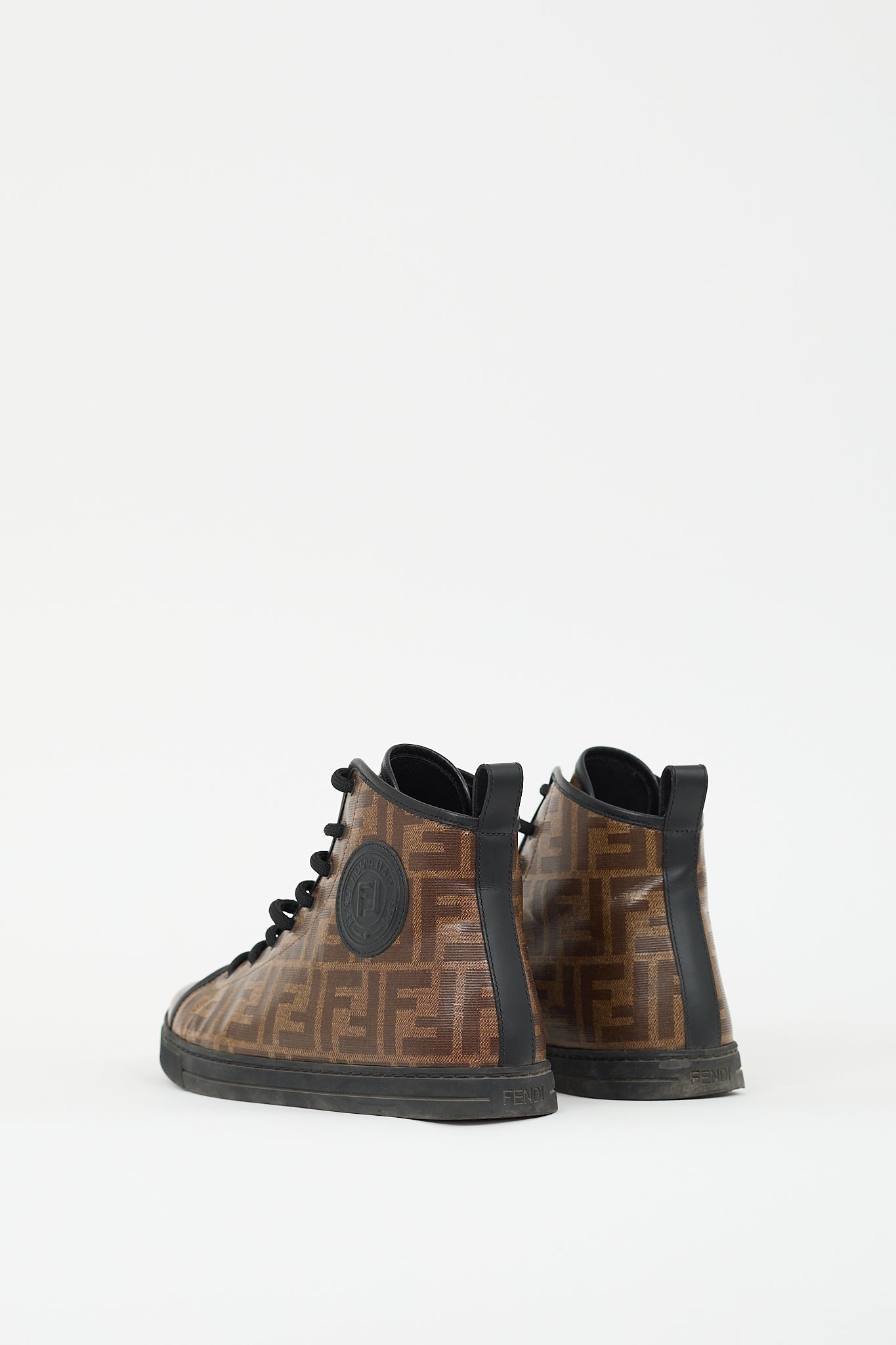 Pre-owned Fendi brown high top sneakers featuring a rounded toe, coated canvas upper, FF Zucca monogram pattern throughout, leather panelling, lace up front, pull tab at counter, black rubber circle logo detail at outer side, and rubber sole with debossed logo at heel. Comes with original box, dust bags, and extra set of shoelaces.