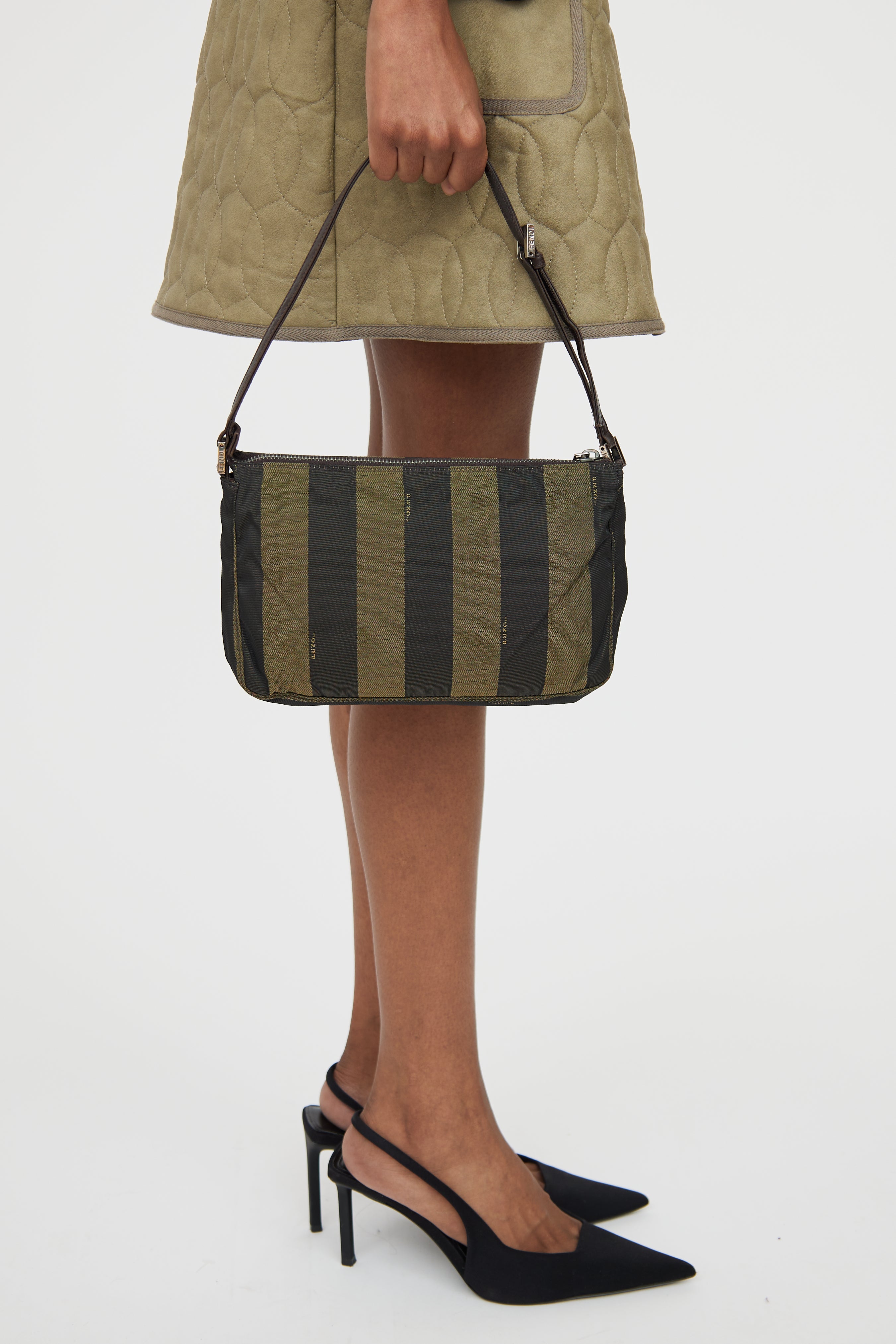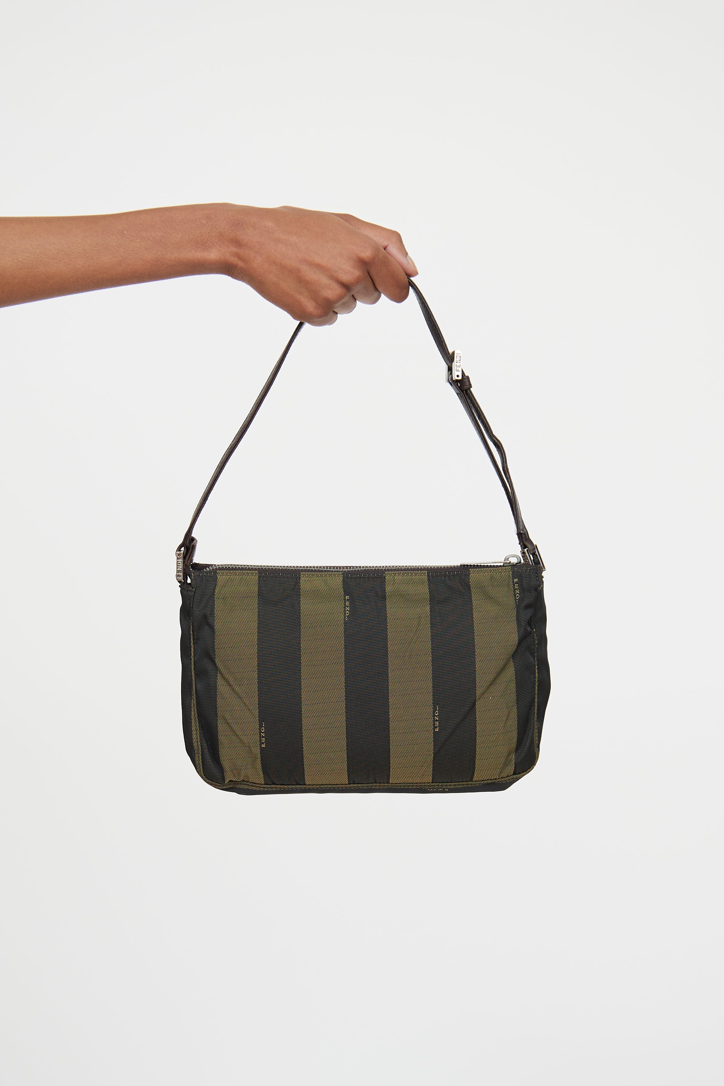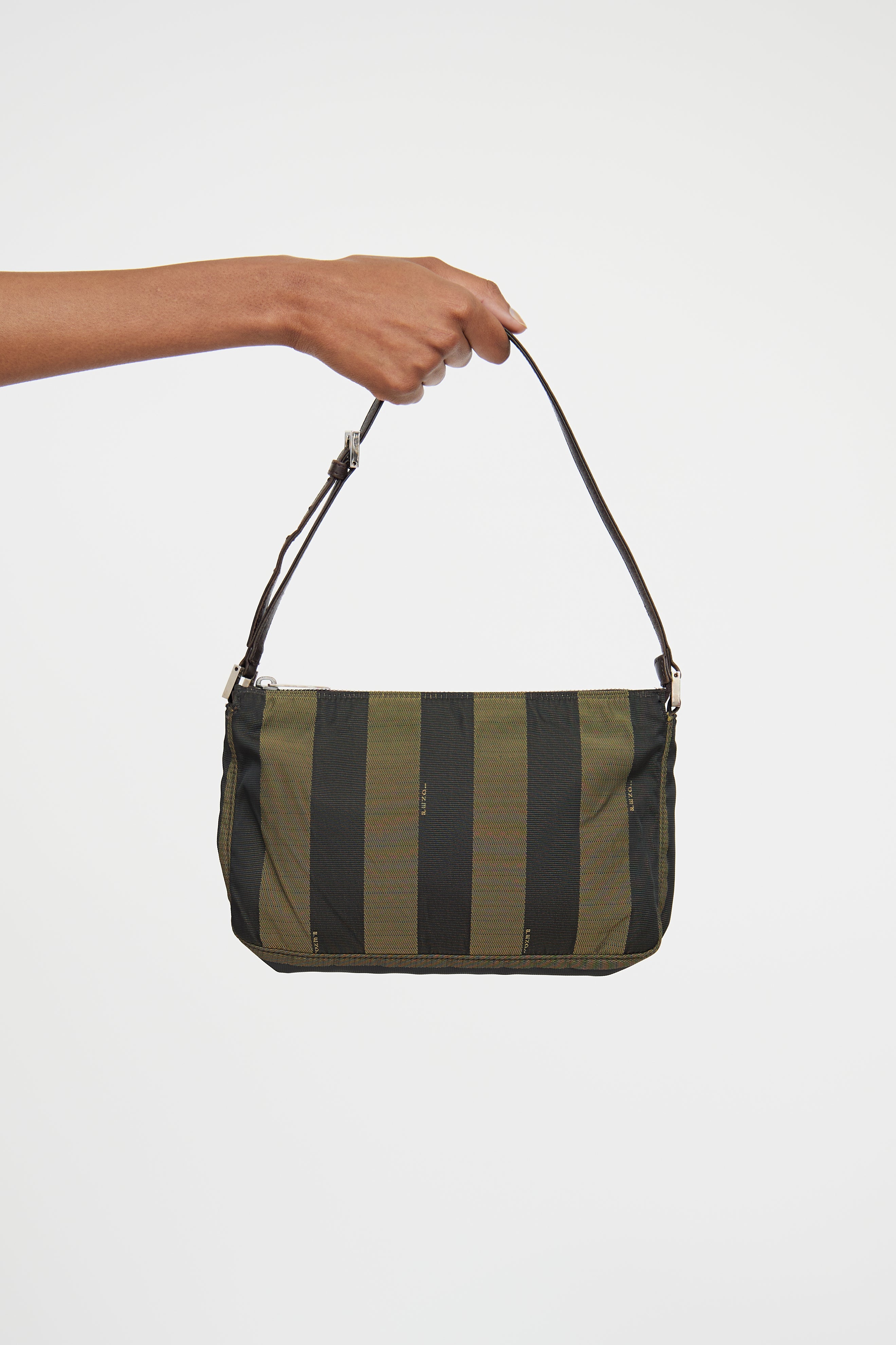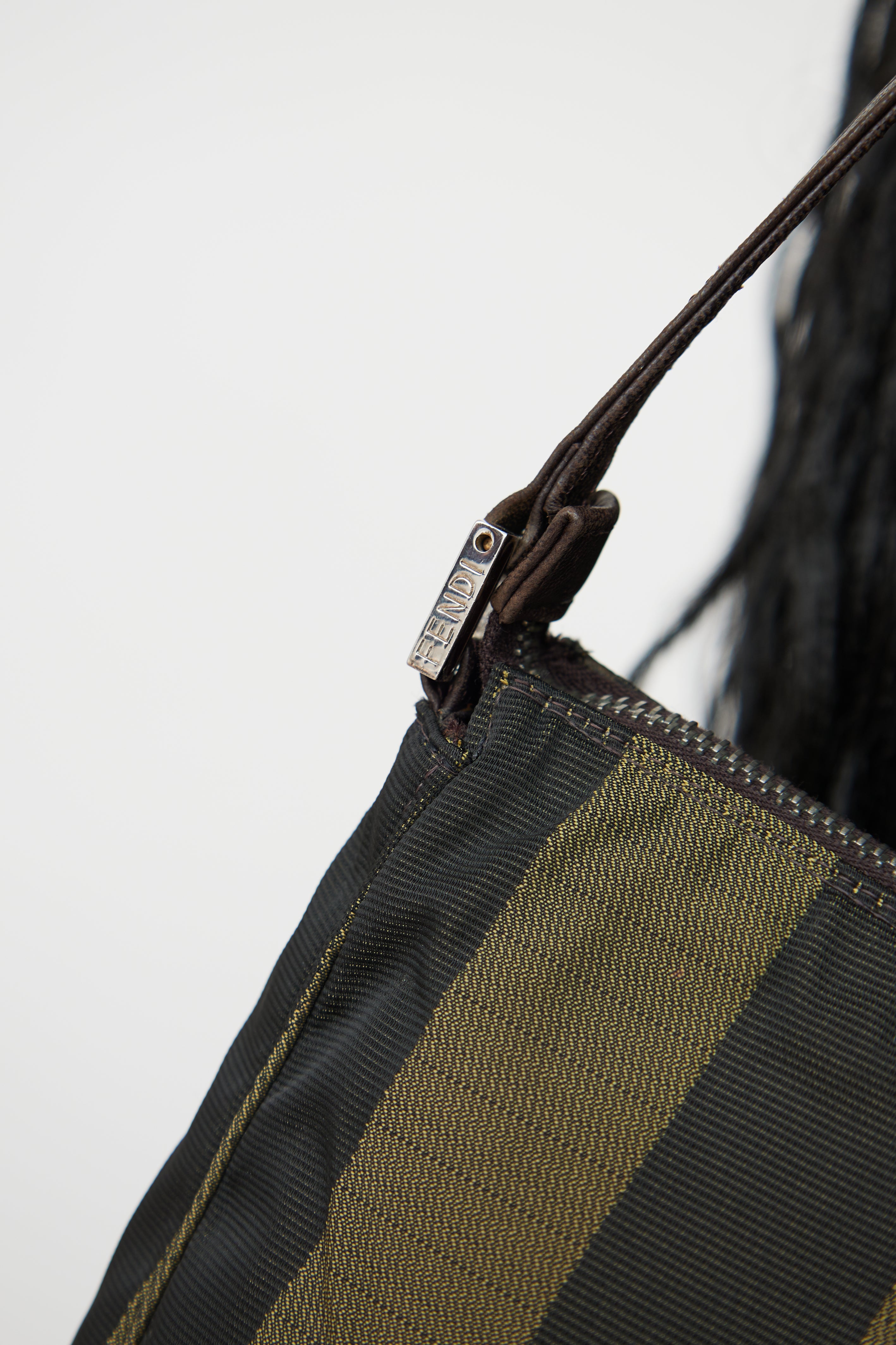 Pre-owned Fendi Pequin canvas shoulder bag featuring green and brown striped canvas exterior, silver tone zip hardware, single canvas lined interior pocket with side zip pocket, brown leather adjustable top handle, silver tone and black enamel logo hardware throughout.