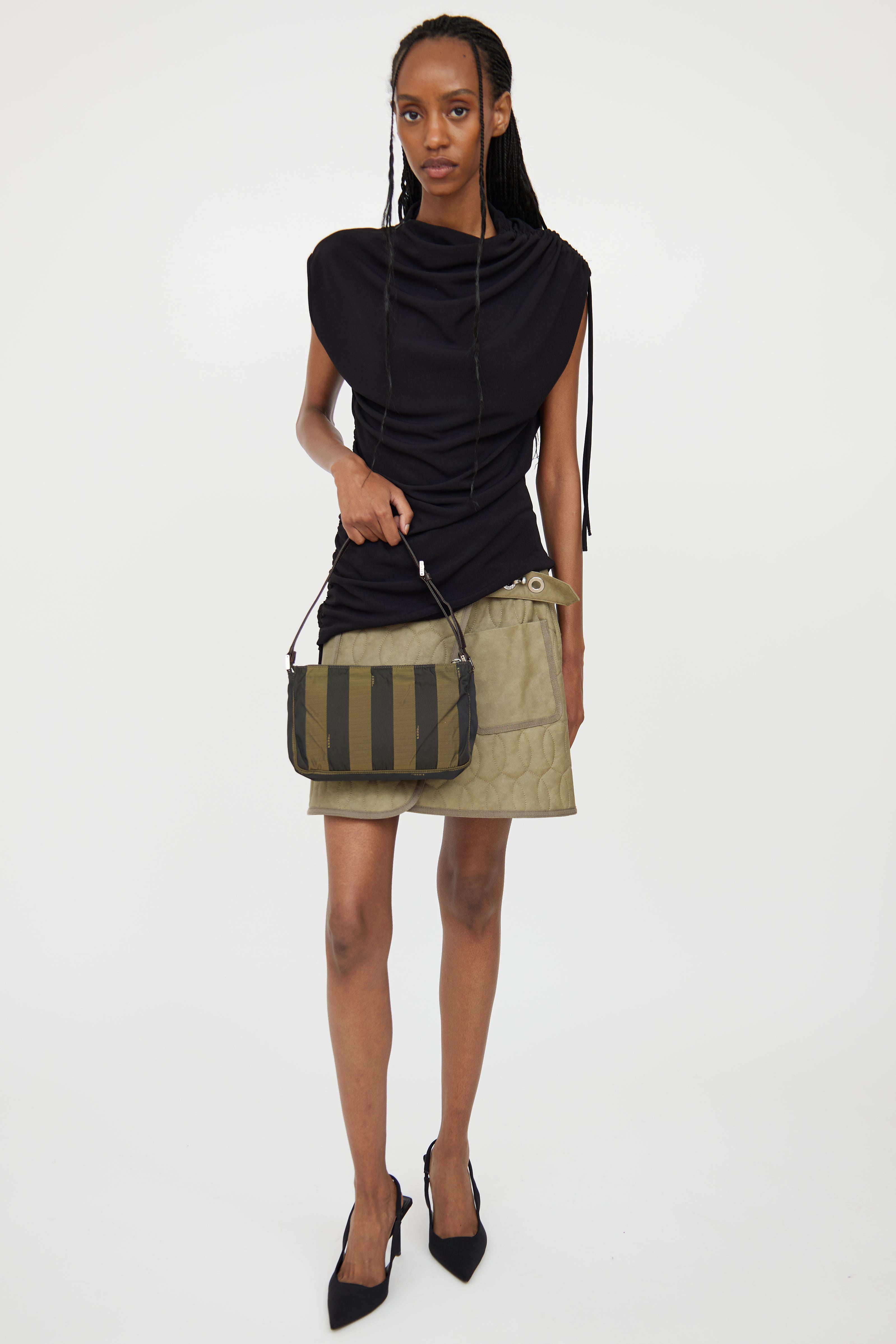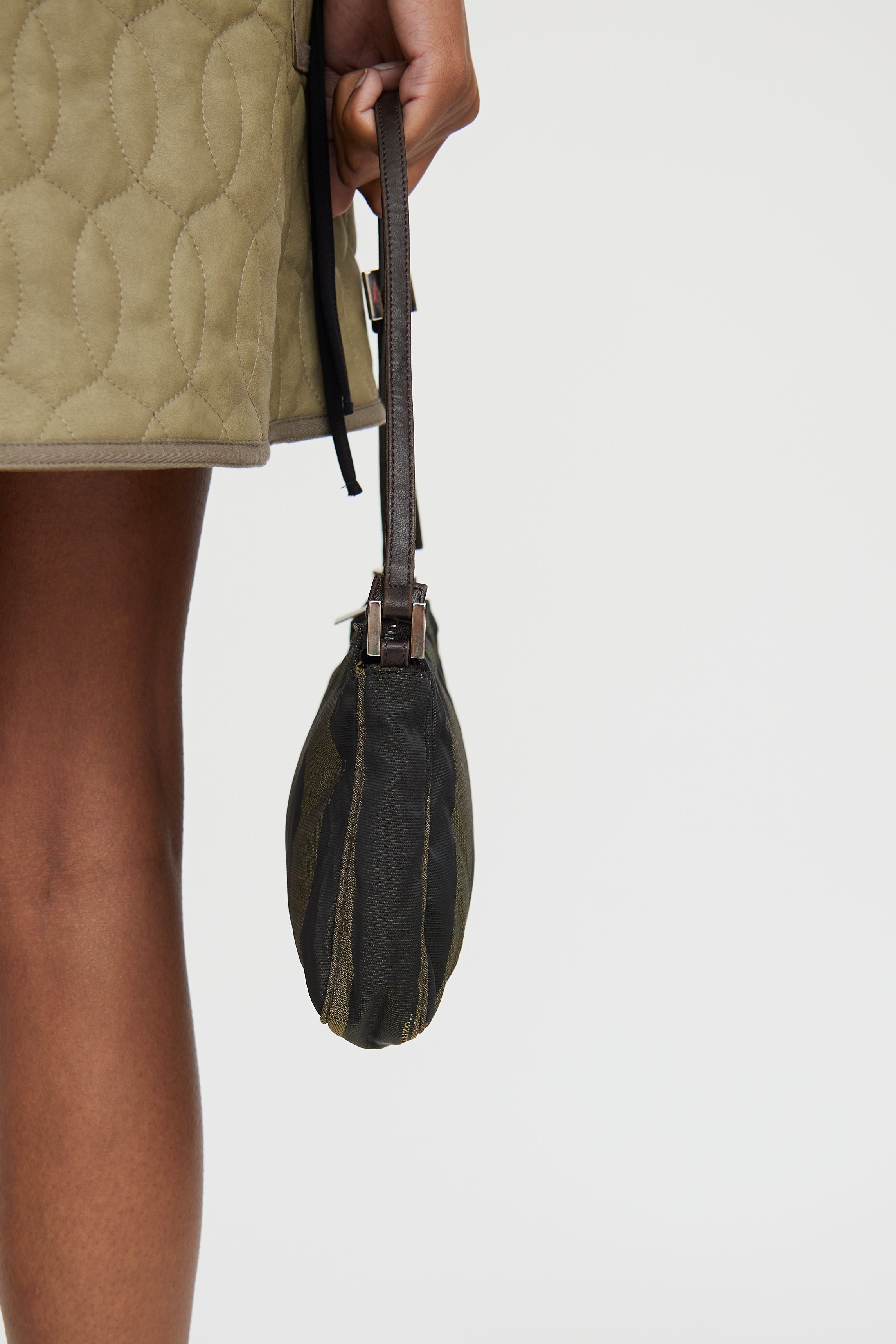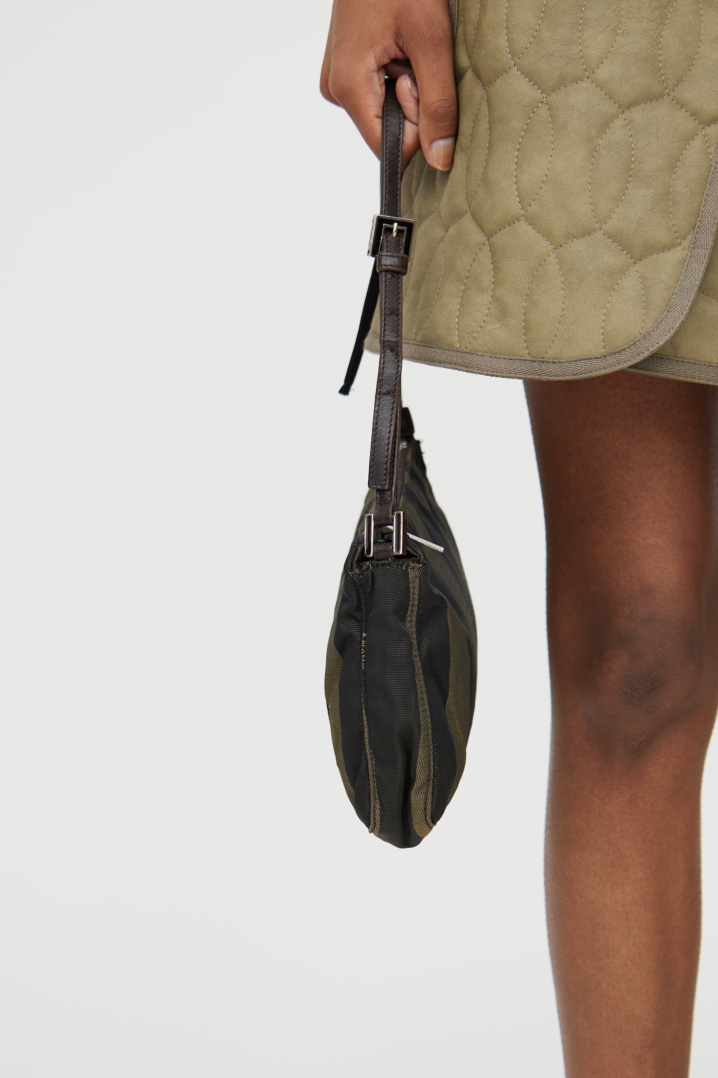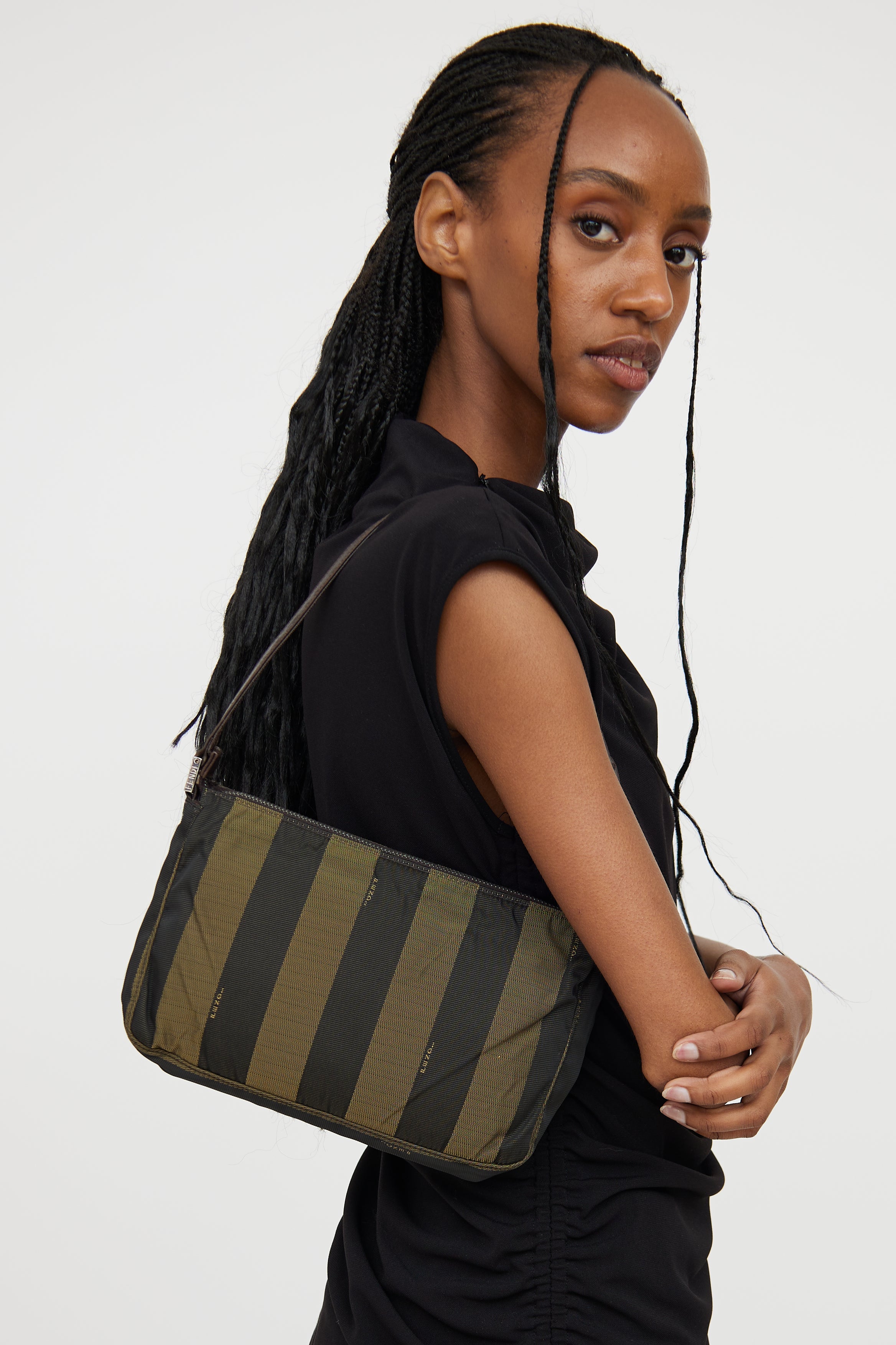 Pre-owned Fendi Pequin canvas shoulder bag featuring green and brown striped canvas exterior, silver tone zip hardware, single canvas lined interior pocket with side zip pocket, brown leather adjustable top handle, silver tone and black enamel logo hardware throughout.