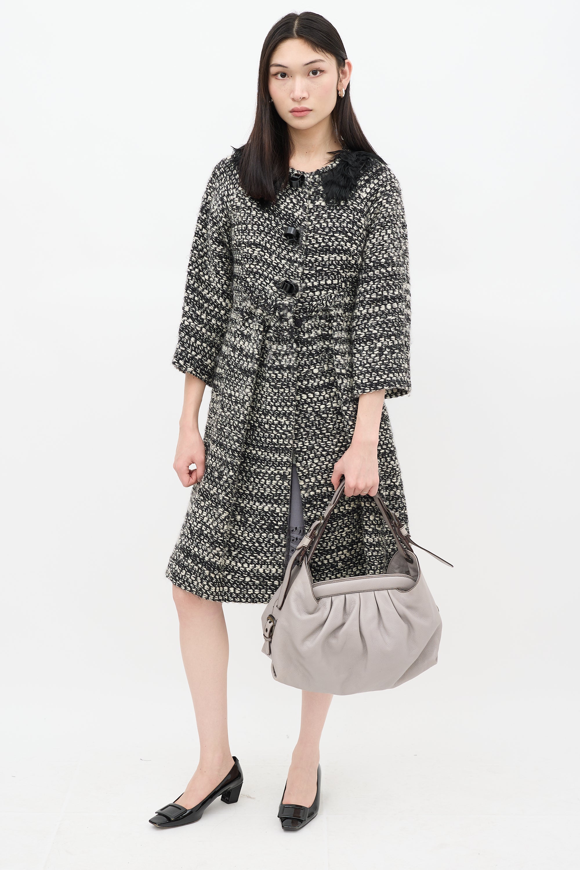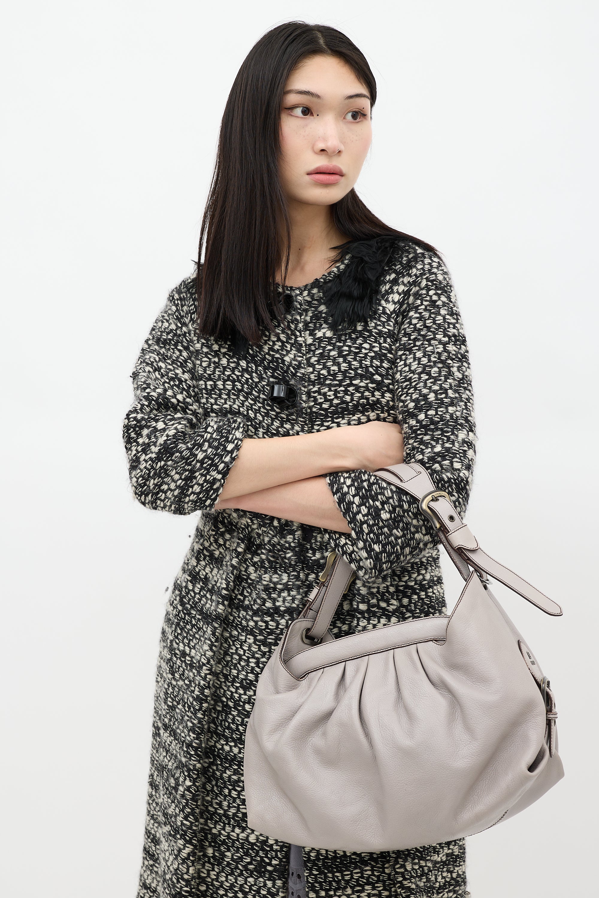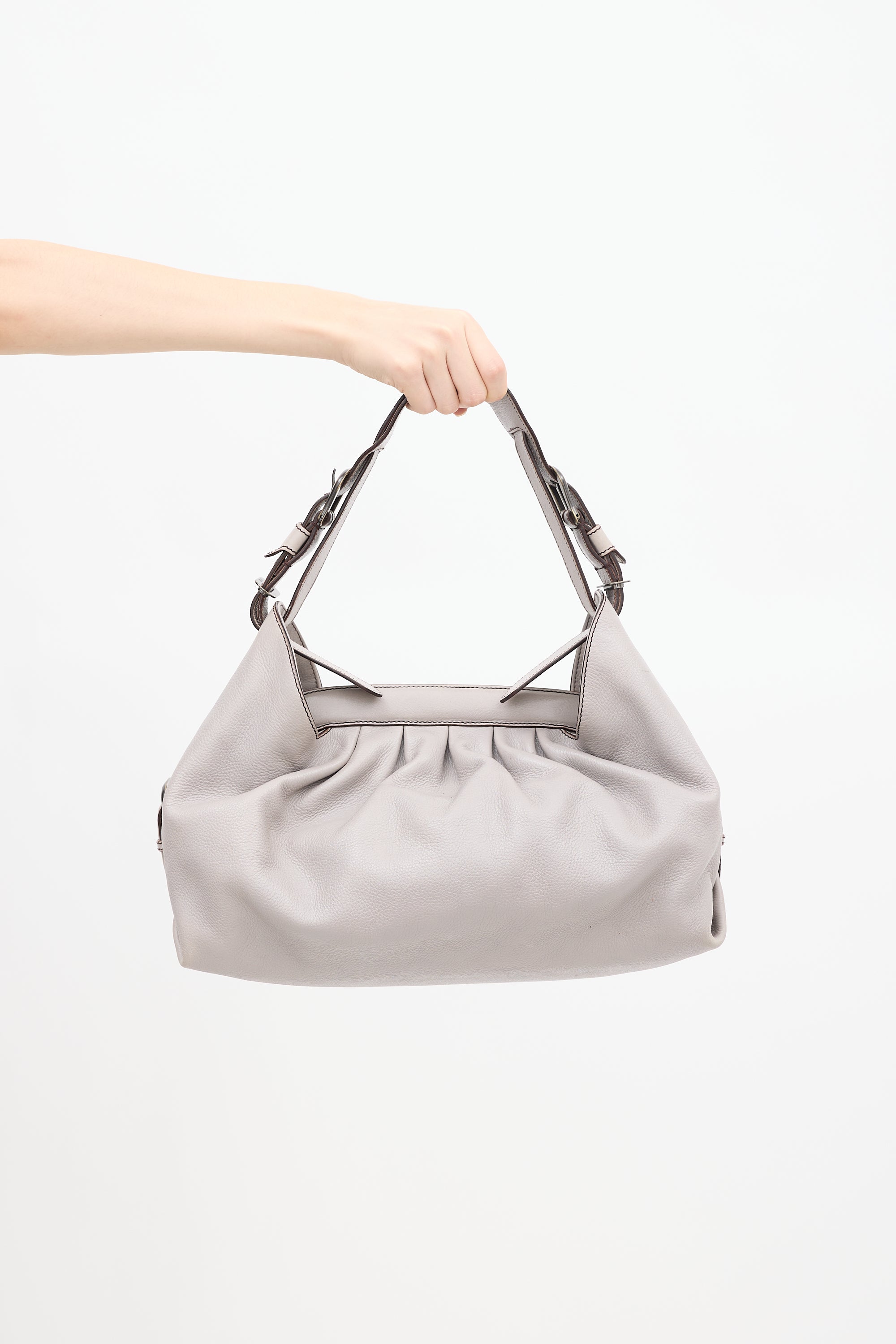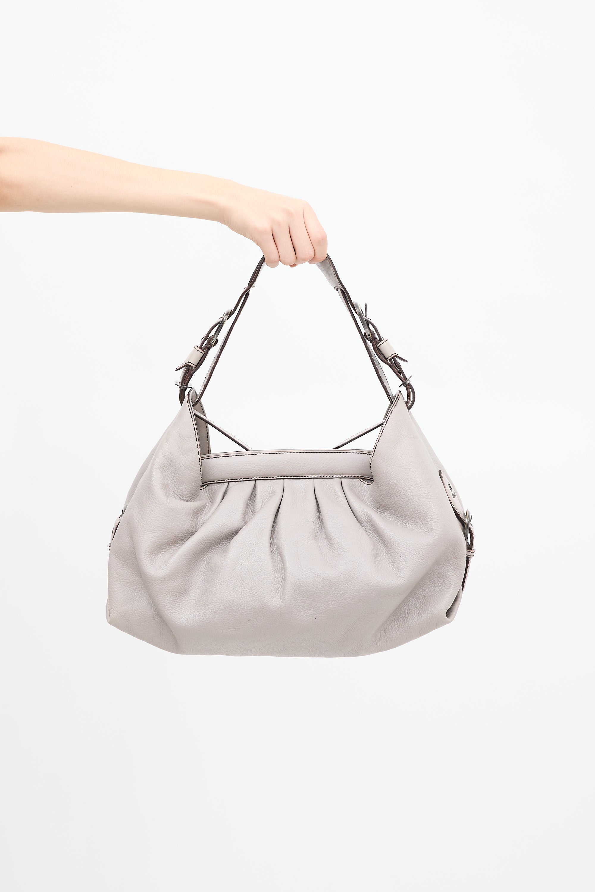 Pre-owned Fendi grey Borsa leather bag featuring a shoulder strap, gunmetal tone logo buckle hardware at sides, one main compartment with one zip pocket, gathered detailing at top, and magnetic snap closure.