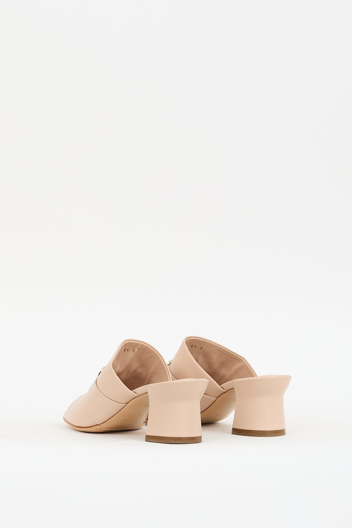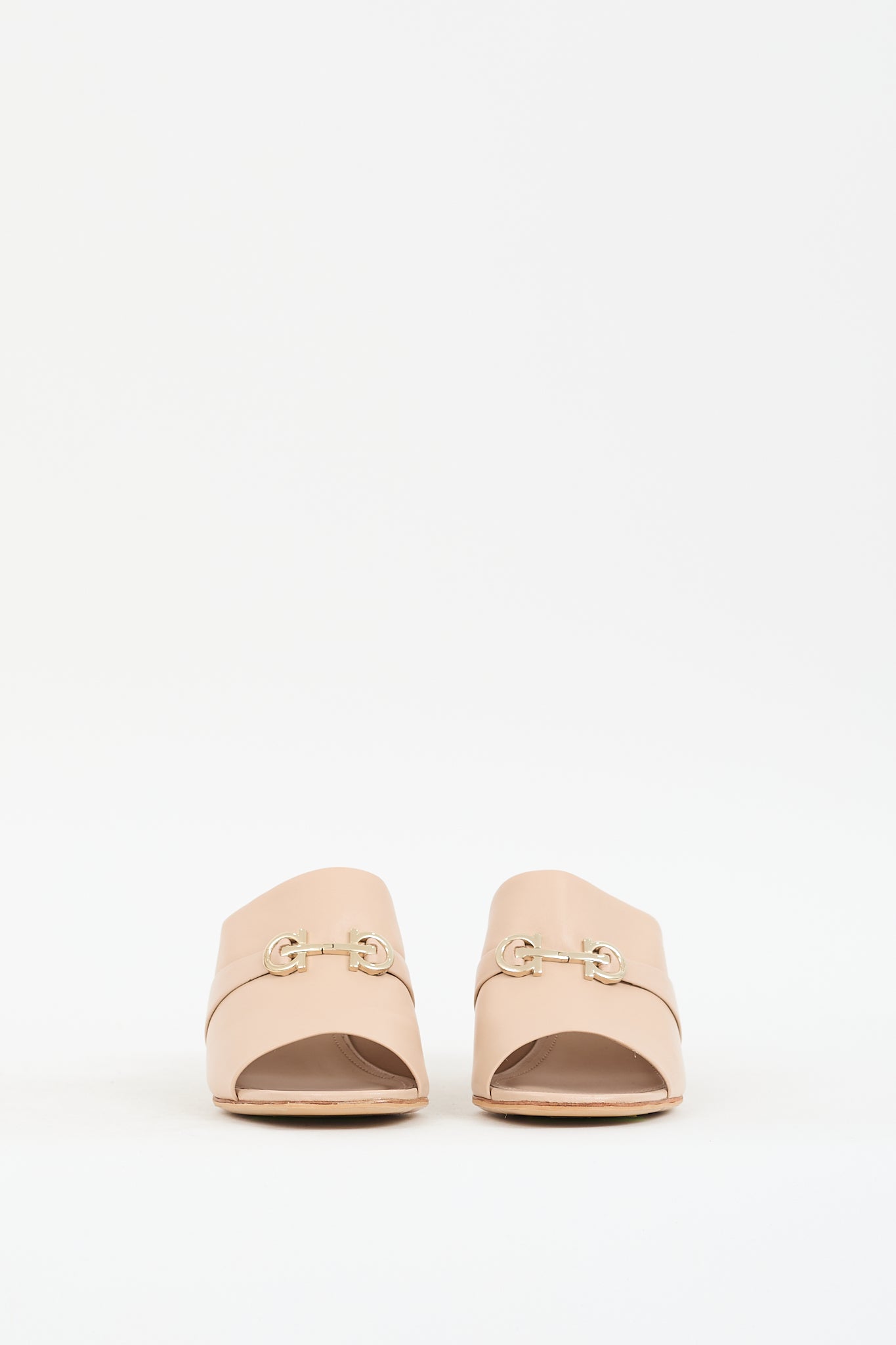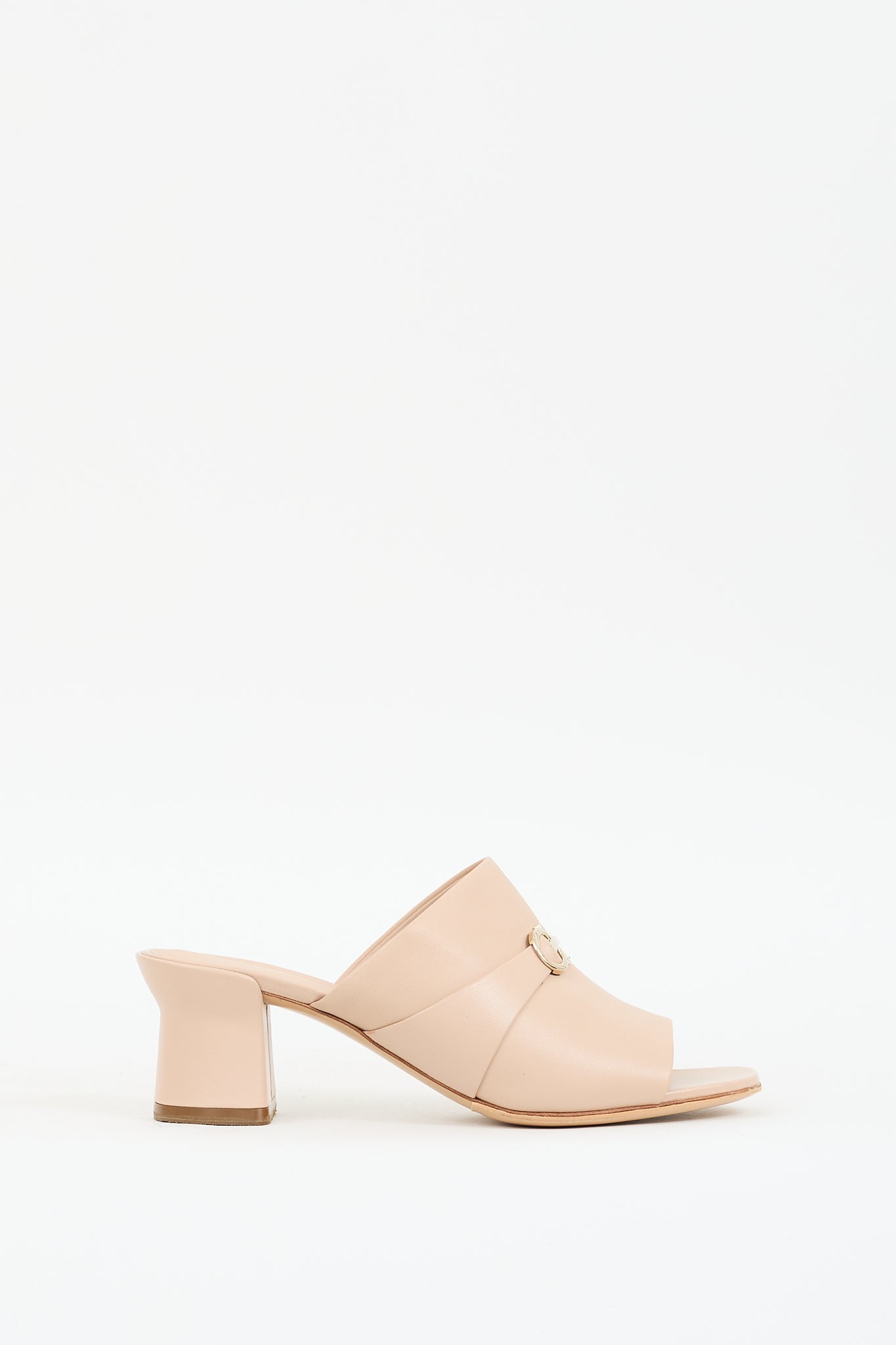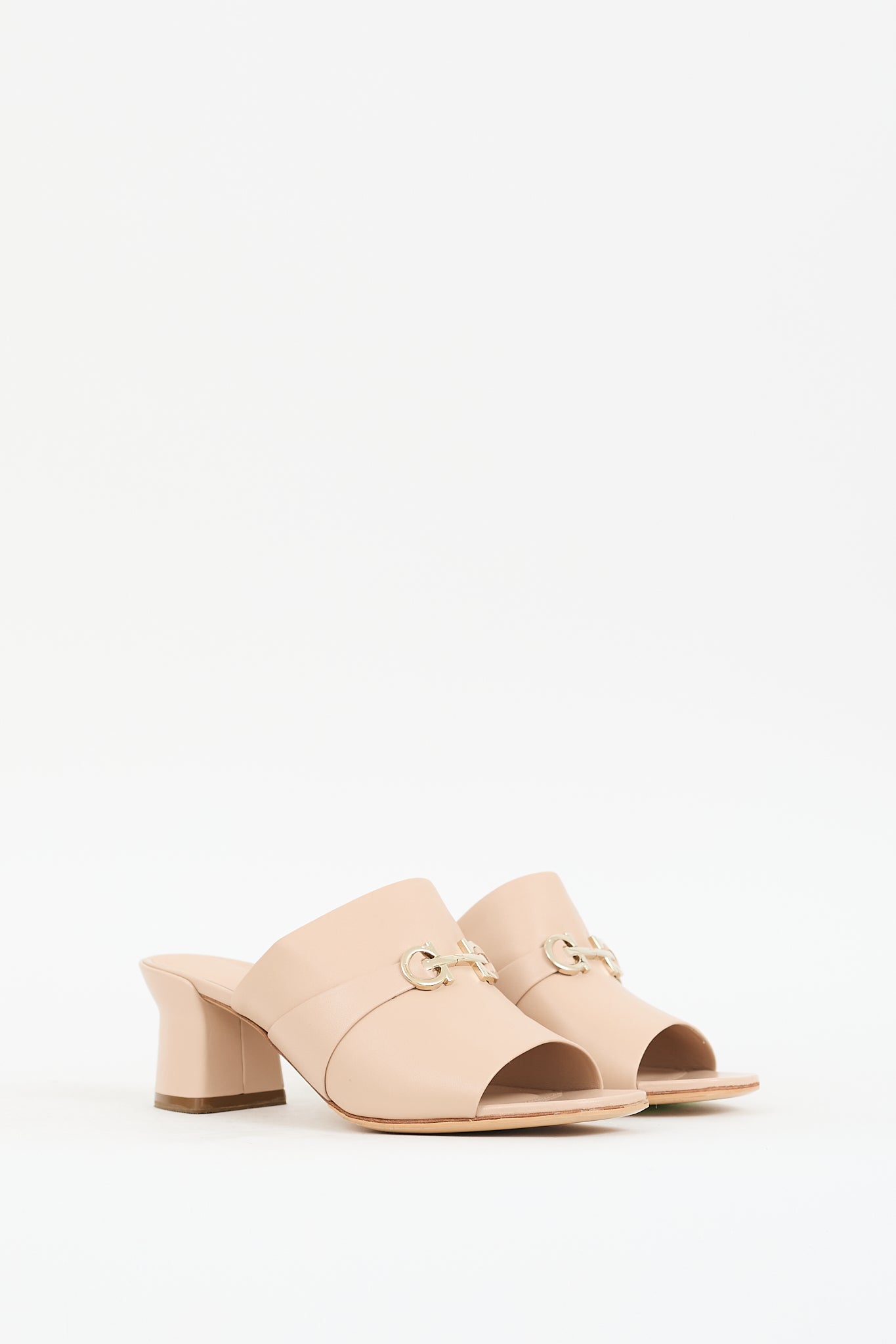 Pre-owned Ferragamo beige mules featuring an open square toe, leather upper, silver tone Gancini hardware with etched logo at vamp, and covered block heel.