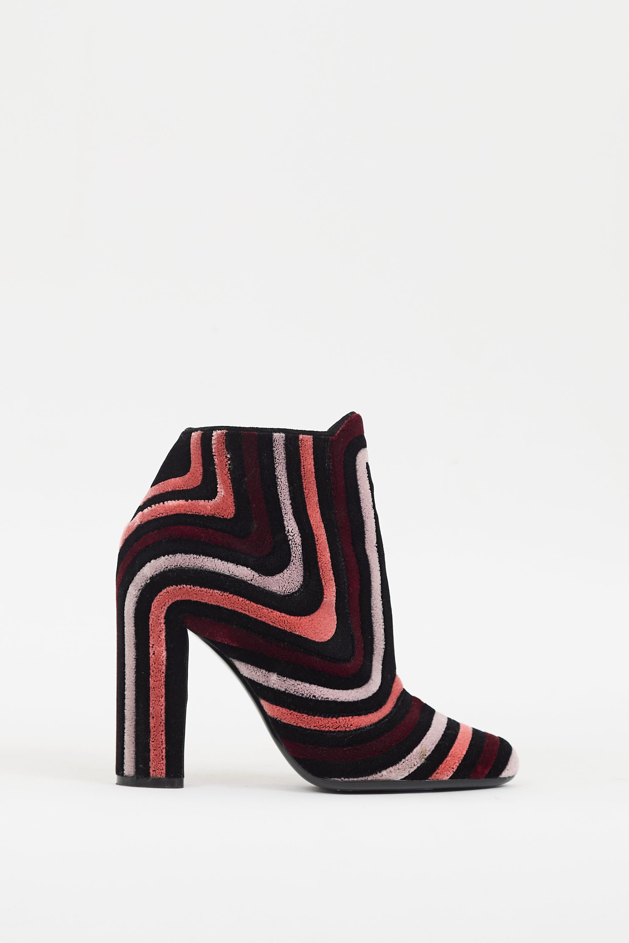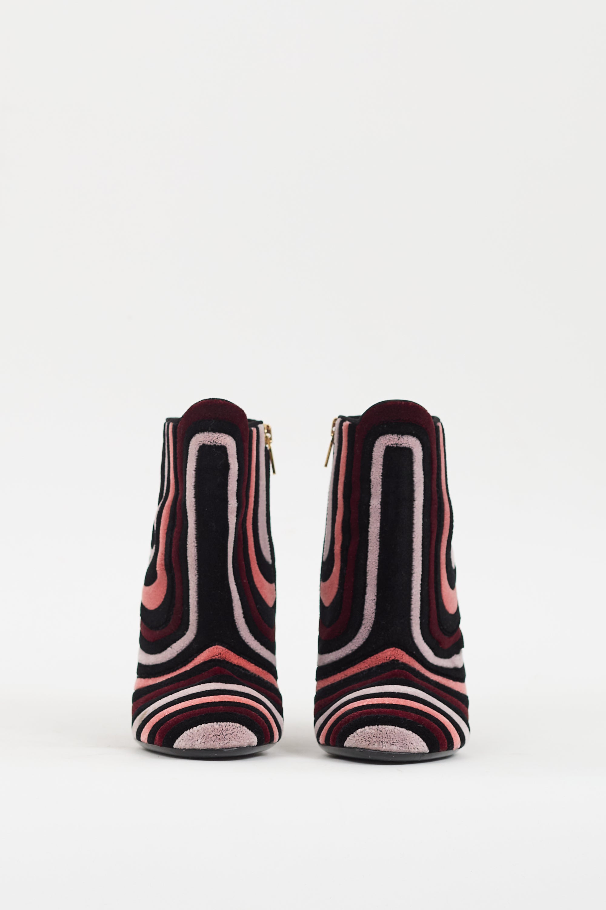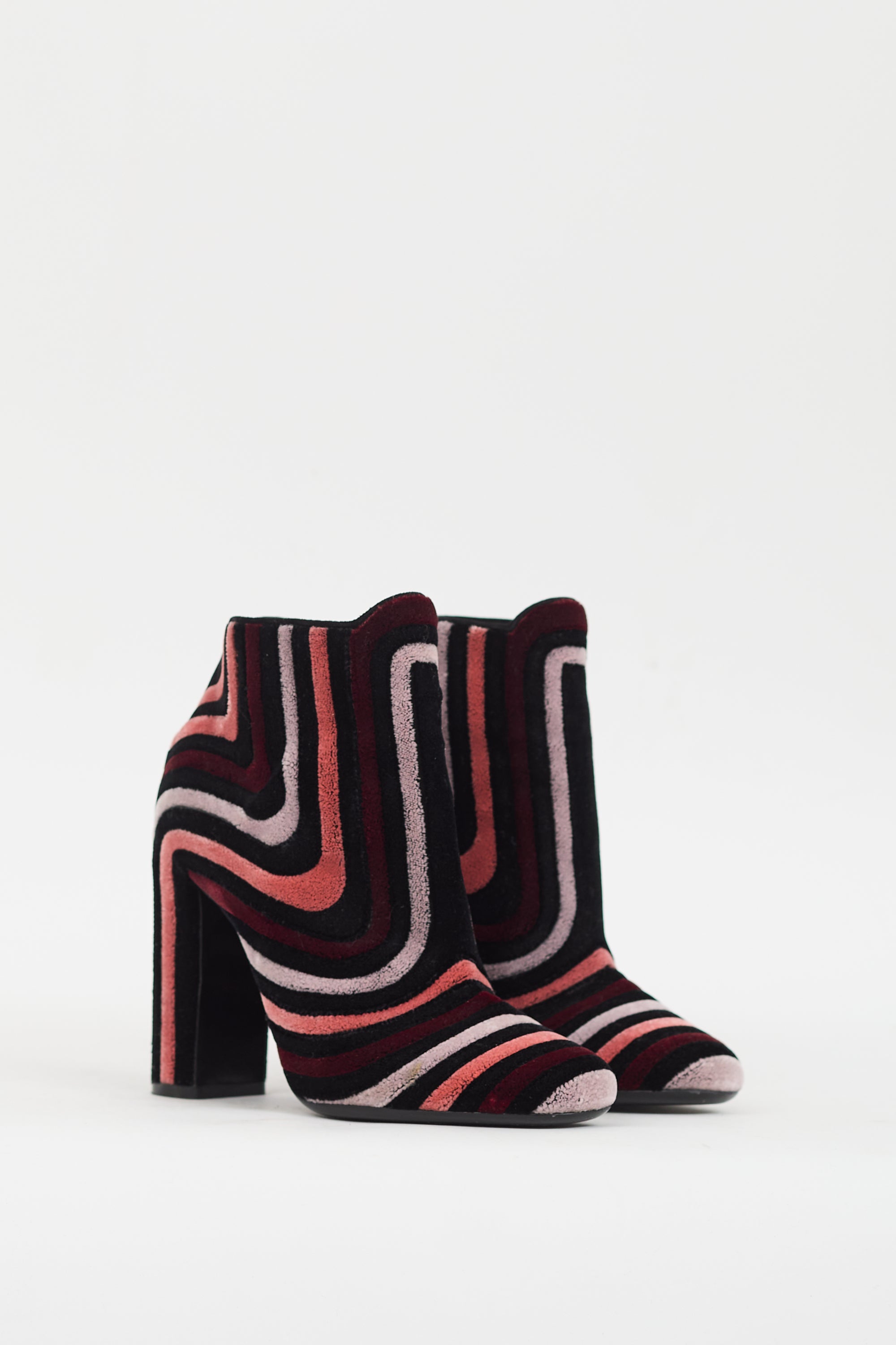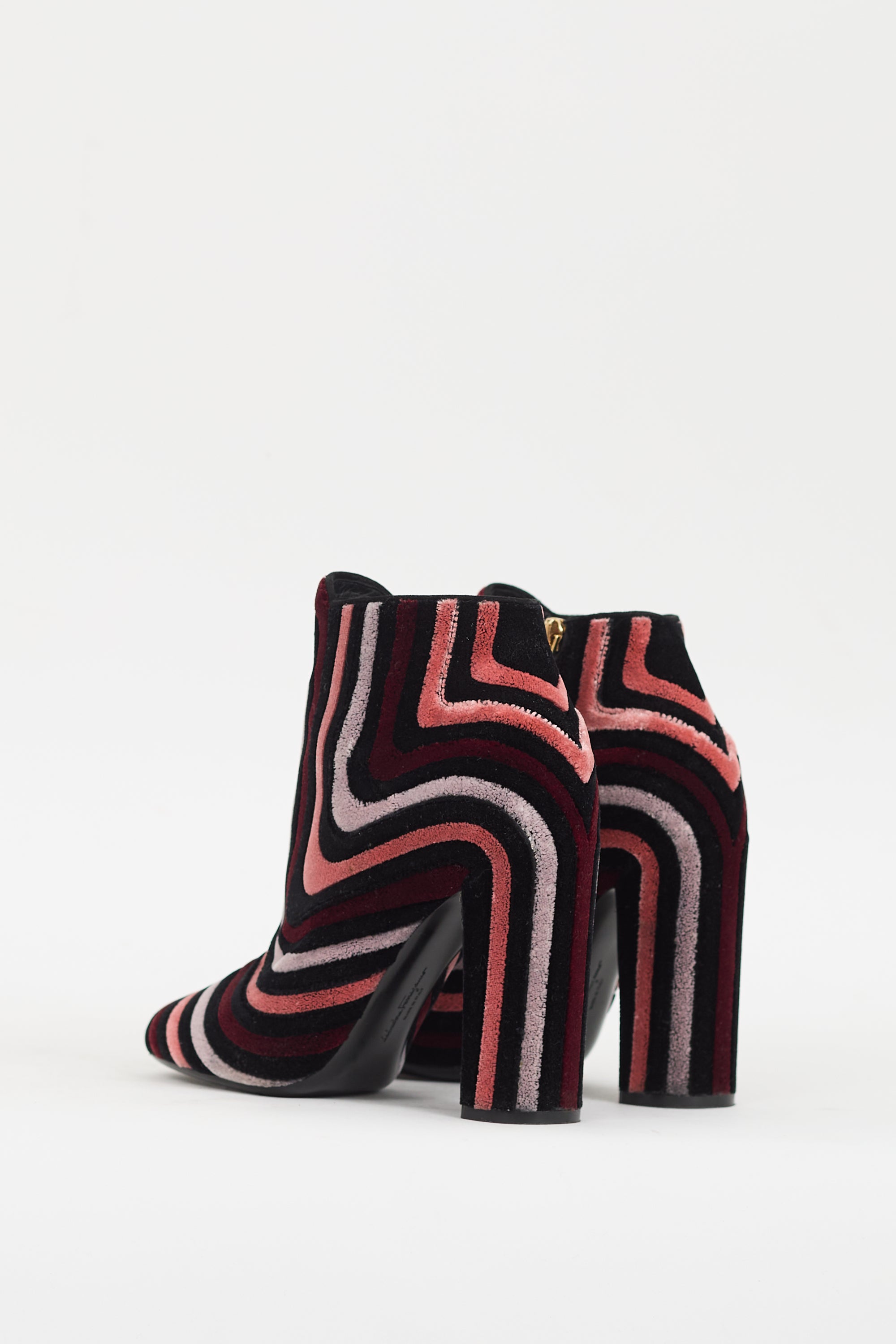 Pre-owned Ferragamo black and multicolour velvet boots featuring stripes, rounded toe, concealed side zip closure, and covered block heel.