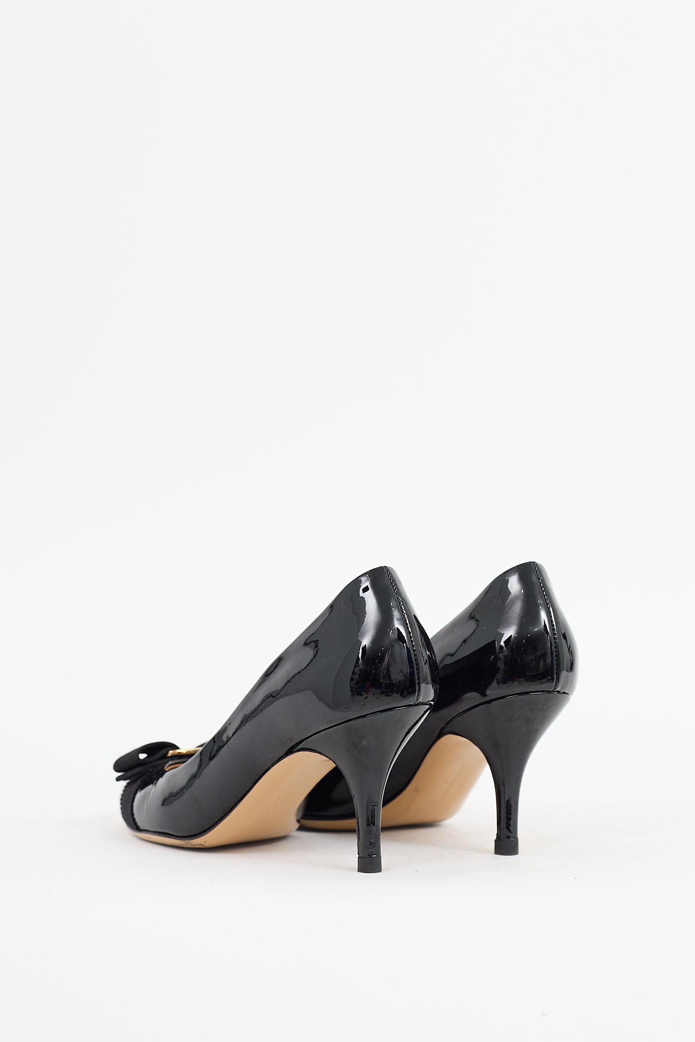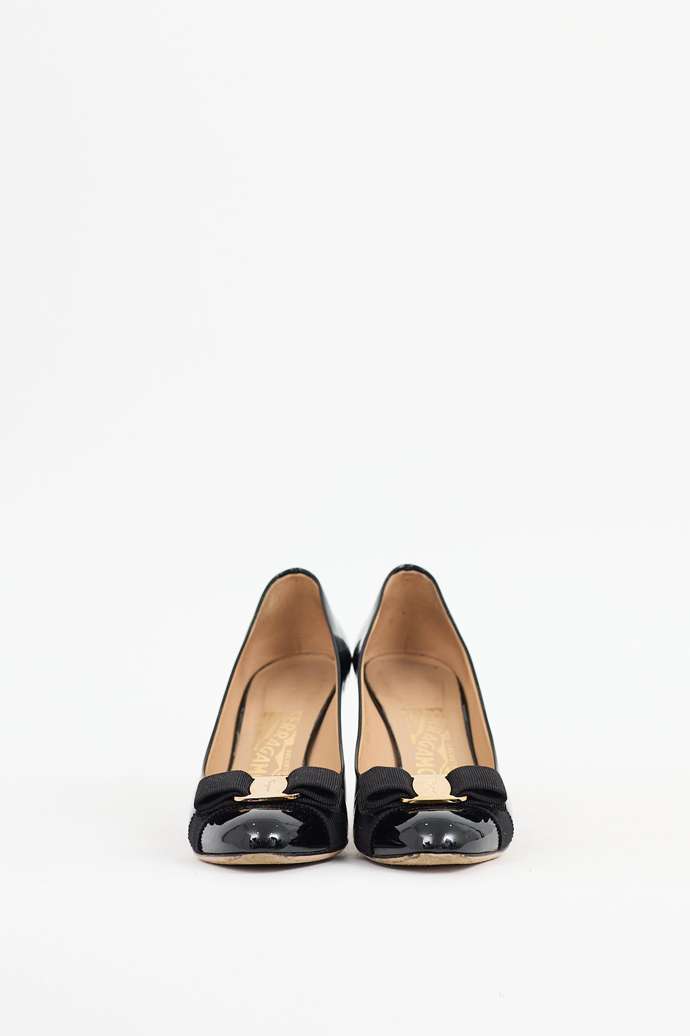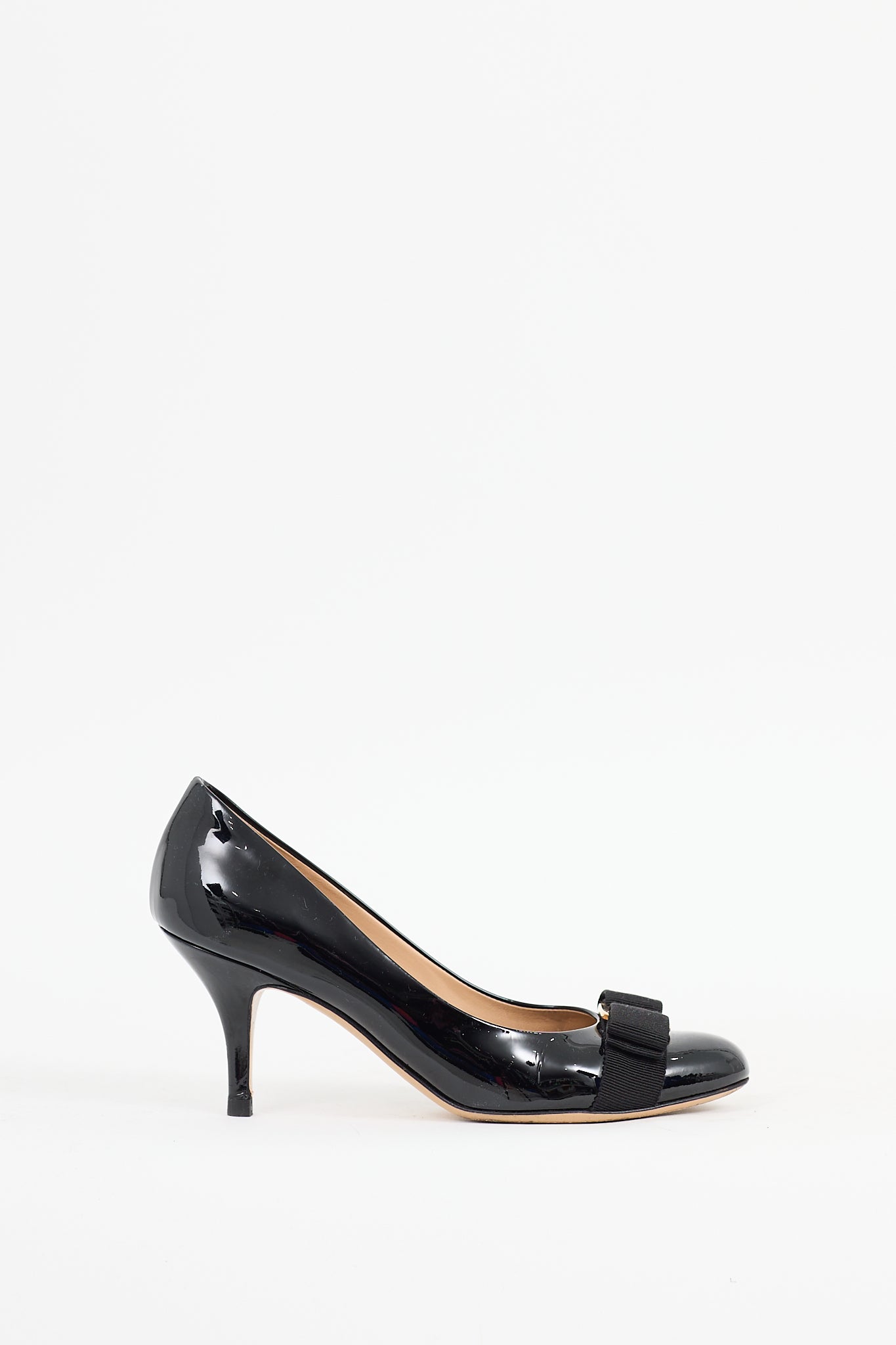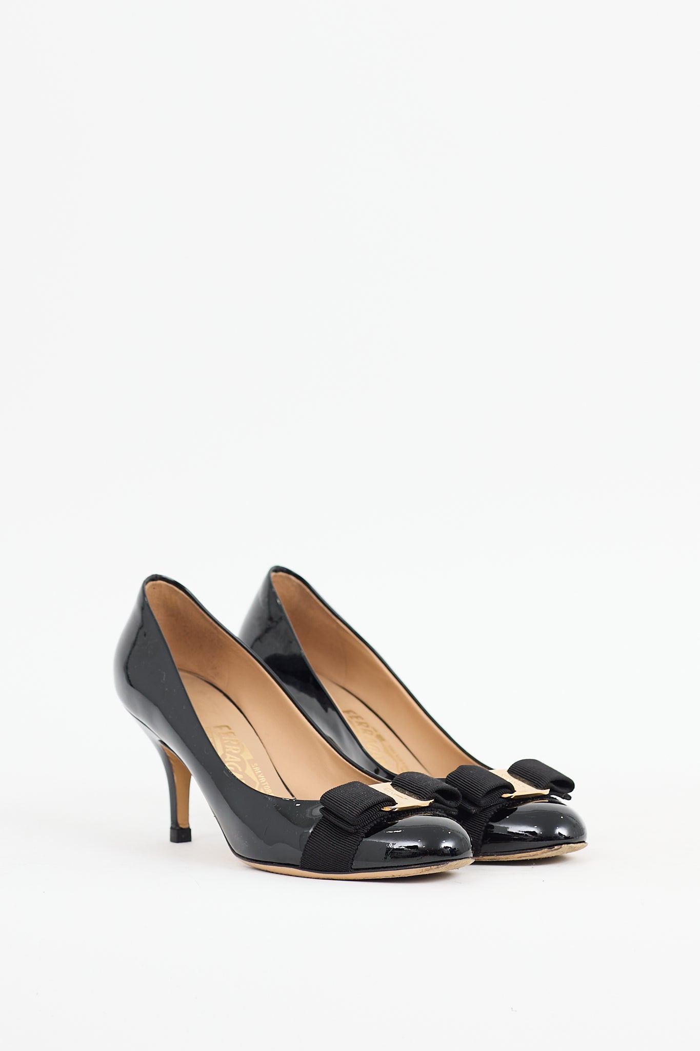 Pre-owned Ferragamo black Vara Bow patent leather pumps featuring a round toe, webbed bow with gold tone logo hardware at vamp, wrapped kitten heel, and slip on entry.