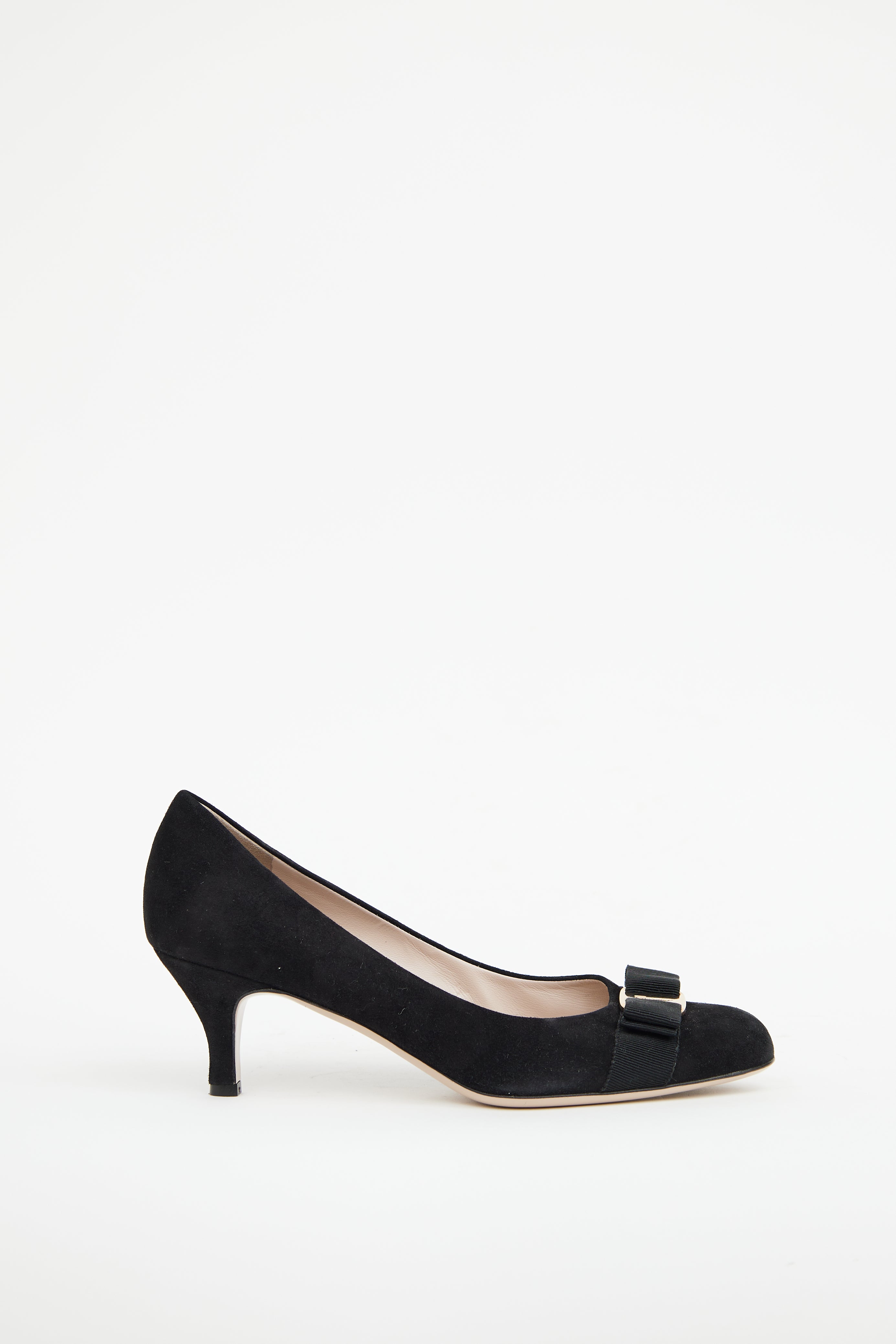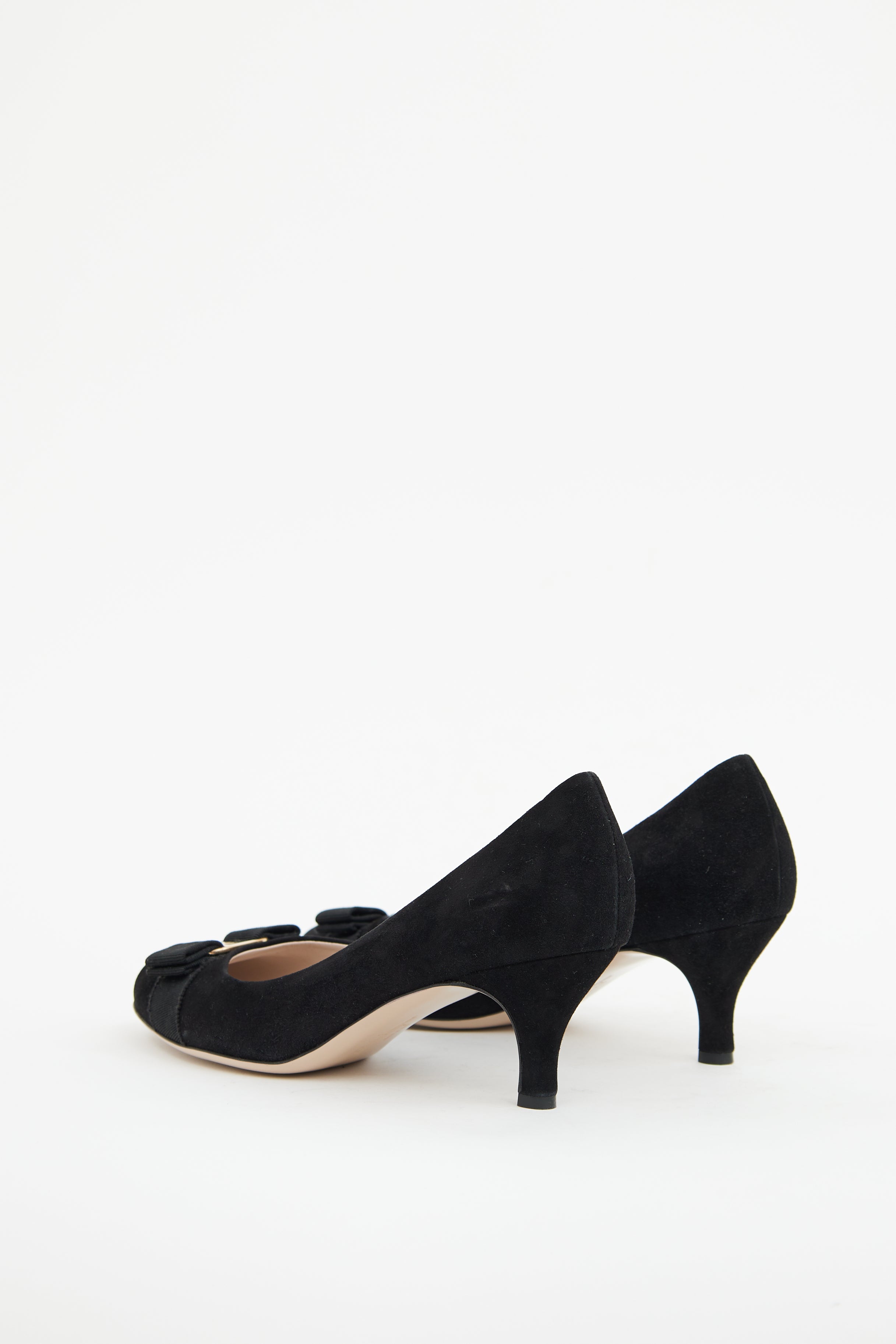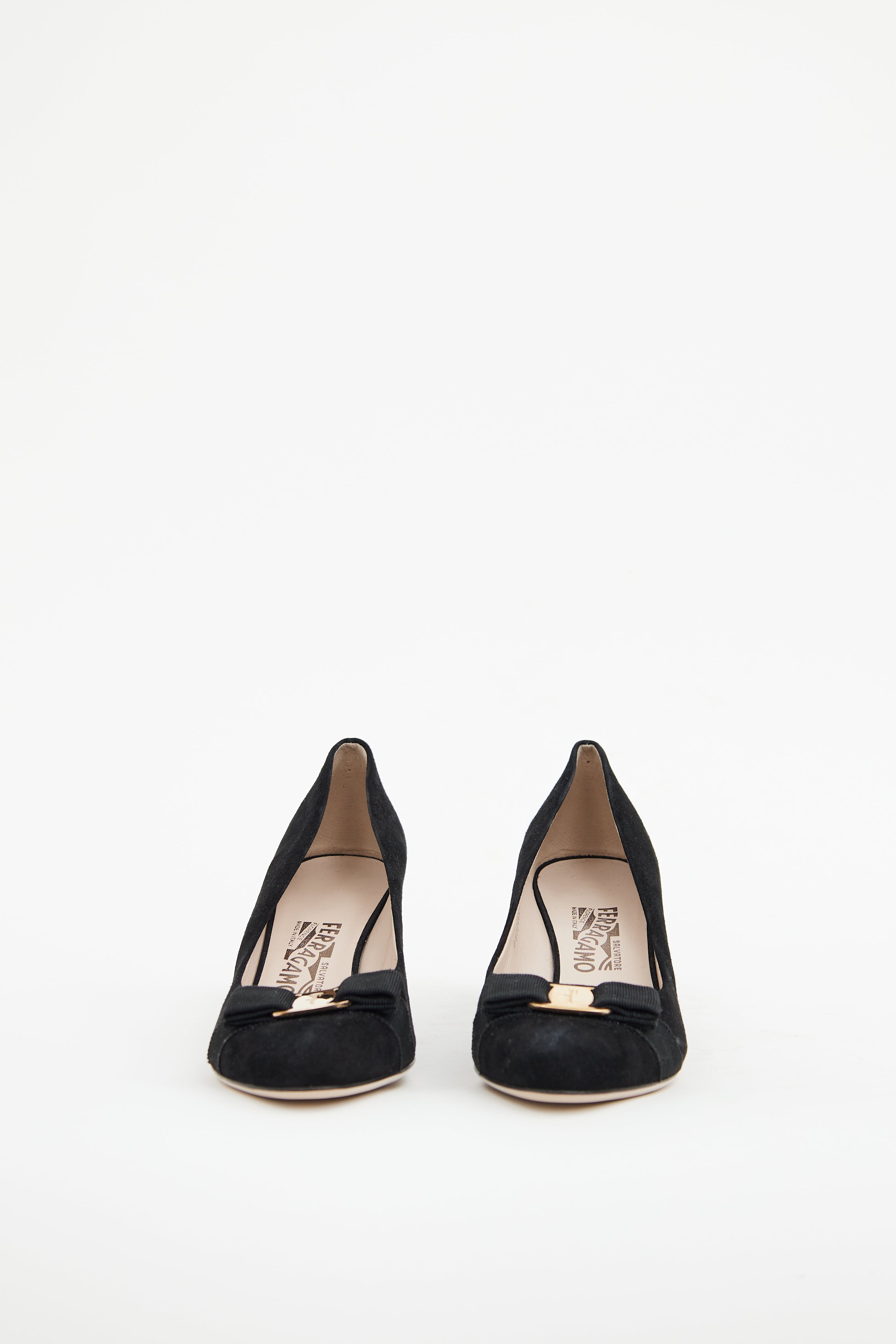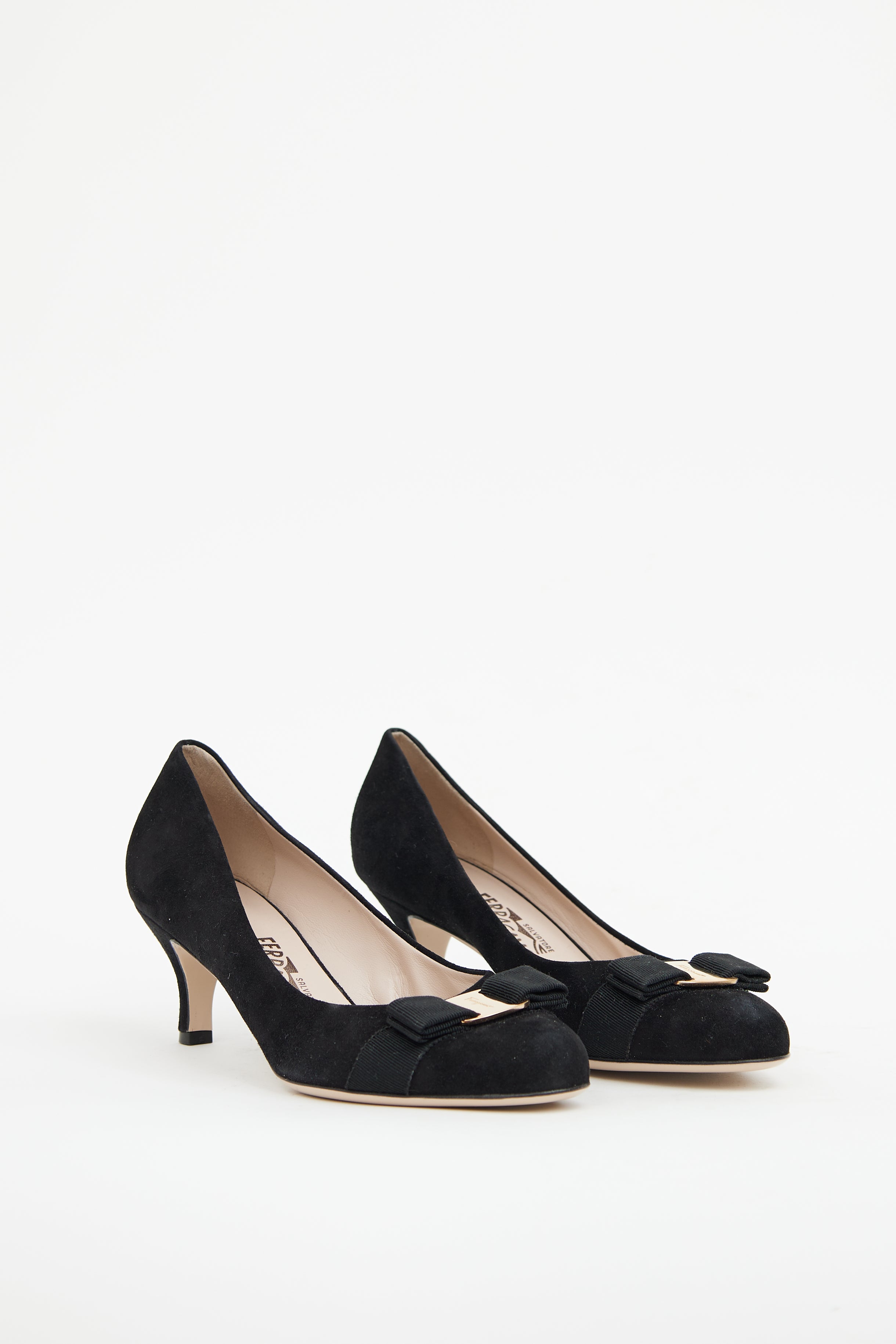 Pre-owned Ferragamo black suede pumps featuring a round toe, logo embossed Vara bow, and kitten heel.