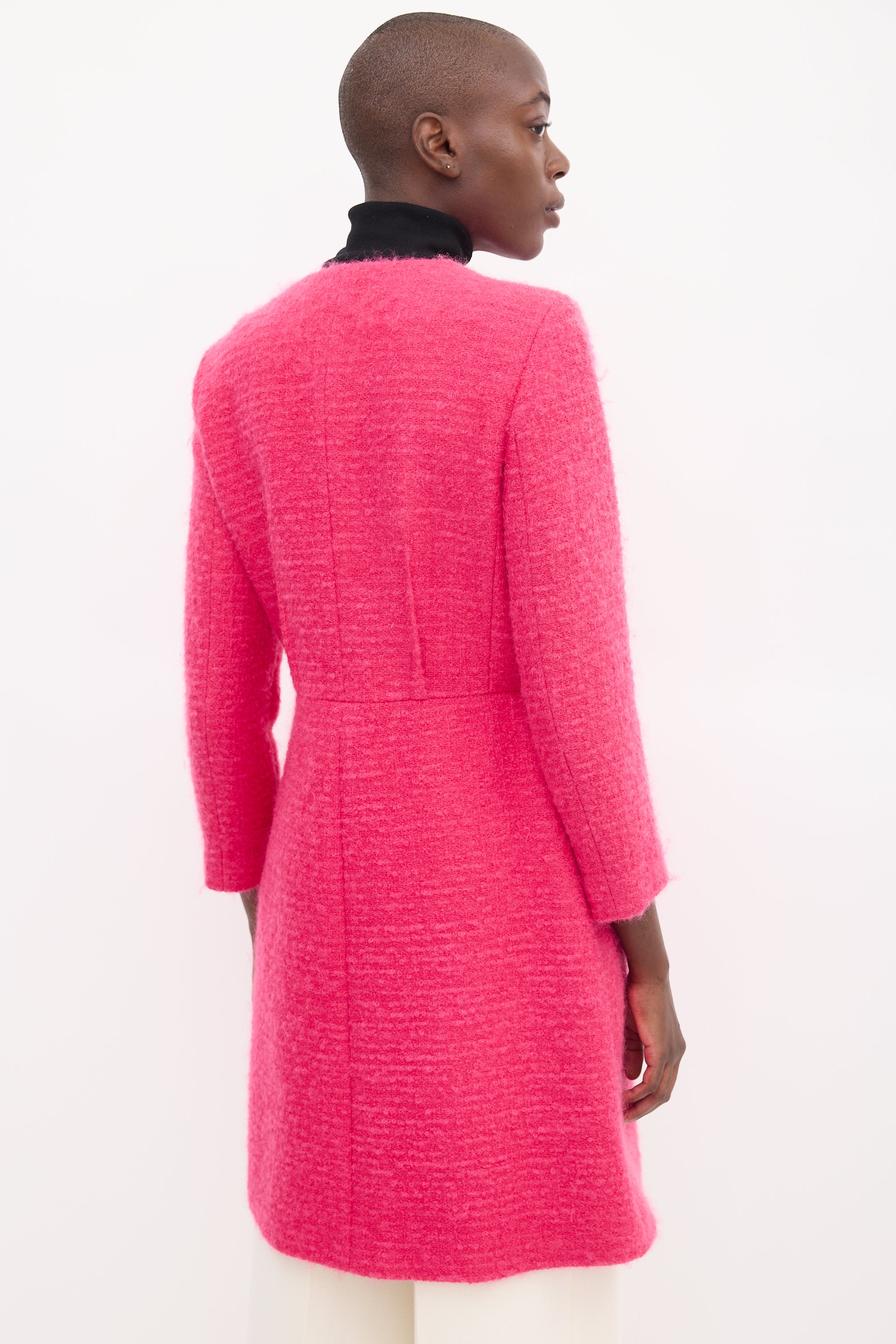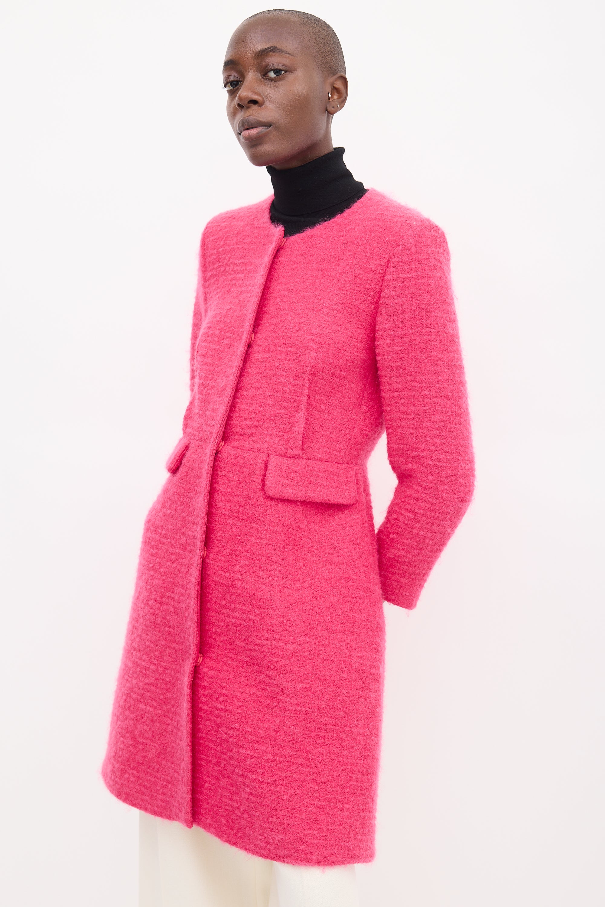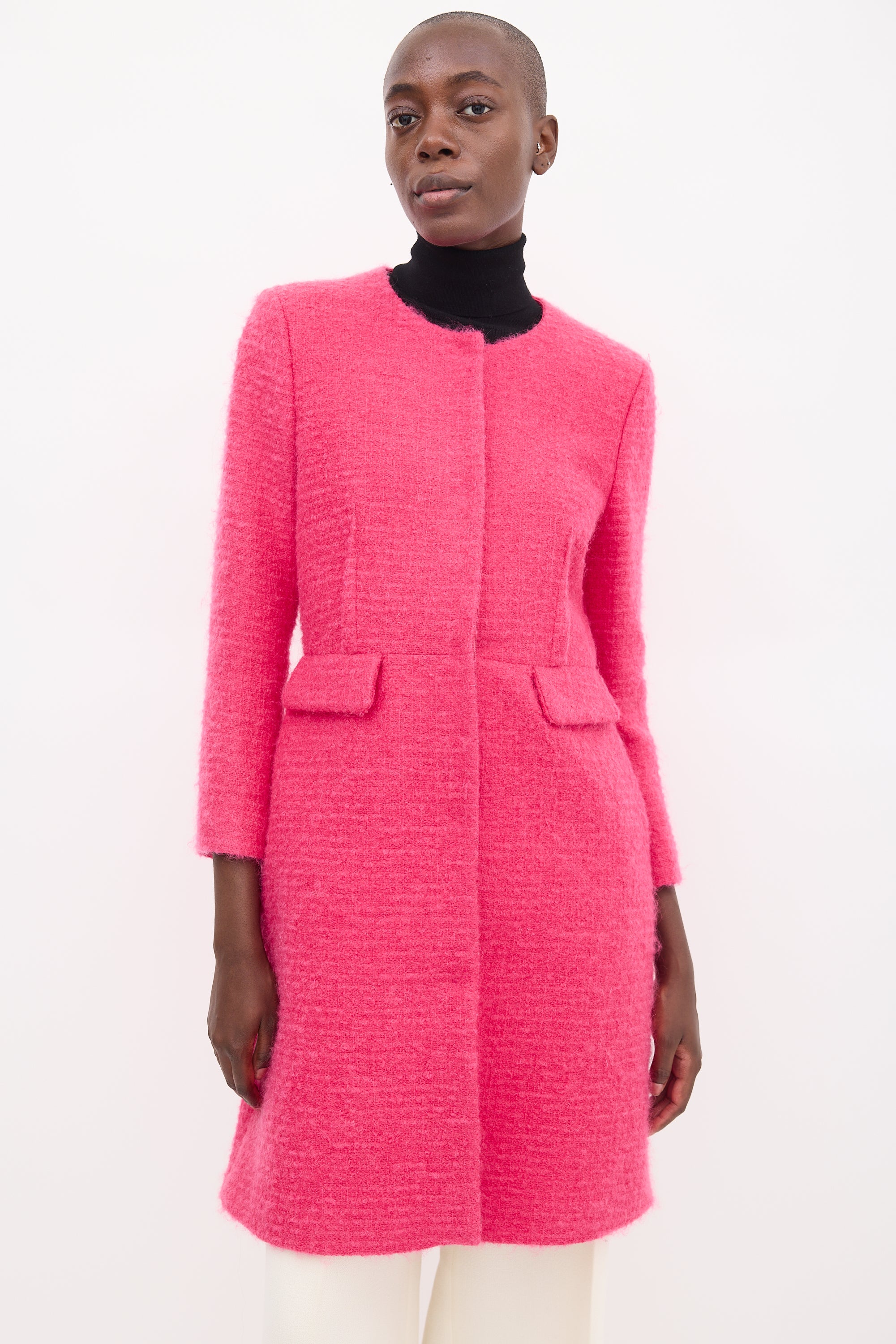 Pre-owned Giambattista Valli pink wool tweed coat featuring a round neckline, long sleeves, tonal weave, two flap pockets at hip, and snap button closure. Lined.