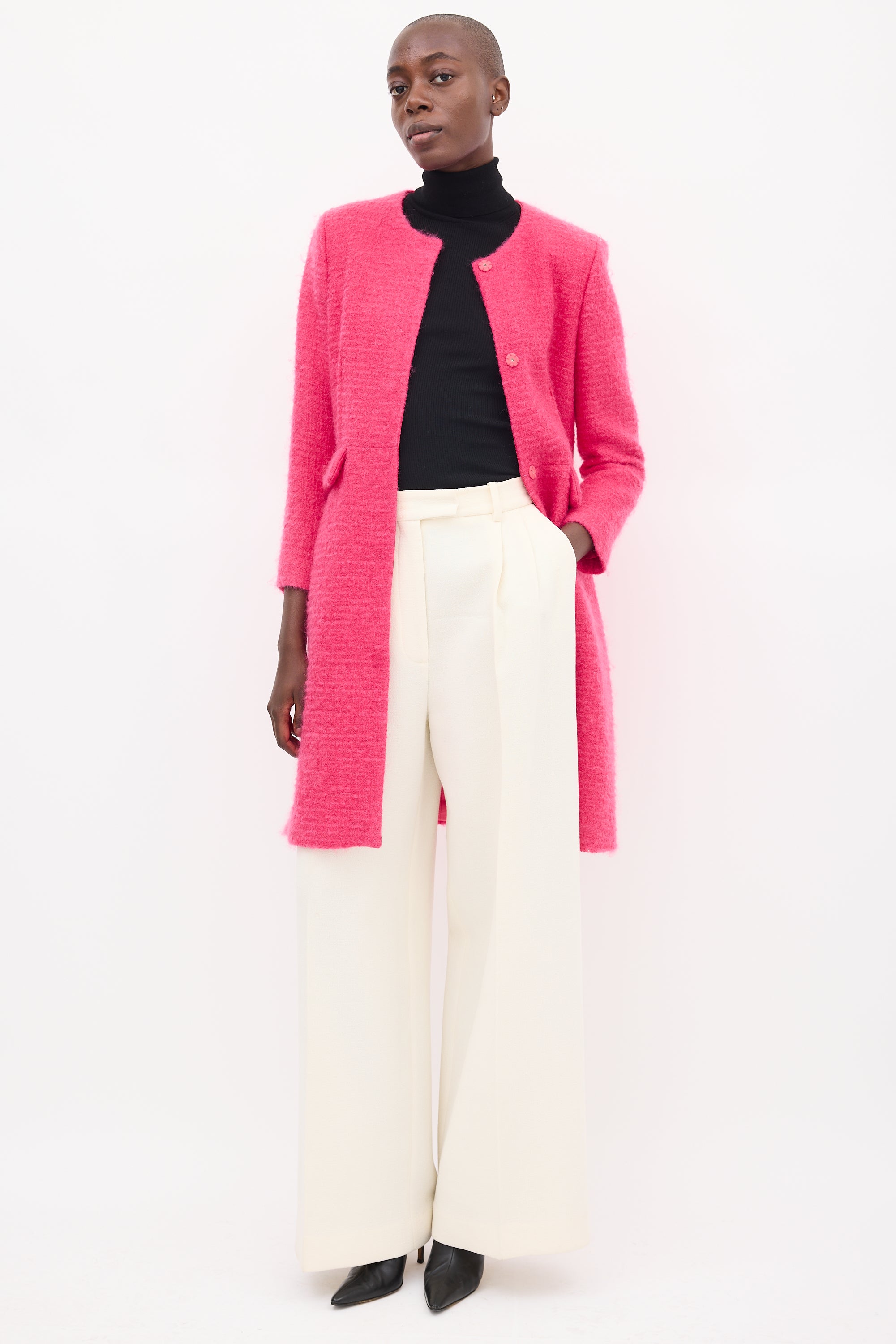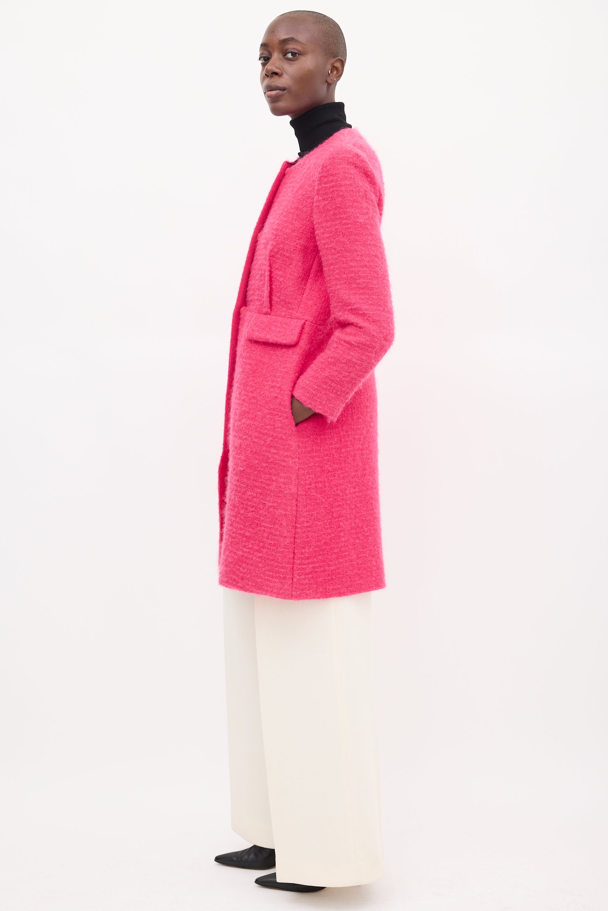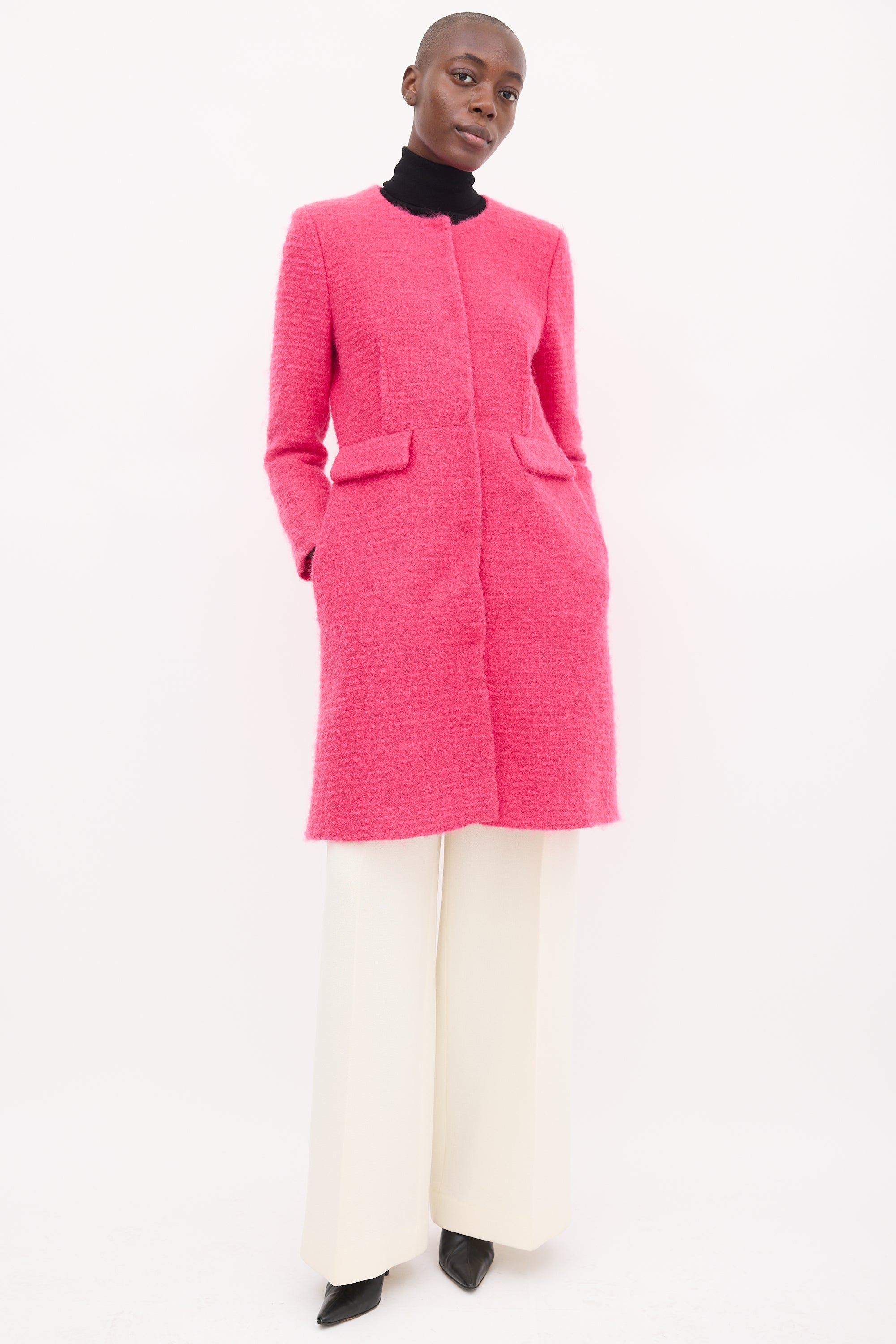 Pre-owned Giambattista Valli pink wool tweed coat featuring a round neckline, long sleeves, tonal weave, two flap pockets at hip, and snap button closure. Lined.